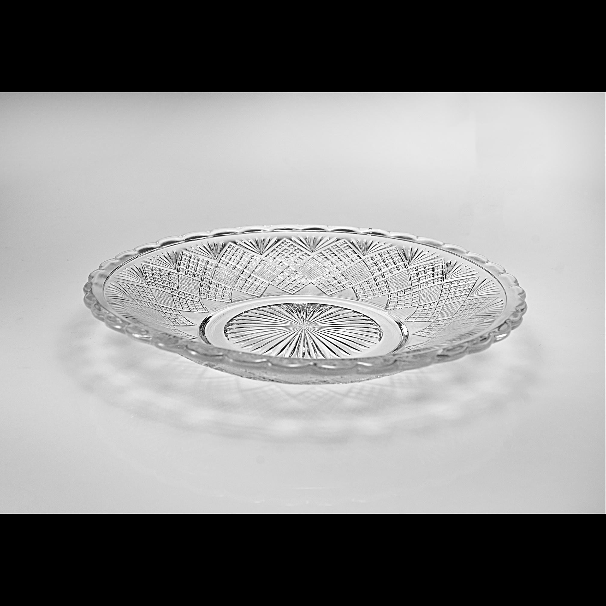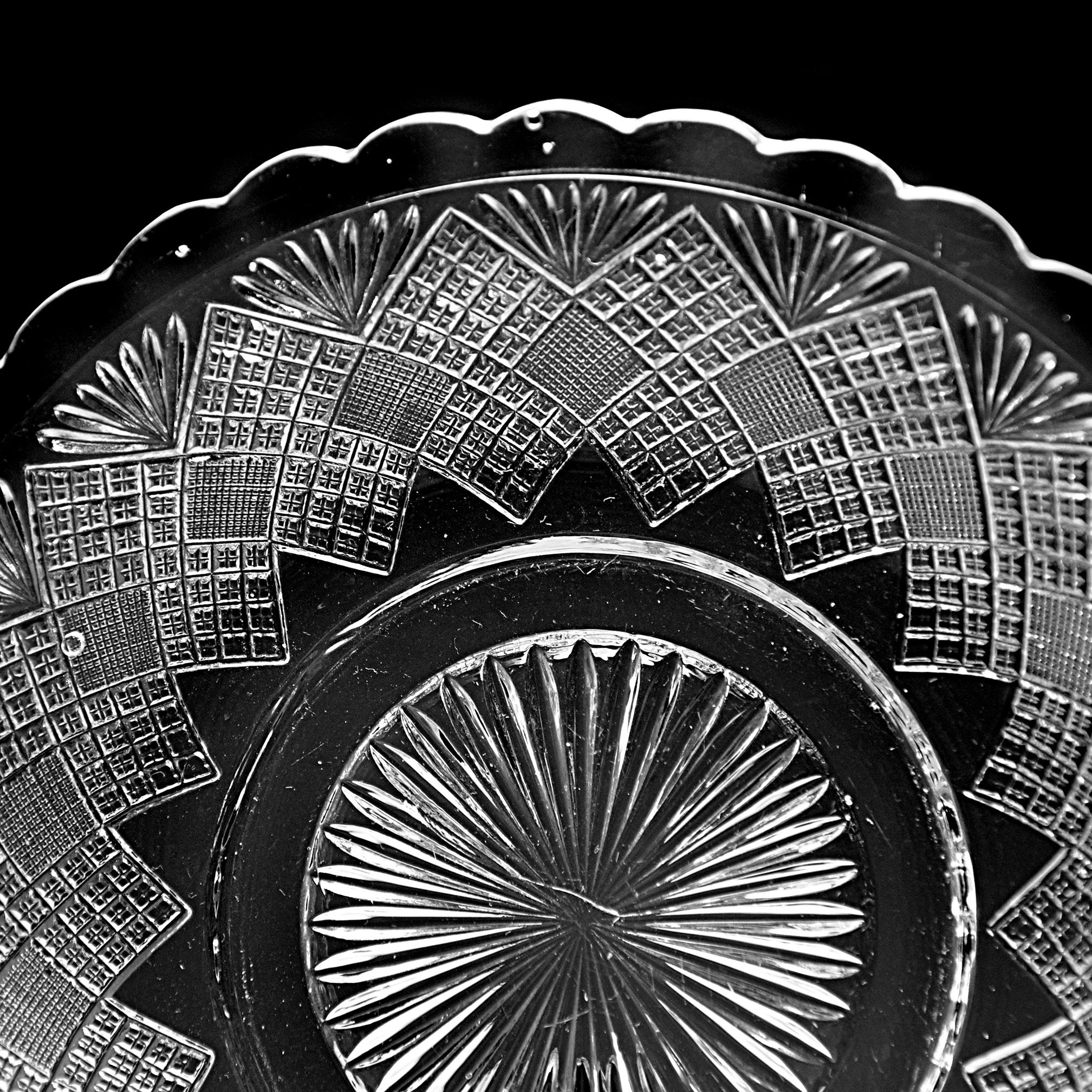 There’s something about old, pressed glass that catches the light in a way newer glass never quite does. This shallow bowl, made sometime around the late 1870s, has that kind of sparkle — the kind that makes you pause a moment before setting it on the table. It’s from the Menlo pattern by Campbell, Jones & Company of Pittsburgh, Pennsylvania, one of the early glassmakers who helped shape what we now call Early American Pattern Glass. The pattern is also known as Flattened Diamond and Sunburst — an appropriate name, with its bold fan bursts and tightly checked diamonds arranged like a quilt around the rim. Each pressed detail was meant to imitate cut glass in the days before most homes could afford the real thing. This bowl is perfect for serving fruit or pudding, or for simply sitting in the window catching the morning light. It’s a lovely survivor from the 1870s–1880s, when glass like this graced dining tables lit by oil lamps, not electric bulbs. A genuine antique with over a century of stories behind it, still ready for another.