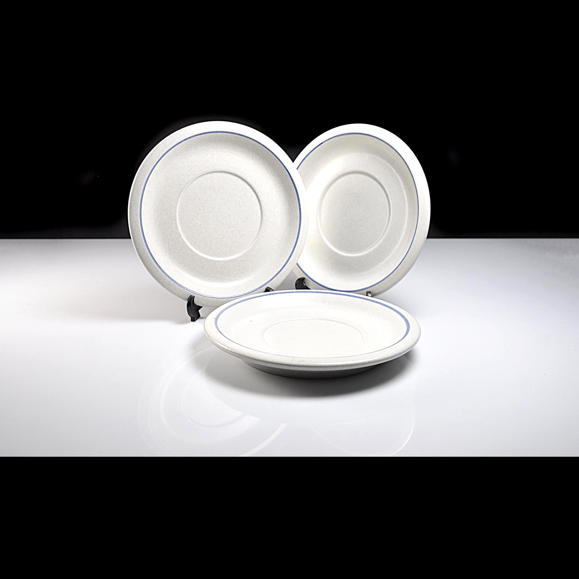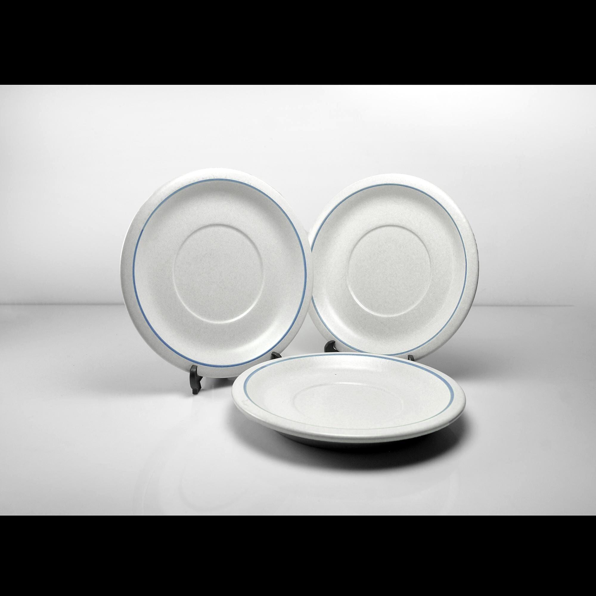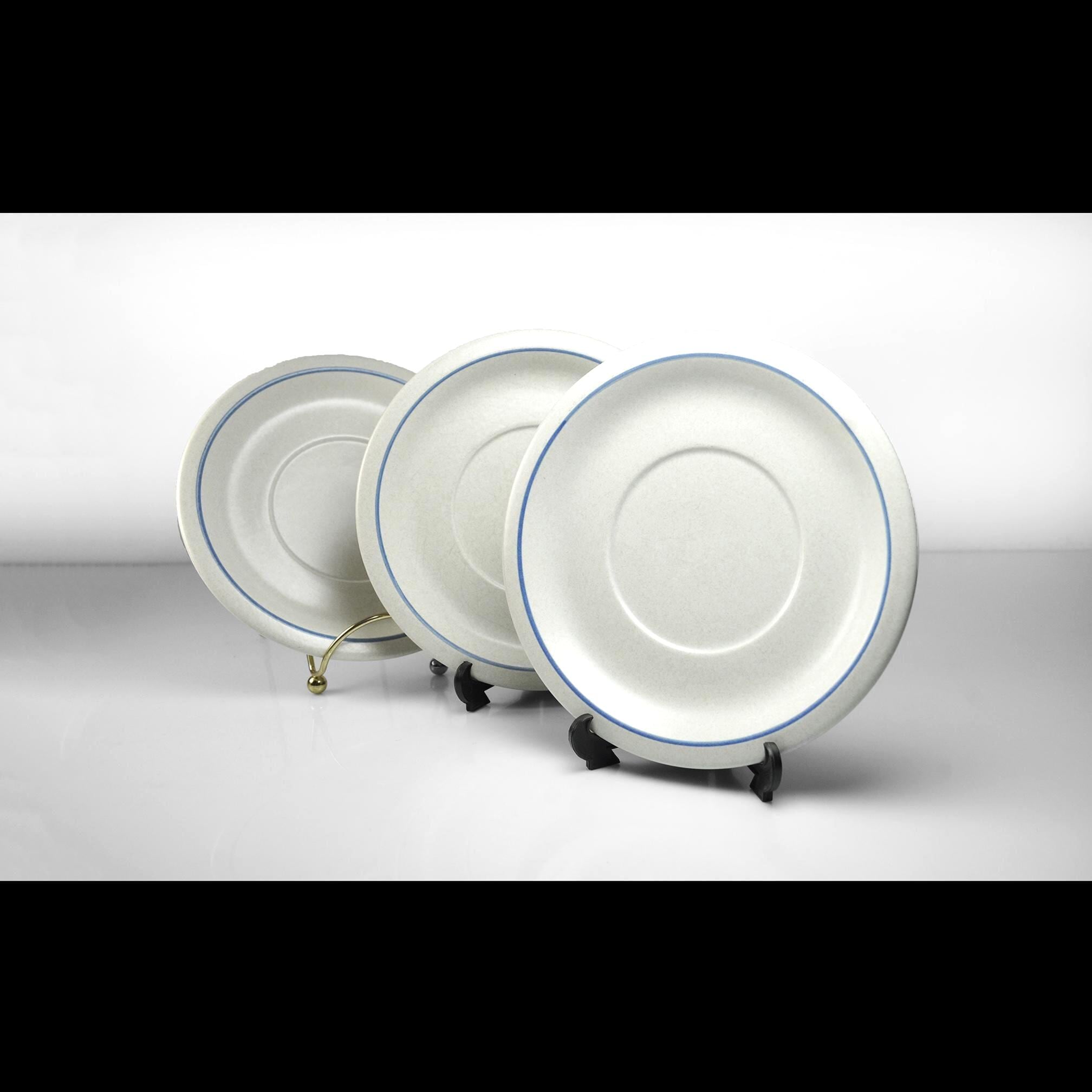 There’s something so steady and familiar about Yorktowne stoneware. For decades, this Pfaltzgraff pattern sat on kitchen tables across America — gray stoneware with that single blue ring that somehow made every cup of coffee look a little cozier. This set of three saucers dates from the 1960s–1980s, back when Pfaltzgraff was still making all their dinnerware in York, Pennsylvania. The impressed “Pfaltzgraff U.S.A.” mark on the bottom tells you these are the real thing. Whether you’re replacing pieces from your longtime Yorktowne set or just like the look of simple, honest stoneware, these saucers are ready to set your table again — just like they did fifty years ago.