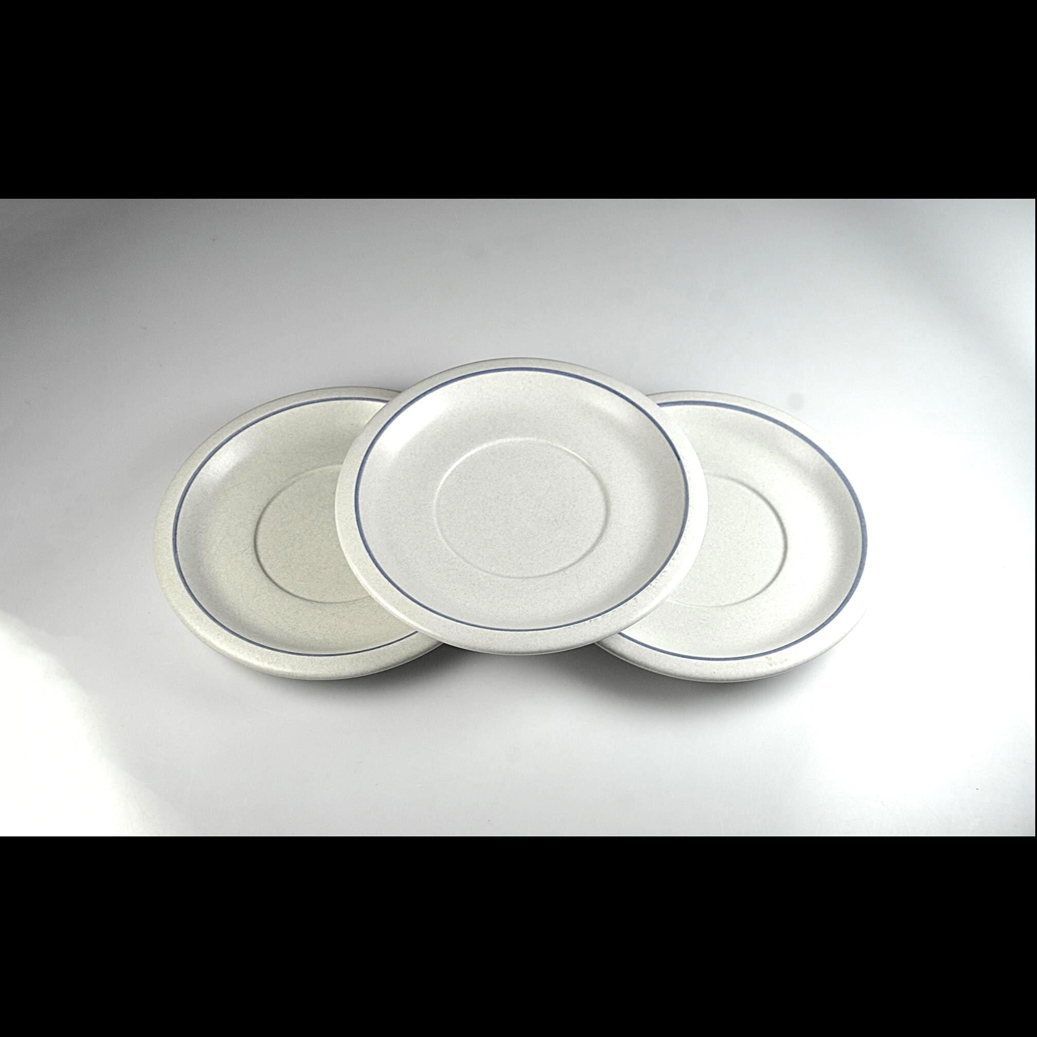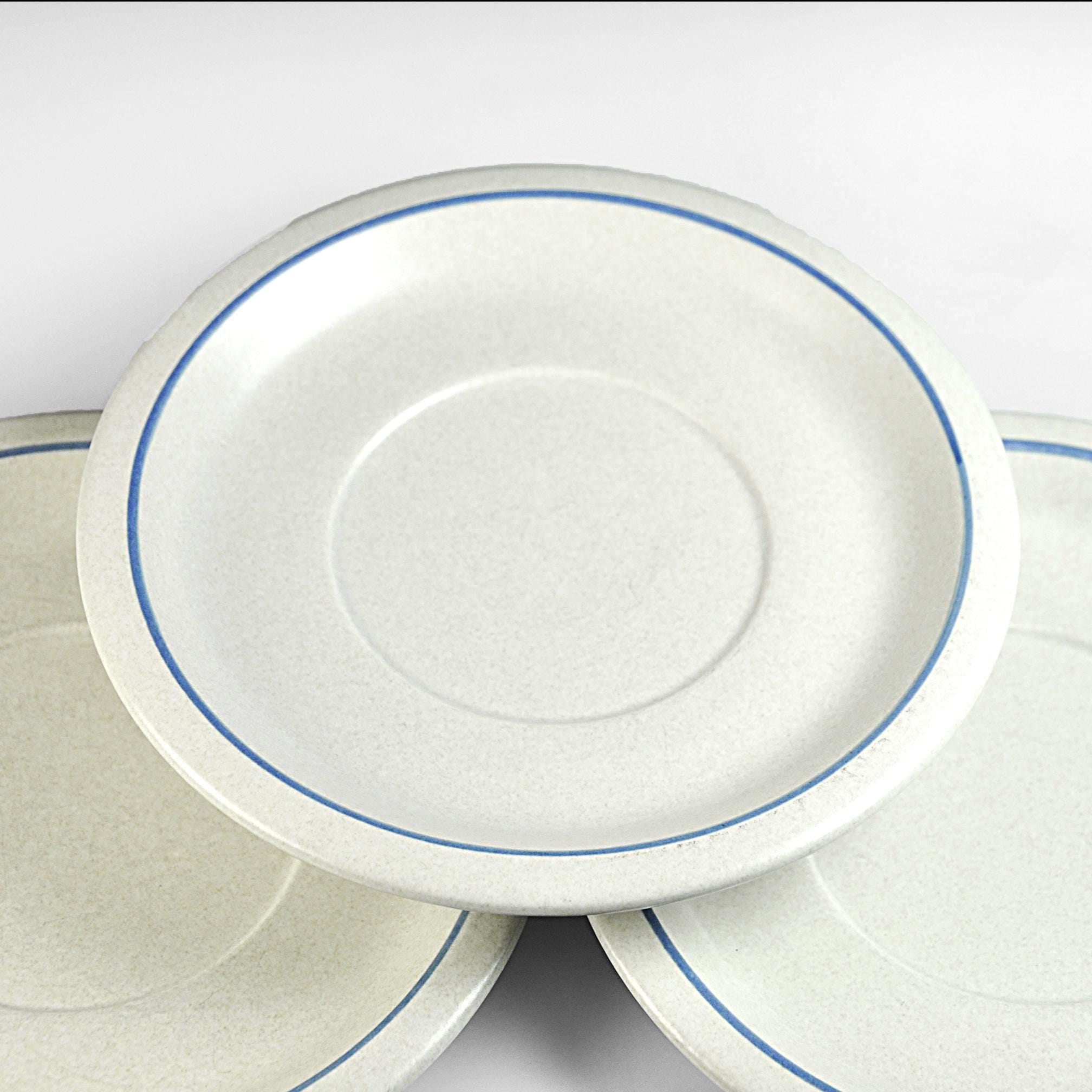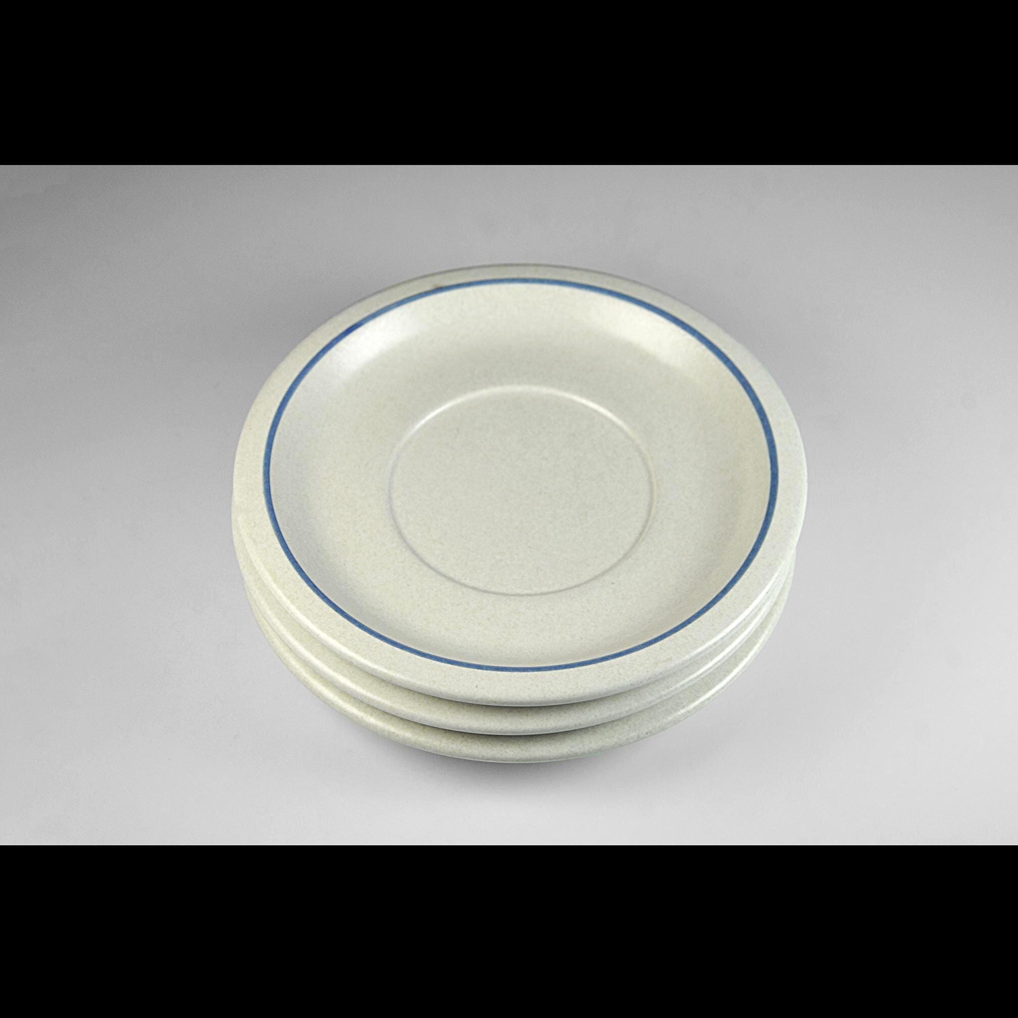 There’s something so steady and familiar about Yorktowne stoneware. For decades, this Pfaltzgraff pattern sat on kitchen tables across America — gray stoneware with that single blue ring that somehow made every cup of coffee look a little cozier. This set of three saucers dates from the 1960s–1980s, back when Pfaltzgraff was still making all their dinnerware in York, Pennsylvania. The impressed “Pfaltzgraff U.S.A.” mark on the bottom tells you these are the real thing. Whether you’re replacing pieces from your longtime Yorktowne set or just like the look of simple, honest stoneware, these saucers are ready to set your table again — just like they did fifty years ago.
