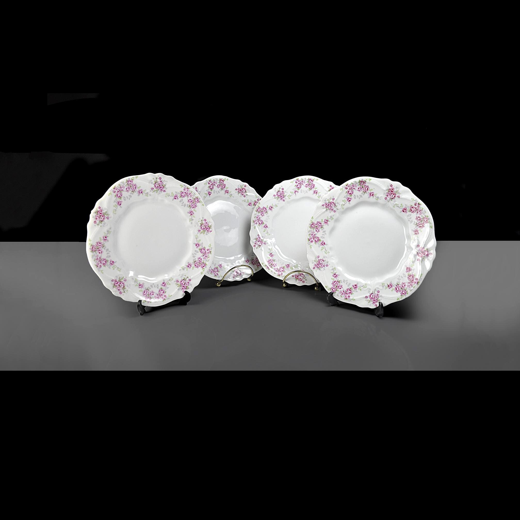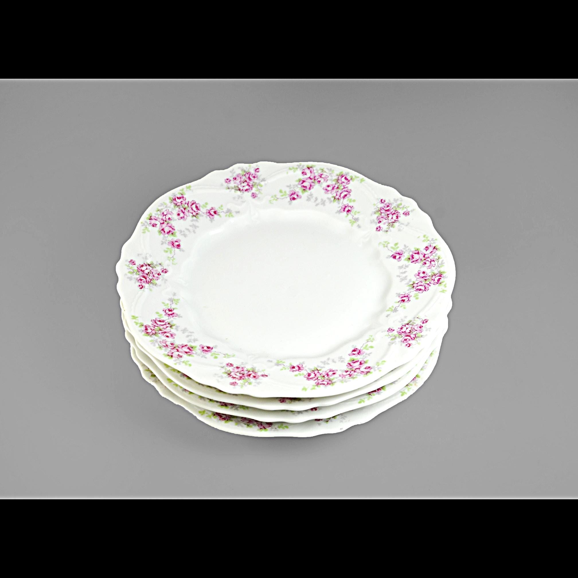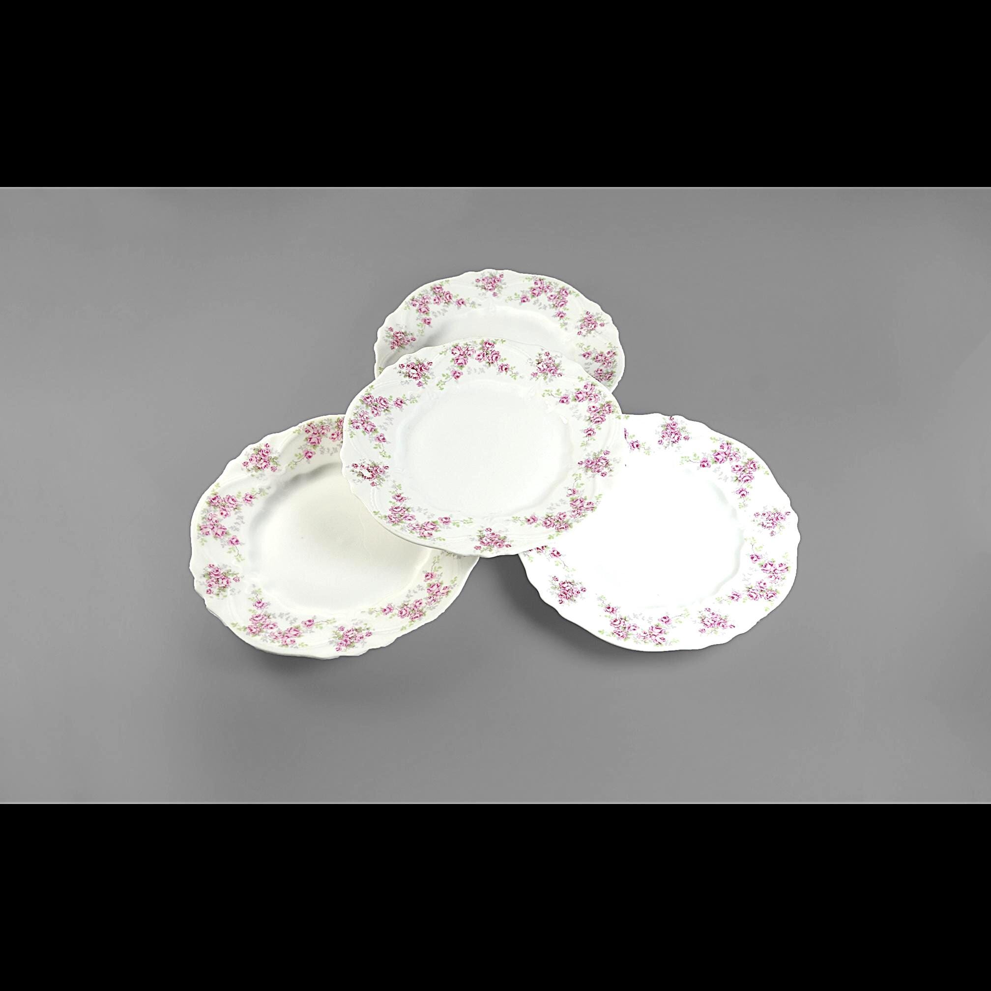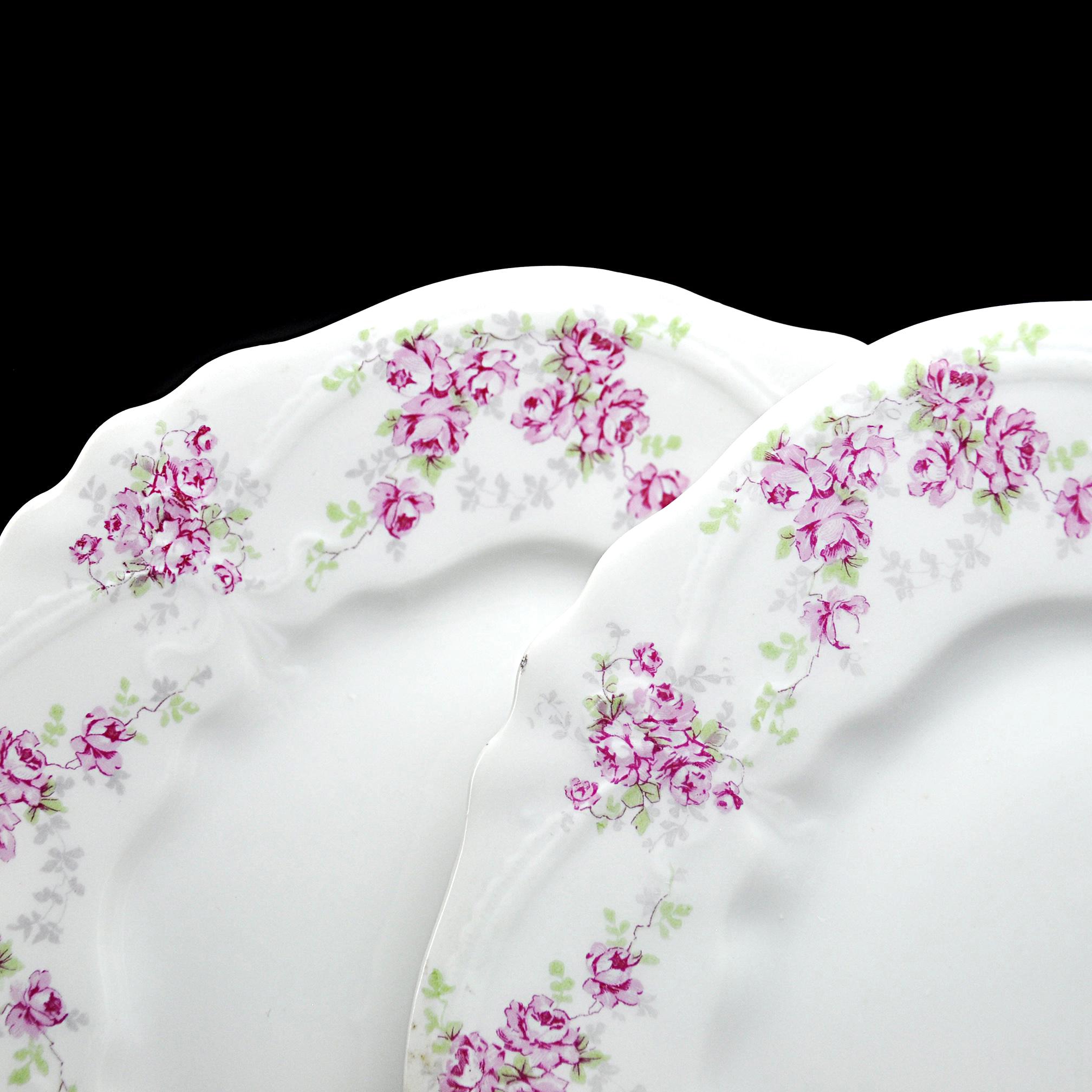 These lovely old plates come from a quieter time — late Victorian days when a pretty table was a sign of good company and good manners. Made by Carl Tielsch & Co. of Altwasser, Silesia (Germany) sometime between 1880 and 1900, each plate carries a soft garland of tiny pink roses and green leaves winding around the edge, framed by gentle scallops and raised scrollwork. These would look lovely on display, or they could easily serve again for dessert, tea sandwiches, or a quiet afternoon snack. Whether you’re replacing a lost piece or starting a new collection, they carry that unmistakable charm of the Victorian German porcelain era.
