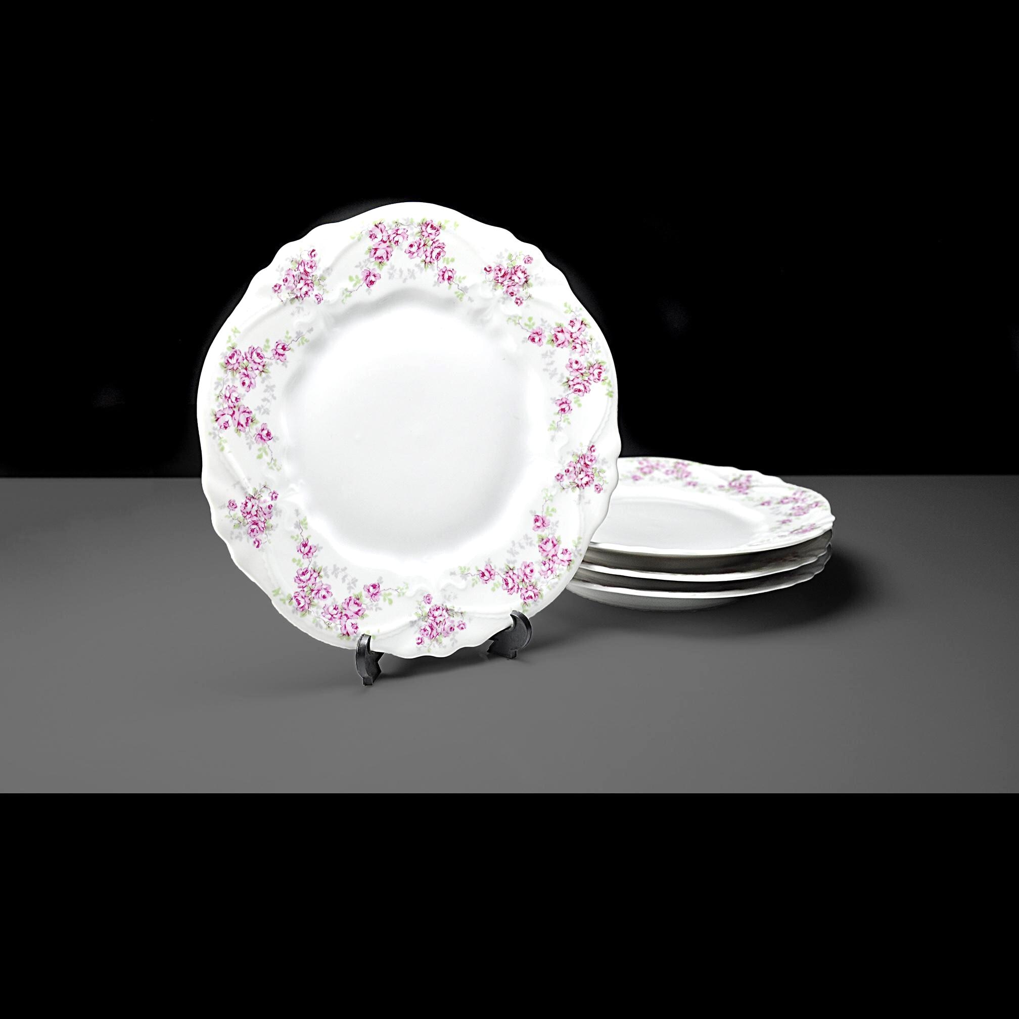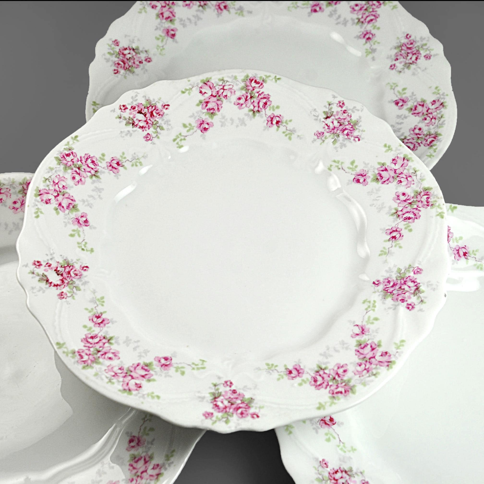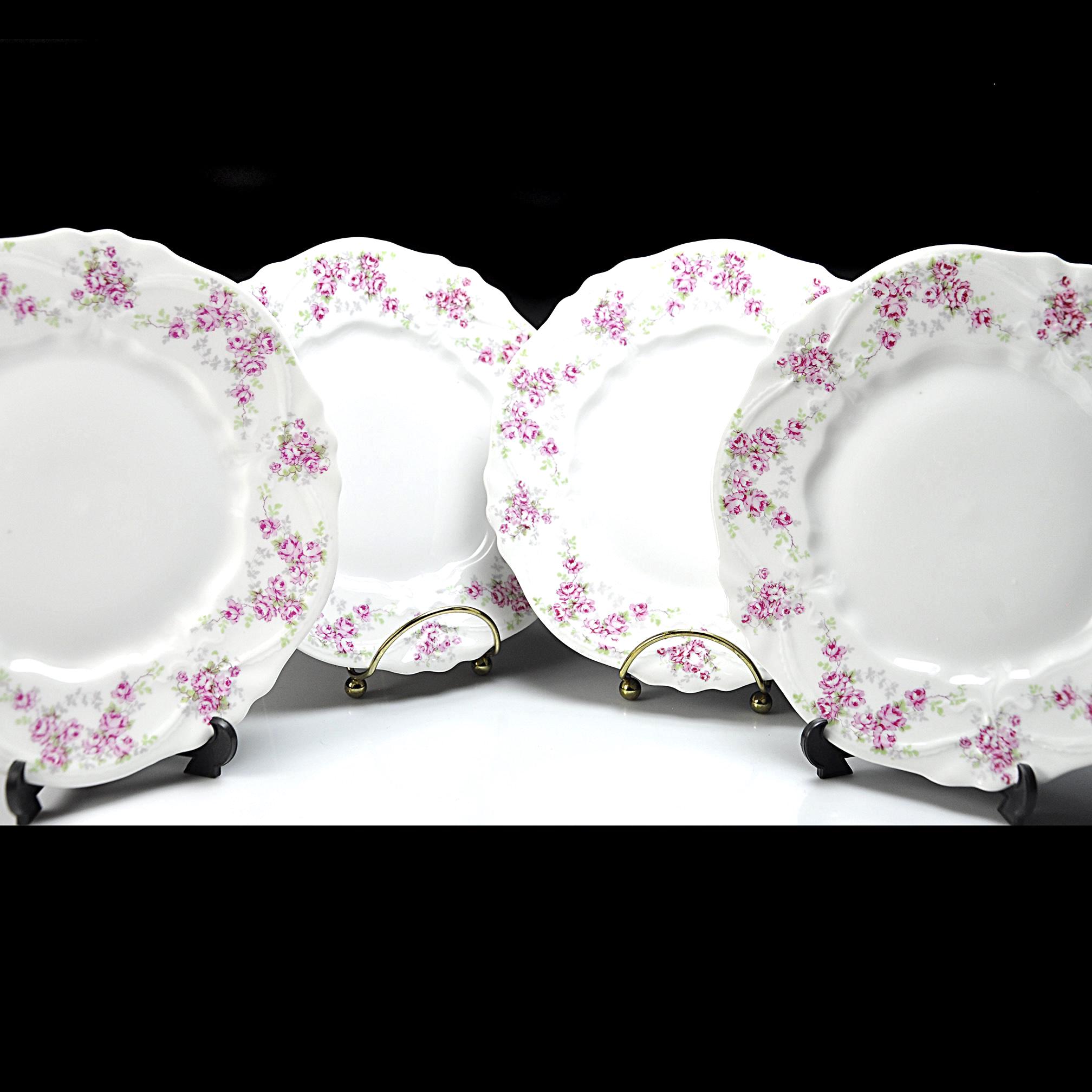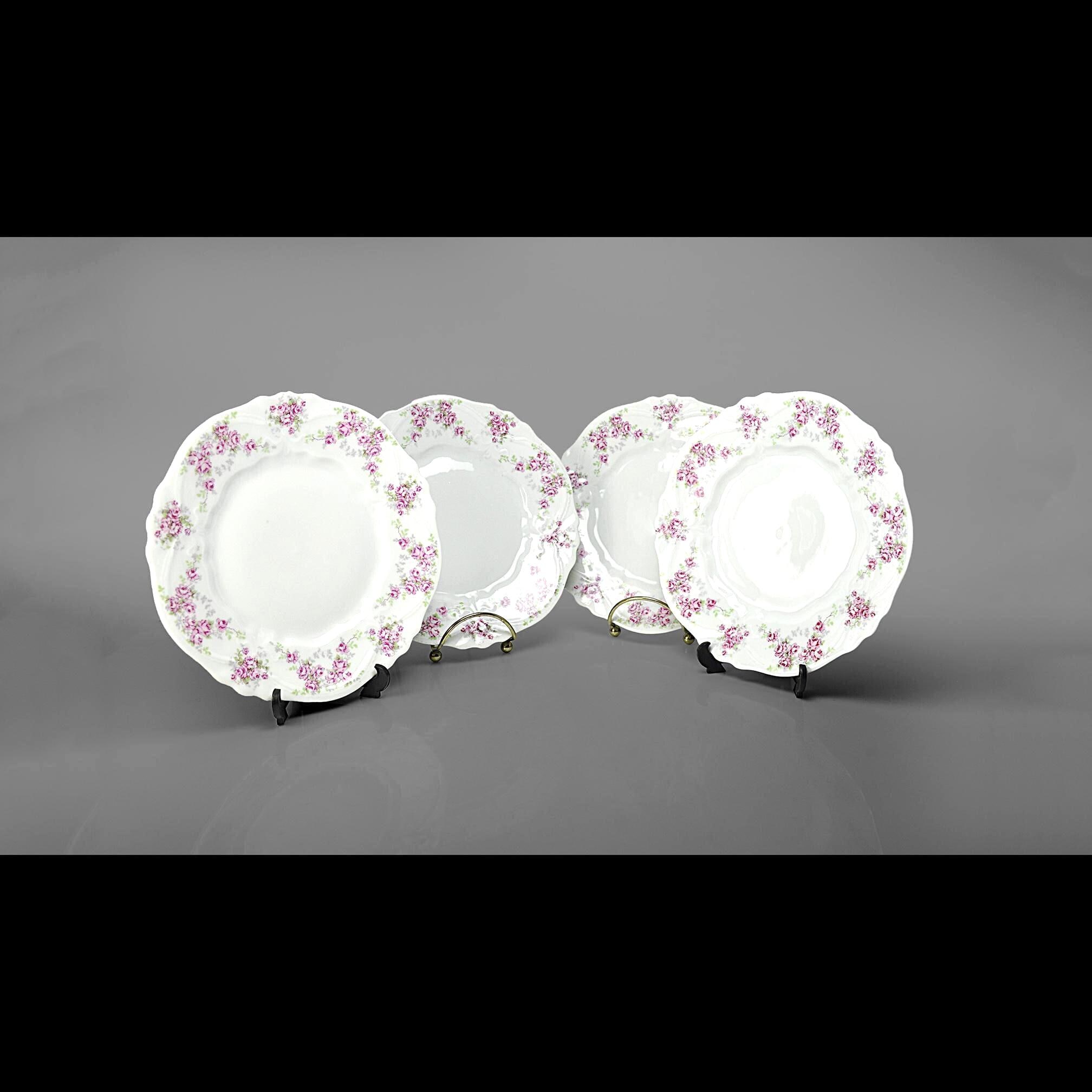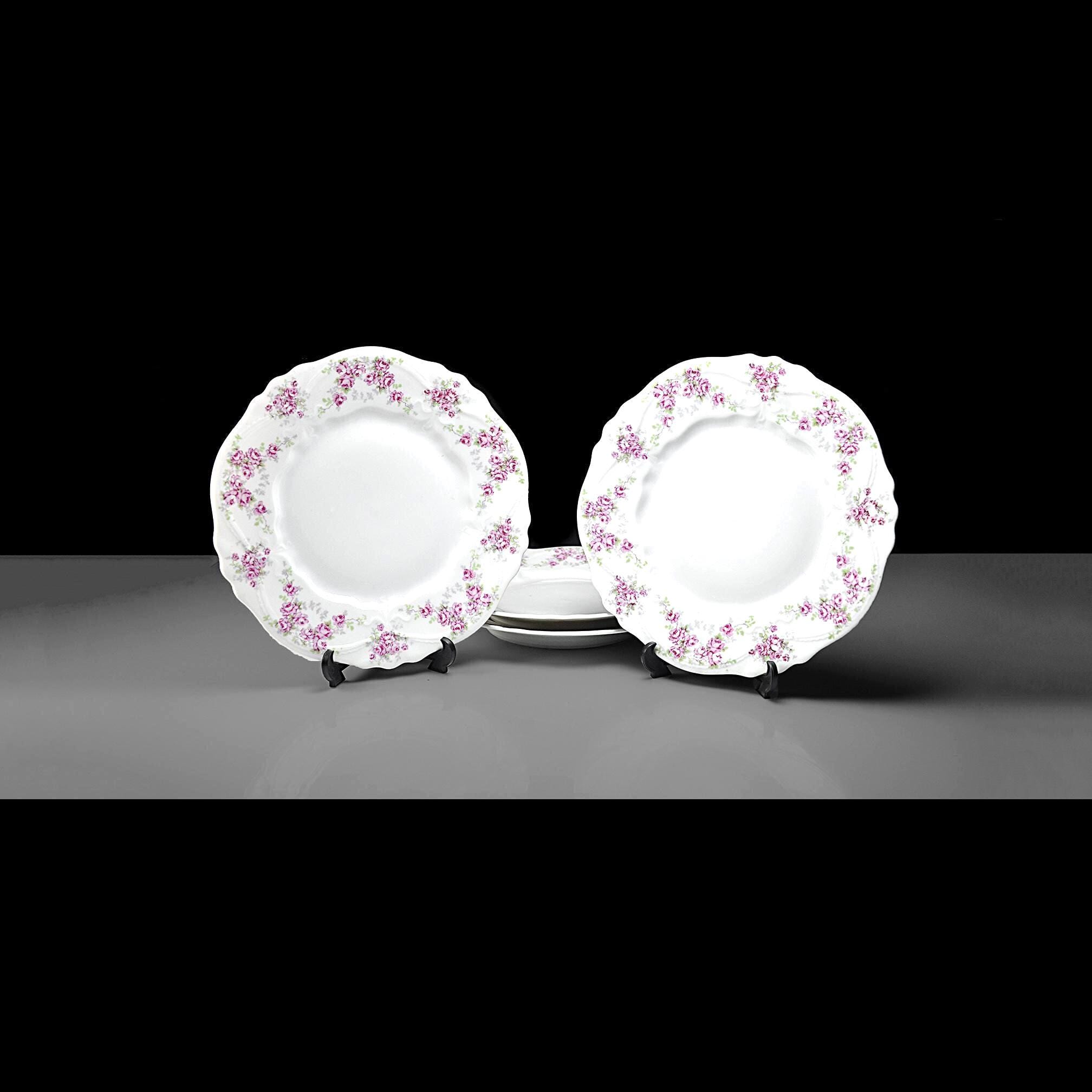 These lovely old plates come from a quieter time — late Victorian days when a pretty table was a sign of good company and good manners. Made by Carl Tielsch & Co. of Altwasser, Silesia (Germany) sometime between 1880 and 1900, each plate carries a soft garland of tiny pink roses and green leaves winding around the edge, framed by gentle scallops and raised scrollwork. These would look lovely on display, or they could easily serve again for dessert, tea sandwiches, or a quiet afternoon snack. Whether you’re replacing a lost piece or starting a new collection, they carry that unmistakable charm of the Victorian German porcelain era.