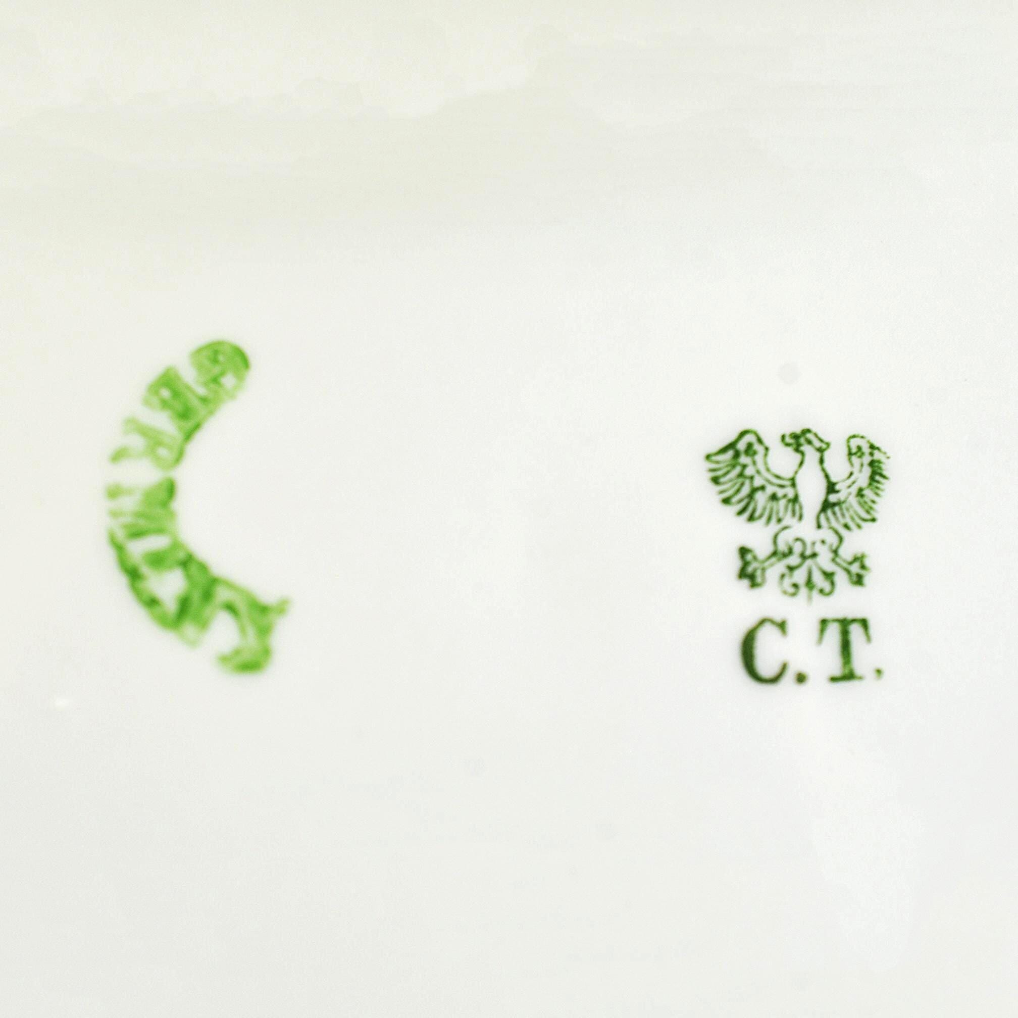 Two plates each have one small chip on the underside rim only (not visible from top). None of the plates have any cracks or crazing. Amazingly they have only light utensil marks. These are made of fine white porcelain — thin, but strong, with that faint translucent glow you only see in old European china. The maker’s mark on the back shows the green eagle with “C.T.” beneath, used by Tielsch in the late 19th century.