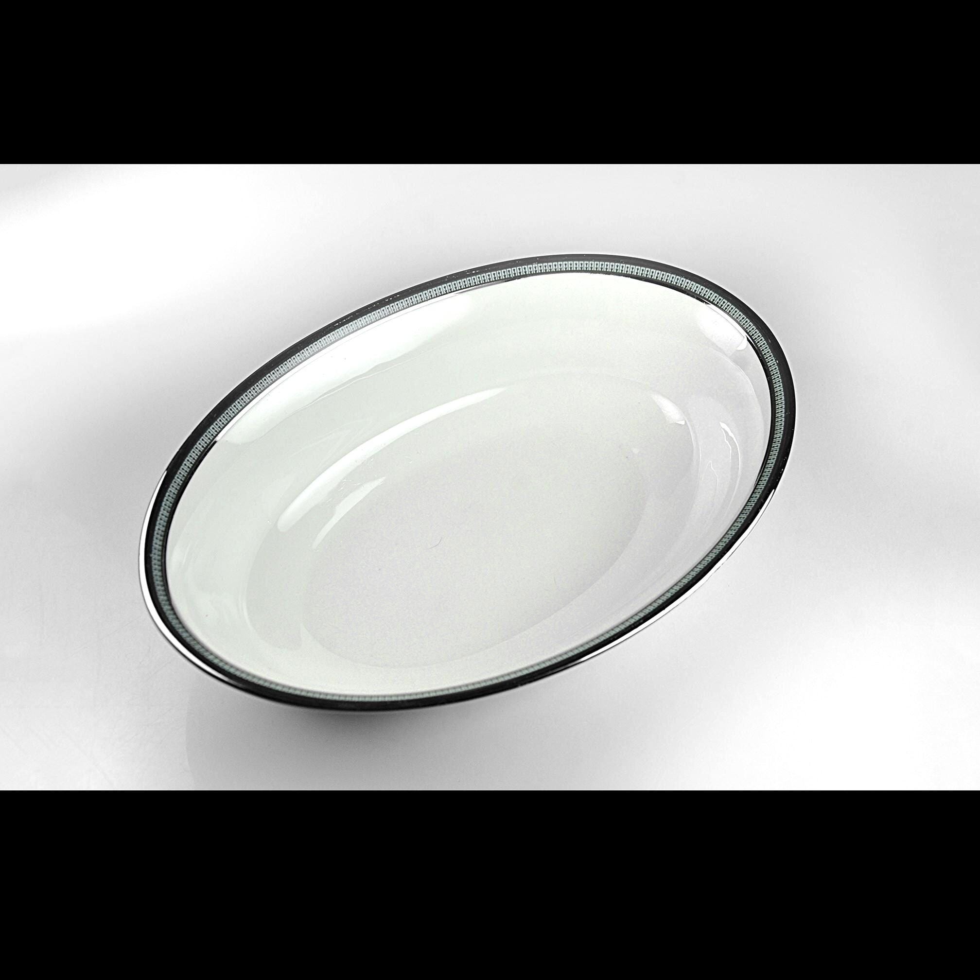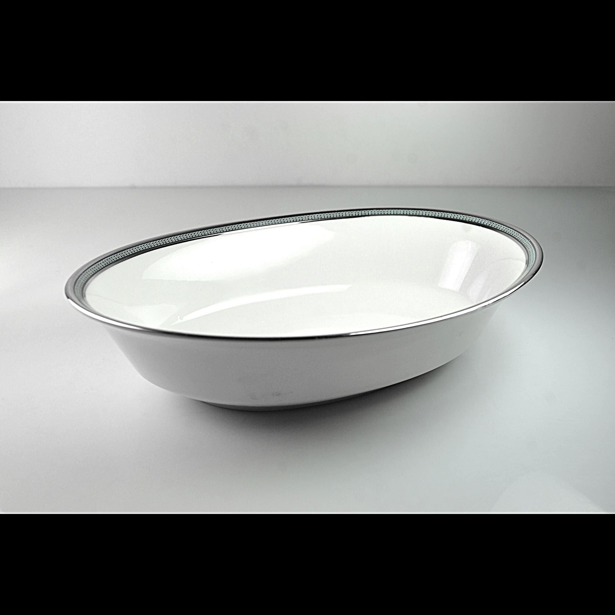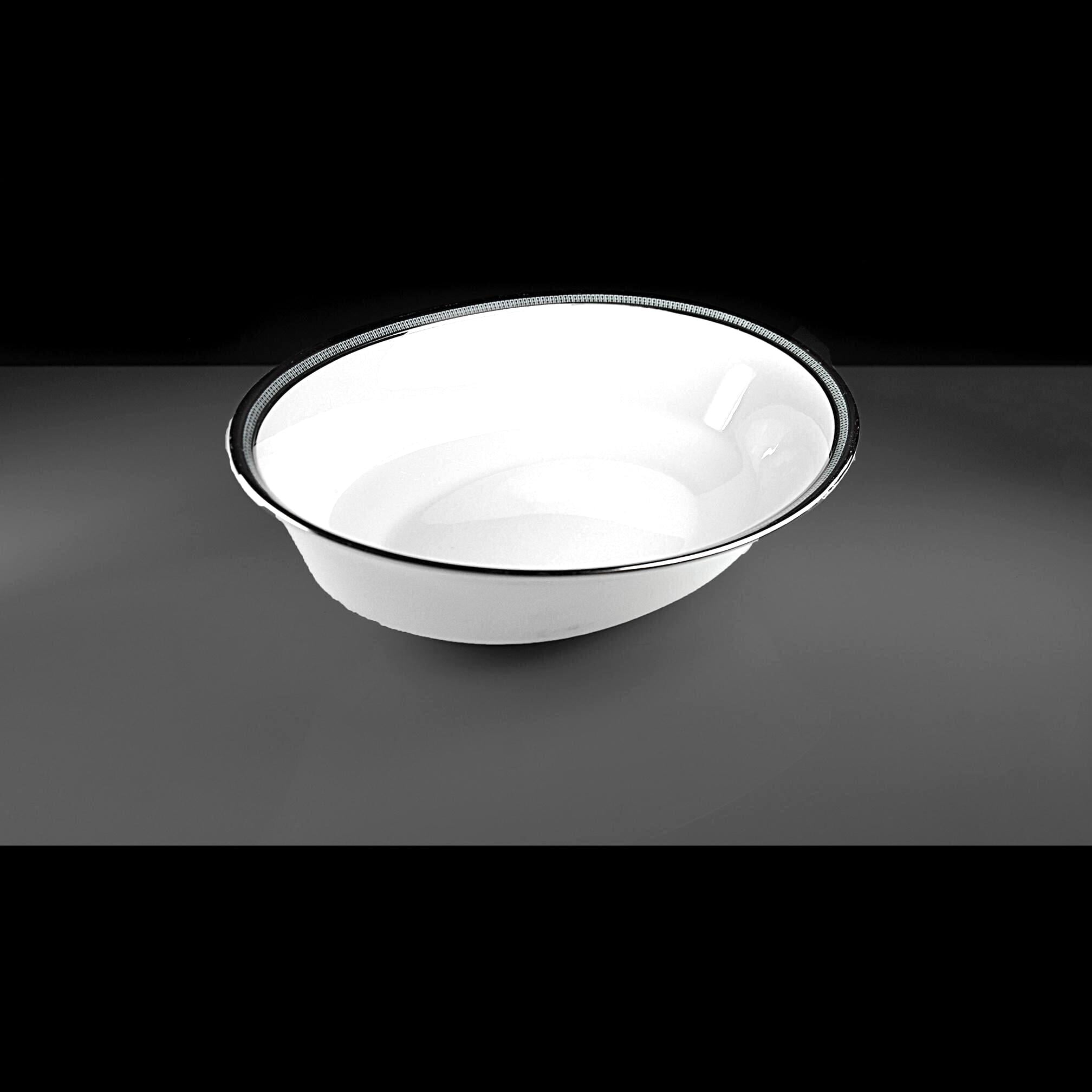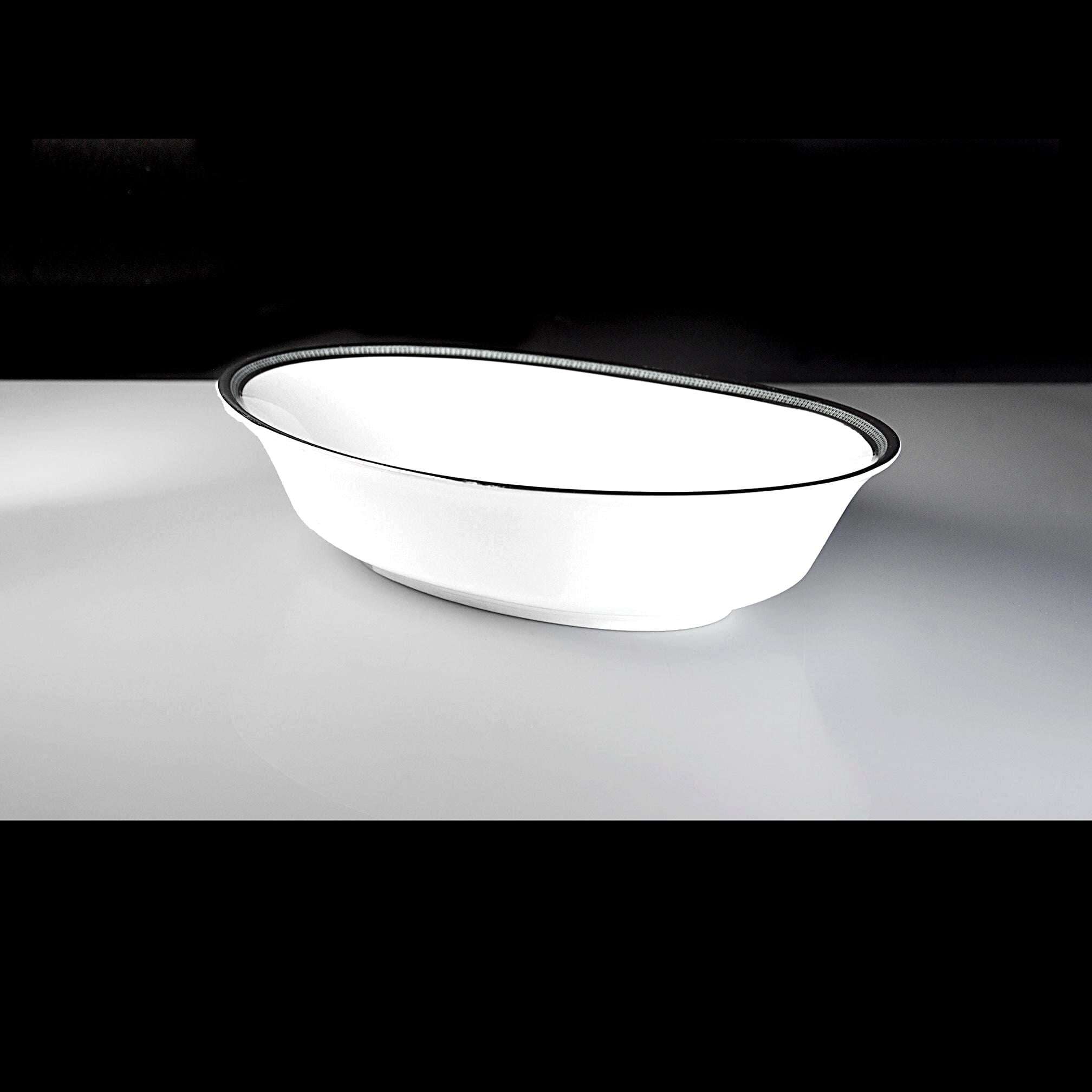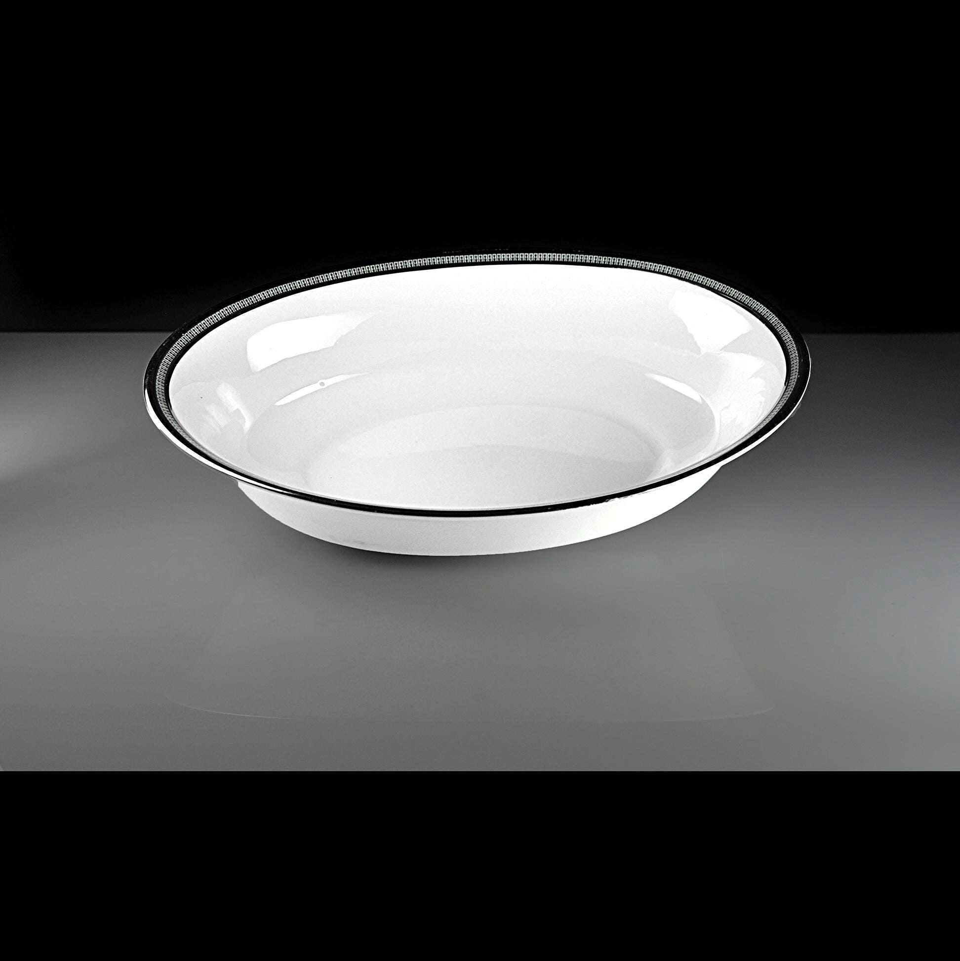 There’s something quietly elegant about this Oxford Bone China bowl — the kind of dish that never shouts for attention but always seems to be the one everyone reaches for when the meal is ready. It’s from the Dawn pattern, made by Oxford Bone China in the U.S.A. sometime between the 1970s and early 1980s, when table settings were still simple, refined, and built to last. It’s made of true bone china — bright white, smooth to the touch, with a soft inner glow that catches the light just so. The platinum trim and the delicate geometric band give it that classic mid-century modern look without losing its timeless charm. You can imagine it filled with buttery mashed potatoes on a Sunday table, or perhaps holding green beans at a family holiday dinner — those moments where everything slows down a bit and the table feels full of good company.