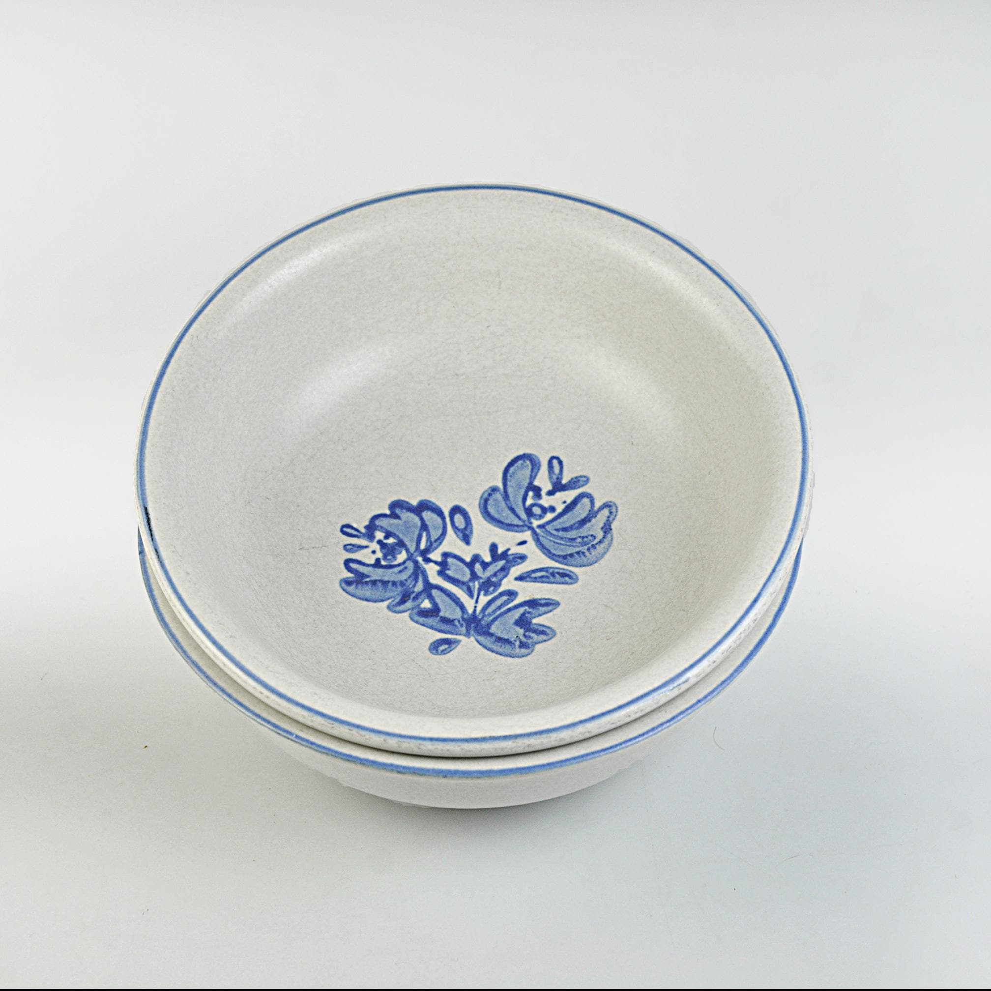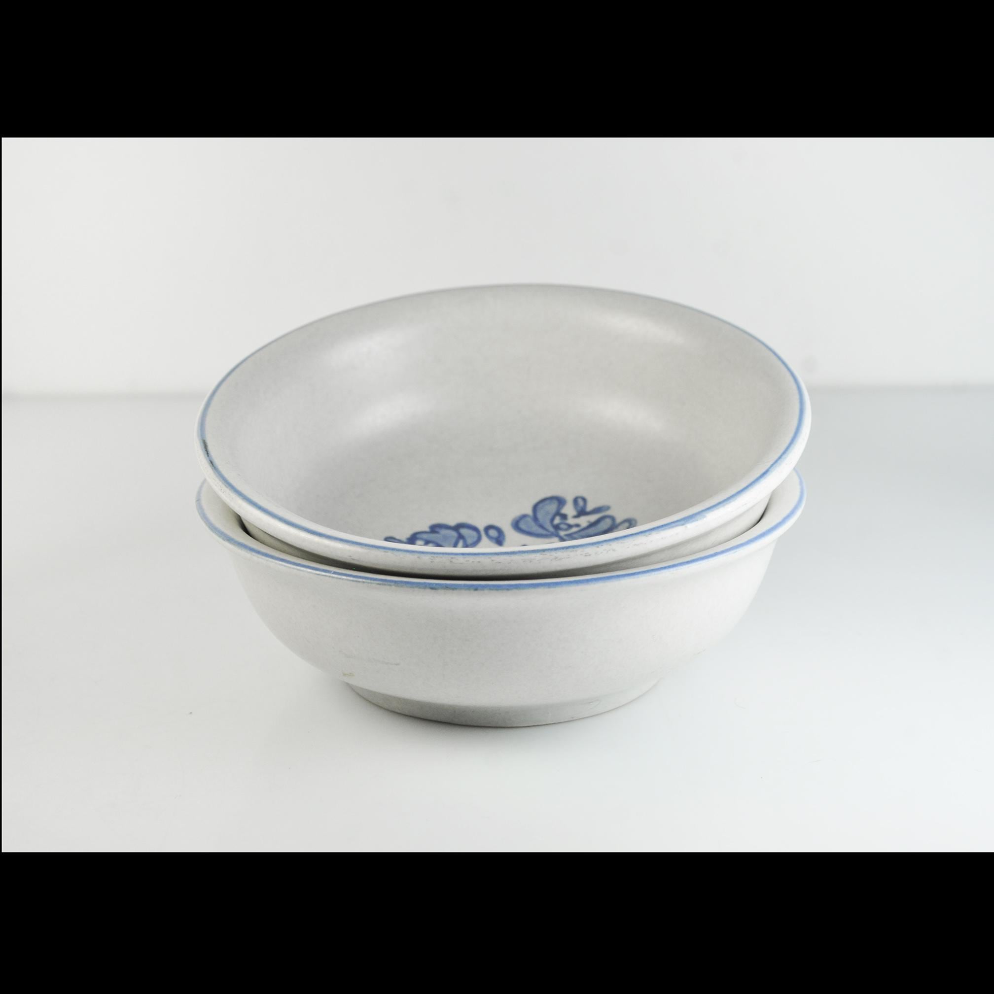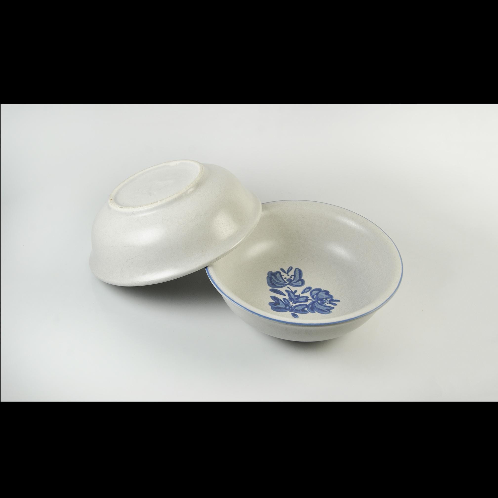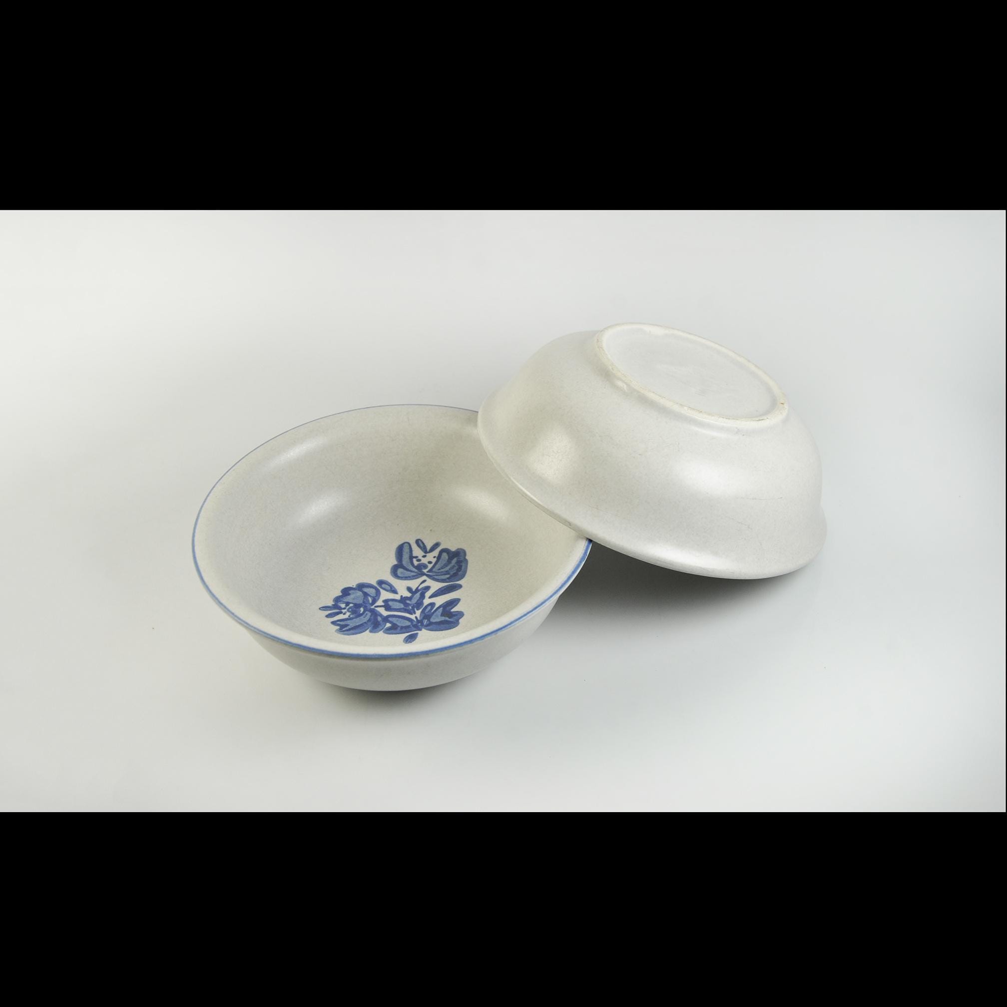 There’s something about Pfaltzgraff’s Yorktowne pattern that feels like home. These bowls take you right back to a kitchen where the coffee was strong, the bread was warm, and supper was served with a wooden spoon straight from the pot. These classic stoneware bowls feature the familiar soft gray-beige glaze with hand-painted style blue flowers — a pattern that’s been at countless family tables for generations. They’re sturdy and comforting, meant to be used and enjoyed, not just admired on a shelf. Perfect for morning cereal, soup on a cold night, or a helping of homemade stew. A simple, honest pair of bowls that have seen many meals and will see many more.