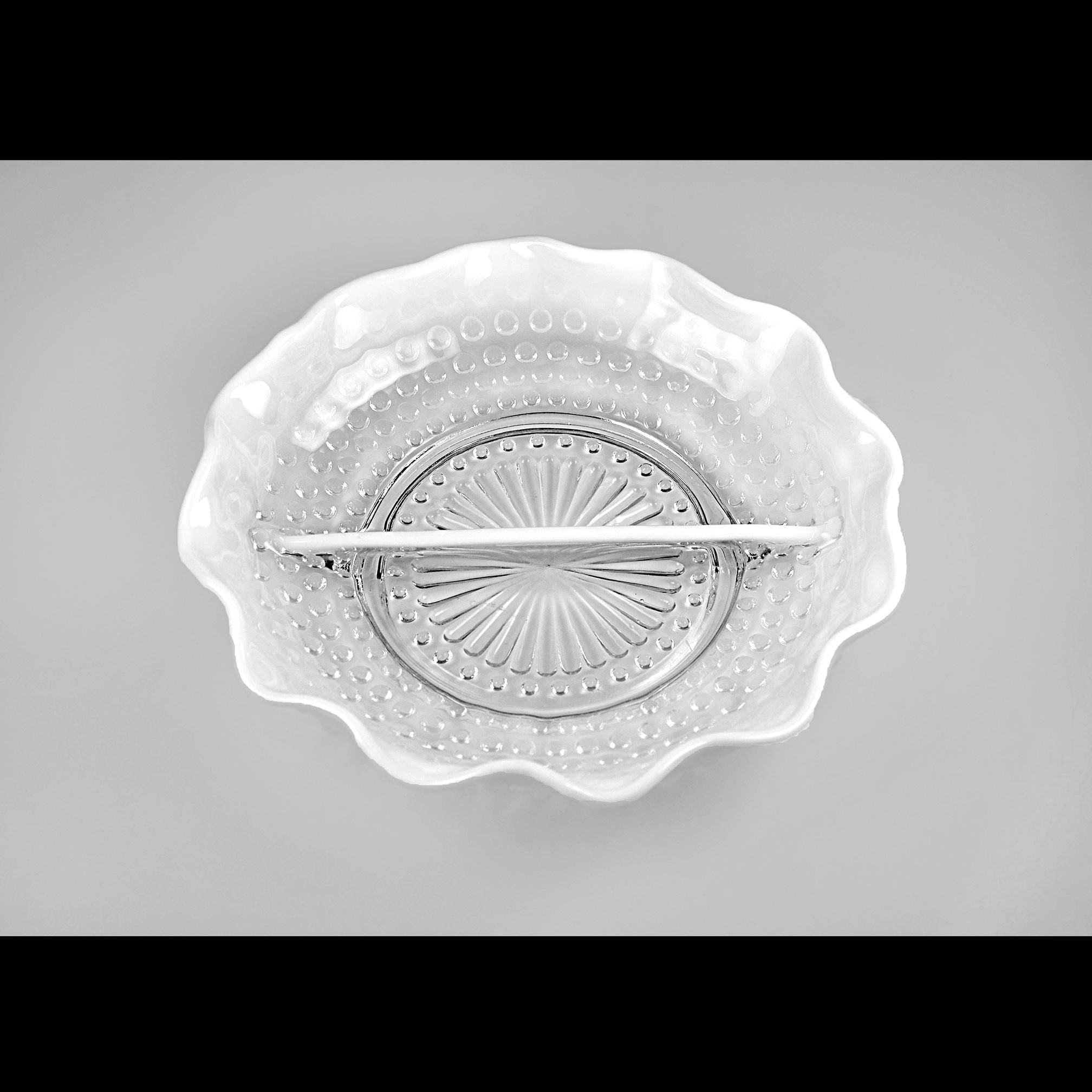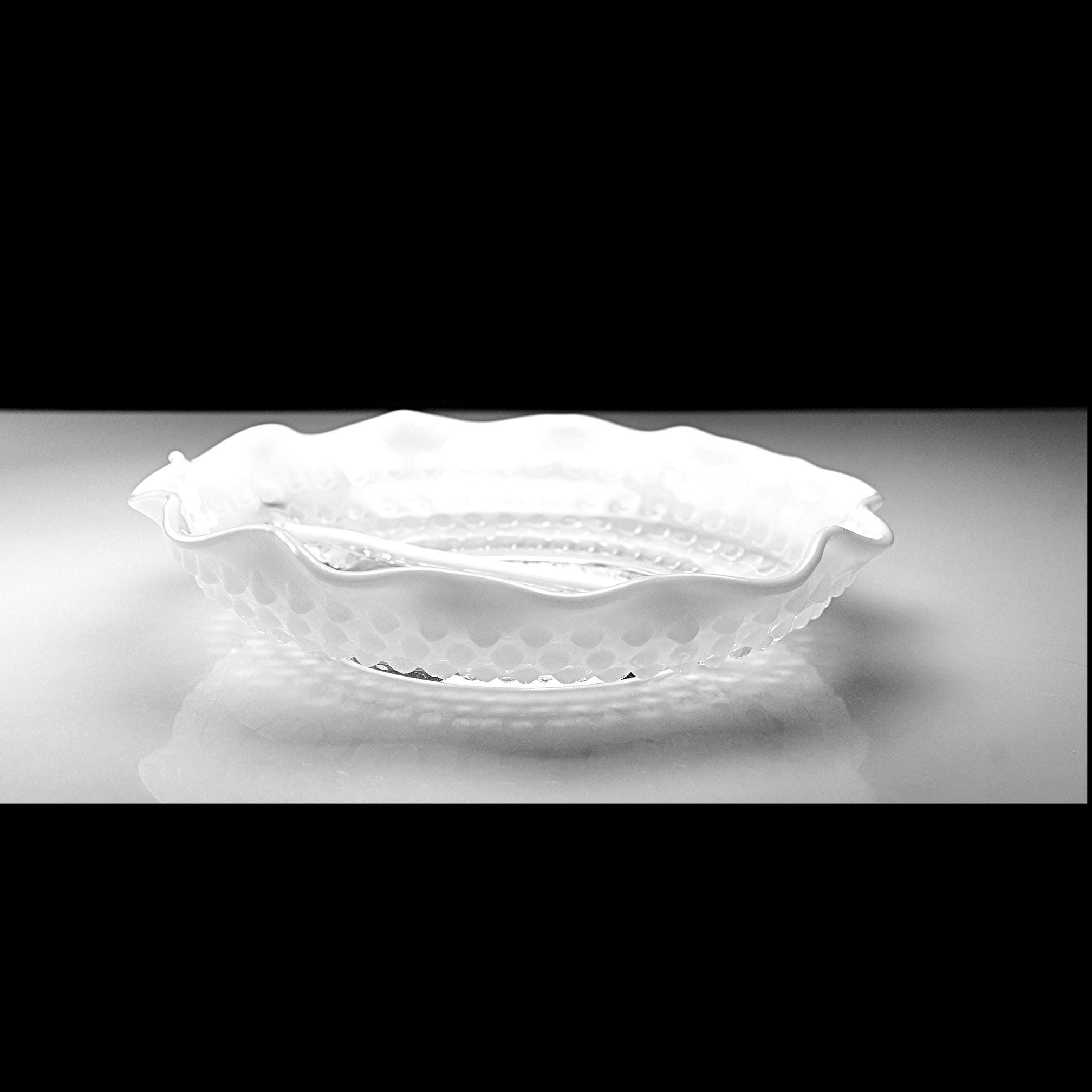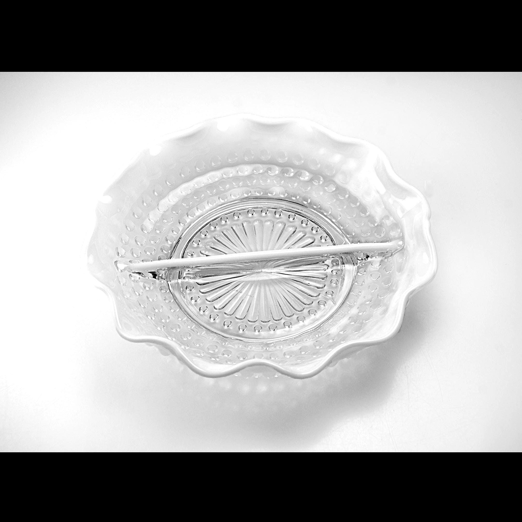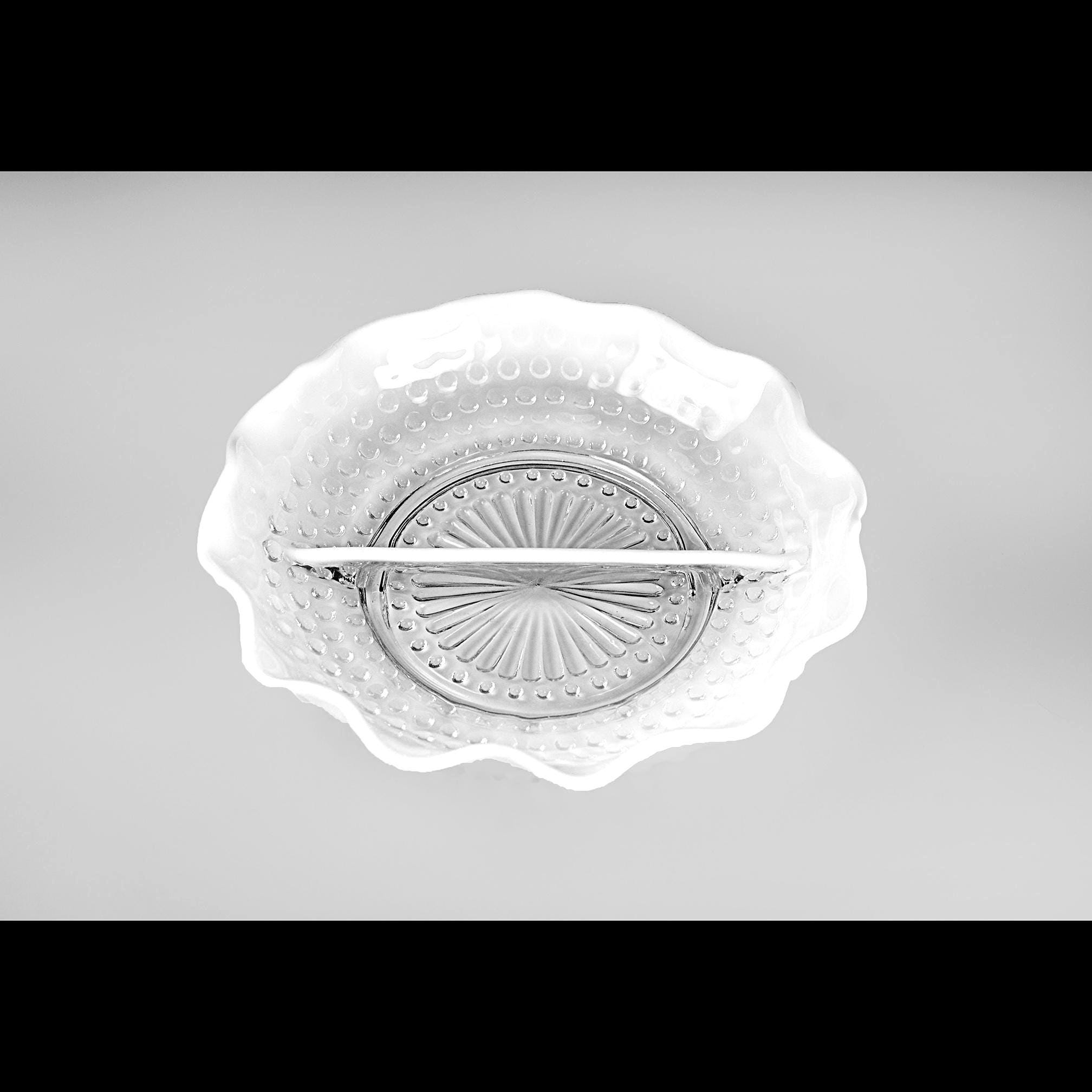 There’s just something about old glass that tells its own story — and this Moonstone Opalescent divided dish from Anchor Hocking has that timeless charm that only the 1940s could give. Made between 1941 and 1946, this piece has that beautiful fade from clear glass to milky white along its ruffled edge, with raised hobnail dots that catch the light just right. The divided center makes it perfect for relishes, nuts, or candies — or even as a dresser dish for jewelry. Back then, people liked their serving dishes to be as pretty as they were practical, and this one surely fits the bill. If you love early Fire-King this one’s a gem — sturdy, graceful, and easy to imagine on a Sunday dinner table, filled with olives and pickles while the roast was being carved.