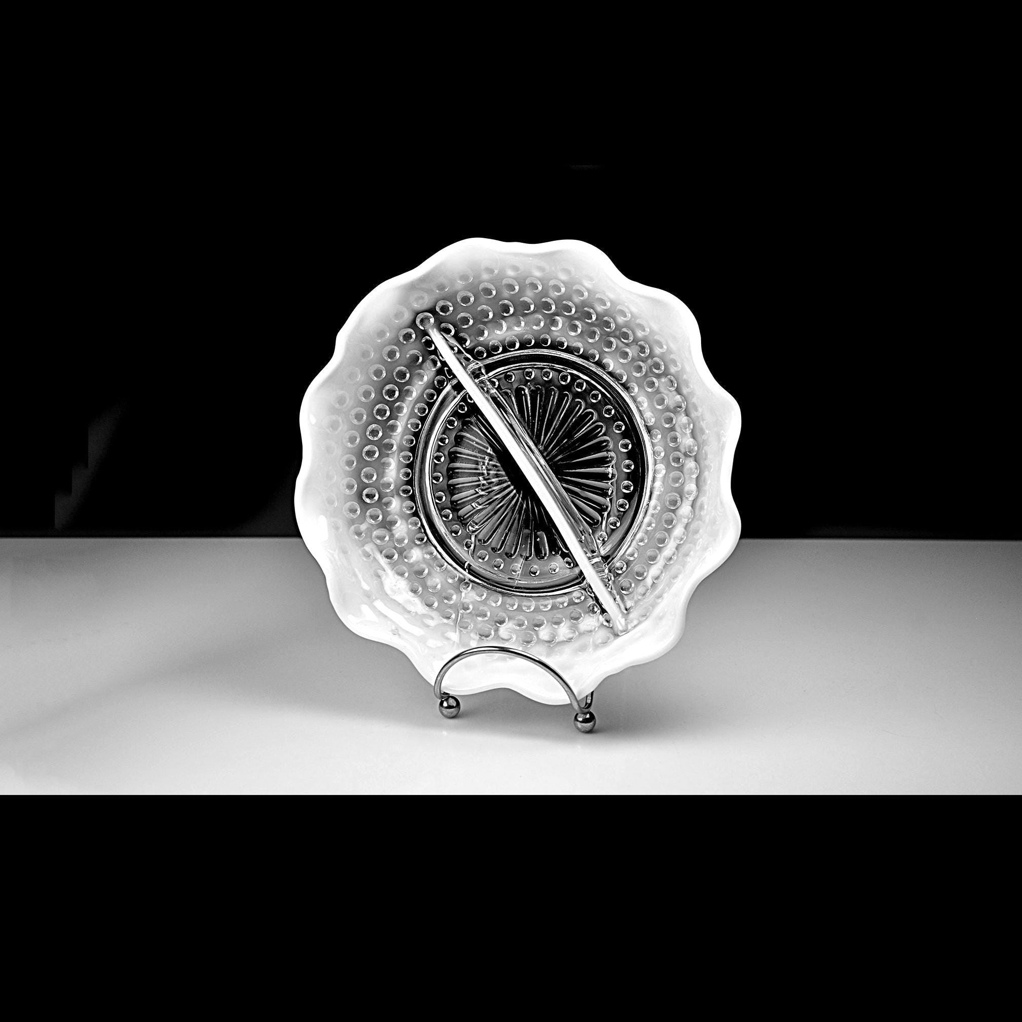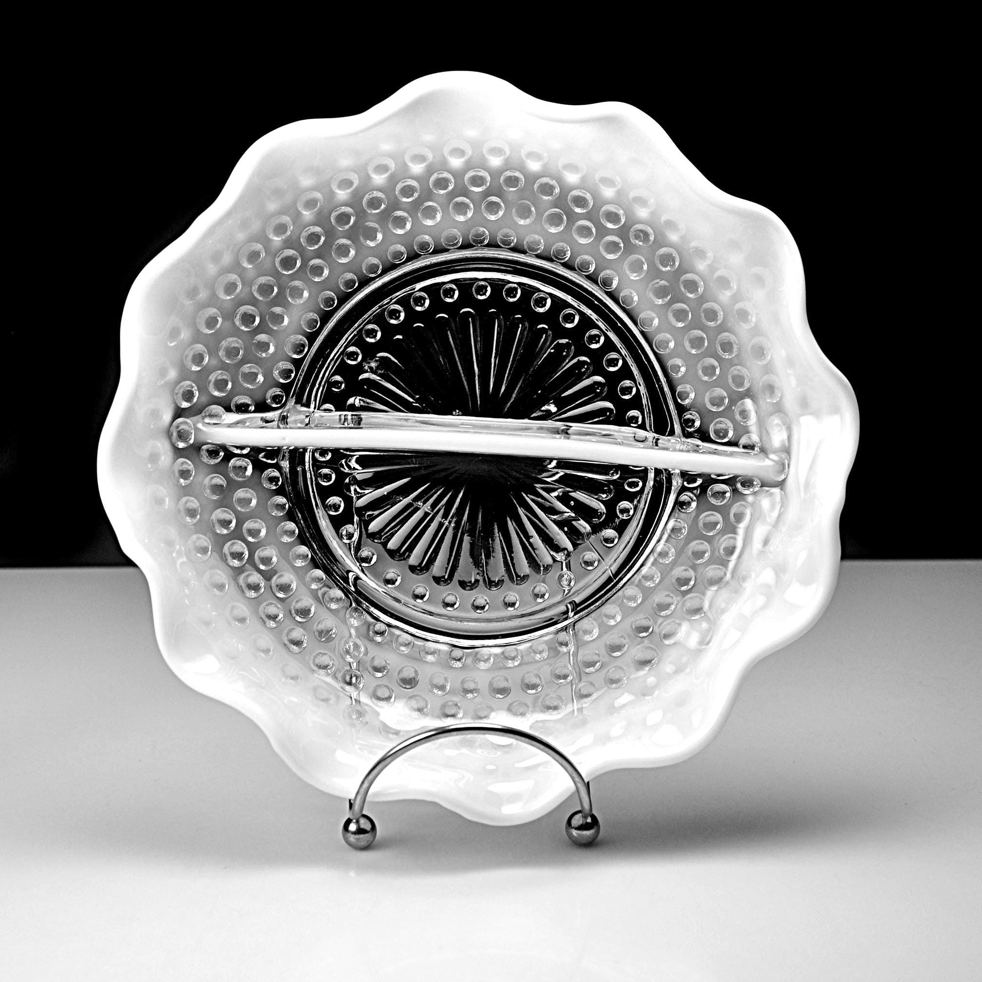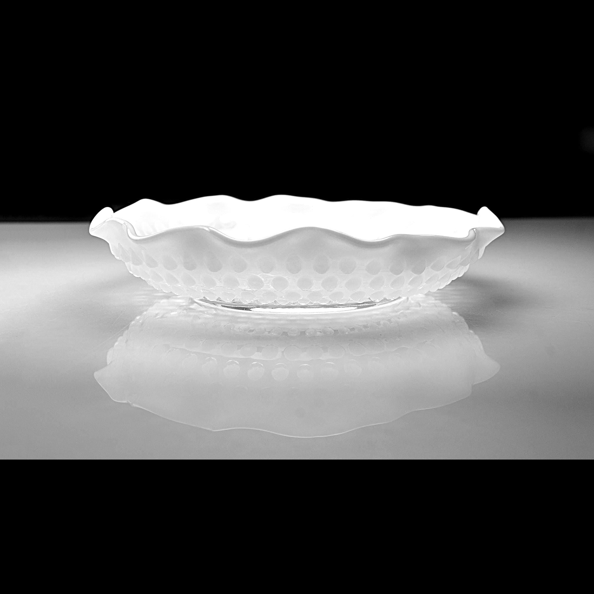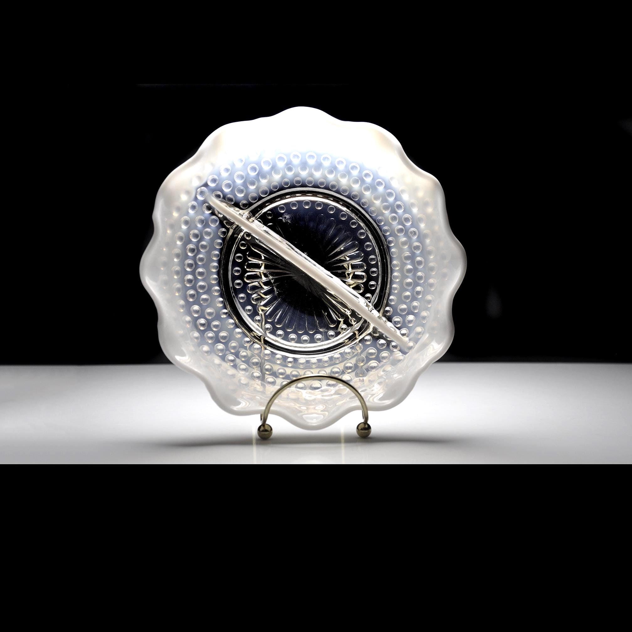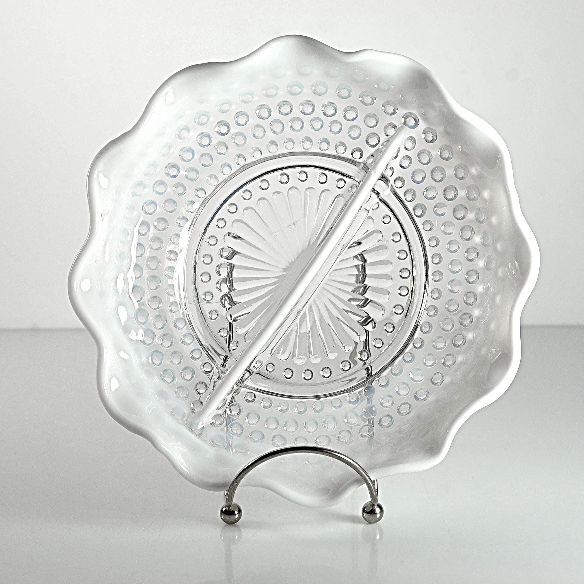 There’s just something about old glass that tells its own story — and this Moonstone Opalescent divided dish from Anchor Hocking has that timeless charm that only the 1940s could give. Made between 1941 and 1946, this piece has that beautiful fade from clear glass to milky white along its ruffled edge, with raised hobnail dots that catch the light just right. The divided center makes it perfect for relishes, nuts, or candies — or even as a dresser dish for jewelry. Back then, people liked their serving dishes to be as pretty as they were practical, and this one surely fits the bill. If you love early Fire-King this one’s a gem — sturdy, graceful, and easy to imagine on a Sunday dinner table, filled with olives and pickles while the roast was being carved.