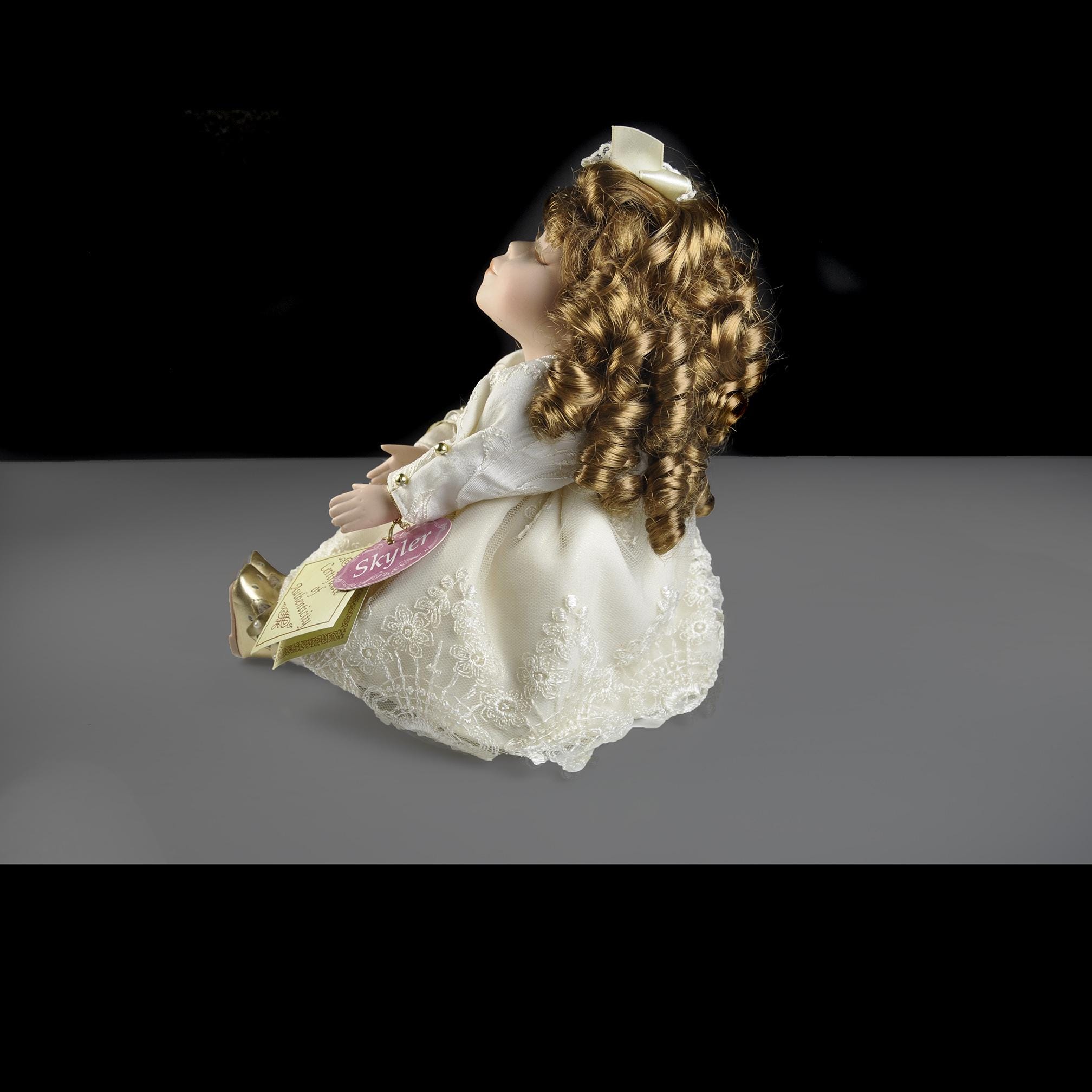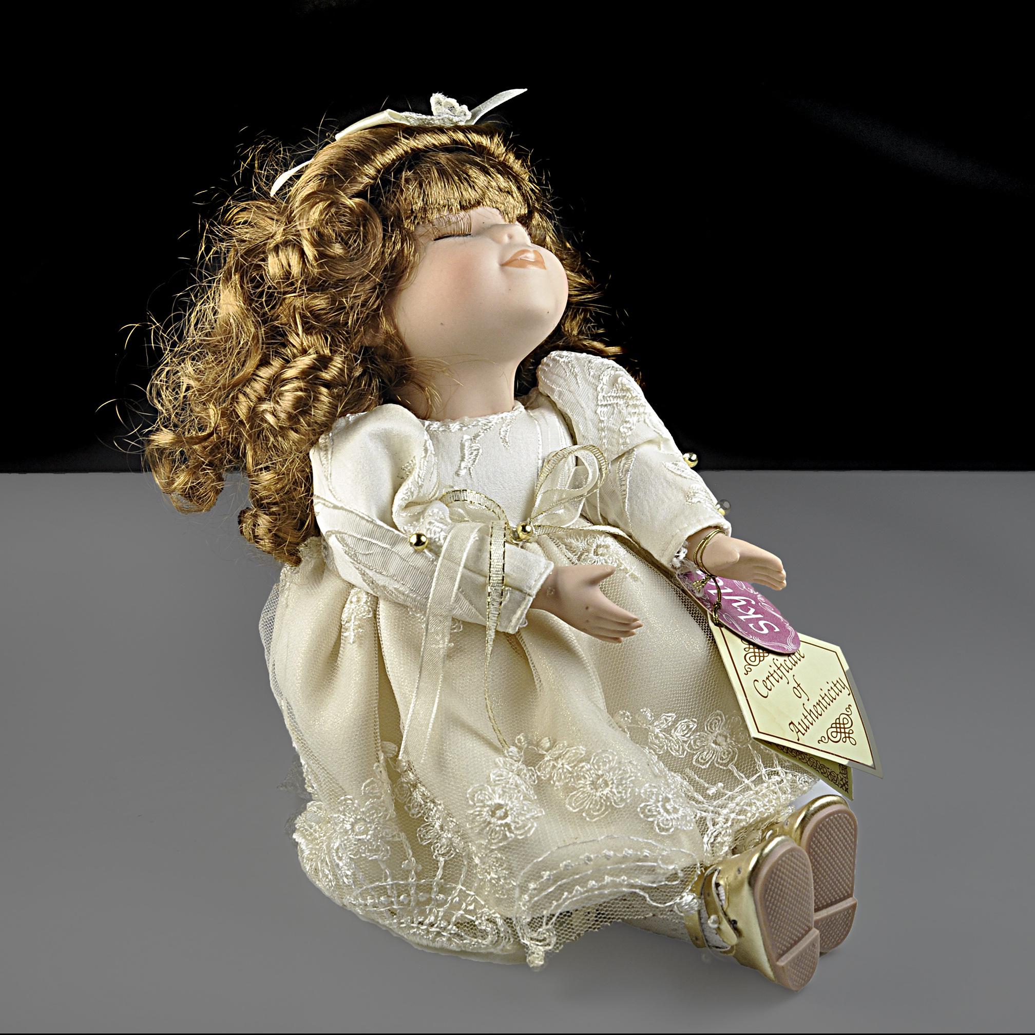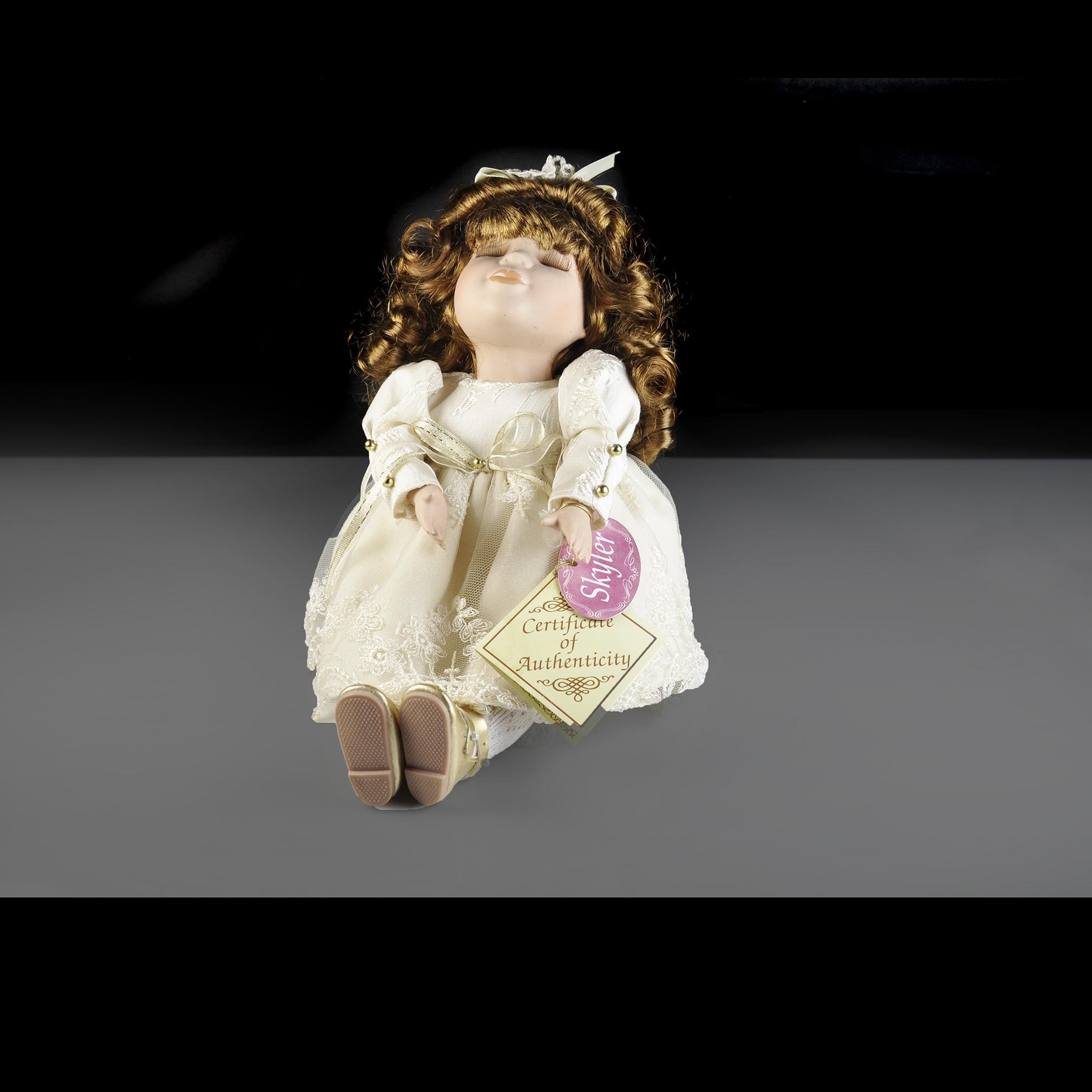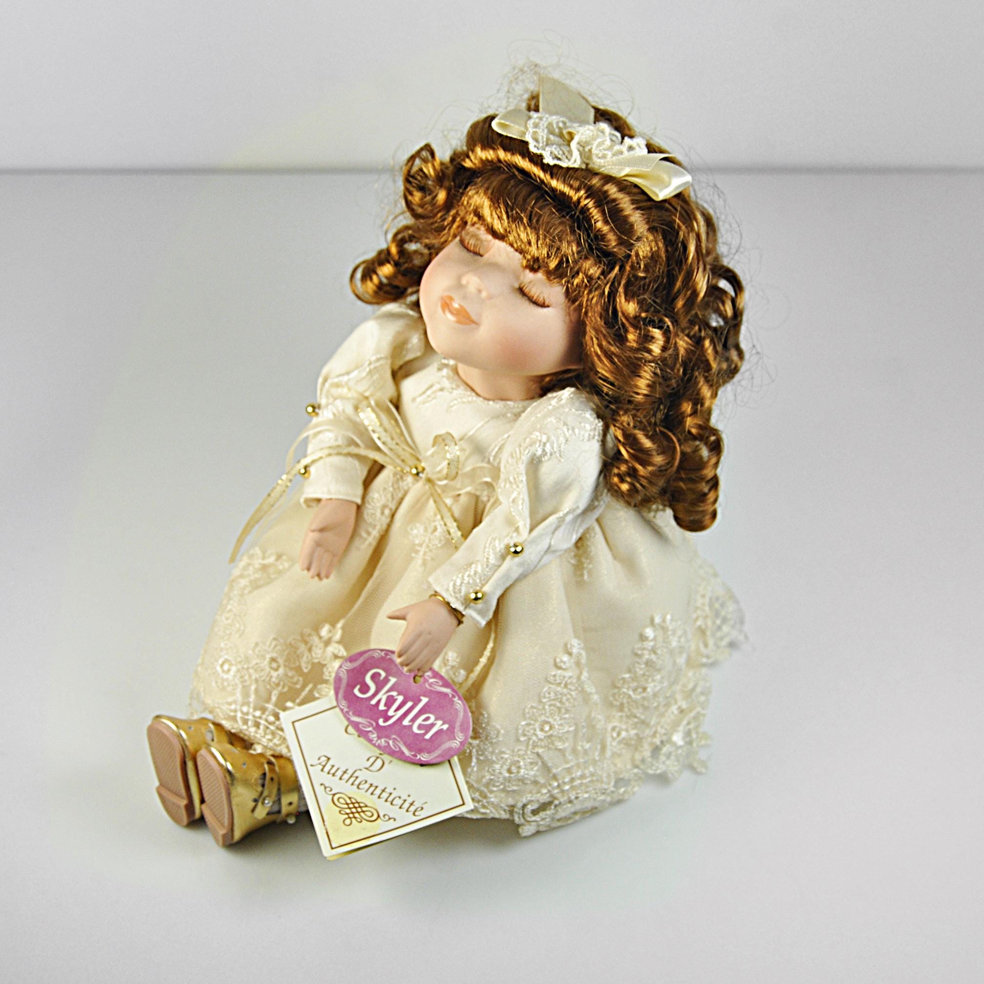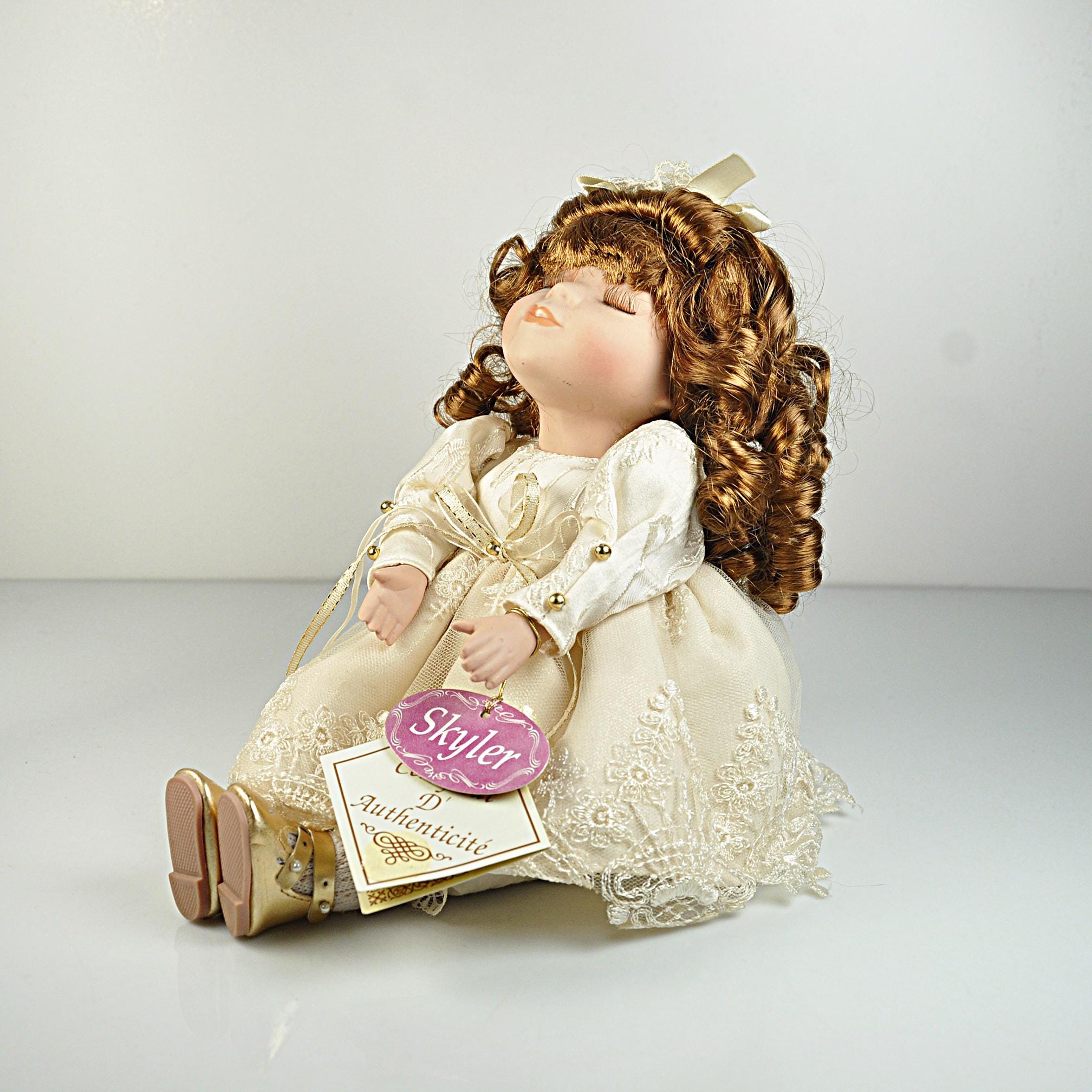 Sometimes it’s the simple little things that bring back the best memories. Skyler is one of those dolls that looks like she came straight from a cozy corner shelf in the 1990s — the kind that played softly while the Christmas lights twinkled nearby. This sweet porcelain doll from Dan Dee’s Collector’s Choice line sits peacefully with her eyes closed, lost in the notes of “The Dance of the Sugar Plum Fairy.” When you wind her up, she gently moves to the music, her soft curls bouncing ever so slightly. Skyler is dressed in an ivory satin gown trimmed with lace, gold ribbon, and tiny beads — the kind of dress that catches the light just right. She still has her original hang tag and Certificate of Authenticity, a small reminder of when these dolls were proudly displayed in curio cabinets or gifted to someone who loved porcelain collectibles.