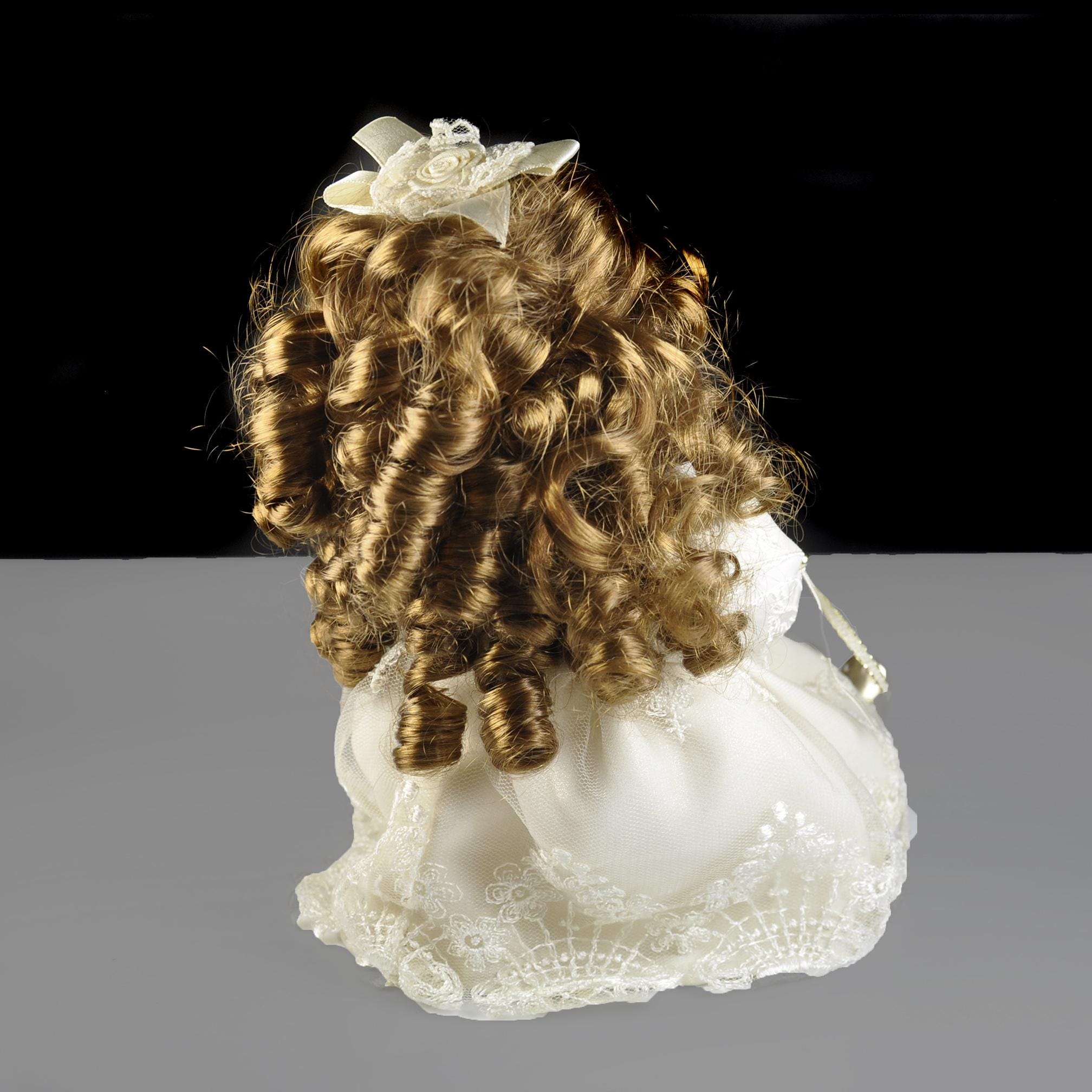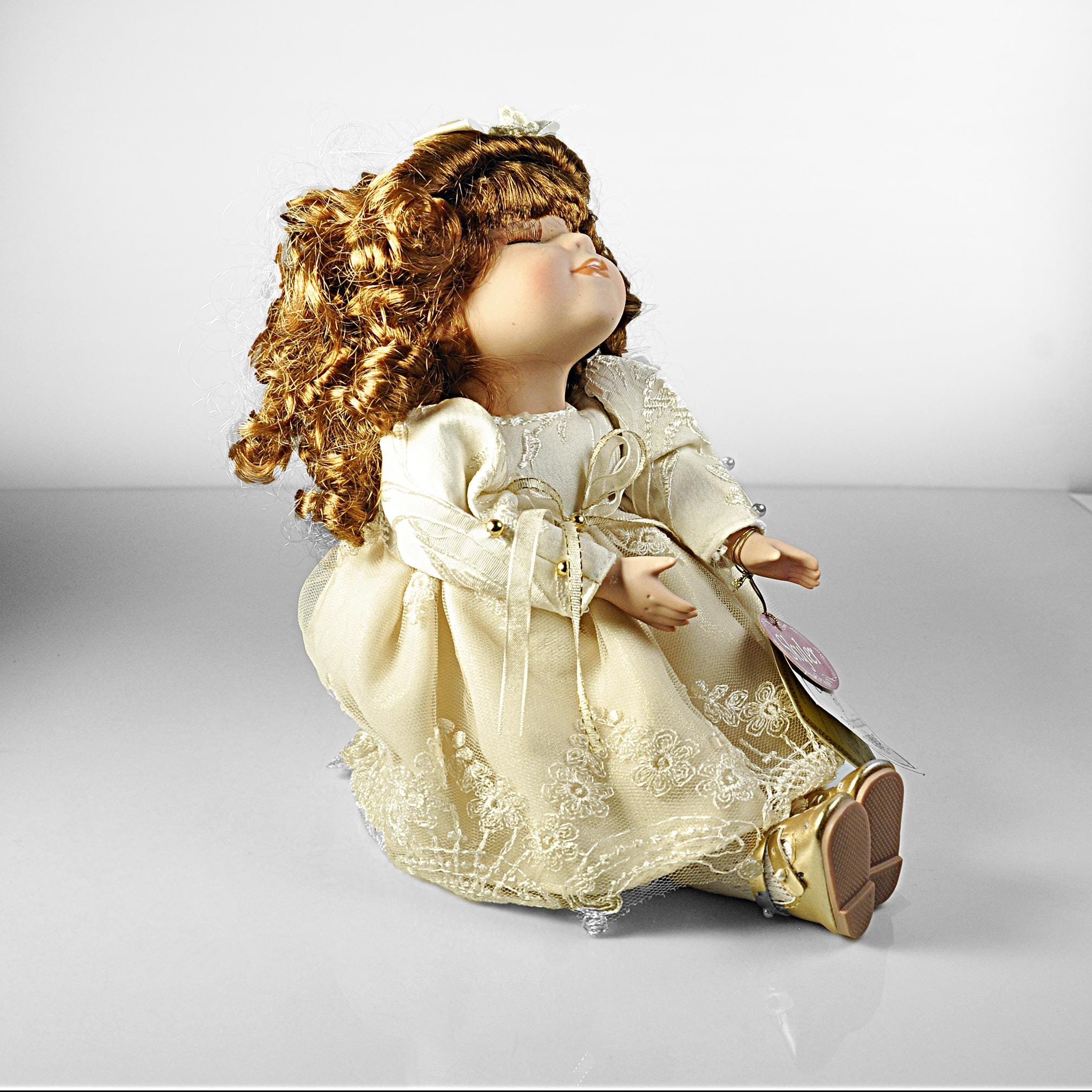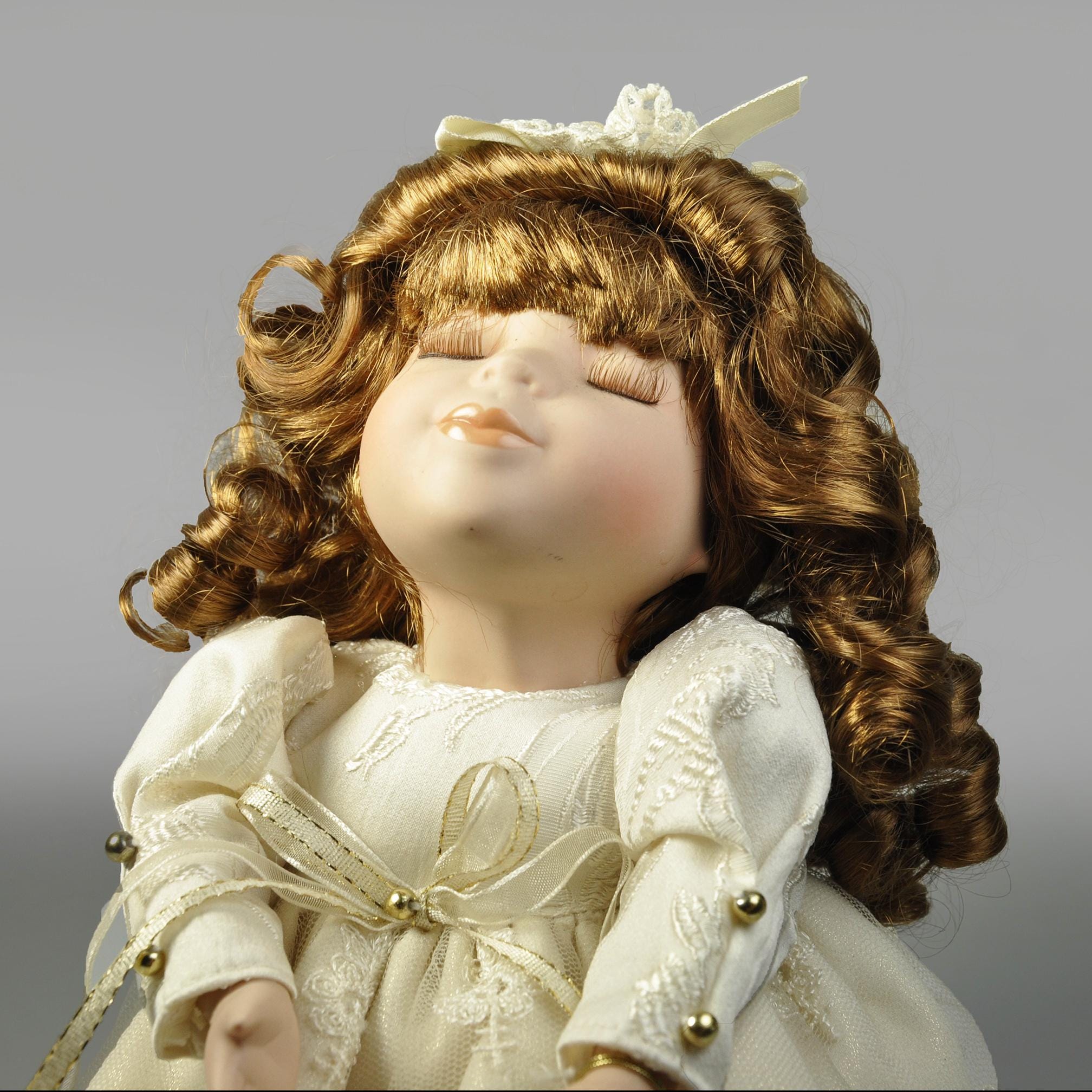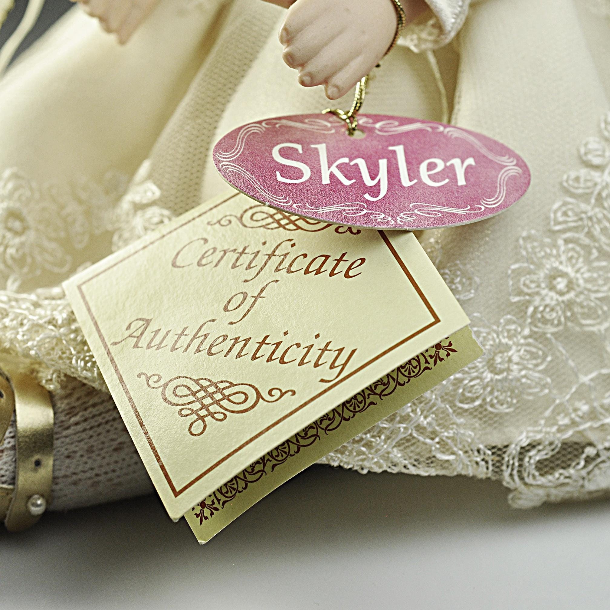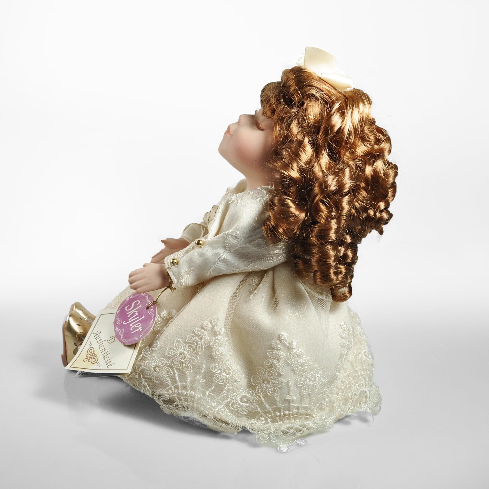 Sometimes it’s the simple little things that bring back the best memories. Skyler is one of those dolls that looks like she came straight from a cozy corner shelf in the 1990s — the kind that played softly while the Christmas lights twinkled nearby. This sweet porcelain doll from Dan Dee’s Collector’s Choice line sits peacefully with her eyes closed, lost in the notes of “The Dance of the Sugar Plum Fairy.” When you wind her up, she gently moves to the music, her soft curls bouncing ever so slightly. Skyler is dressed in an ivory satin gown trimmed with lace, gold ribbon, and tiny beads — the kind of dress that catches the light just right. She still has her original hang tag and Certificate of Authenticity, a small reminder of when these dolls were proudly displayed in curio cabinets or gifted to someone who loved porcelain collectibles.