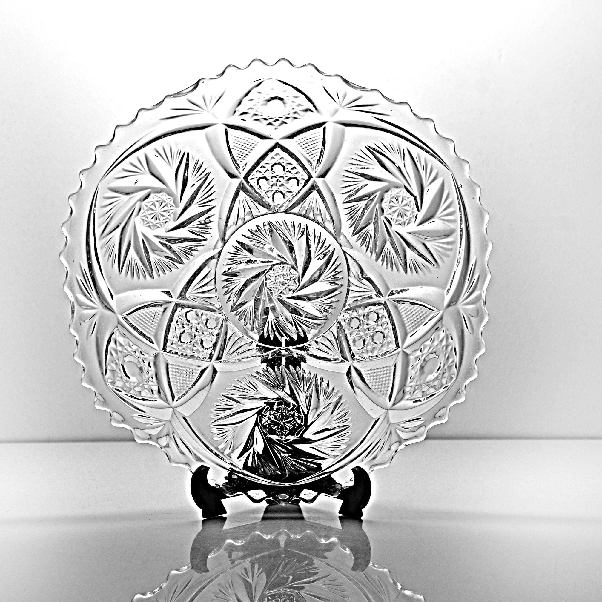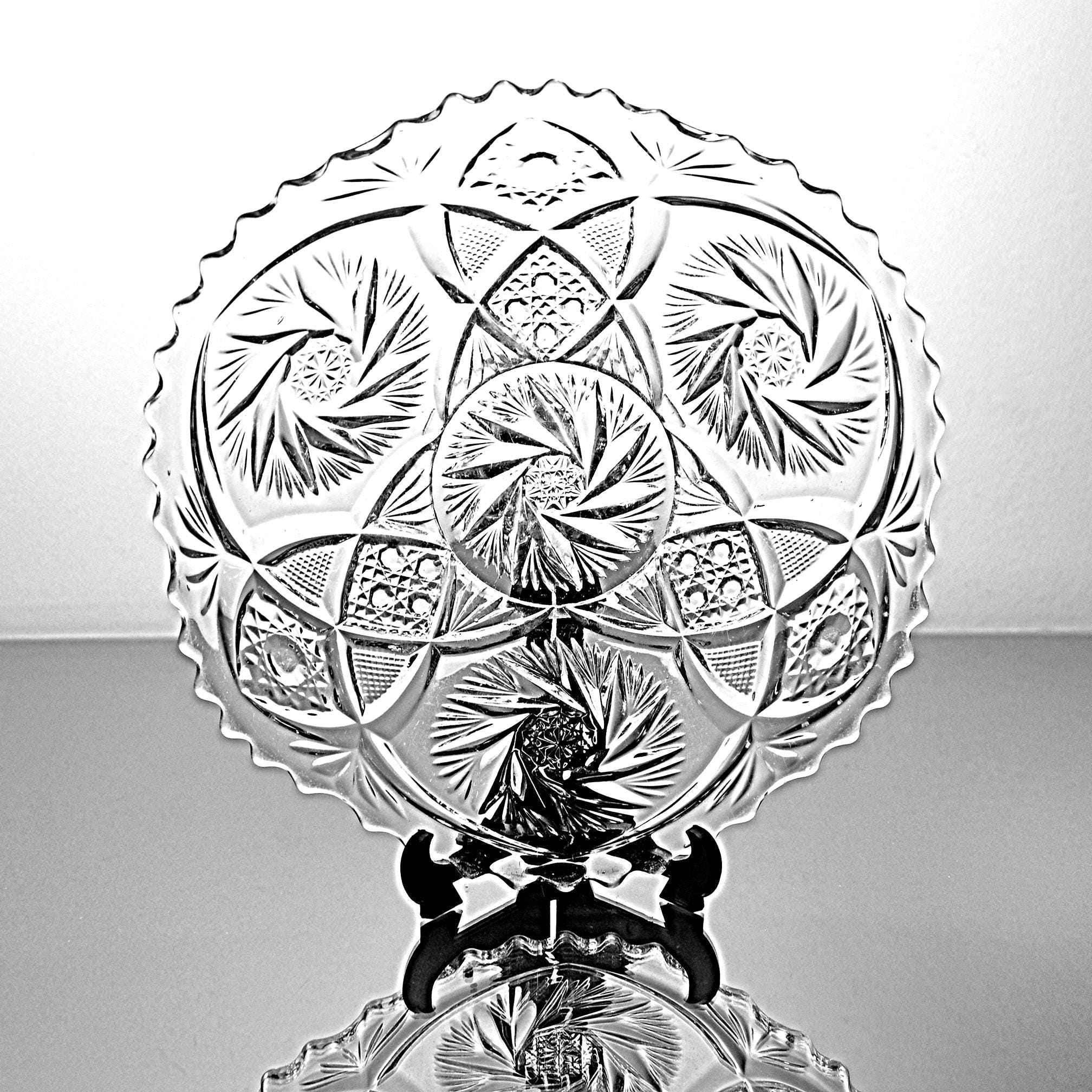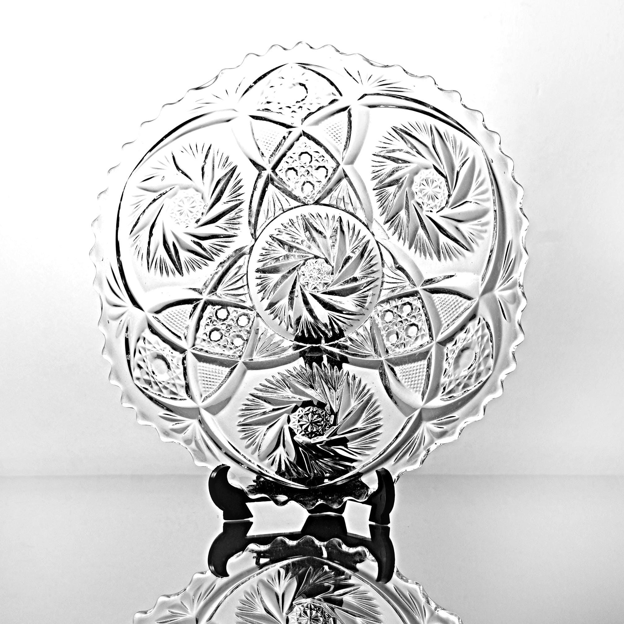 There’s a quiet beauty in these early pieces of Imperial Glass — the kind of sparkle that doesn’t shout but still draws your eye when the light hits it just right. This 8-inch footed bowl carries the NUCUT mark at its center, a proud stamp from the days when Imperial Glass Company of Bellaire, Ohio was determined to bring the look of fine cut crystal into everyday homes. Dating from around 1904 to 1914, this bowl was part of Imperial’s pressed imitation cut glass line — made to resemble hand-cut crystal but sturdy enough for the table. The detailed pinwheel and hobstar pattern gives it that Edwardian-era charm, while the scalloped edge softens the bold design just enough. It’s heavy, bright, and feels as solid in your hands as the day it was made. You can imagine it once sitting on a lace-covered table, filled with oranges or wrapped candies, catching bits of lamplight in every cut. Over a century later, it still does its job beautifully — ready to serve, display, or simply sparkle on a shelf.
