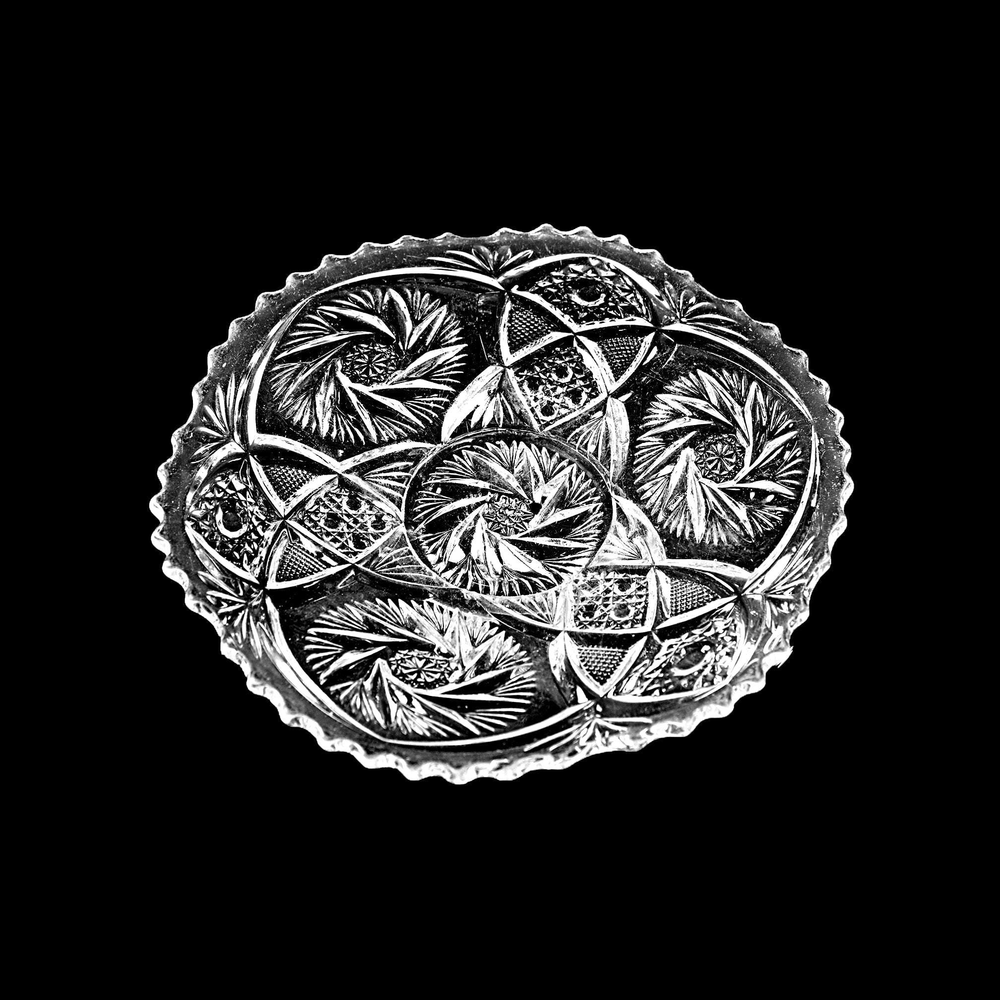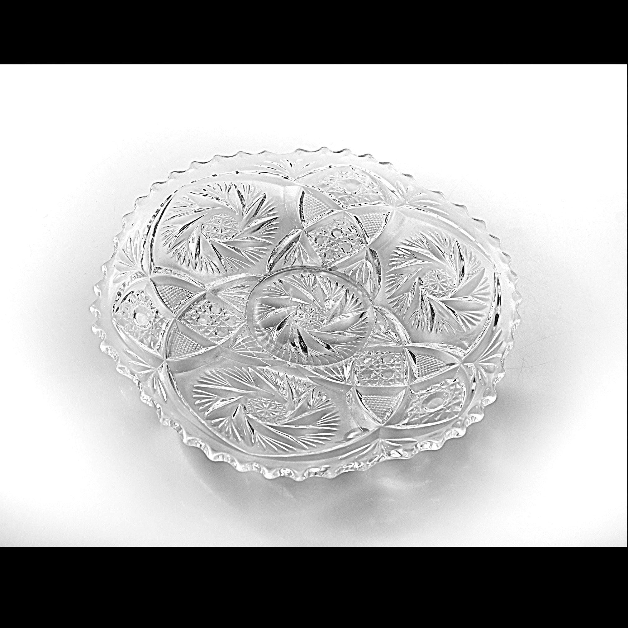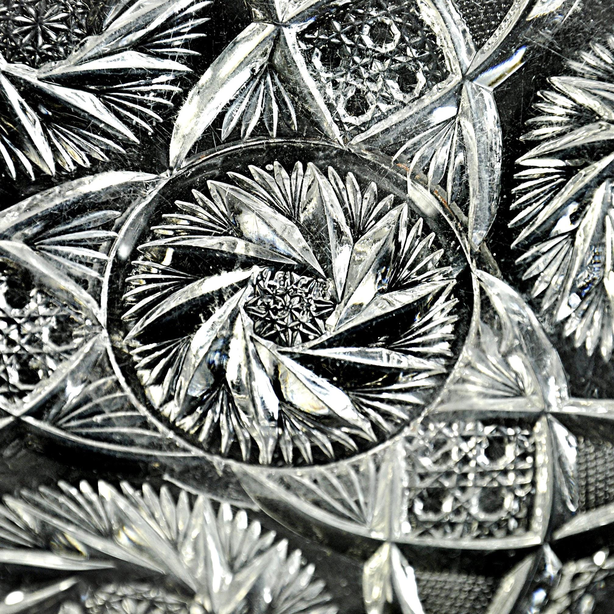 There’s a quiet beauty in these early pieces of Imperial Glass — the kind of sparkle that doesn’t shout but still draws your eye when the light hits it just right. This 8-inch footed bowl carries the NUCUT mark at its center, a proud stamp from the days when Imperial Glass Company of Bellaire, Ohio was determined to bring the look of fine cut crystal into everyday homes. Dating from around 1904 to 1914, this bowl was part of Imperial’s pressed imitation cut glass line — made to resemble hand-cut crystal but sturdy enough for the table. The detailed pinwheel and hobstar pattern gives it that Edwardian-era charm, while the scalloped edge softens the bold design just enough. It’s heavy, bright, and feels as solid in your hands as the day it was made. You can imagine it once sitting on a lace-covered table, filled with oranges or wrapped candies, catching bits of lamplight in every cut. Over a century later, it still does its job beautifully — ready to serve, display, or simply sparkle on a shelf.