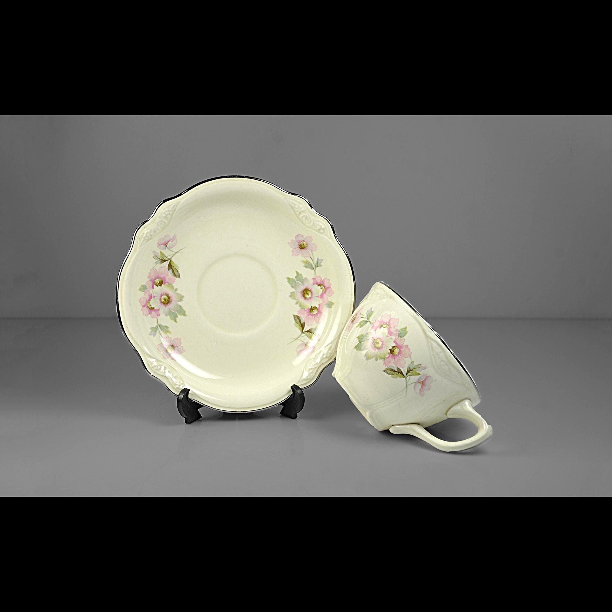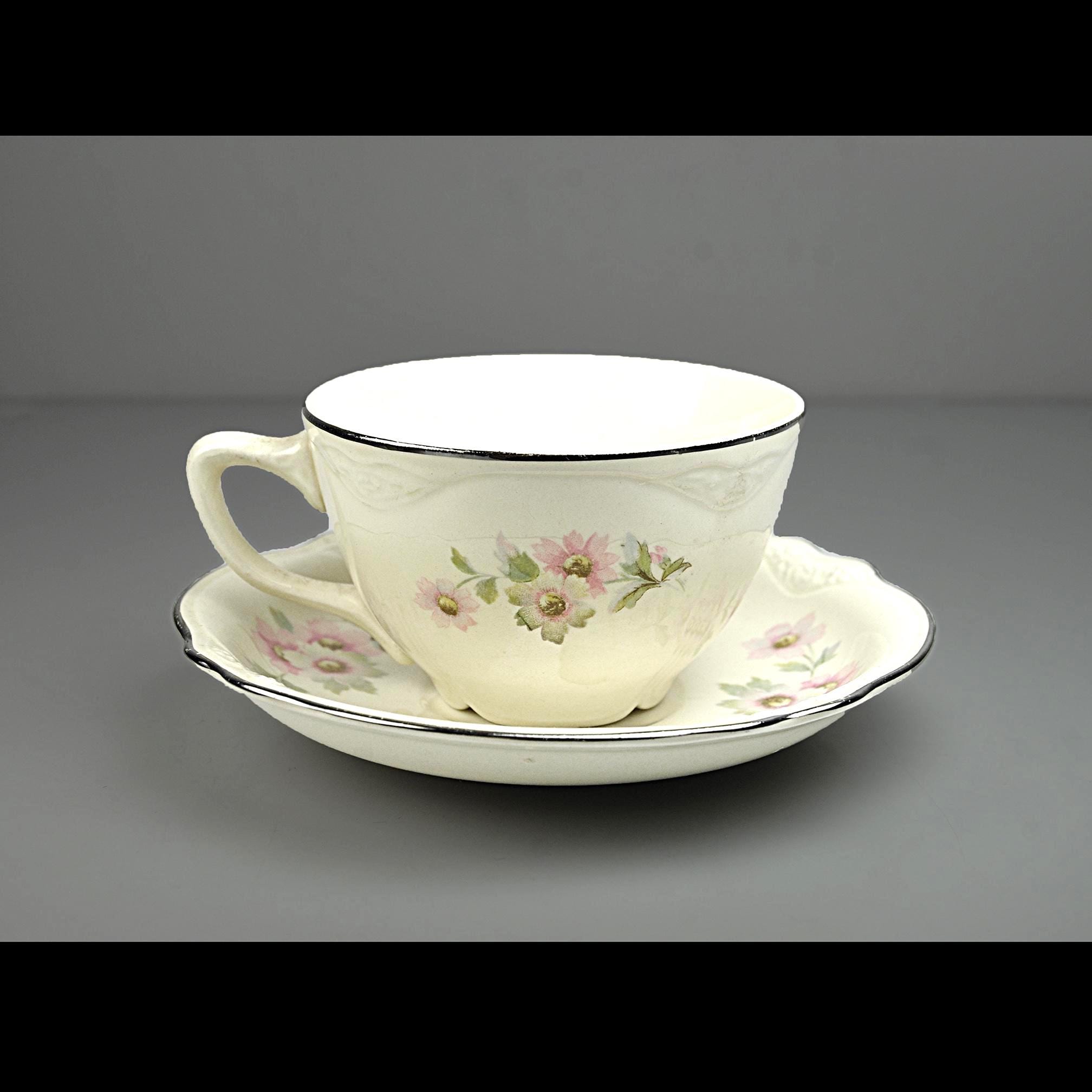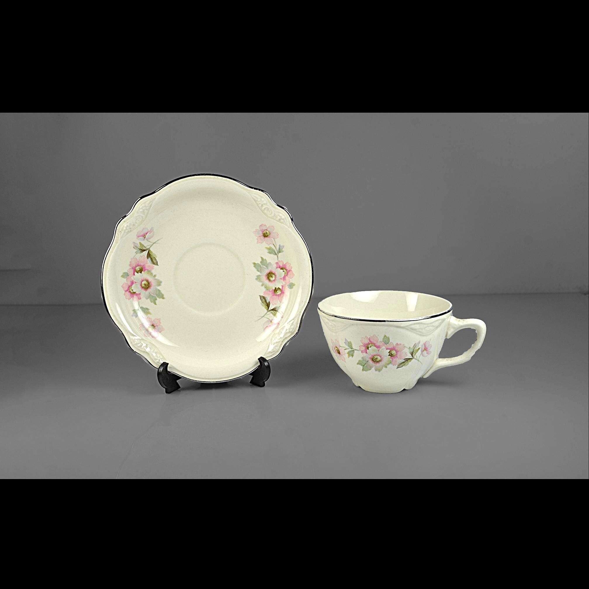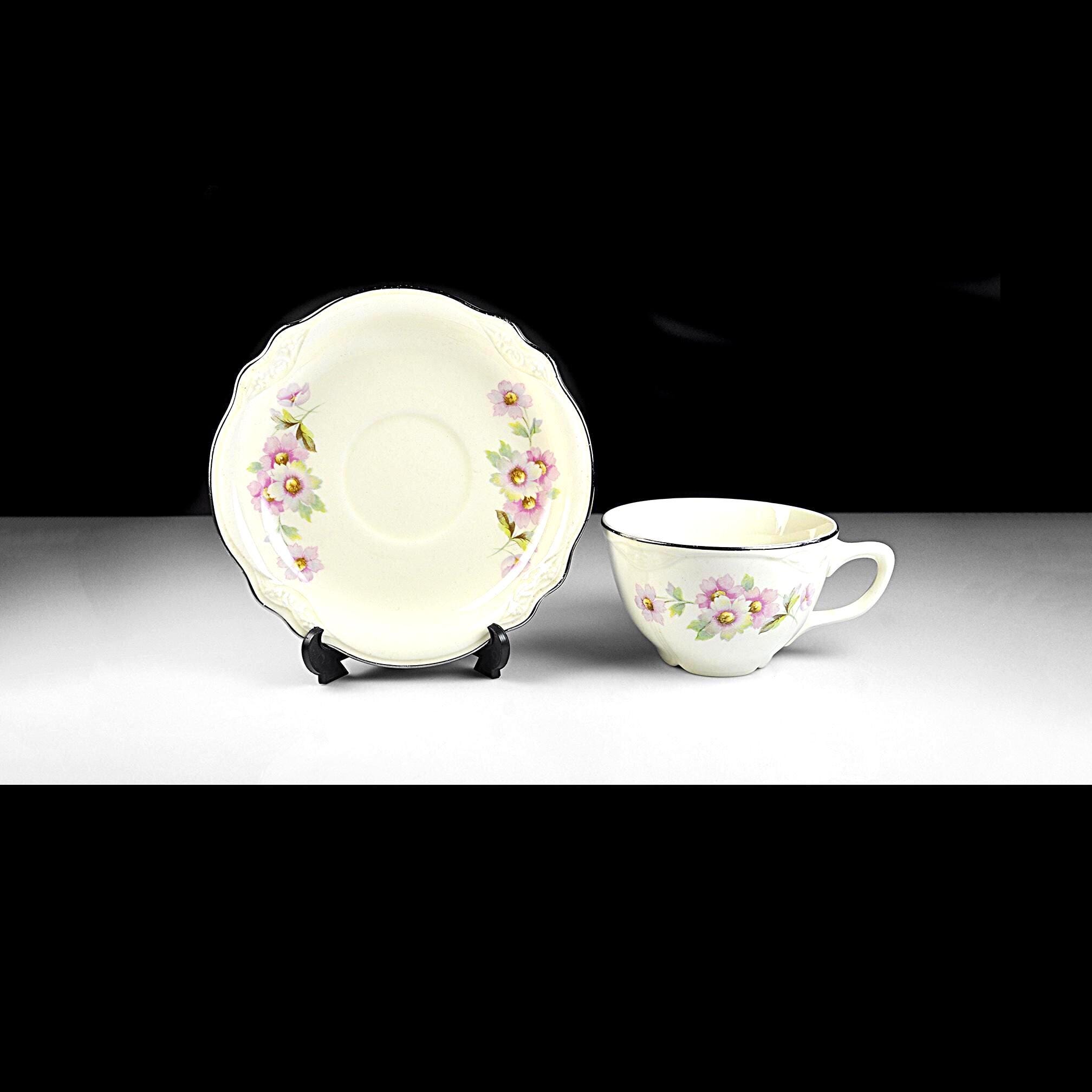 There’s a quiet charm to an old cup and saucer like this — the kind your grandmother might have brought out on a weekday afternoon when a neighbor stopped by. This Homer Laughlin set carries that same feeling — simple, pretty, and well-made. The creamy ivory china has soft pink wild roses and edged in silver trim. The scalloped edges and embossed scrollwork give it a little extra grace, a reminder of a time when even the everyday dishes had a bit of decoration. This is the Virginia Rose shape, made by Homer Laughlin between the 1930s and 1950s. The pattern itself doesn’t have a name, but it’s easily recognized by its silver edge and those sweet floral sprays that never go out of style.