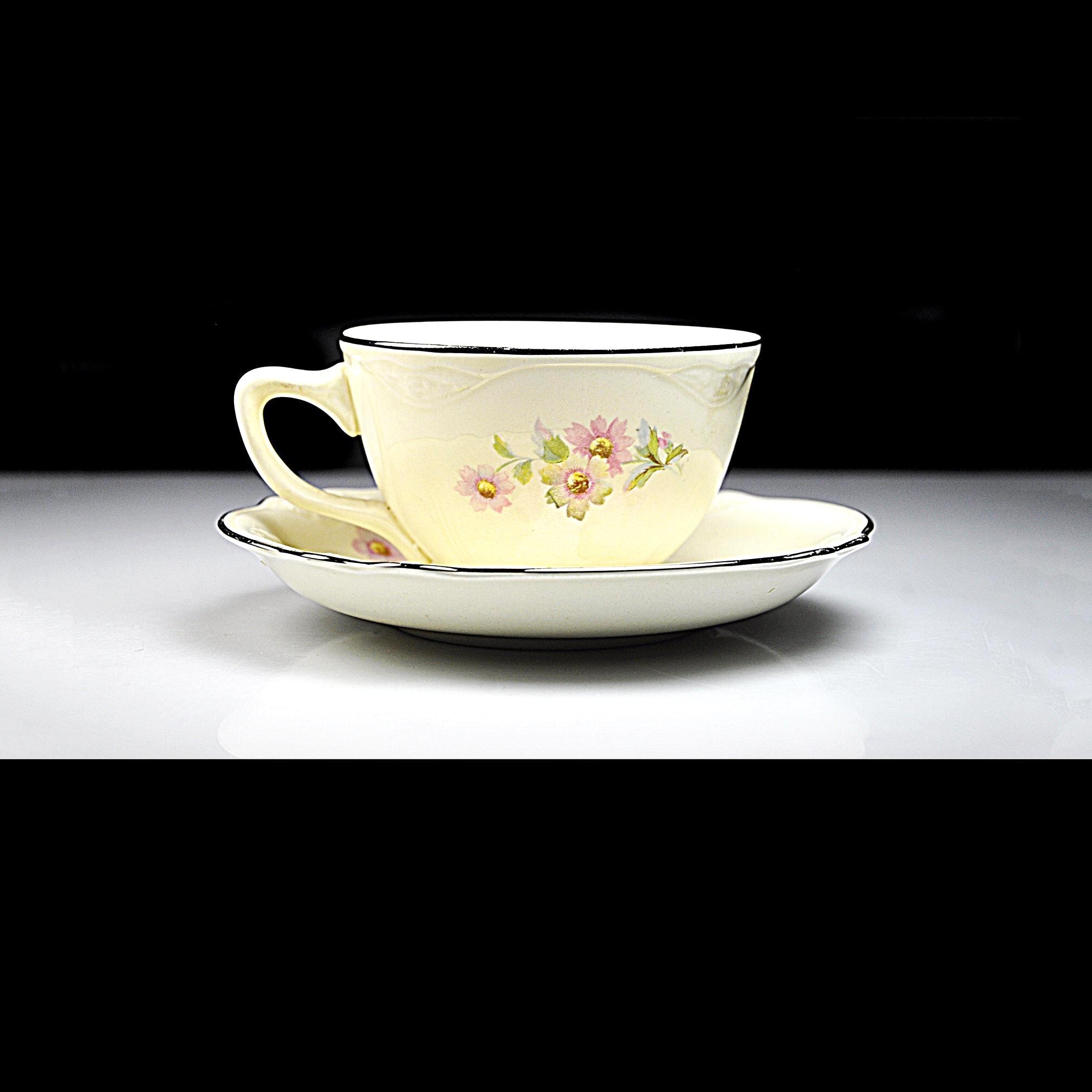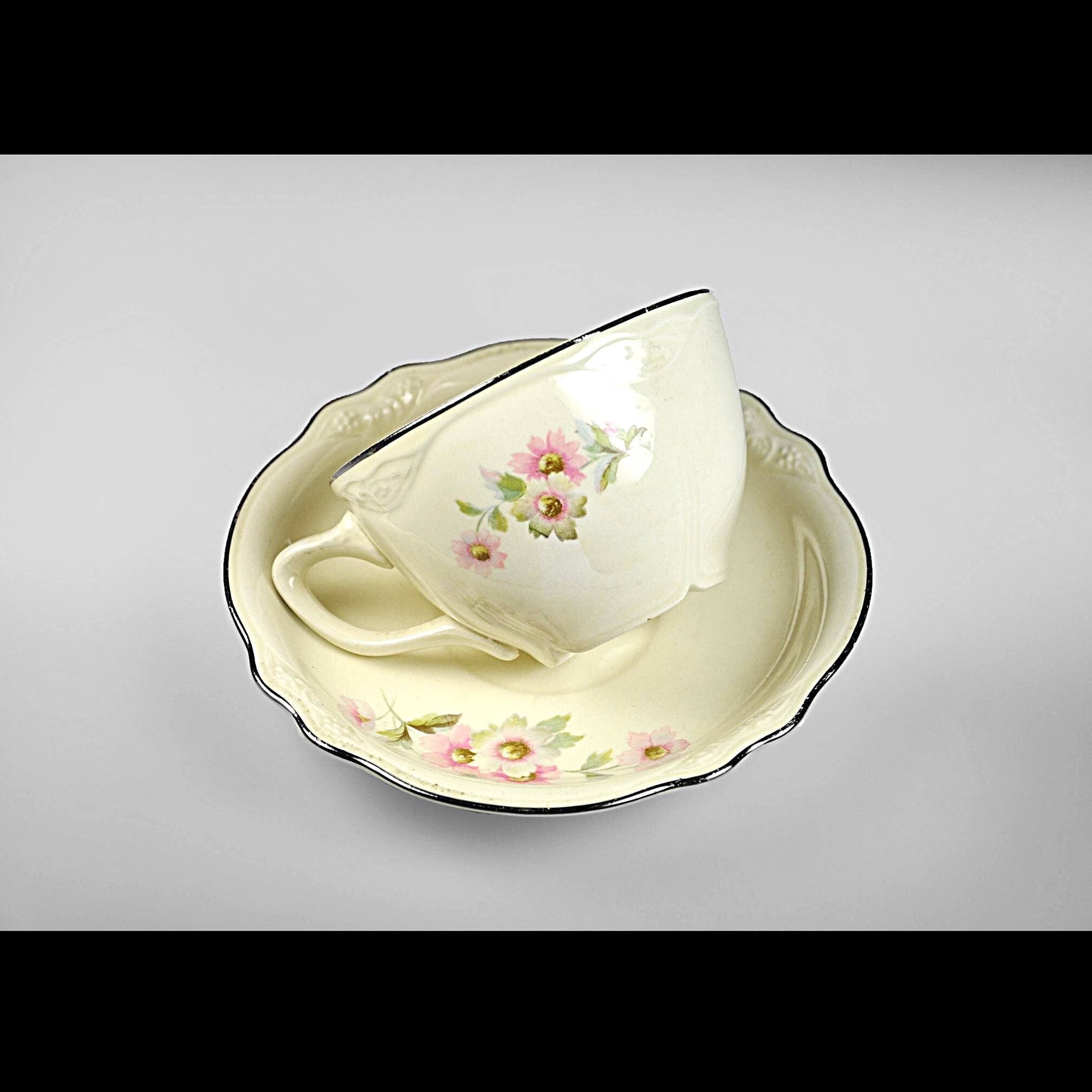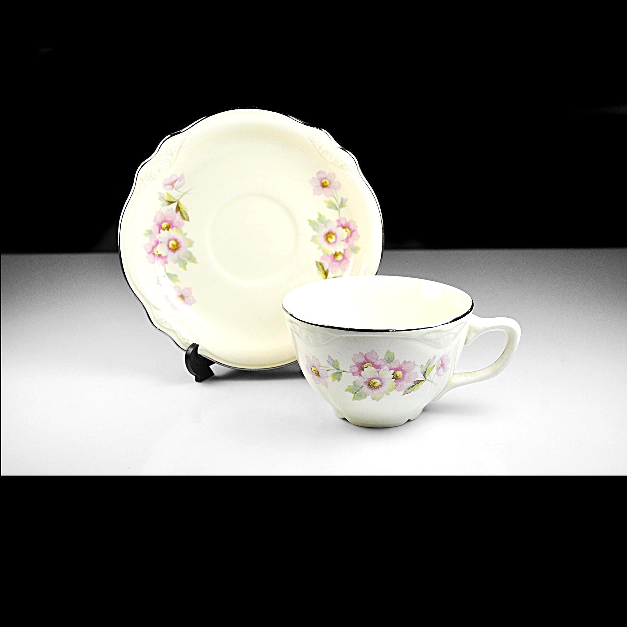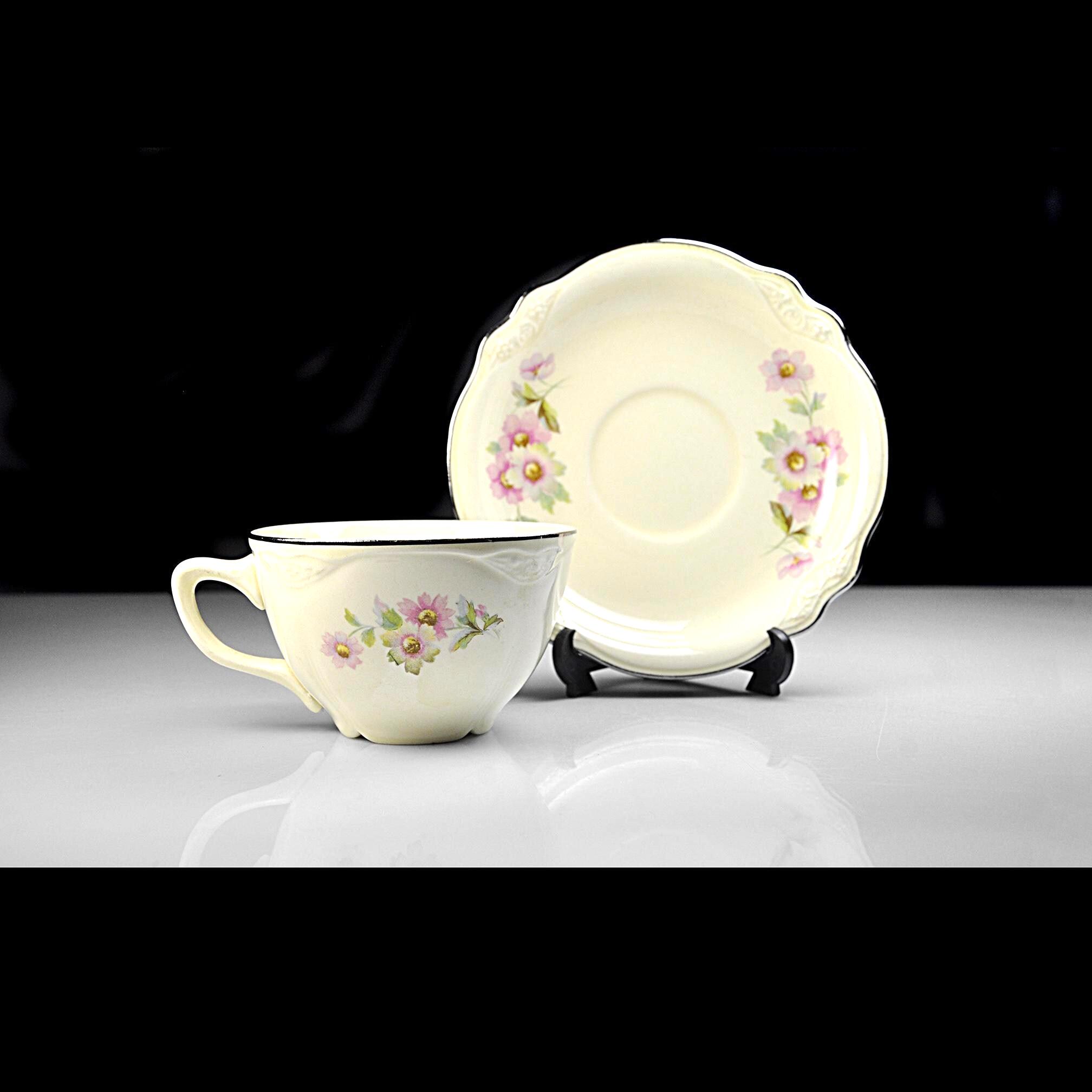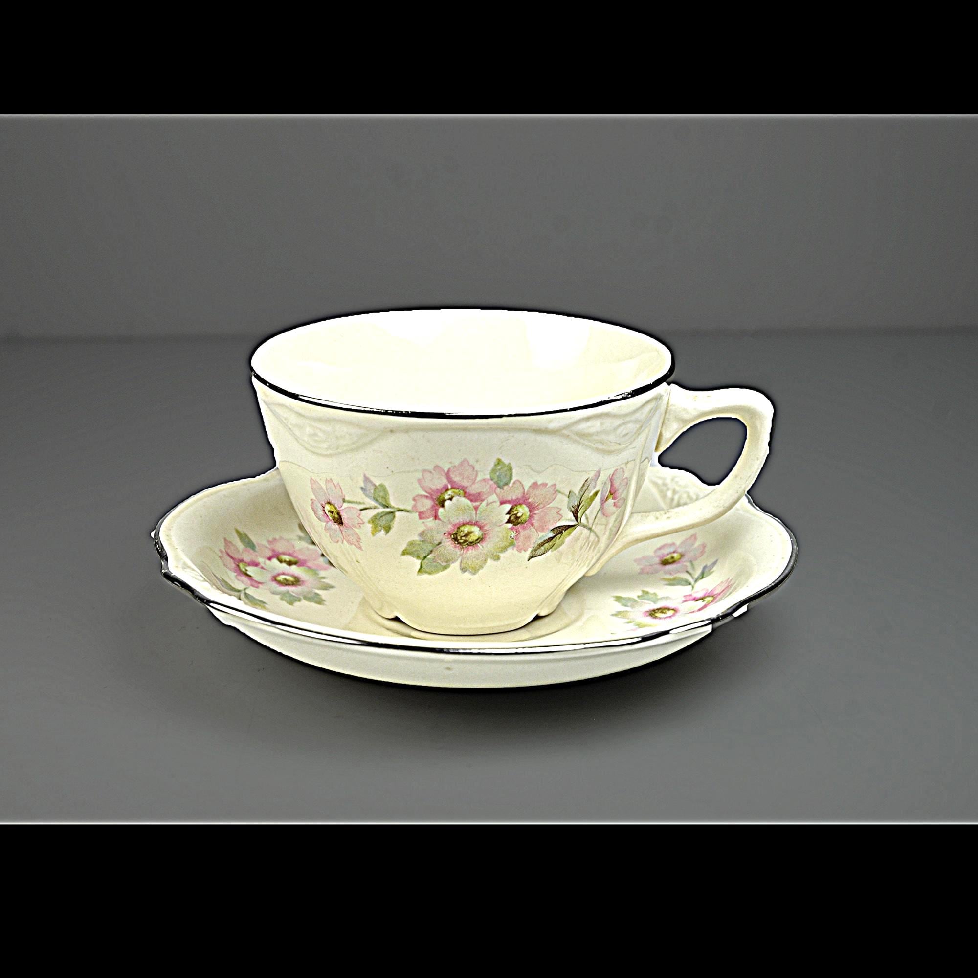 There’s a quiet charm to an old cup and saucer like this — the kind your grandmother might have brought out on a weekday afternoon when a neighbor stopped by. This Homer Laughlin set carries that same feeling — simple, pretty, and well-made. The creamy ivory china has soft pink wild roses and edged in silver trim. The scalloped edges and embossed scrollwork give it a little extra grace, a reminder of a time when even the everyday dishes had a bit of decoration. This is the Virginia Rose shape, made by Homer Laughlin between the 1930s and 1950s. The pattern itself doesn’t have a name, but it’s easily recognized by its silver edge and those sweet floral sprays that never go out of style.