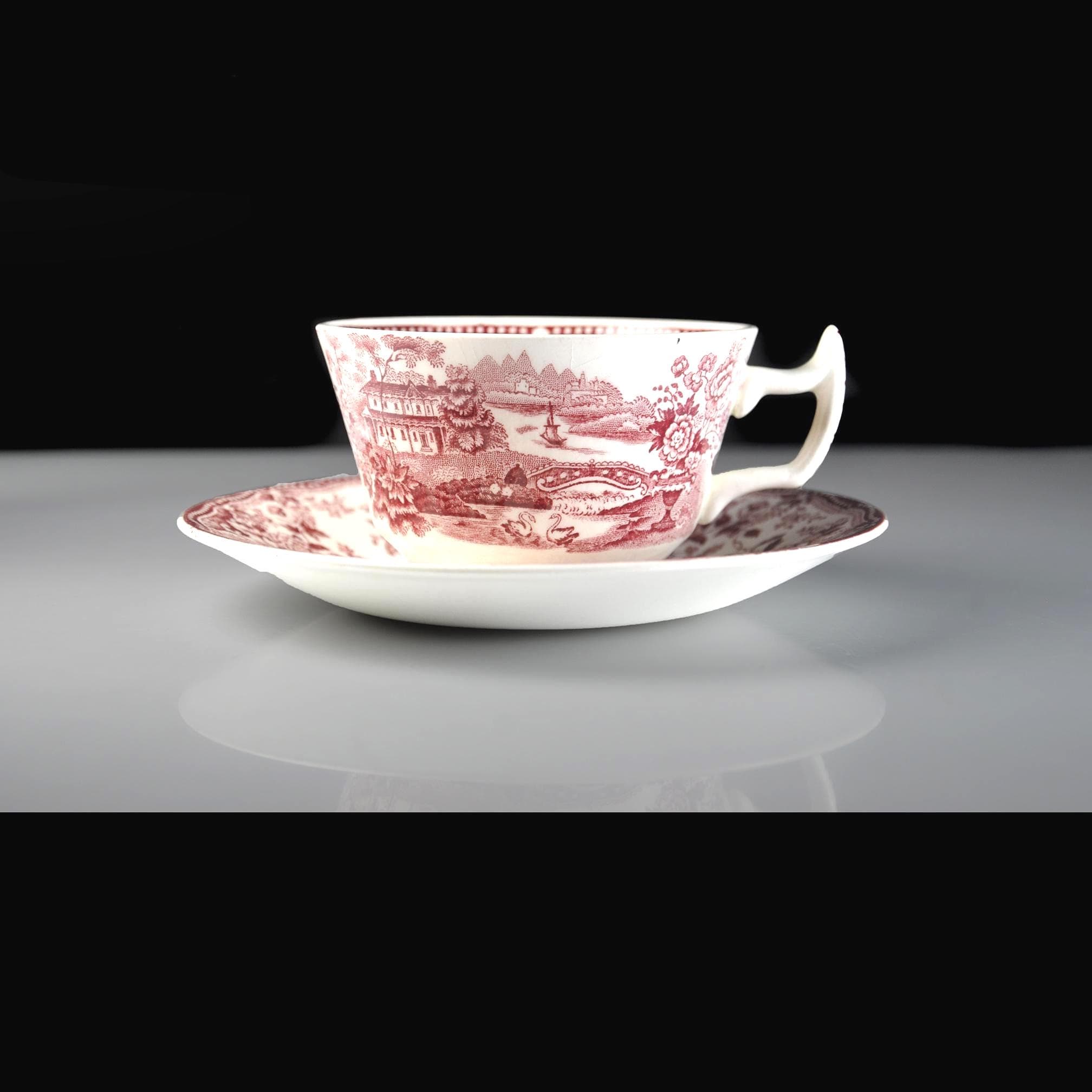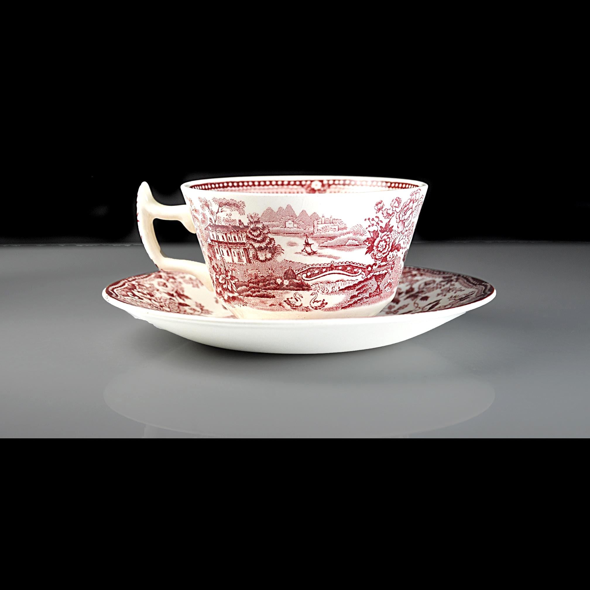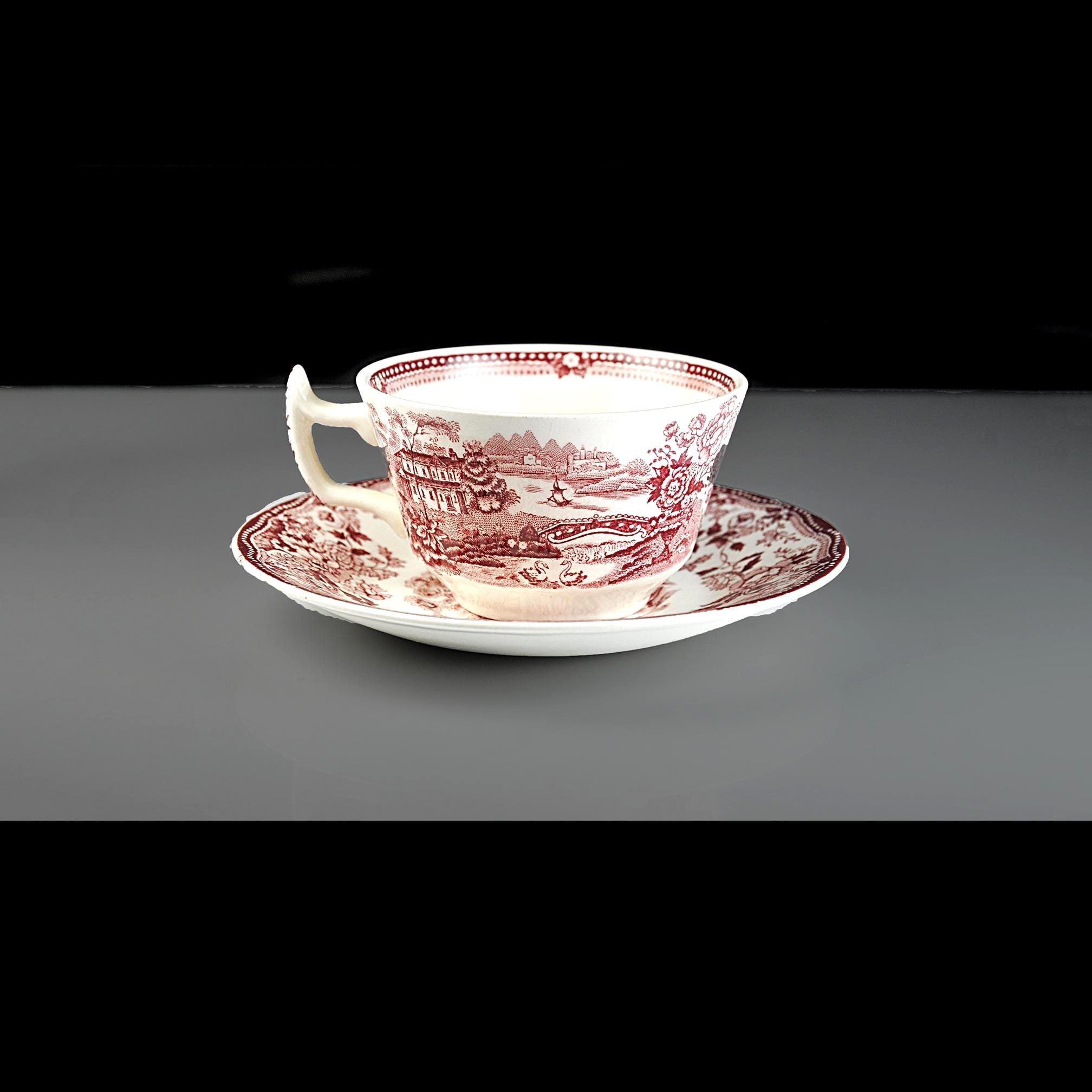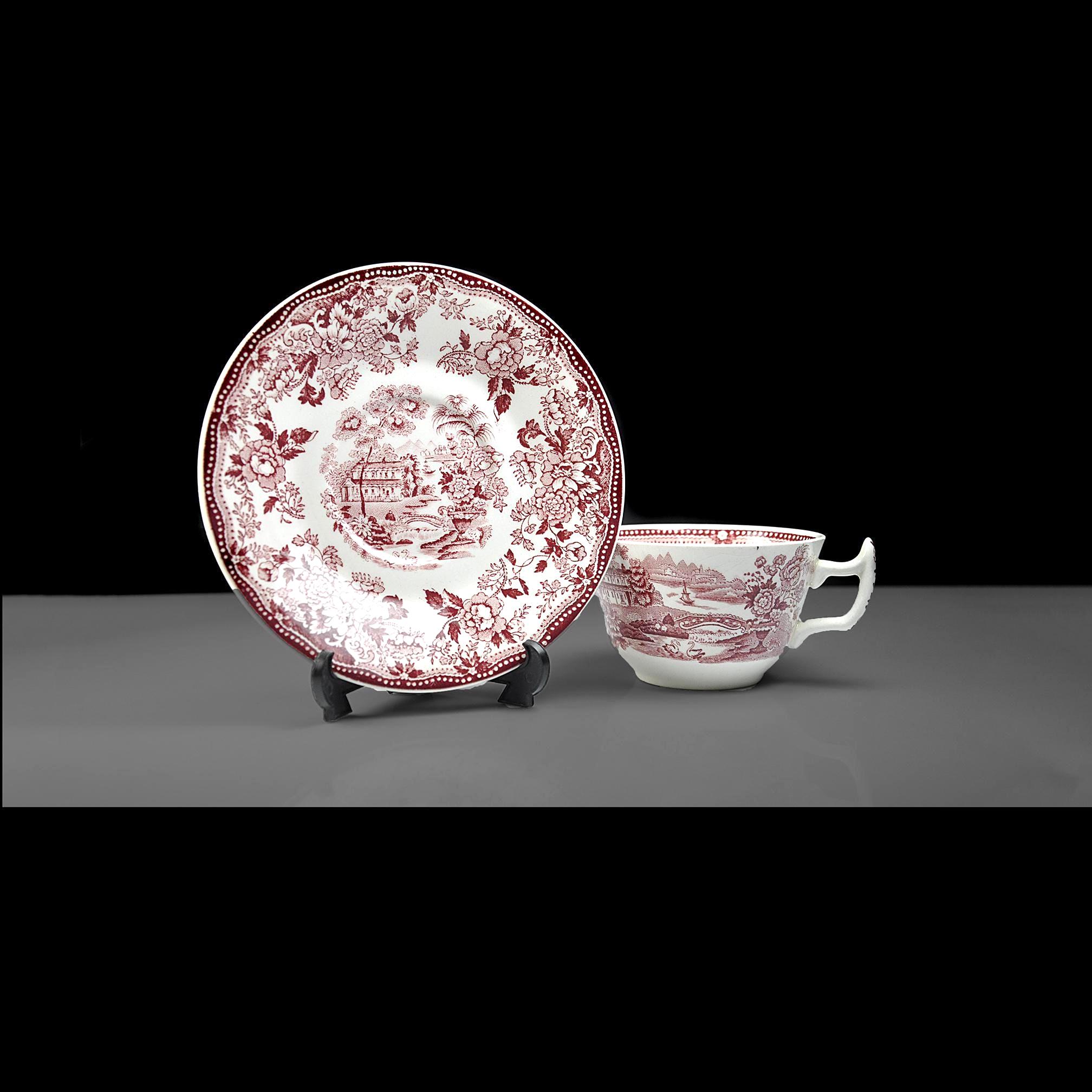 There’s a certain warmth to old English pottery — the kind that’s seen more than one cup of tea poured while the rain tapped against the window. This Tonquin pattern cup and saucer by Royal Staffordshire, designed by Clarice Cliff, carries that same sort of quiet charm. The deep red transferware scene shows a country house tucked beside a river, a small bridge arching gracefully over the water, and roses climbing along the edges. It’s the kind of pattern that feels both familiar and timeless, like it’s been part of family tea tables for generations. Made in England during the 1950s, this set comes from the same Staffordshire potteries that turned out so many of the world’s most beloved ceramics. It’s perfect for display, for daily tea, or for anyone who loves the steady beauty of English china.
