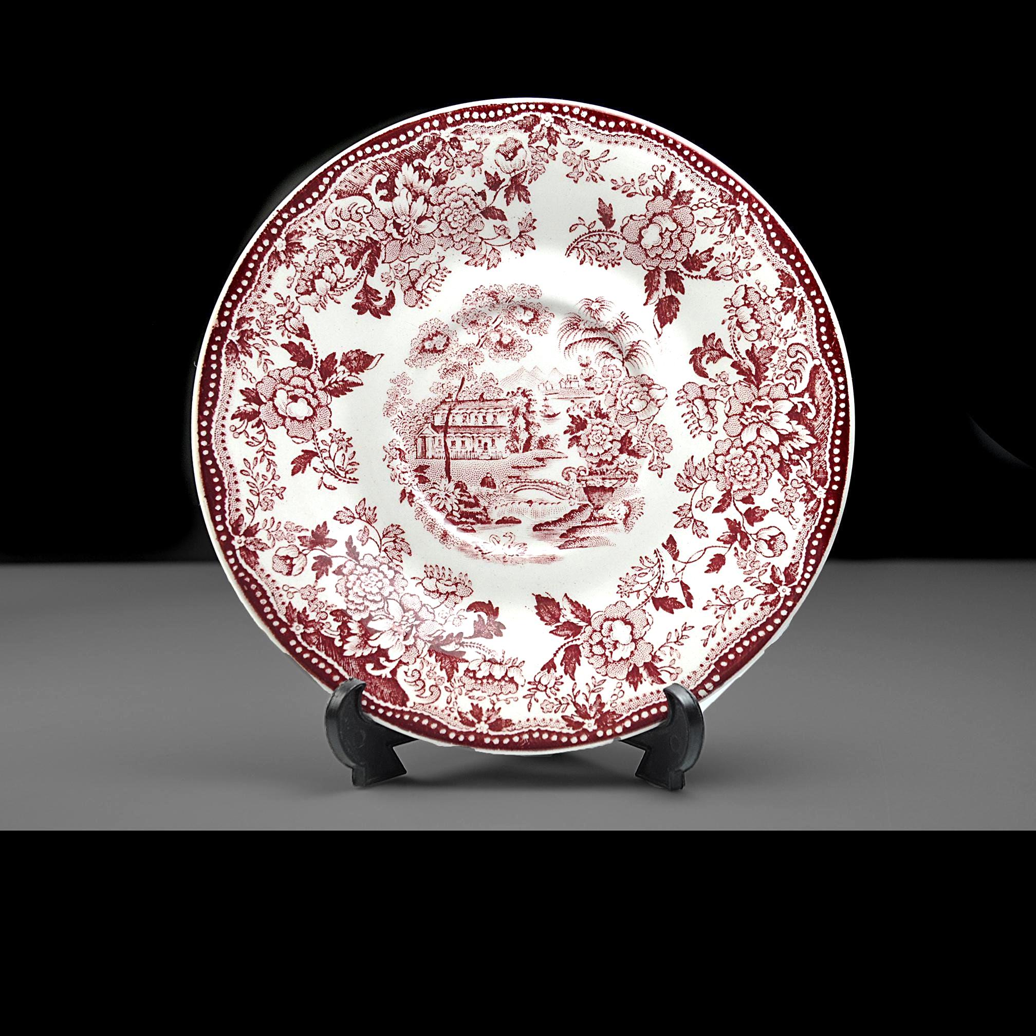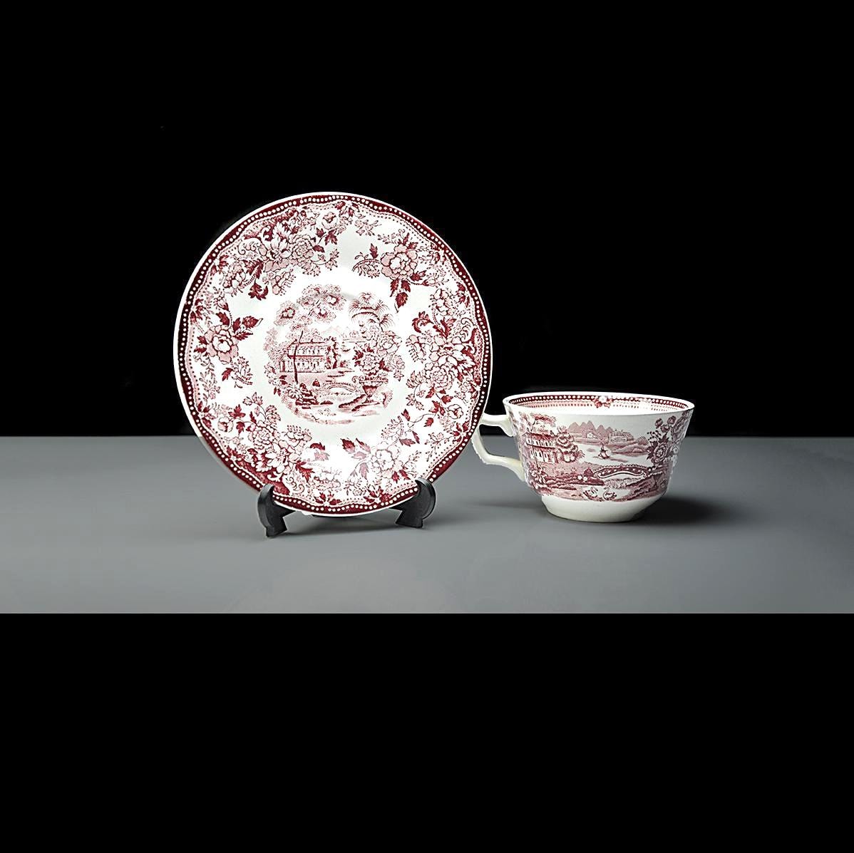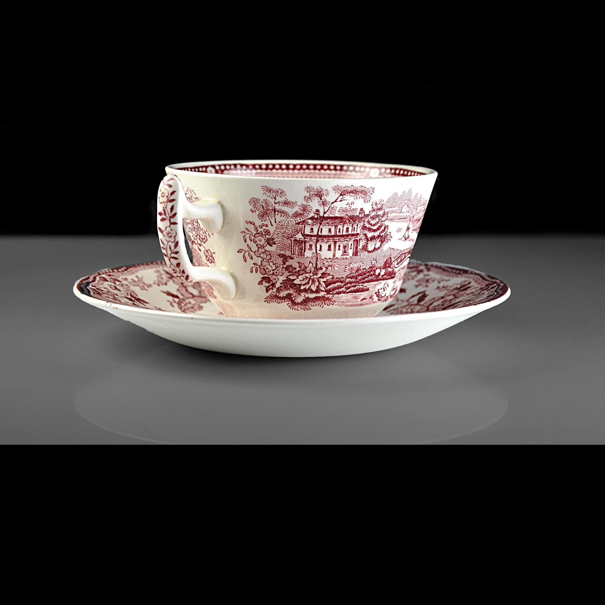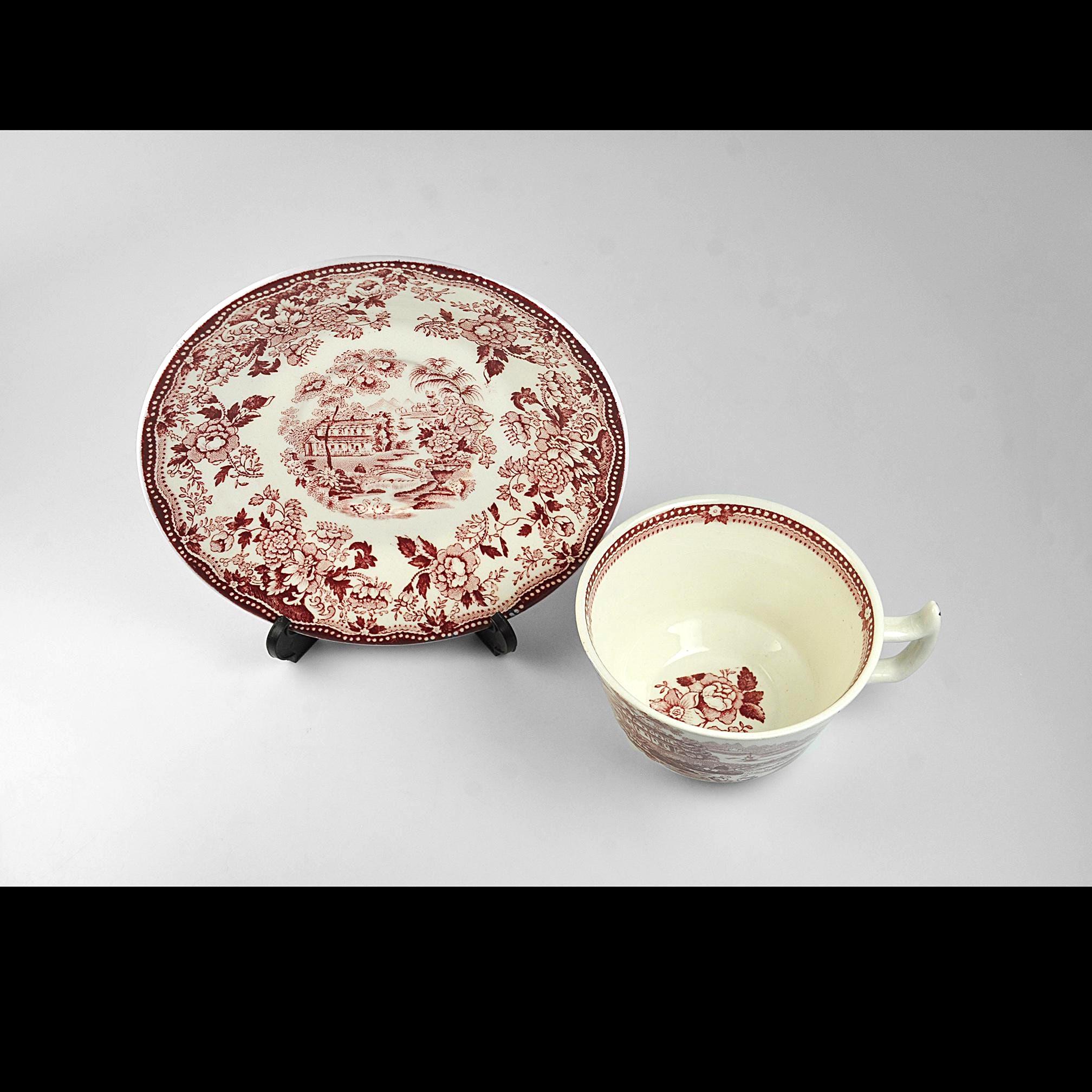 There’s a certain warmth to old English pottery — the kind that’s seen more than one cup of tea poured while the rain tapped against the window. This Tonquin pattern cup and saucer by Royal Staffordshire, designed by Clarice Cliff, carries that same sort of quiet charm. The deep red transferware scene shows a country house tucked beside a river, a small bridge arching gracefully over the water, and roses climbing along the edges. It’s the kind of pattern that feels both familiar and timeless, like it’s been part of family tea tables for generations. Made in England during the 1950s, this set comes from the same Staffordshire potteries that turned out so many of the world’s most beloved ceramics. It’s perfect for display, for daily tea, or for anyone who loves the steady beauty of English china.
