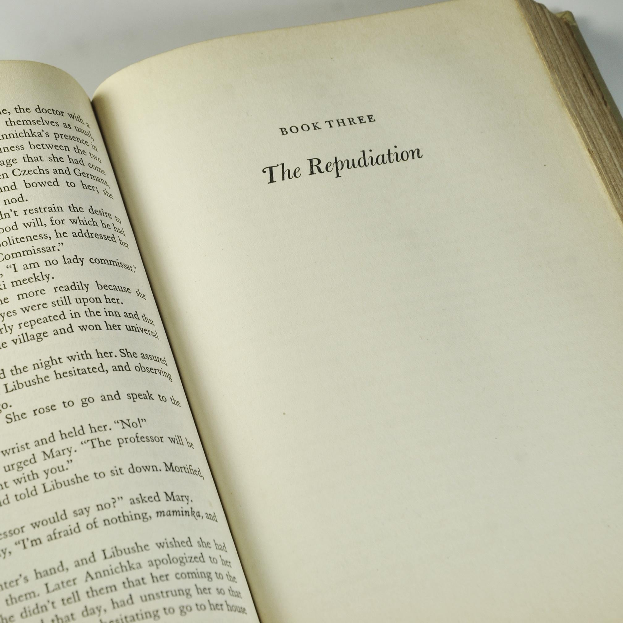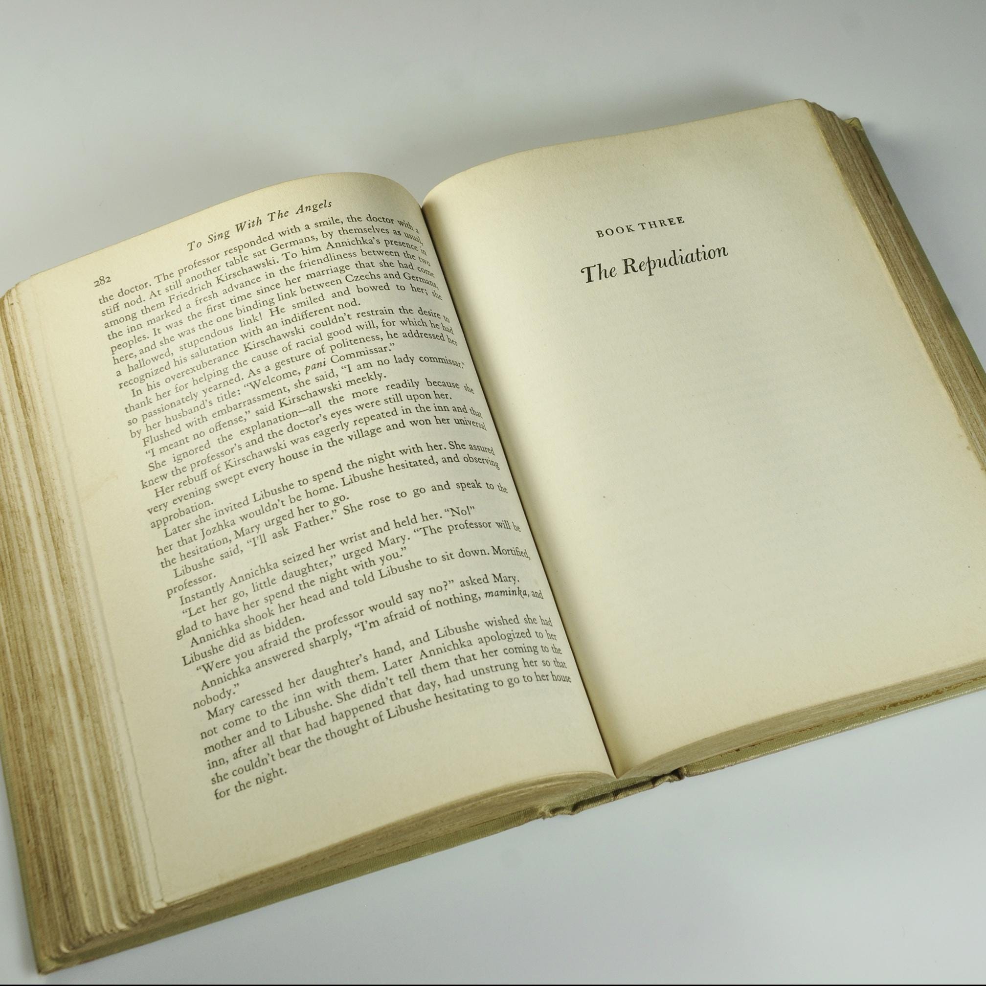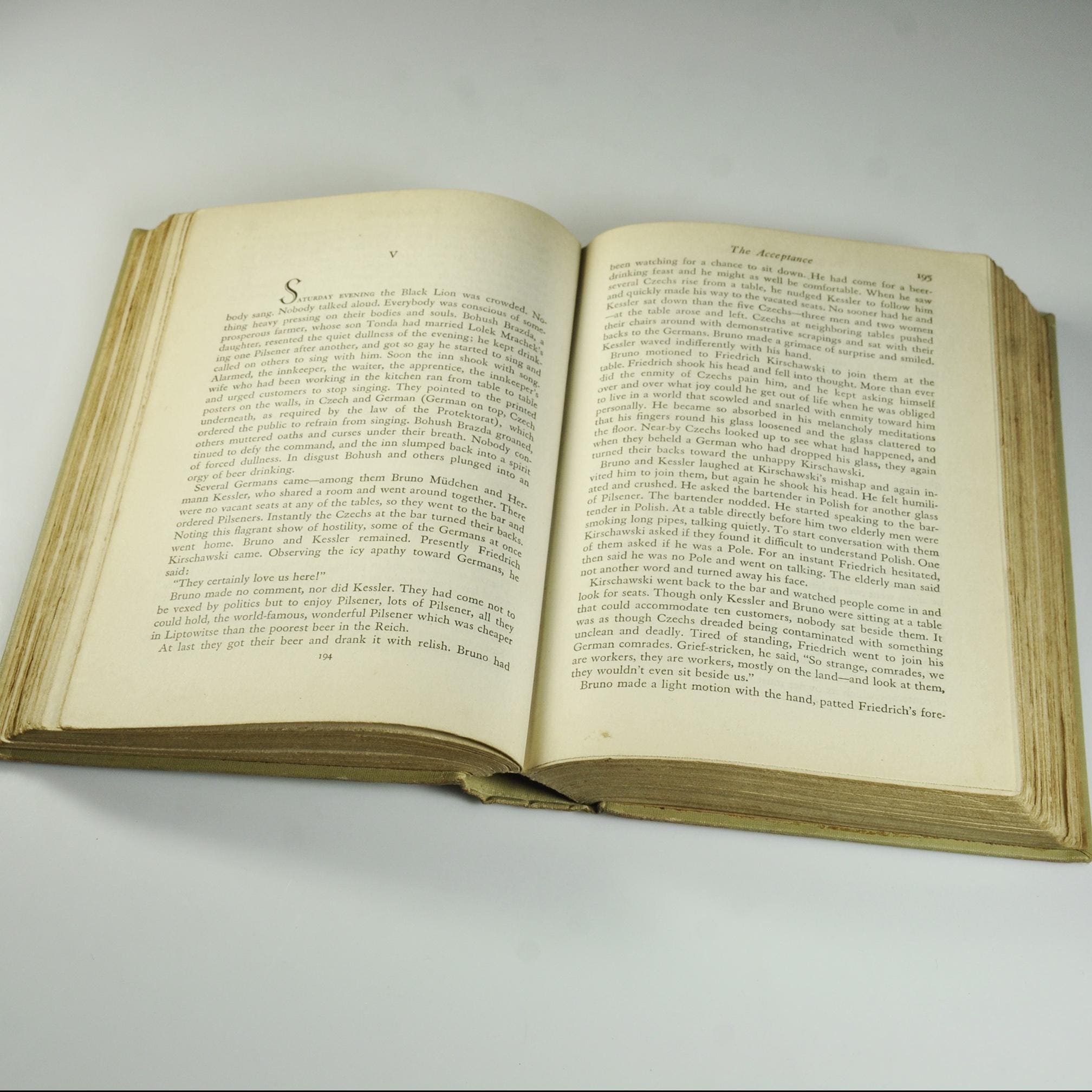 Here’s a piece of history from 1941 — To Sing With the Angels by Maurice Hindus, published by Doubleday, Doran & Company just before America entered World War II. Hindus, a Russian-born American writer, was known for explaining the human side of Soviet life to readers in the West. This book looks deeply into what happens when people lose faith in the ideals, they once believed in. It’s thoughtful, a little haunting, and written with that clear, earnest tone common to the early 1940s. The title itself comes from a Czech newspaper quote: “We wanted to sing with the angels, now we must howl with the wolves.” That line tells you what kind of story this is — one of ideals tested by the hard truth of war and politics. This is a first edition, published in 1941. The tan cloth cover is sturdy, with blue and red lettering on the spine. A wonderful read or display piece for anyone who collects wartime writing, early 20th century political commentary, or vintage Doubleday first editions.