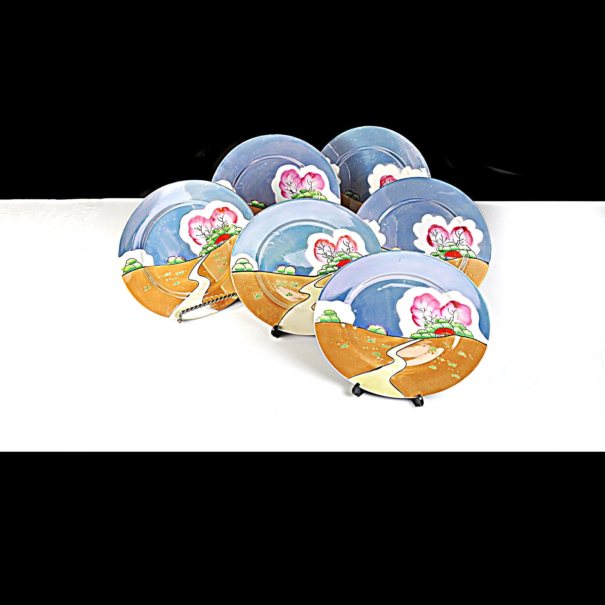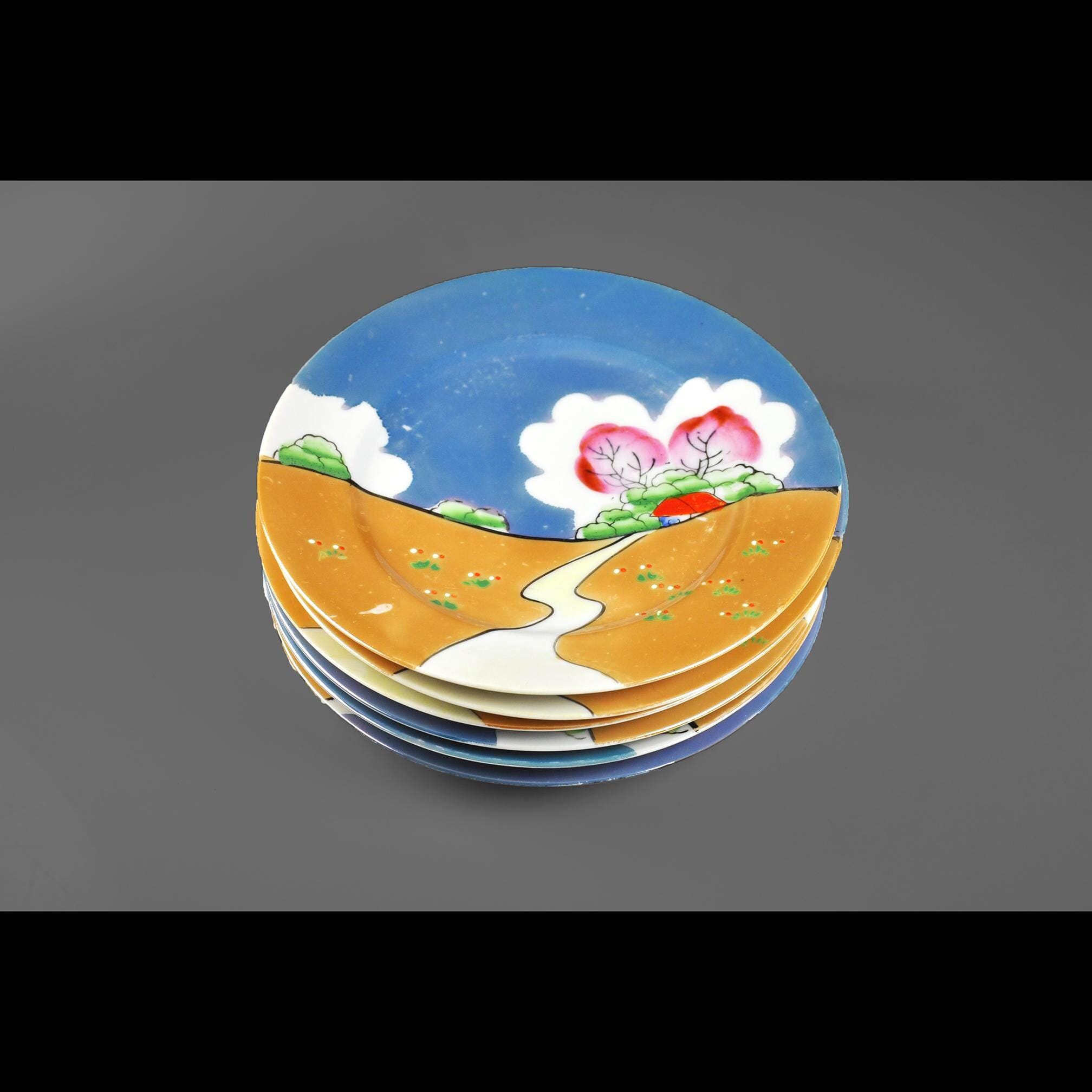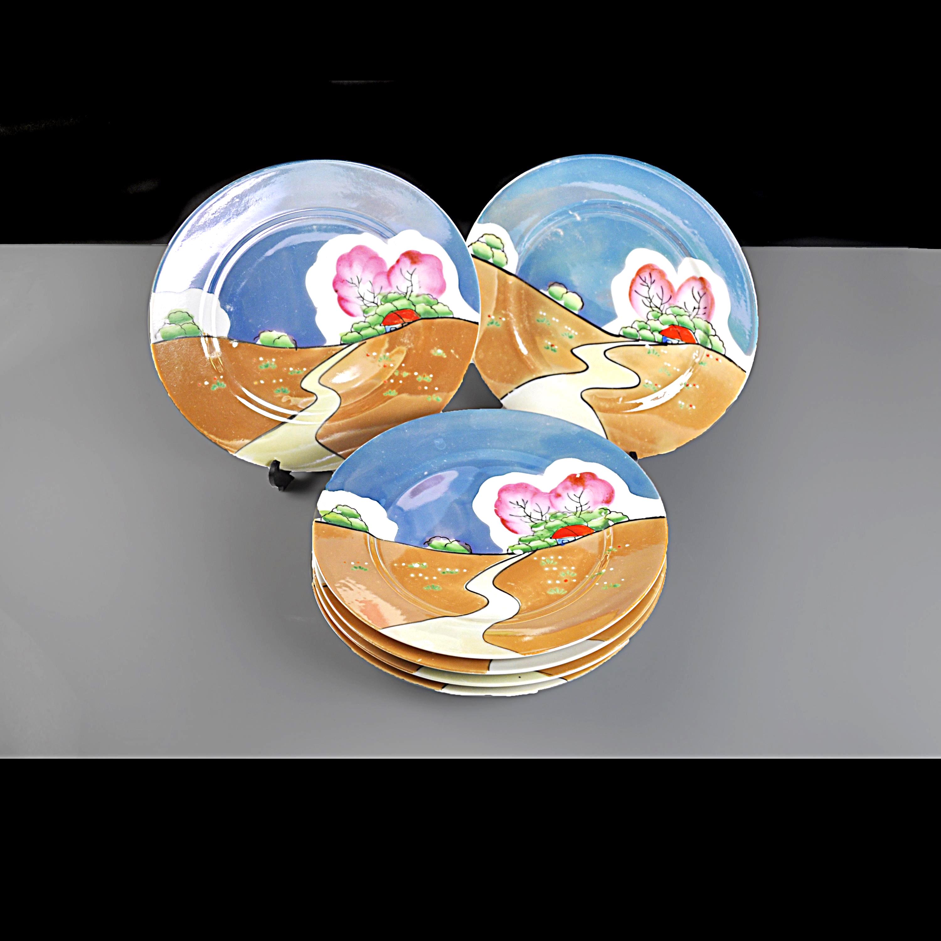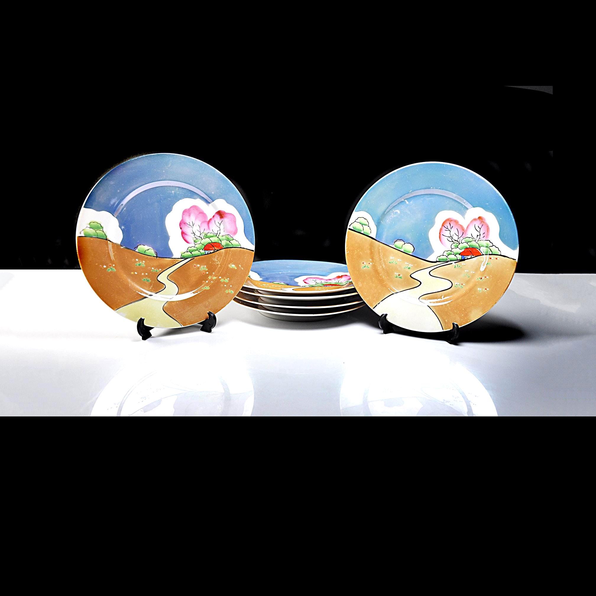 There’s something so peaceful about this little painted road that winds its way across each plate — a path that seems to lead straight through a field of golden hills and right into a soft blue sky. These hand-painted salad plates were made in Japan sometime in the 1930s, back when bright luster glazes and cheerful countryside scenes were all the rage. Each plate features the same winding road, green trees, and pink blossom-filled clouds against a sky-blue background. The design feels like a daydream — simple, colorful, and full of charm. They were hand painted, not decals, which makes every plate just a little different from the next. Perfect for display, for serving dessert or salad, or even for setting a table that tells a bit of history with every meal.