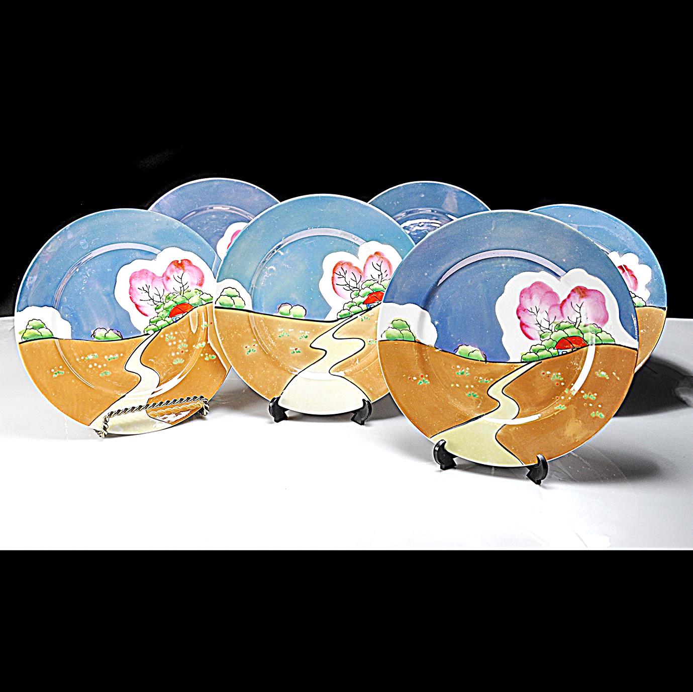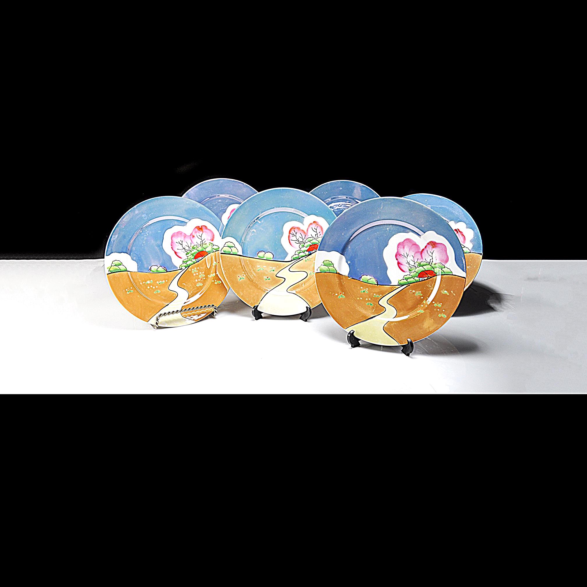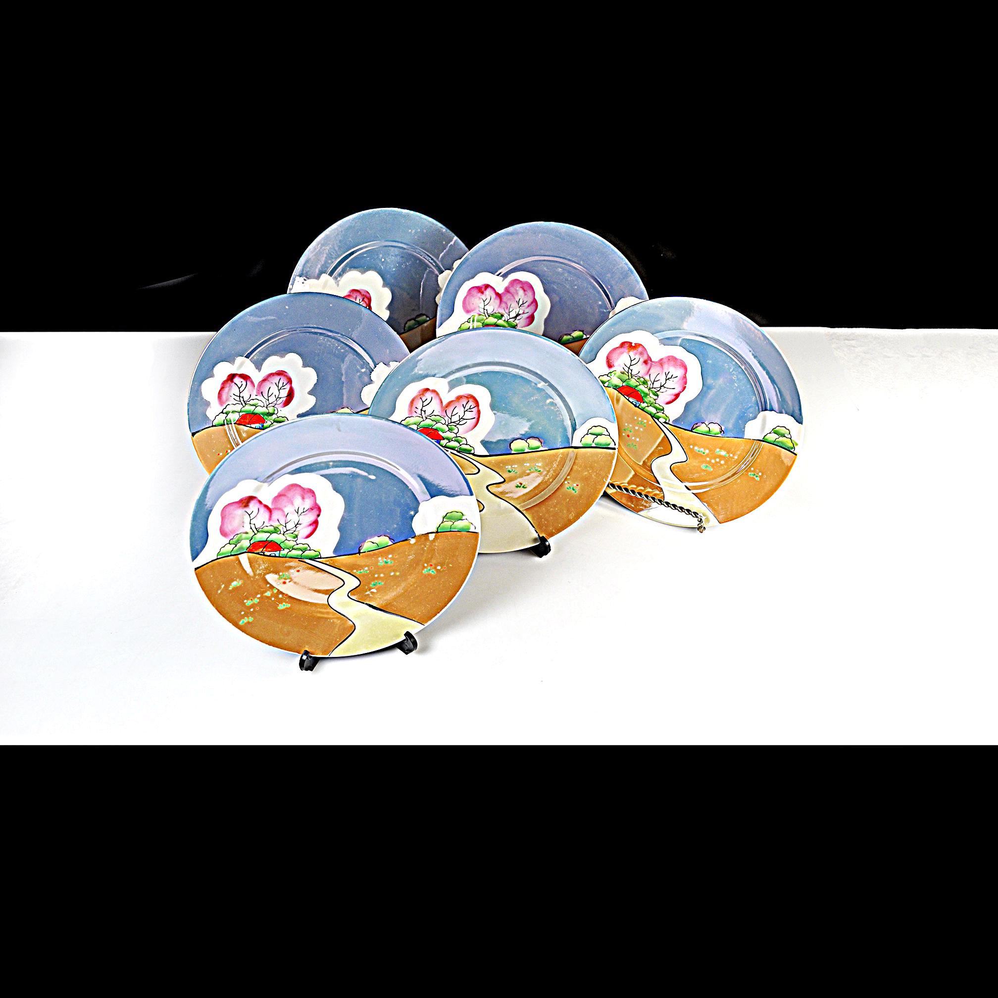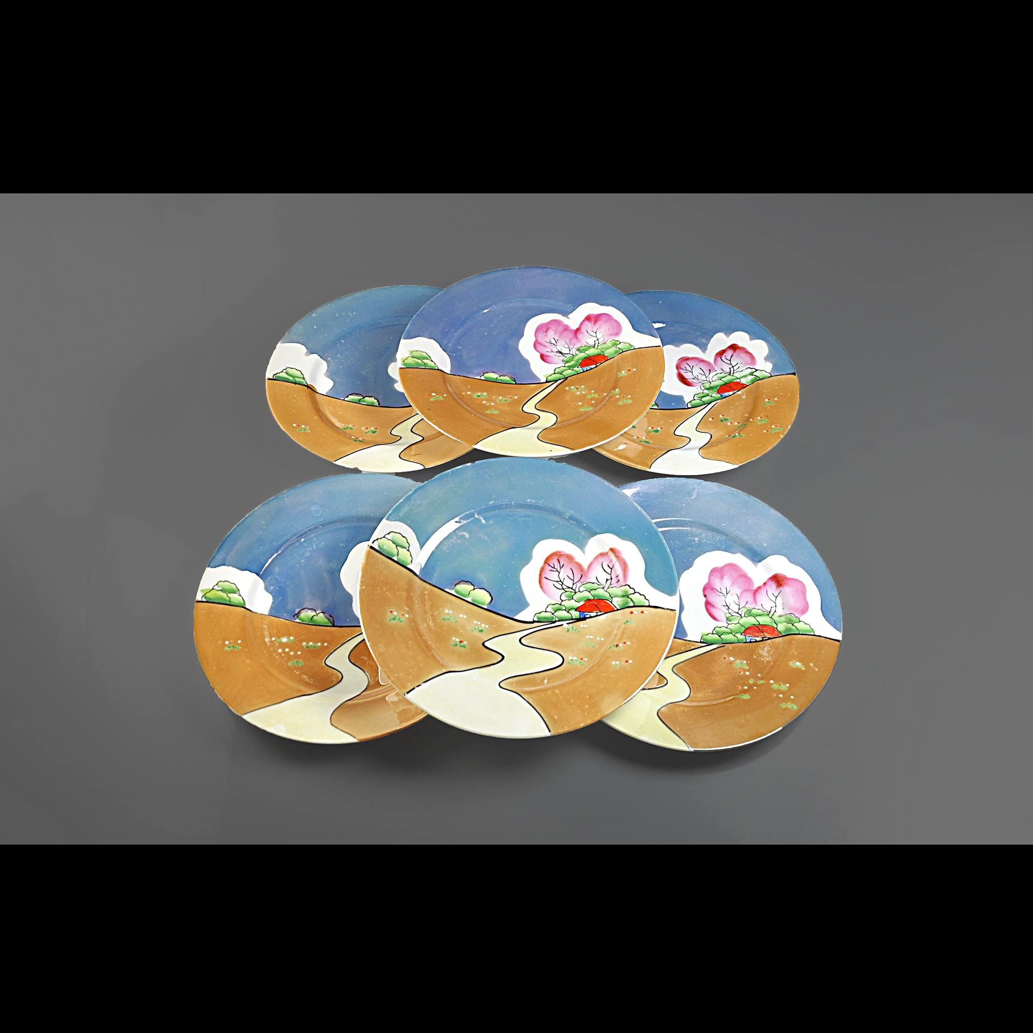 There’s something so peaceful about this little painted road that winds its way across each plate — a path that seems to lead straight through a field of golden hills and right into a soft blue sky. These hand-painted salad plates were made in Japan sometime in the 1930s, back when bright luster glazes and cheerful countryside scenes were all the rage. Each plate features the same winding road, green trees, and pink blossom-filled clouds against a sky-blue background. The design feels like a daydream — simple, colorful, and full of charm. They were hand painted, not decals, which makes every plate just a little different from the next. Perfect for display, for serving dessert or salad, or even for setting a table that tells a bit of history with every meal.