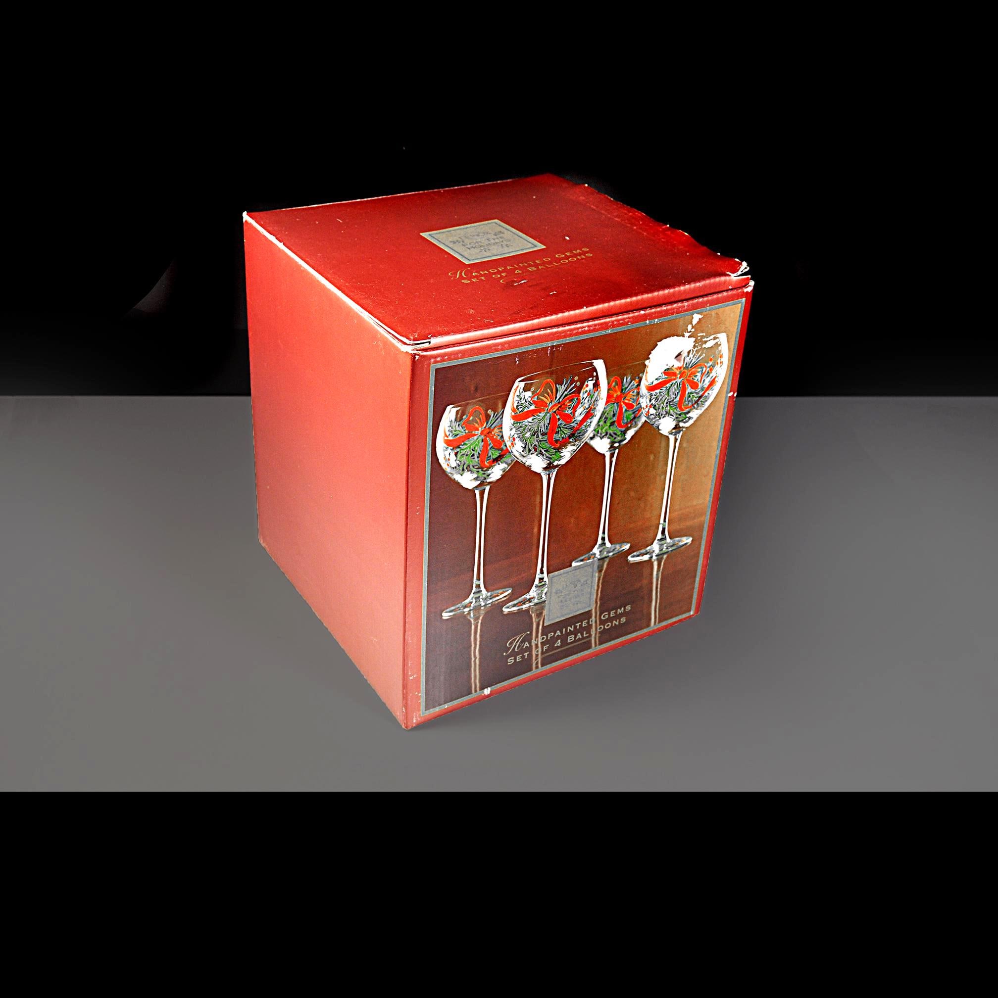 There’s something about these Lenox Handpainted Gems glasses that takes you right back to a Christmas home that felt alive with warmth. You can almost hear the soft hum of Bing Crosby playing in the background while the table gleams under candlelight — and these glasses catch that same glow. The house trimmed in garland, the smell of pine from the tree, soft Christmas music in the background, and laughter drifting in from the kitchen. Each balloon wine glass is handpainted with a cheery red ribbon, holly, and pine. The design wraps around the bowl like a festive bow waiting to be untied. This set of four comes in the original Lenox box, the kind of thing that tells you they were treasured. They look as though they’ve never been used, a true new-old-stock find. These capture that classic Lenox look that defined holiday tables throughout the years.