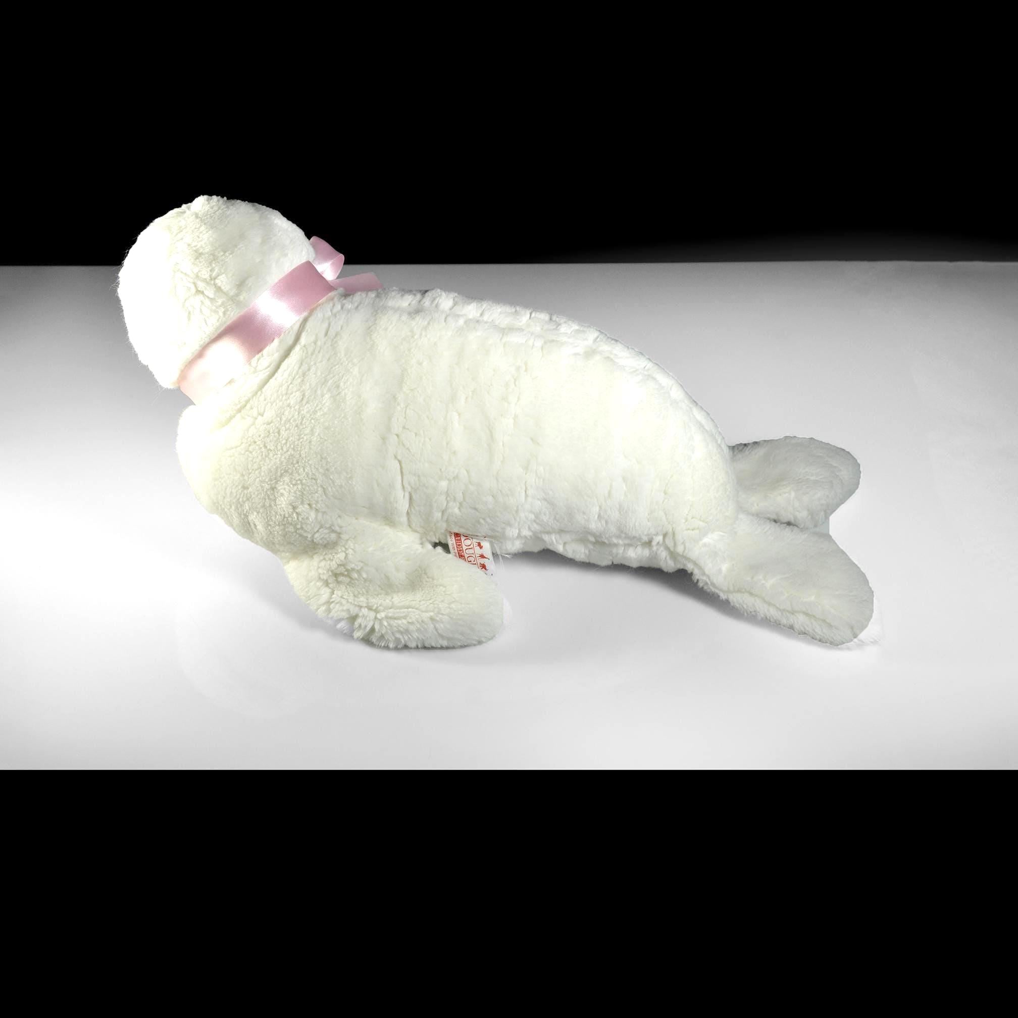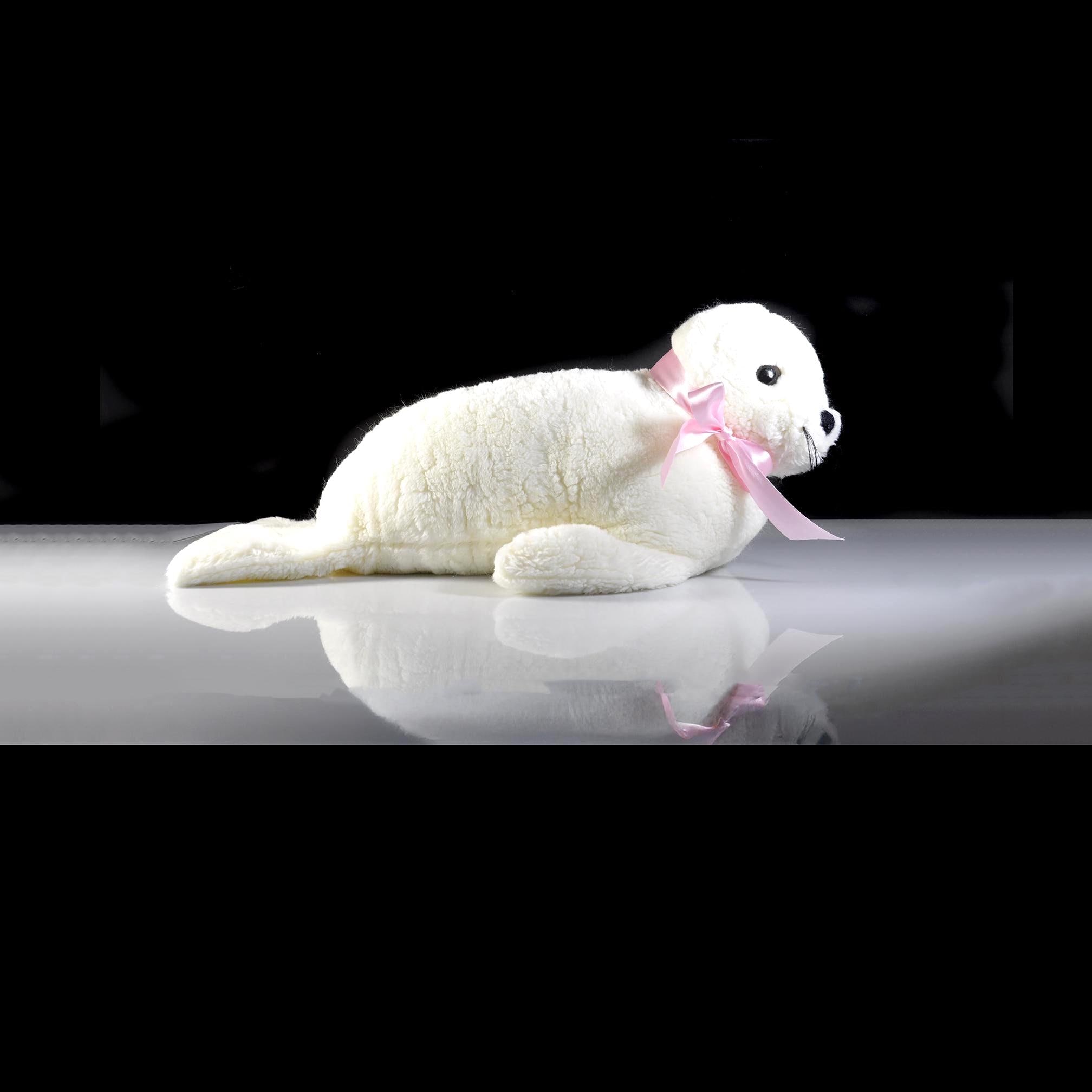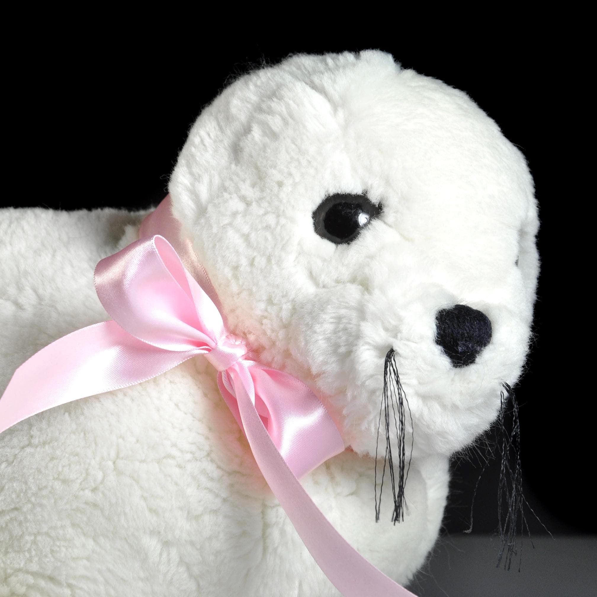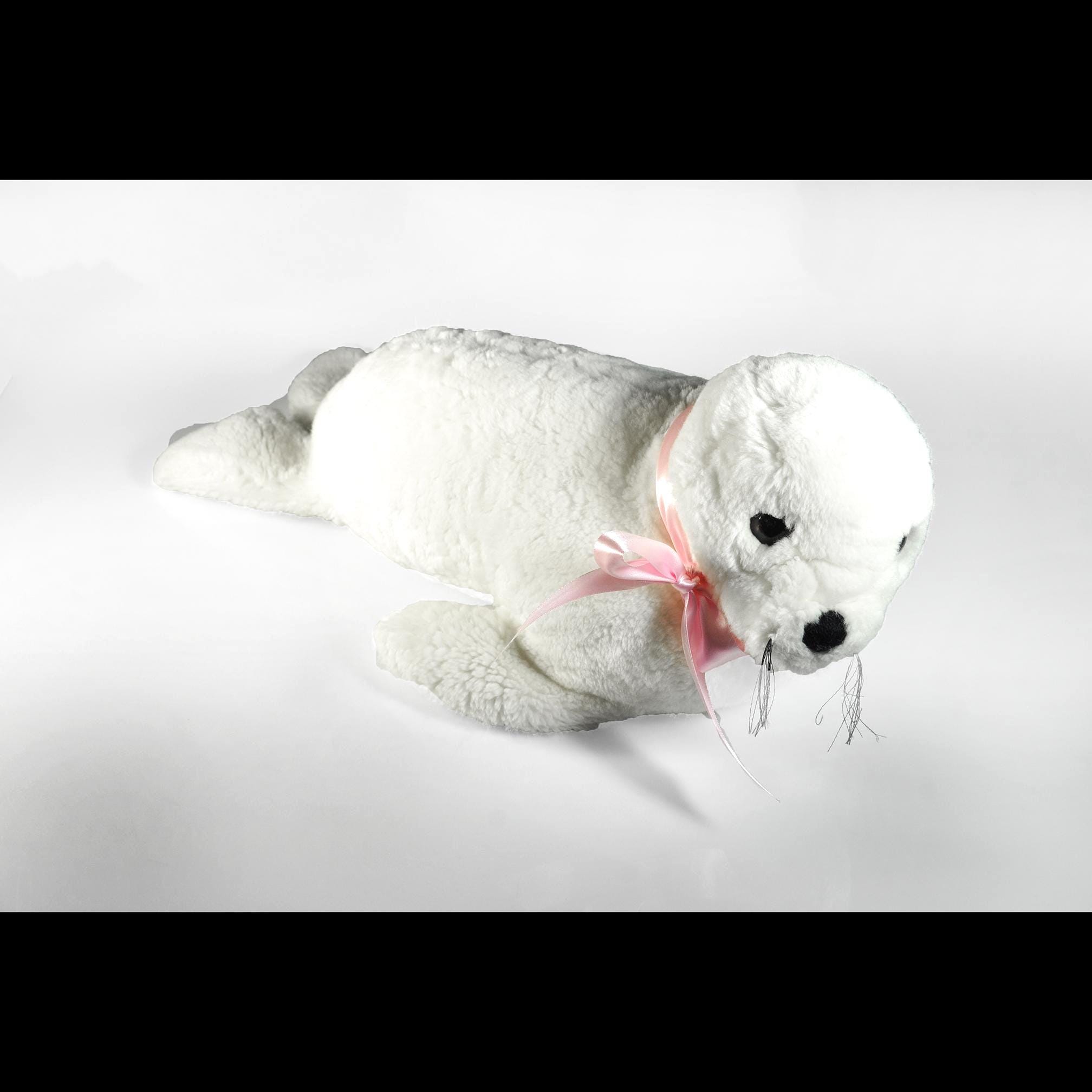 She measures about 20 inches from nose to back flippers and stands 9 inches high at the head. Her fur is a clean, bright white with soft texture, black embroidered nose, warm plastic eyes, and those charming little whiskers that give her personality. The pink satin ribbon is something I added for a bit of color contrast — she wears it well.