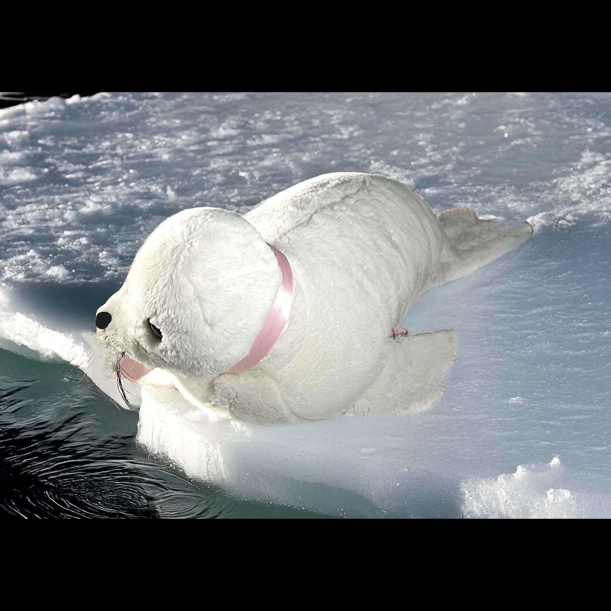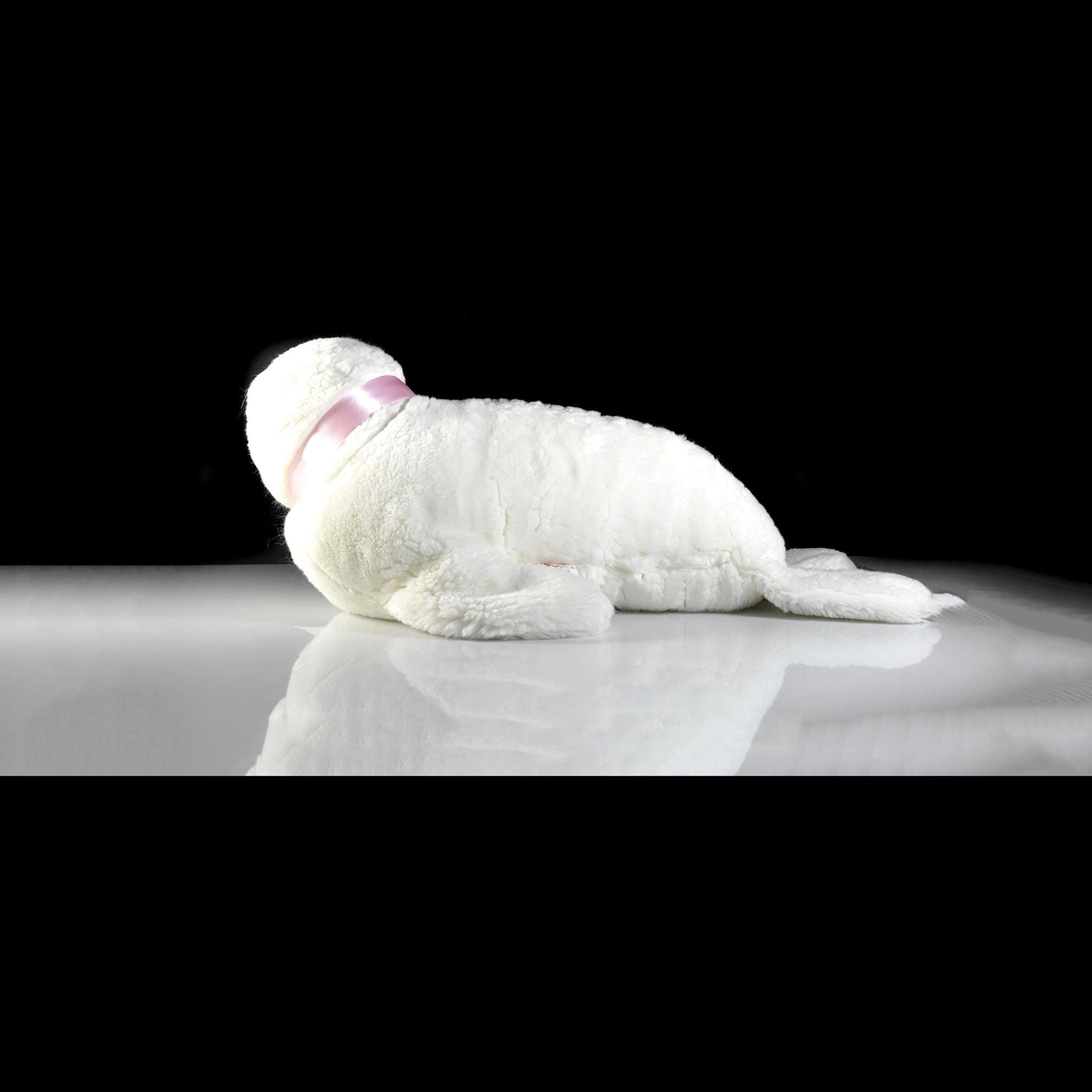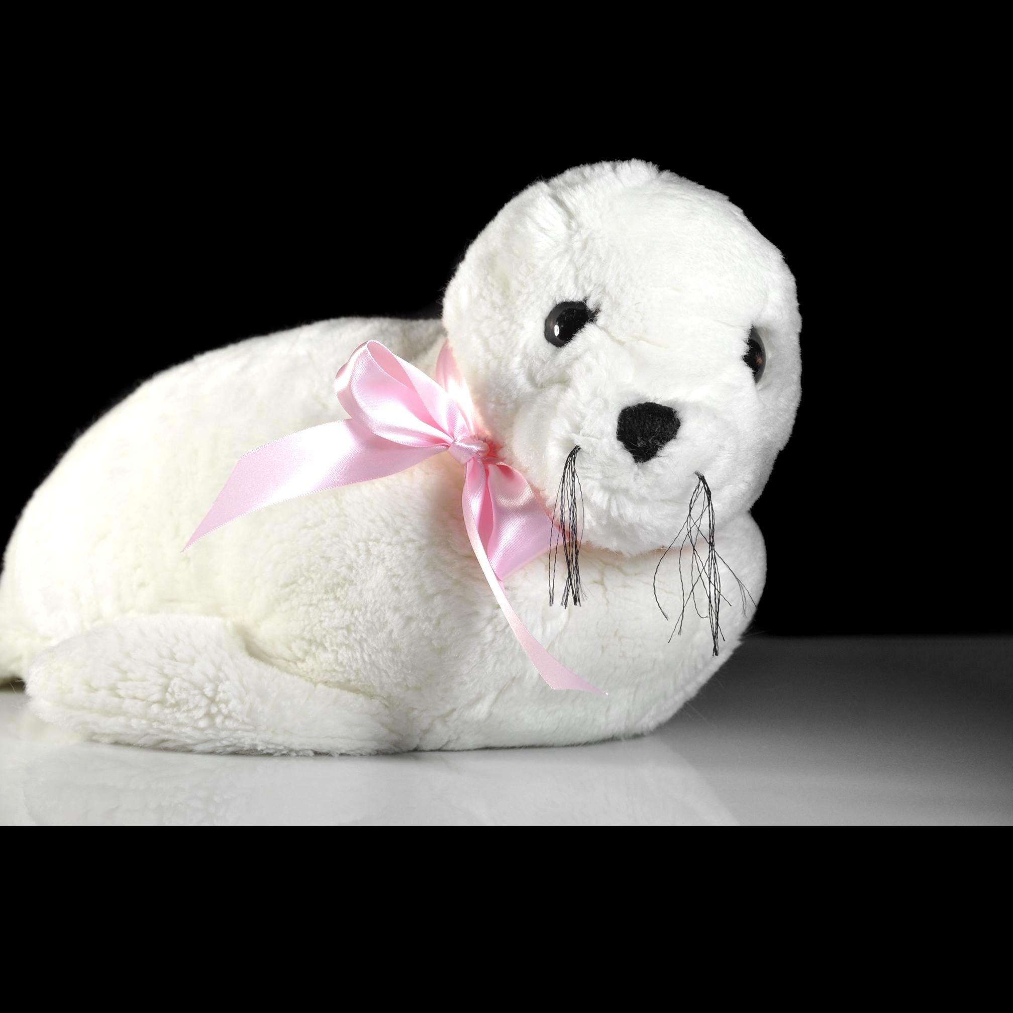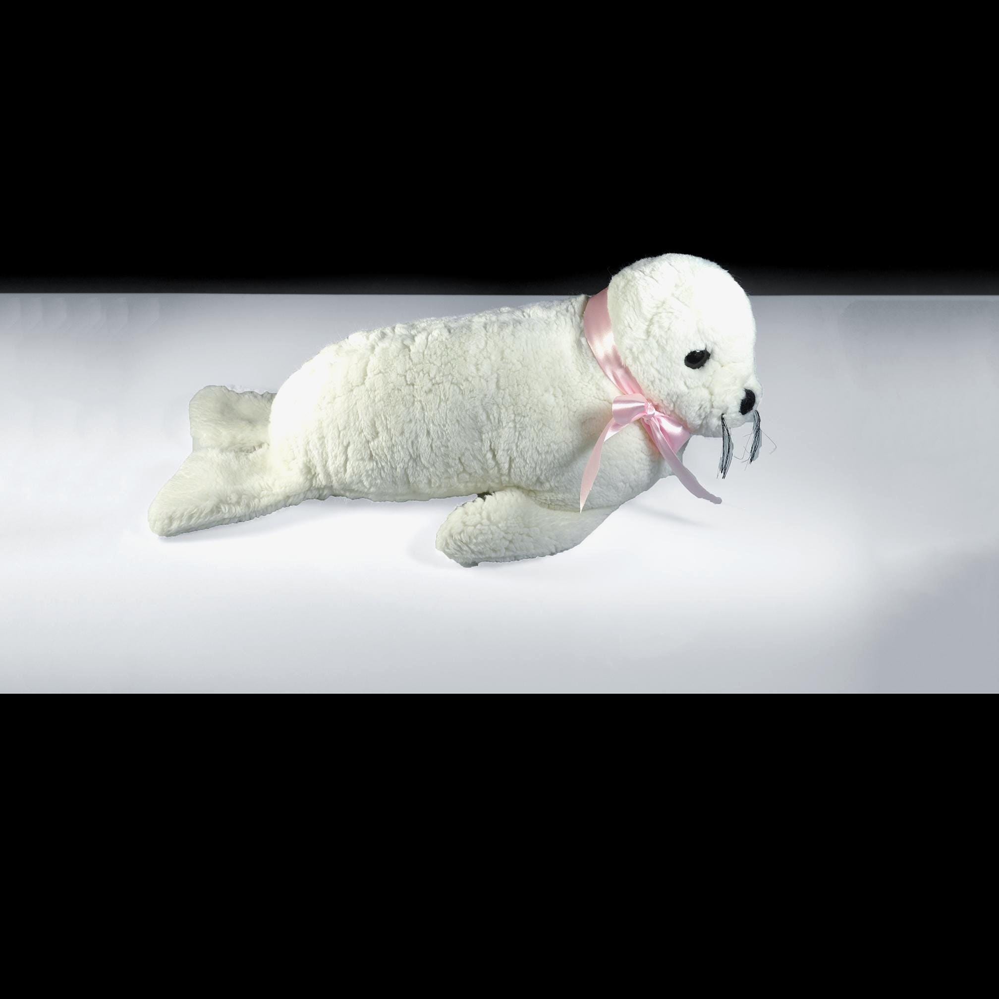 She measures about 20 inches from nose to back flippers and stands 9 inches high at the head. Her fur is a clean, bright white with soft texture, black embroidered nose, warm plastic eyes, and those charming little whiskers that give her personality. The pink satin ribbon is something I added for a bit of color contrast — she wears it well.