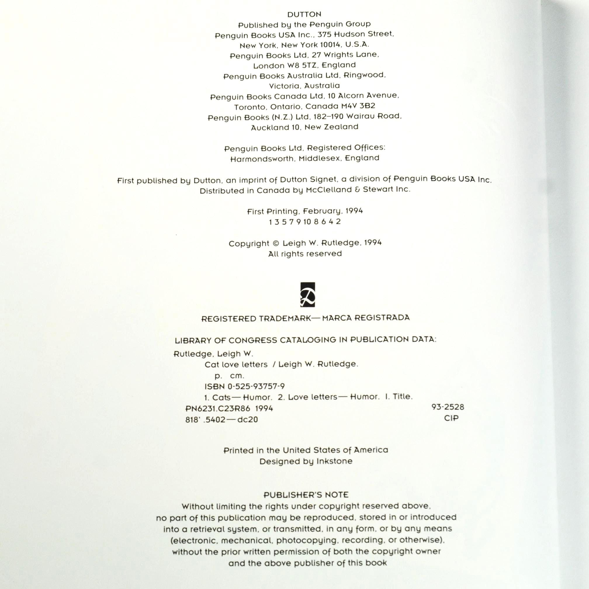 If you’ve ever caught two cats staring at each other across the room and wondered what they might be thinking, this little hardcover will give you a few ideas. Cat Love Letters by Leigh W. Rutledge is a delightful collection of “correspondence” between lovestruck felines — complete with charm, wit, and a good dose of cattitude. Inside you’ll find cats with names like Snowball, Miss Spitfire, and Mr. Grouch pouring their hearts out in letters that feel almost too familiar to anyone who’s ever shared a home with a cat. The illustrations by Robert Crawford bring each story to life — expressive eyes, twitching tails, and all. This is the first printing from February 1994, published by Dutton. Whether you’re a collector of cat books, a fan of Rutledge’s clever humor, or just someone who knows the soft spot cats can carve out in a person’s heart, this is the kind of book that makes you smile every time you open it.