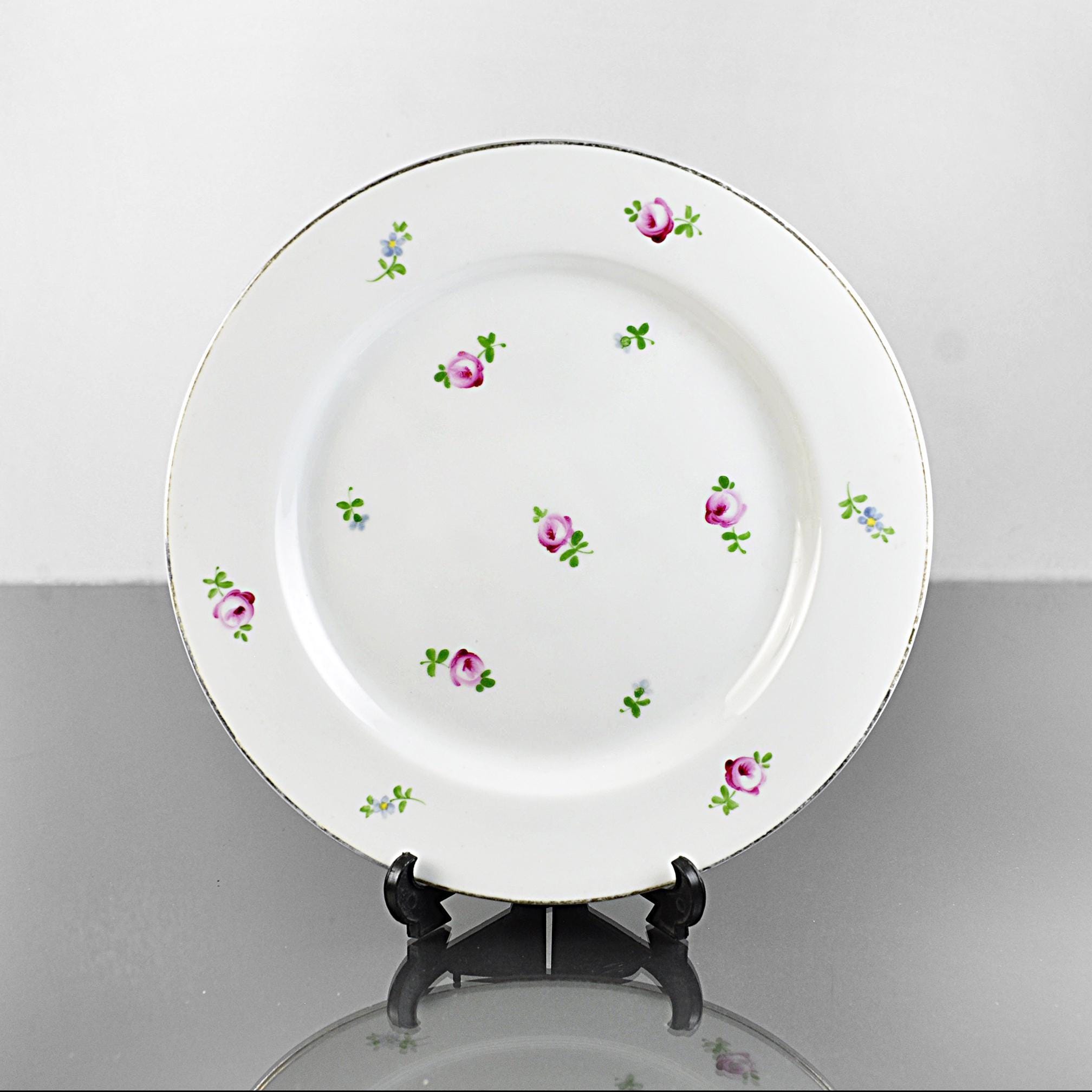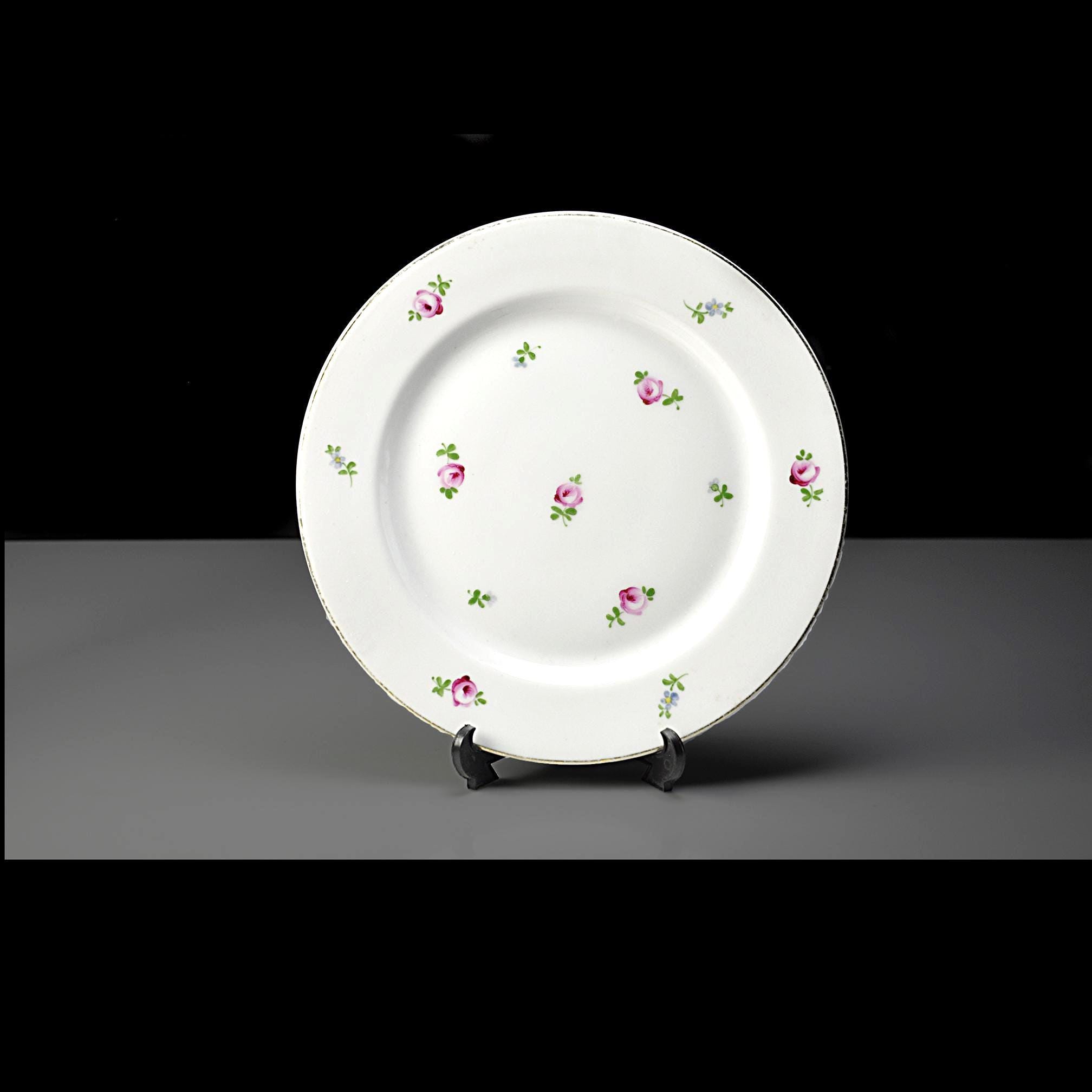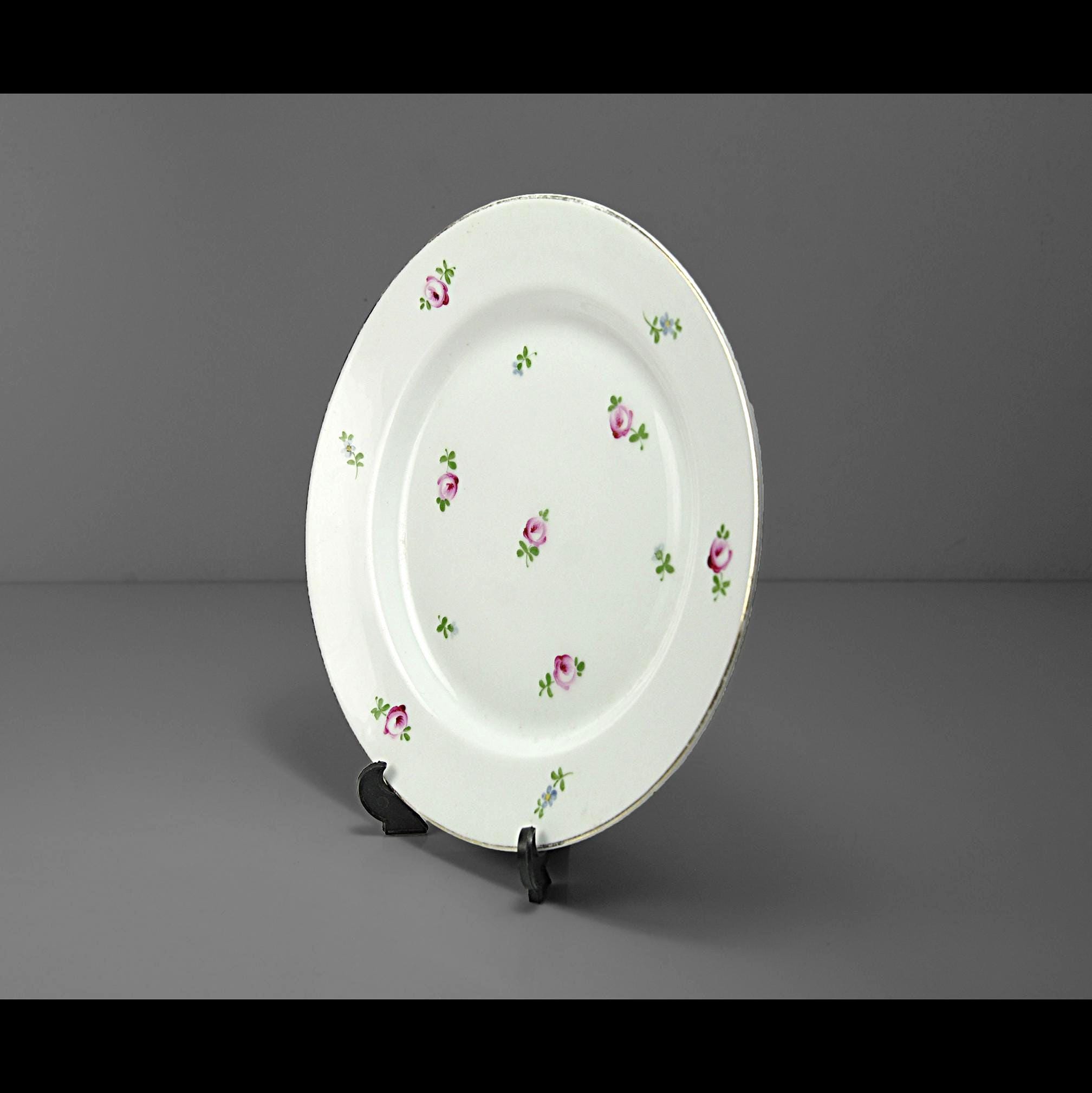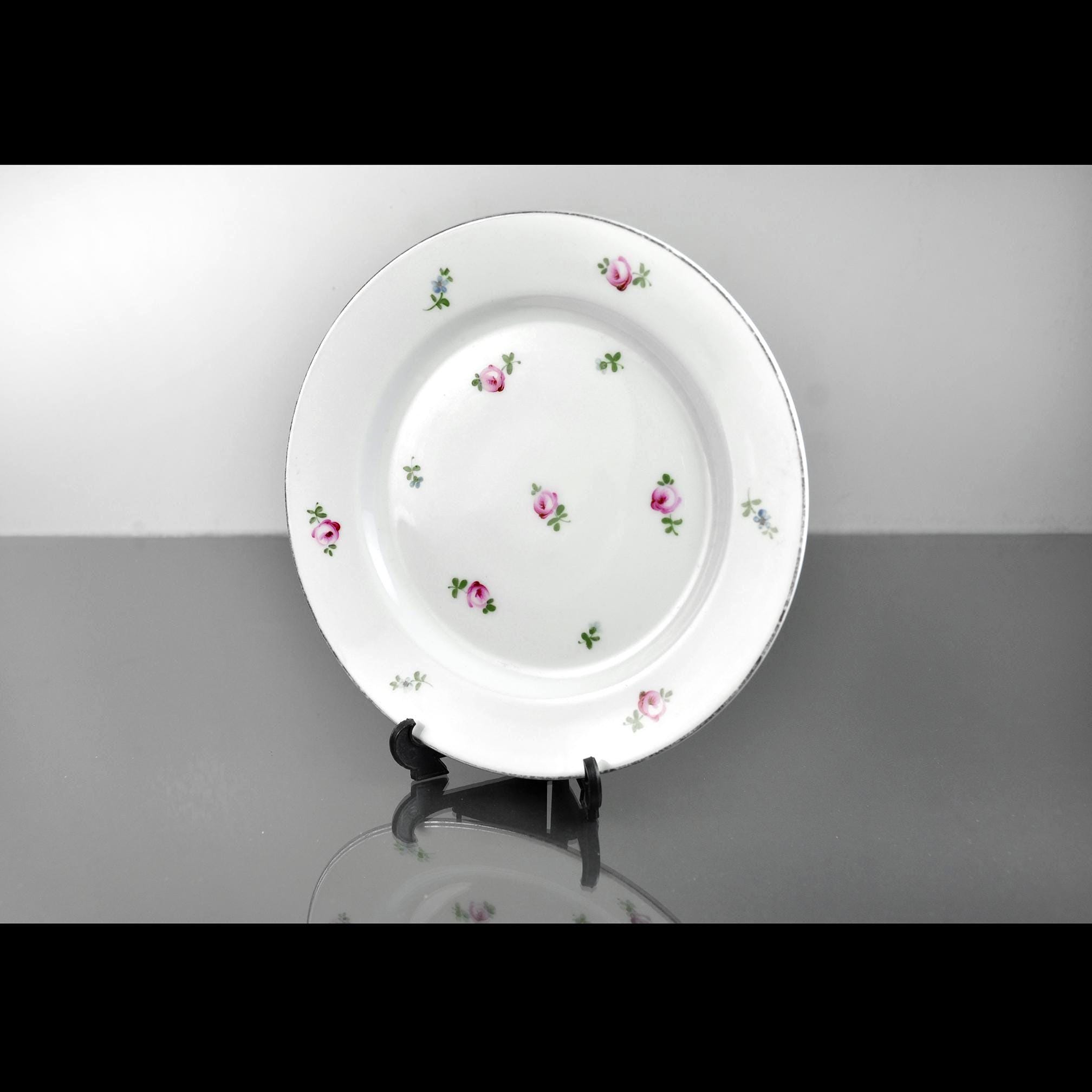 This little Bavarian plate has been around for close to a century, and you can see why it’s still charming. Made by Heinrich & Co. in Selb, Germany sometime in the 1920s, it’s the sort of piece you’d find sitting in a grandmother’s china cupboard — simple white porcelain with scattered pink rosebuds and a soft, easy feel. It is just the right size for a small dessert or to tuck onto a shelf. It’s a sweet old piece with that uncomplicated cottage look, ready for someone who still likes the quiet beauty of old Bavarian china.