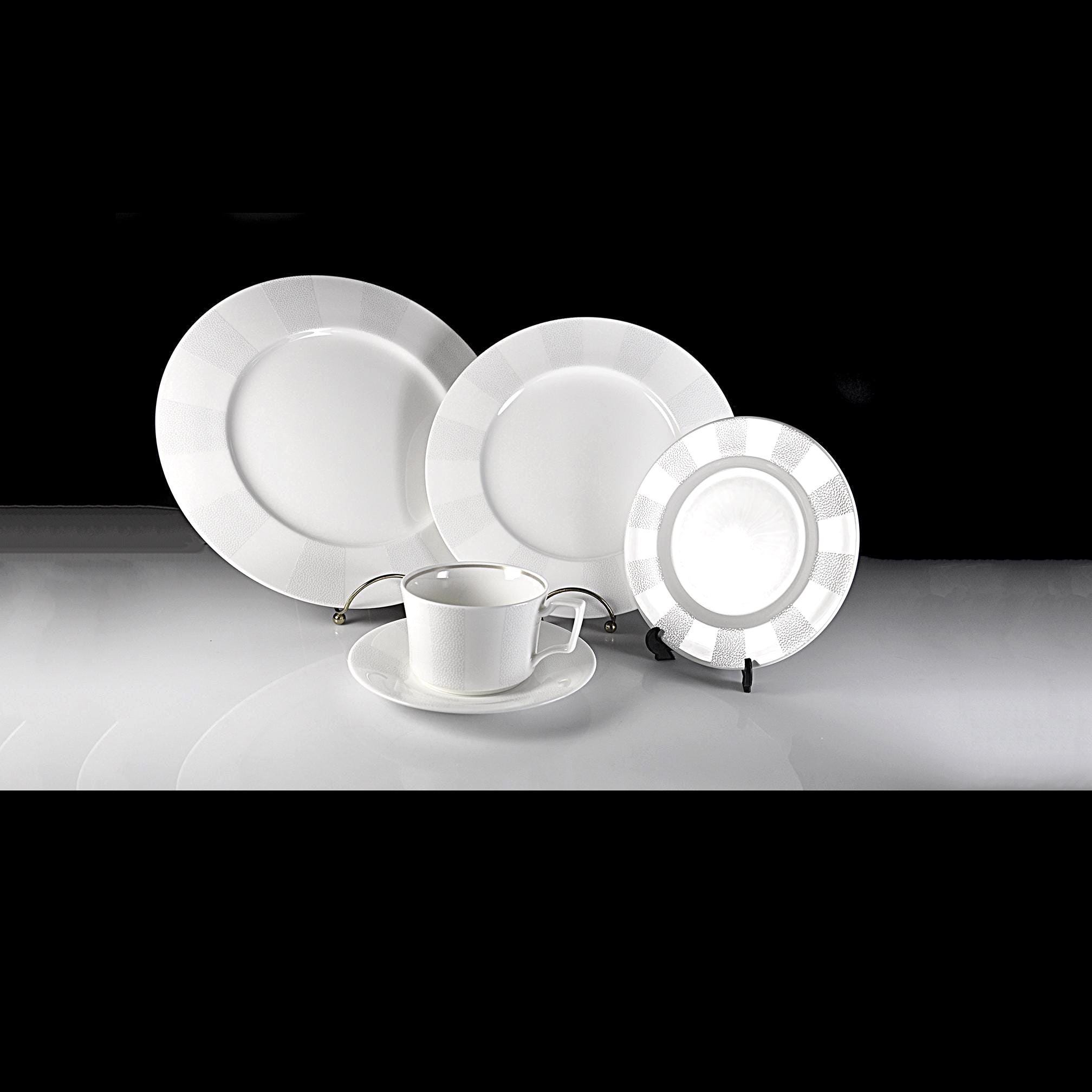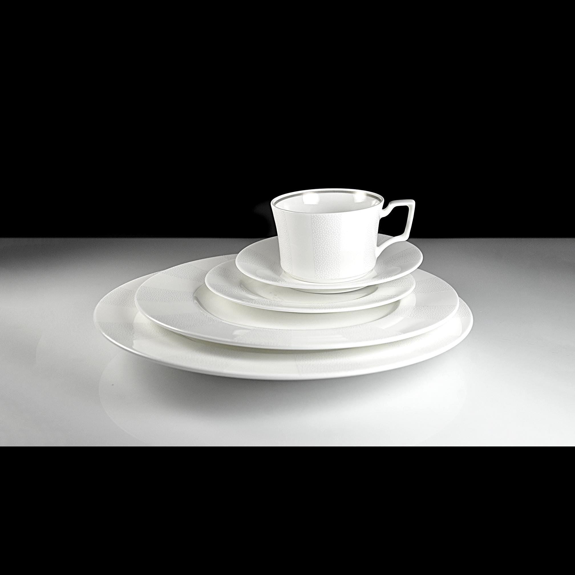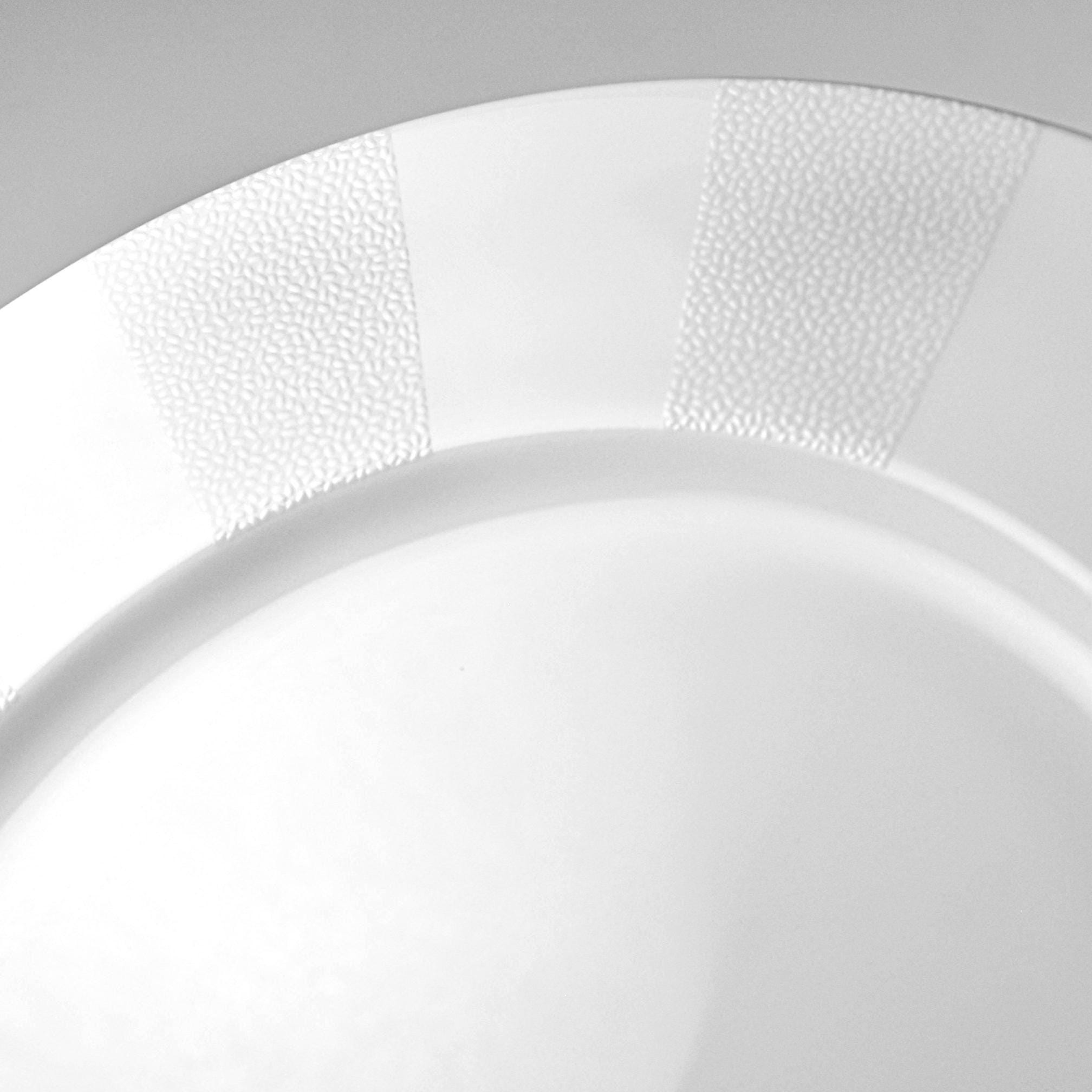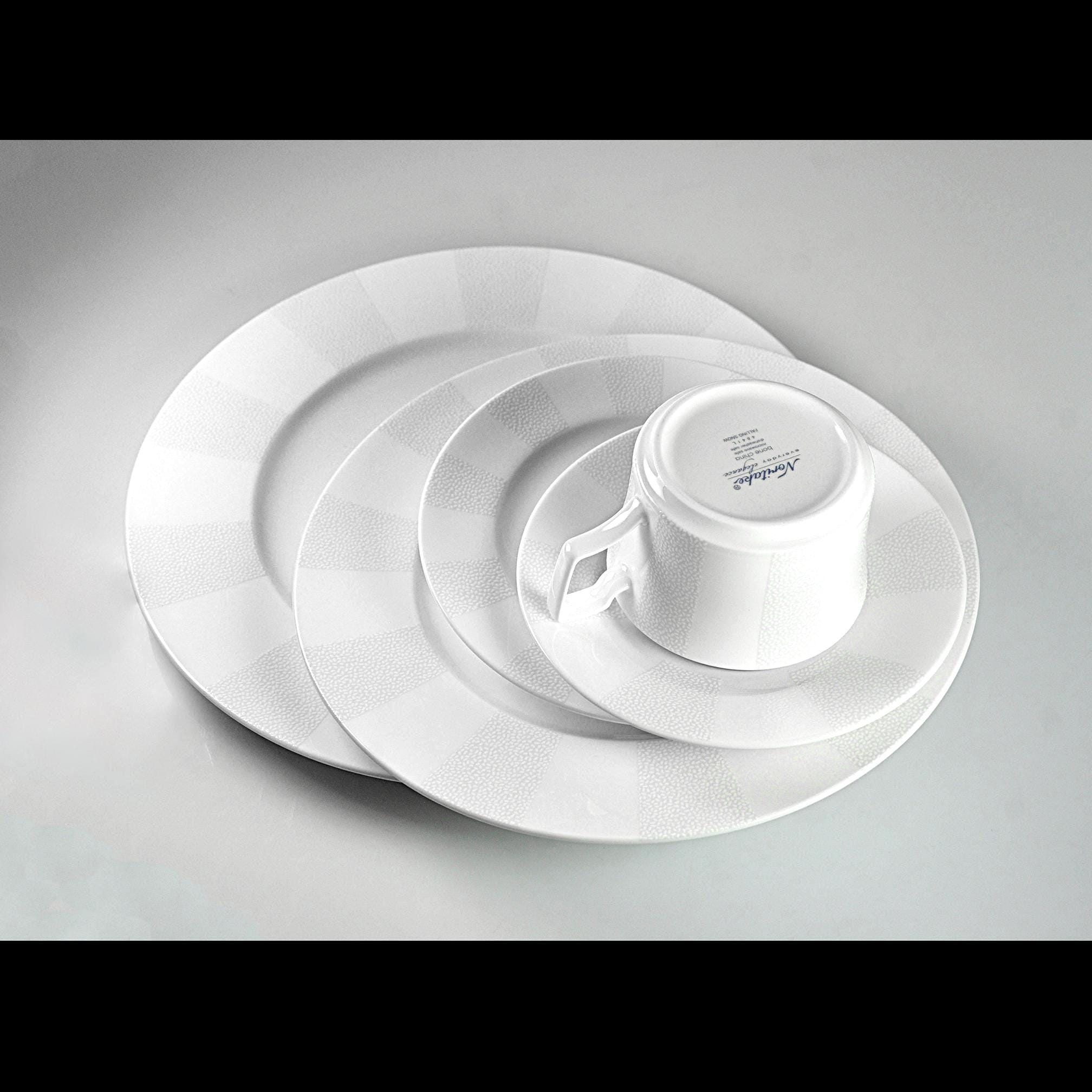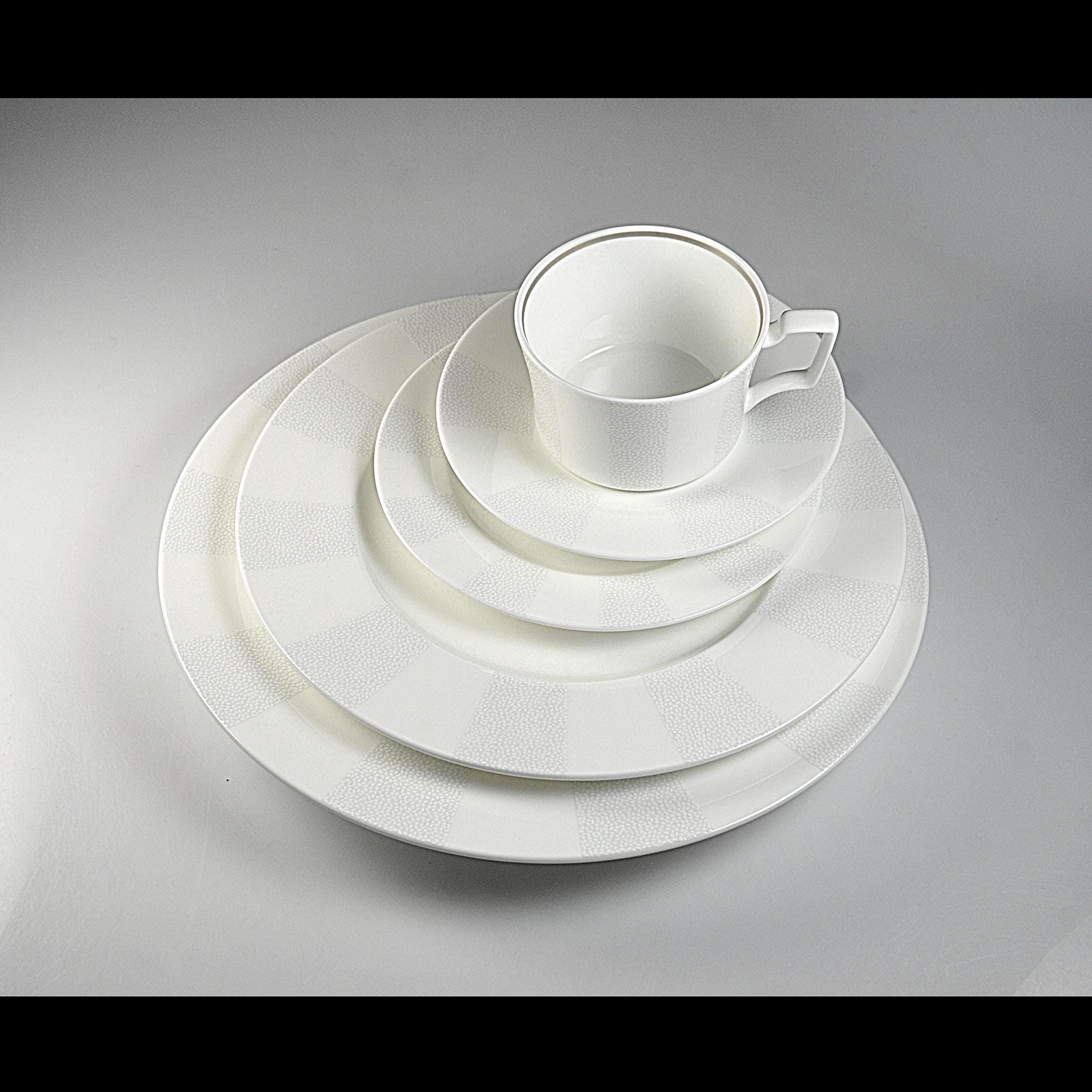 The Falling Snow pattern is understated: a bright white base with soft, textured speckled bands around the rim. Nothing loud, nothing trendy — just a classic, winter-clean design that will hold up for decades.