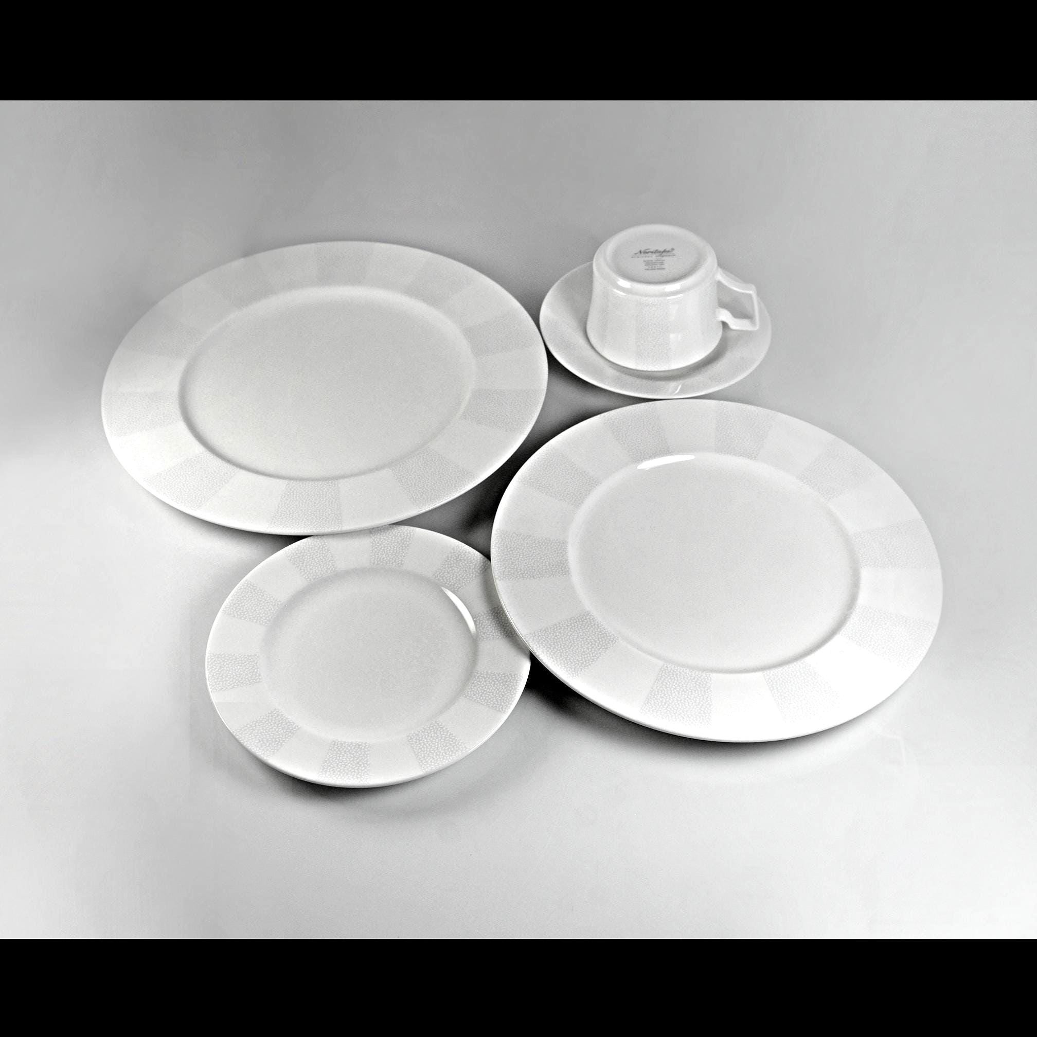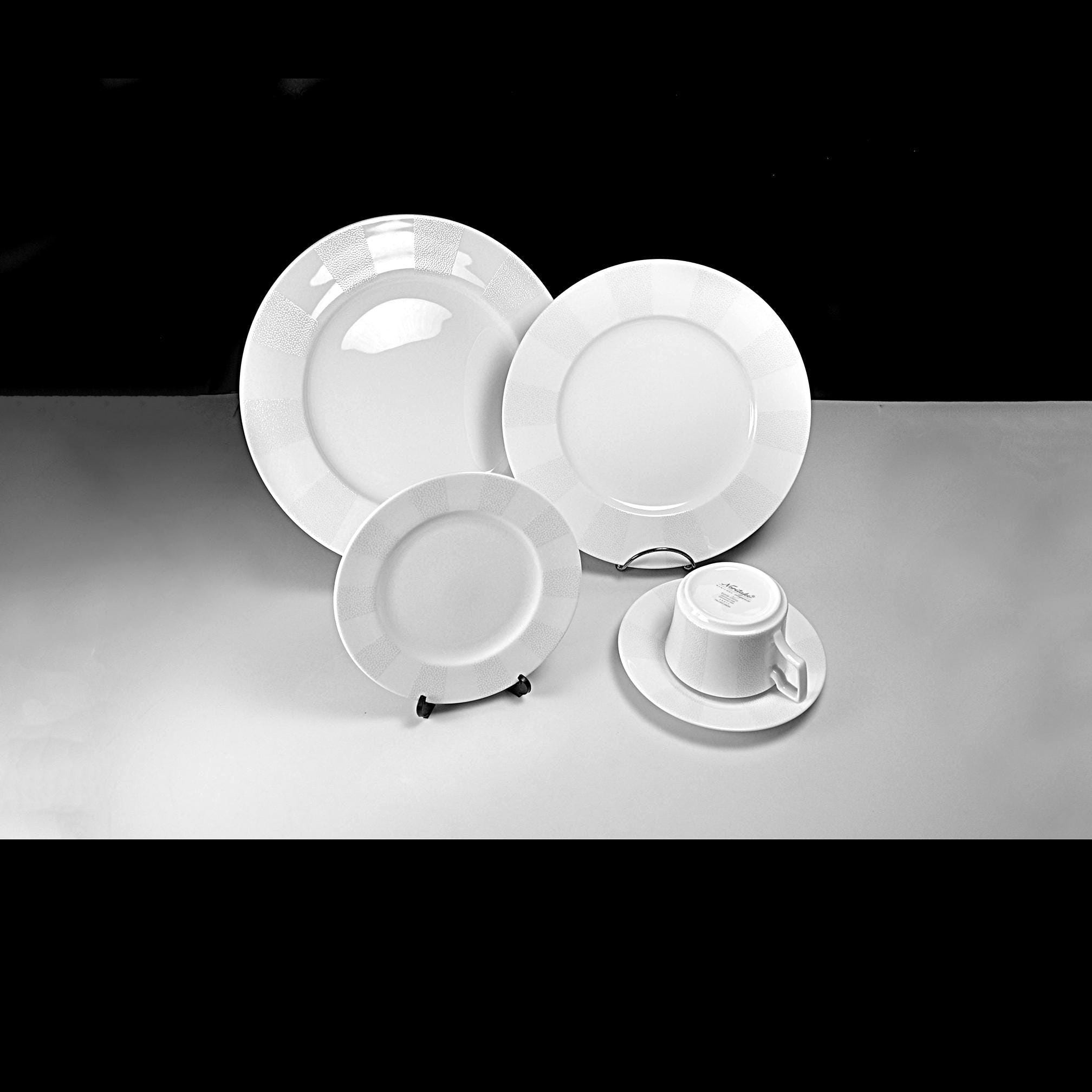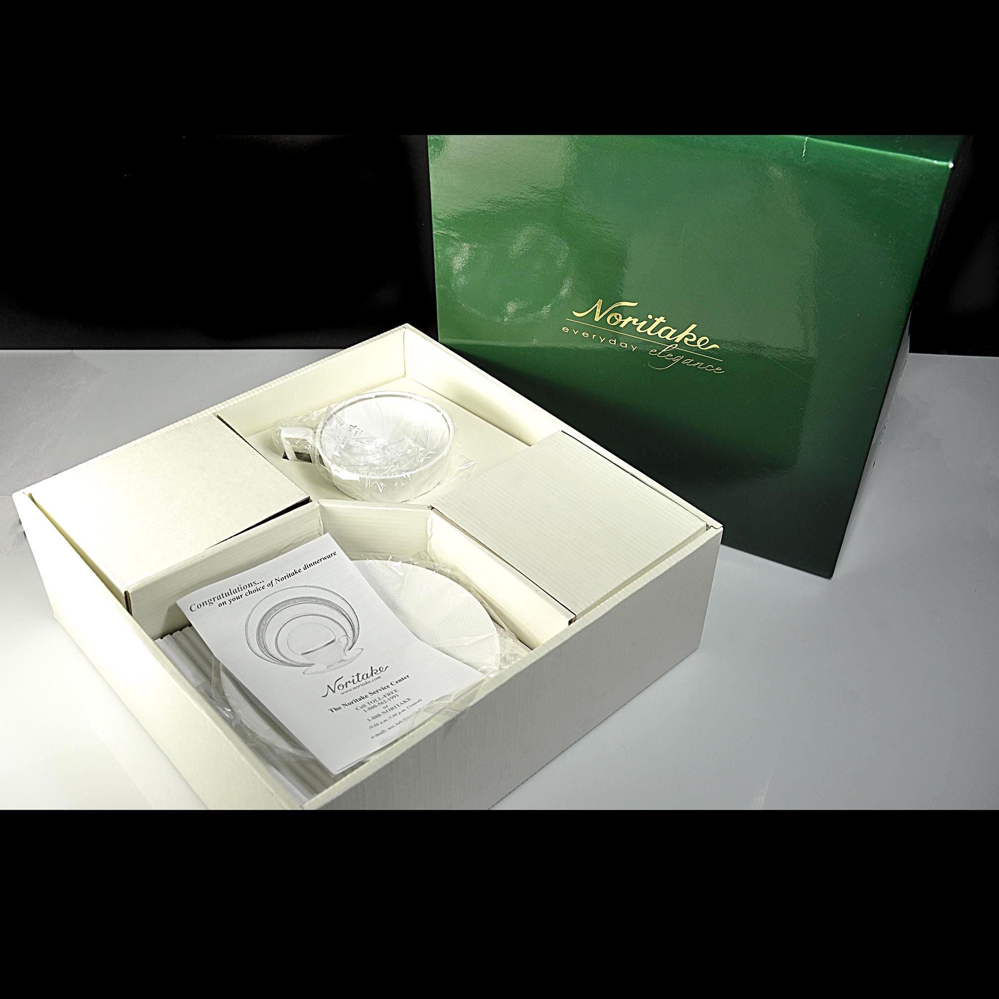 If you’ve ever set the table on a quiet winter evening, you know that some dishes just feel right — calm, clean, and elegant without making a fuss. This Noritake Falling Snow place setting has that kind of presence. It’s the sort of pattern you could use for a holiday dinner or a Tuesday-night roast chicken and it wouldn’t look out of place either way. This set is new in its original box, still wrapped in all the factory packaging, right down to the original paperwork tucked inside just the way Noritake sent it out. It’s from their Everyday Elegance bone china line which made china that was both beautiful and practical. Microwave safe, dishwasher safe, but still polished enough to bring out when company comes. When the holidays roll in and the house fills with the smell of good cooking, the table starts to matter a little more. You bring out the things that make a meal feel special without turning it into a chore. That’s where this Noritake Falling Snow place setting fits right in. It doesn’t shout “Christmas,” but it sure knows how to look the part. It blends with just about any holiday décor: candles, greenery, plaid napkins, or your grandmother’s old linens. The rest of the year it is there any time you want to add elegance to your table setting.