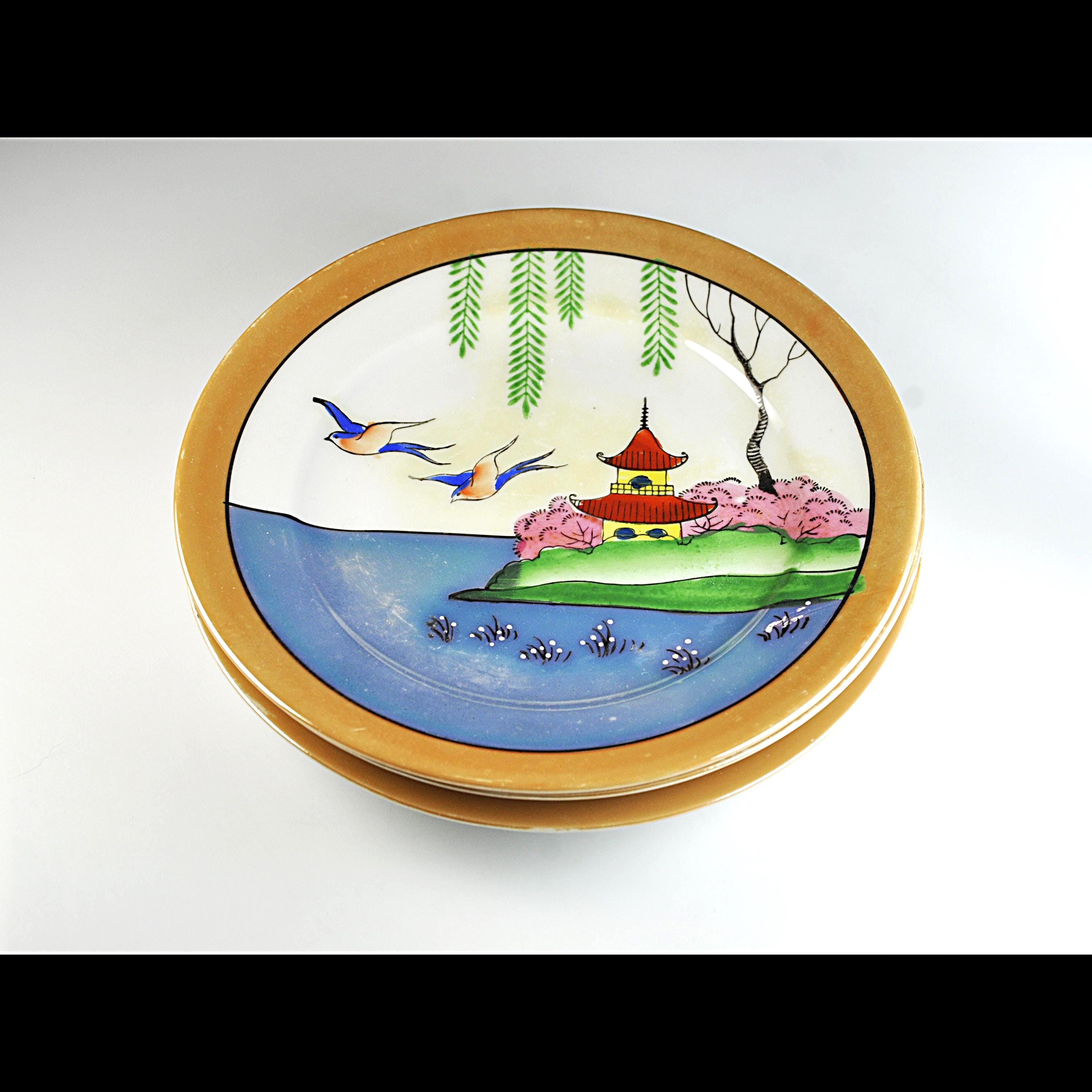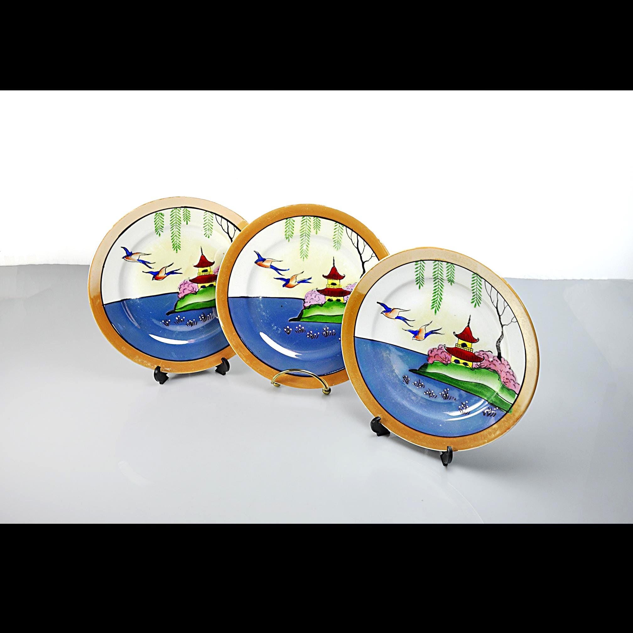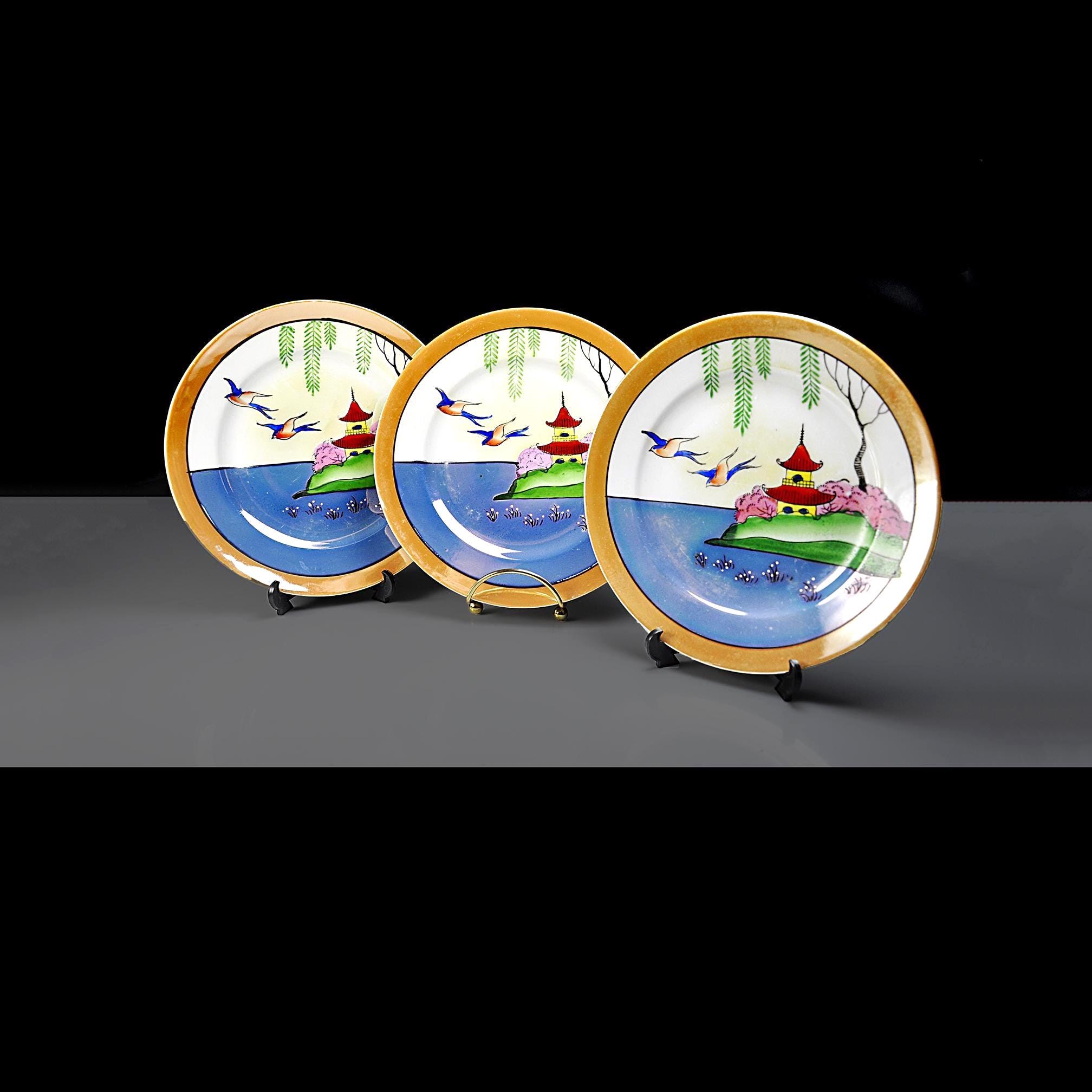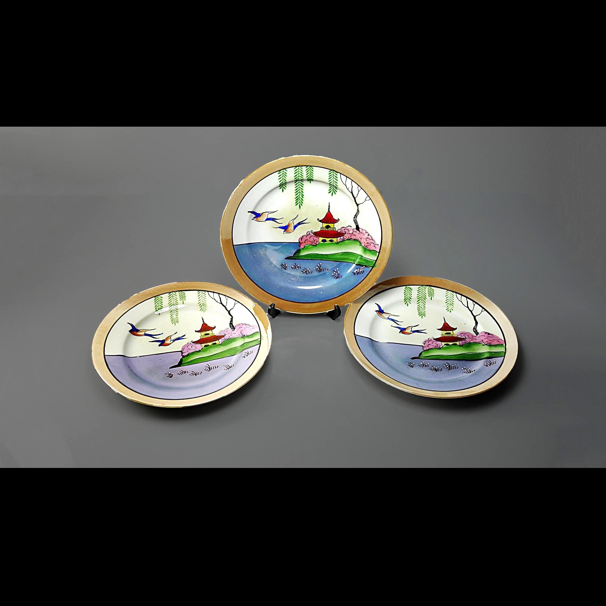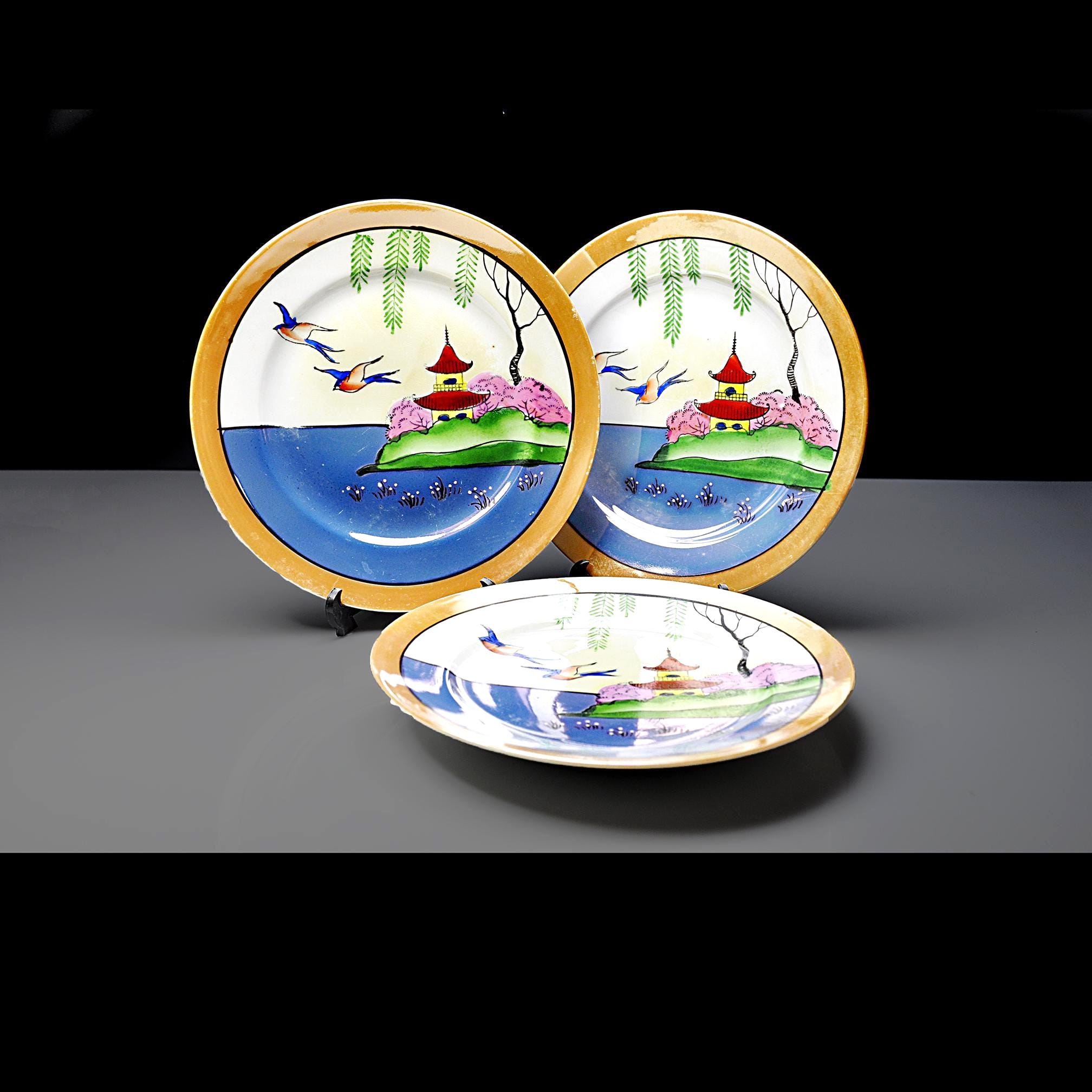 There’s something comforting about pieces that were clearly cherished, and this little set of three mid-century Japanese lusterware salad plates is exactly that. They’ve been well-kept for decades, the kind of plates someone brought out for “the nice lunches” and then tucked safely back into the cupboard. Each plate features a peaceful Oriental landscape — a bright blue shoreline, a red pagoda perched on green hills, willow branches drifting overhead, and those three graceful birds gliding across the sky. The colors still have that mid-century pop, the kind of hand-finished detailing you only find on Japan’s export china from the 1950s. Whether you like hanging scenic plates on the wall, mixing them into a tea table setting, or simply collecting mid-century Japanese export ware, this set has a wonderful nostalgic charm.