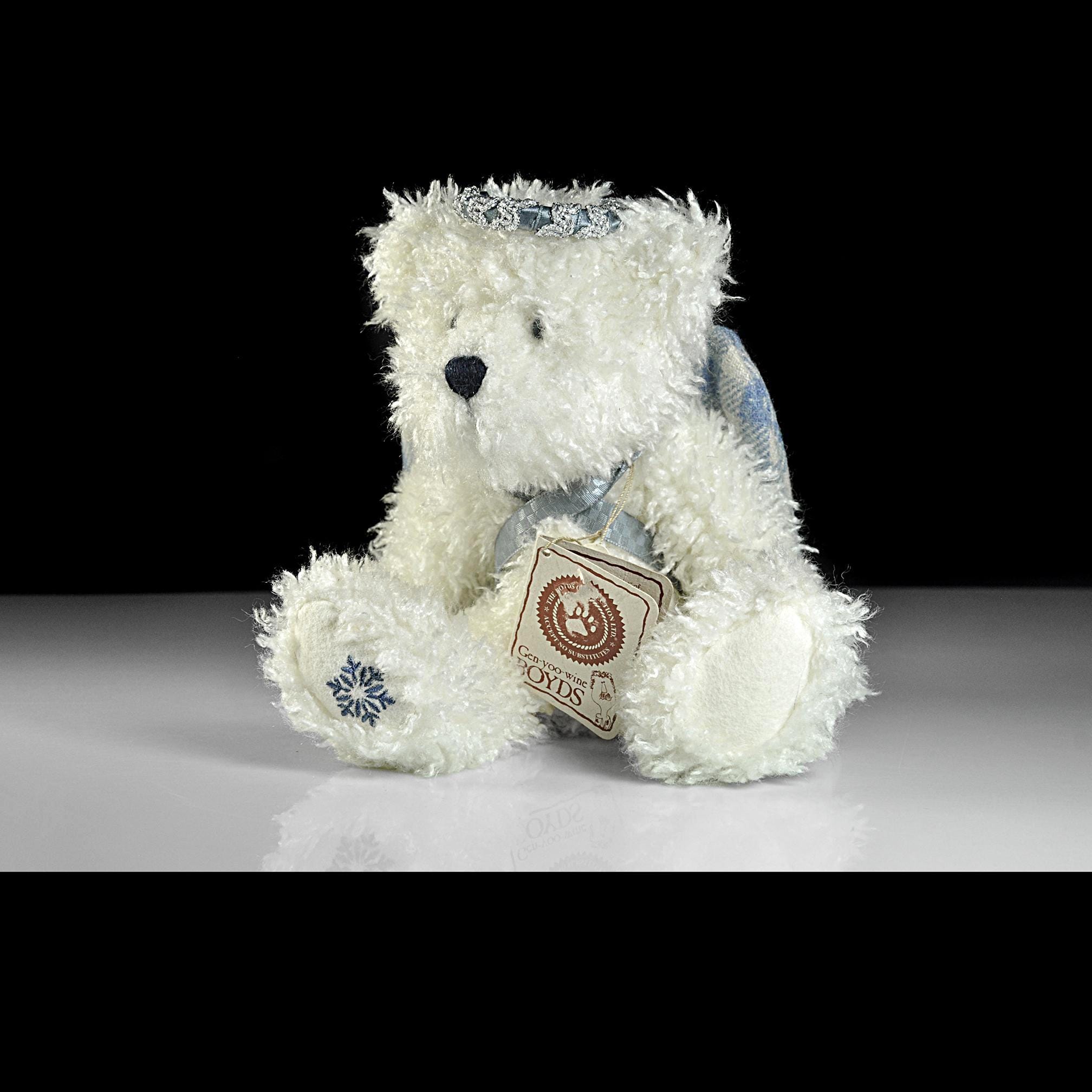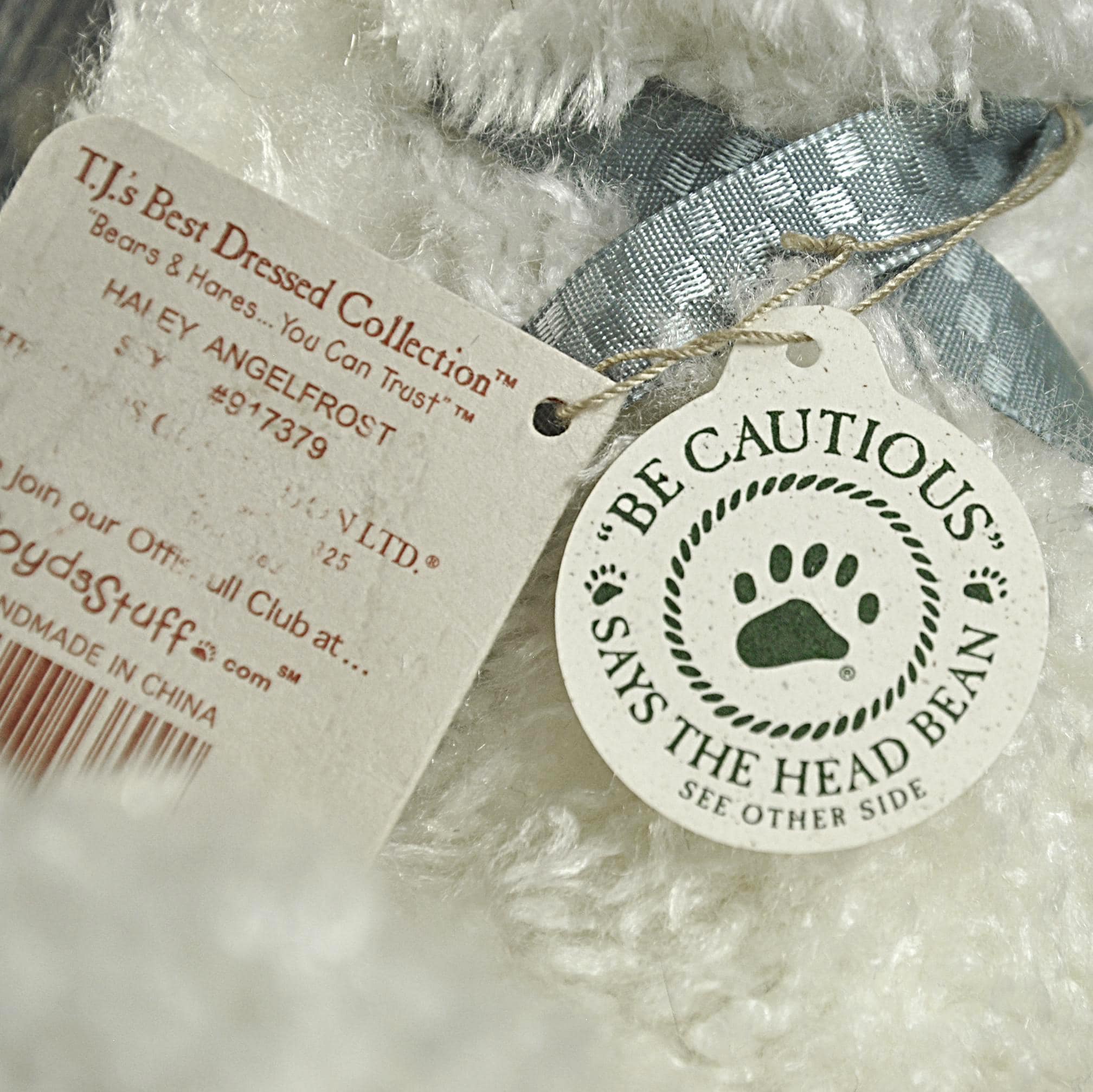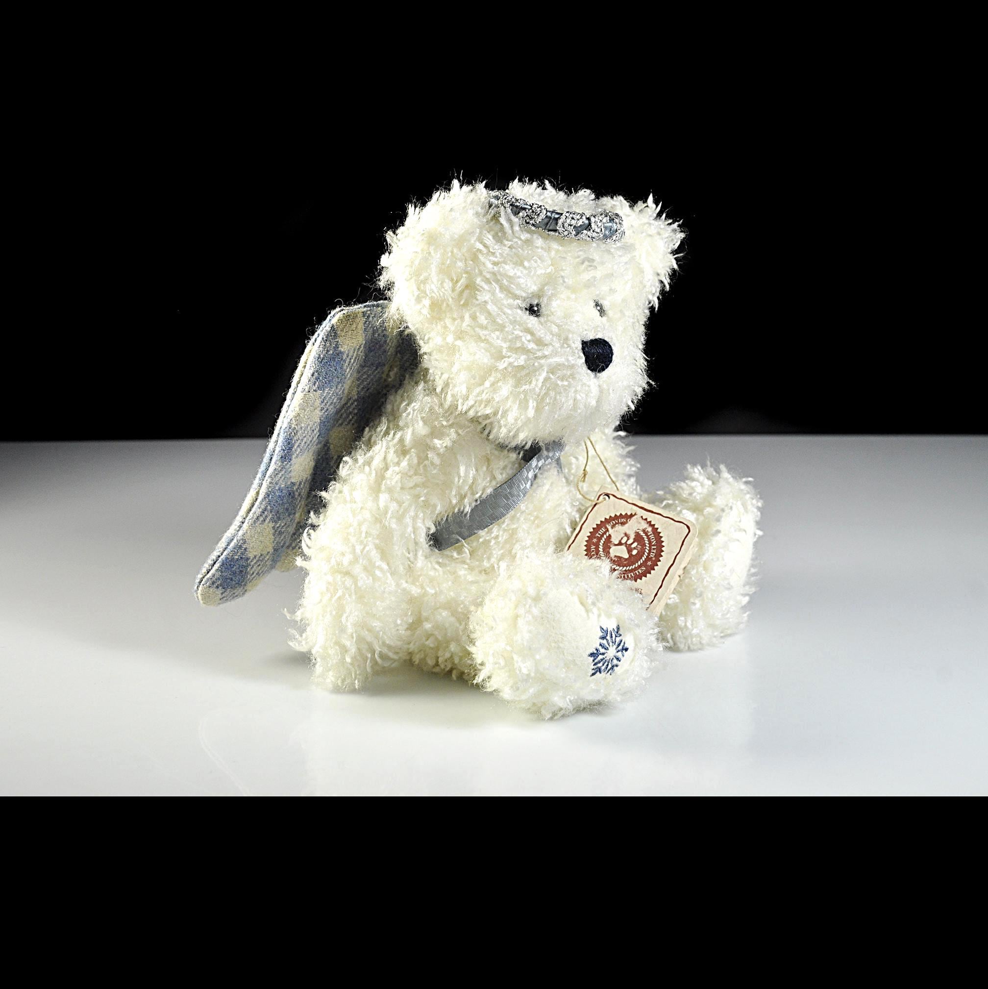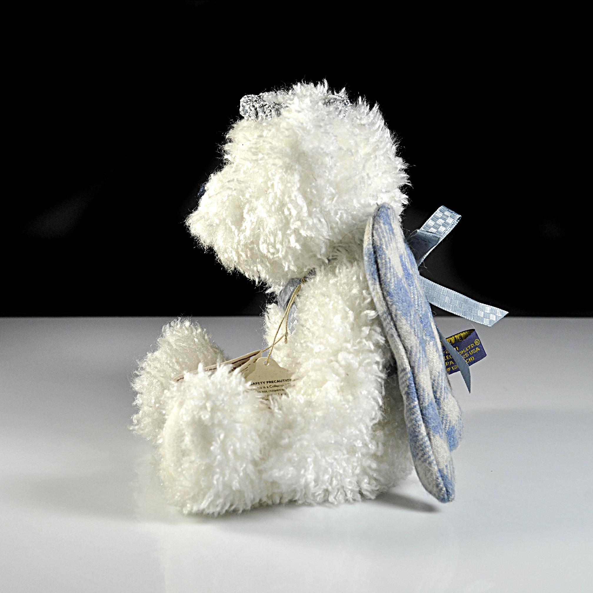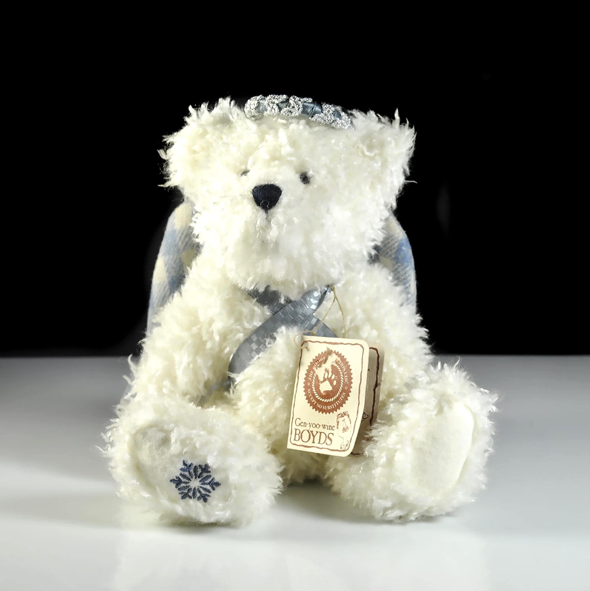 This is Haley AngelFrost, part of T.J.’s Best Dressed Collection from 2001, back when Boyds Bears were still winning hearts left and right and every collector seemed to have a favorite perched on a shelf. You know how certain things just have that gentle holiday feeling about them, even before you turn on the lights or drag the boxes down from the attic? That’s what this little Boyd’s angel brings to a room. She’s a soft white fluff of a bear, dressed up with her blue-and-cream angel wings, a silver-trimmed halo, and her original little hangtags still tied to her. Nothing missing, nothing worn out — she’s been well-kept and it shows. If you like items that feel nostalgic without being fussy, she fits that perfectly, right down to the small blue snowflake on her foot. Whether you’re bringing back a childhood collection, gifting a sentimental piece, or just adding a touch of winter coziness to the house, she’ll settle right in like she’s always been part of the place.