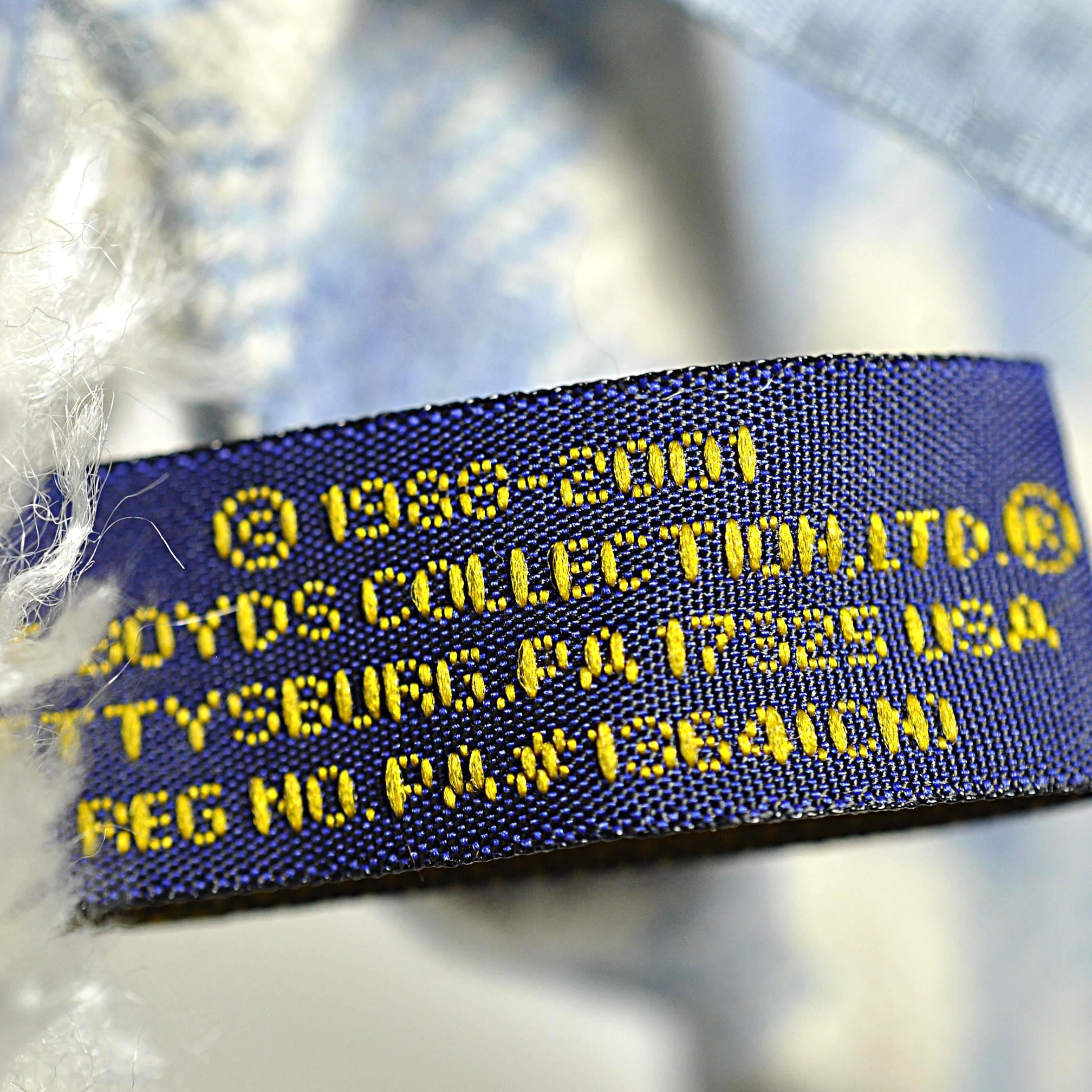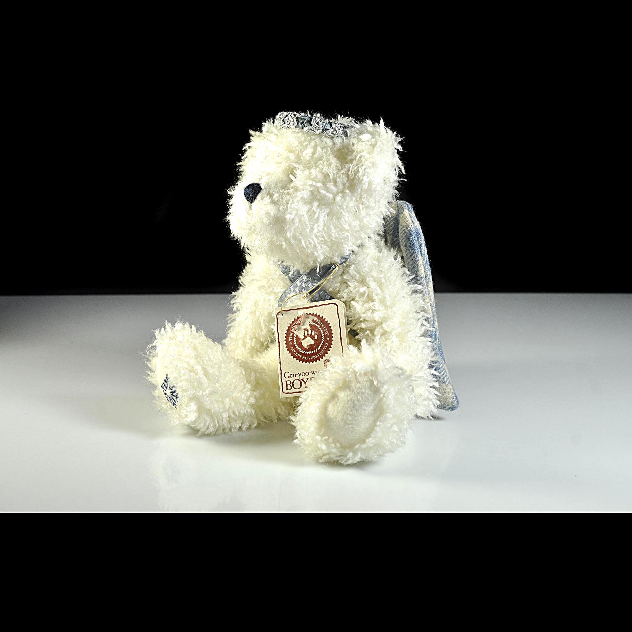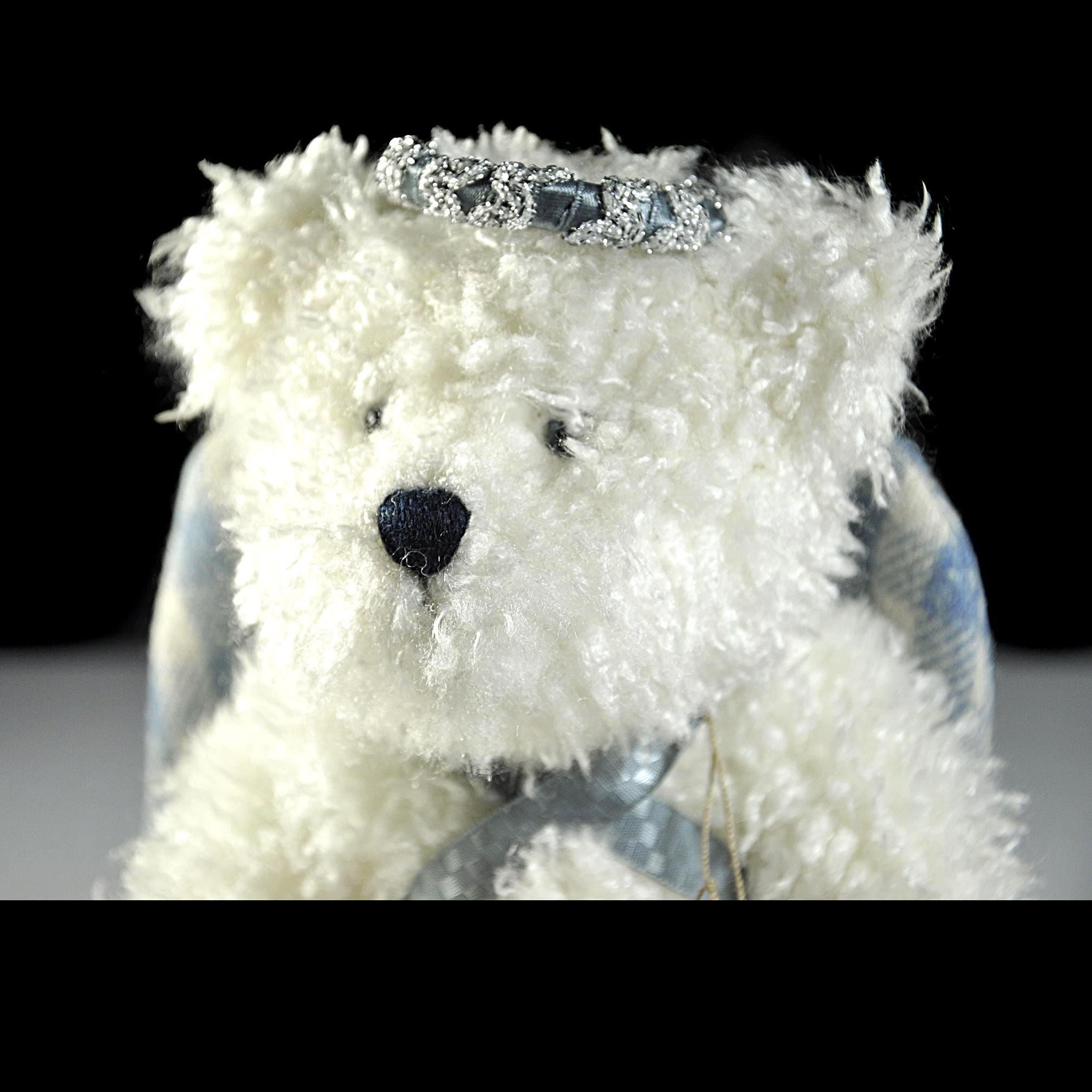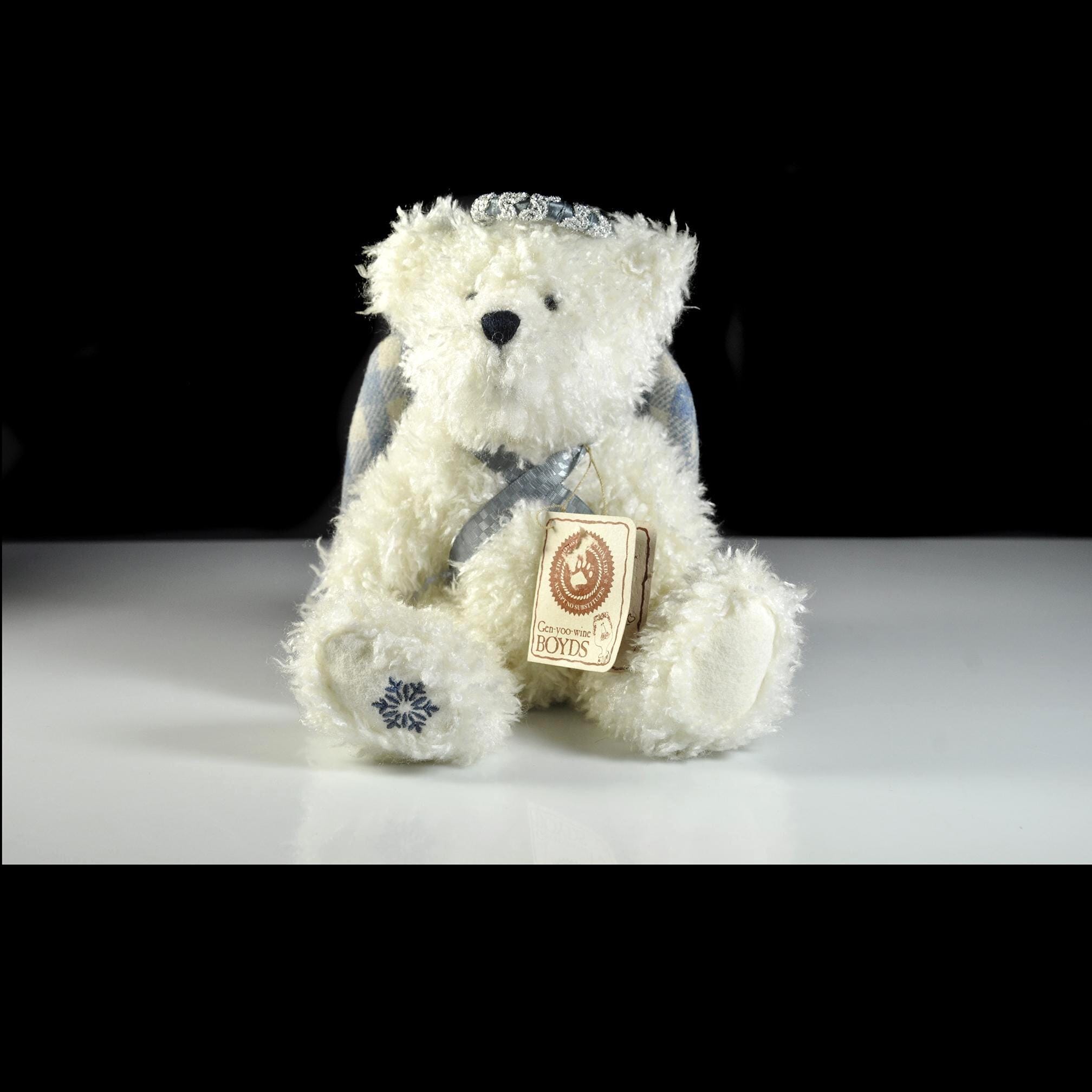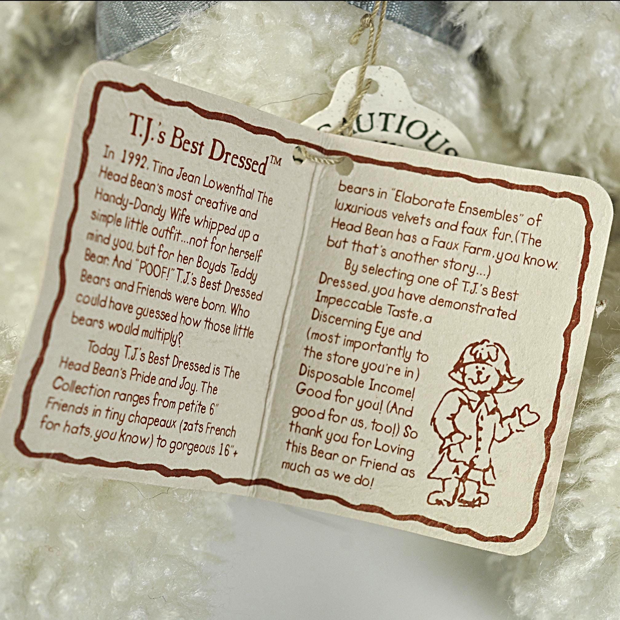 This is Haley AngelFrost, part of T.J.’s Best Dressed Collection from 2001, back when Boyds Bears were still winning hearts left and right and every collector seemed to have a favorite perched on a shelf. You know how certain things just have that gentle holiday feeling about them, even before you turn on the lights or drag the boxes down from the attic? That’s what this little Boyd’s angel brings to a room. She’s a soft white fluff of a bear, dressed up with her blue-and-cream angel wings, a silver-trimmed halo, and her original little hangtags still tied to her. Nothing missing, nothing worn out — she’s been well-kept and it shows. If you like items that feel nostalgic without being fussy, she fits that perfectly, right down to the small blue snowflake on her foot. Whether you’re bringing back a childhood collection, gifting a sentimental piece, or just adding a touch of winter coziness to the house, she’ll settle right in like she’s always been part of the place.