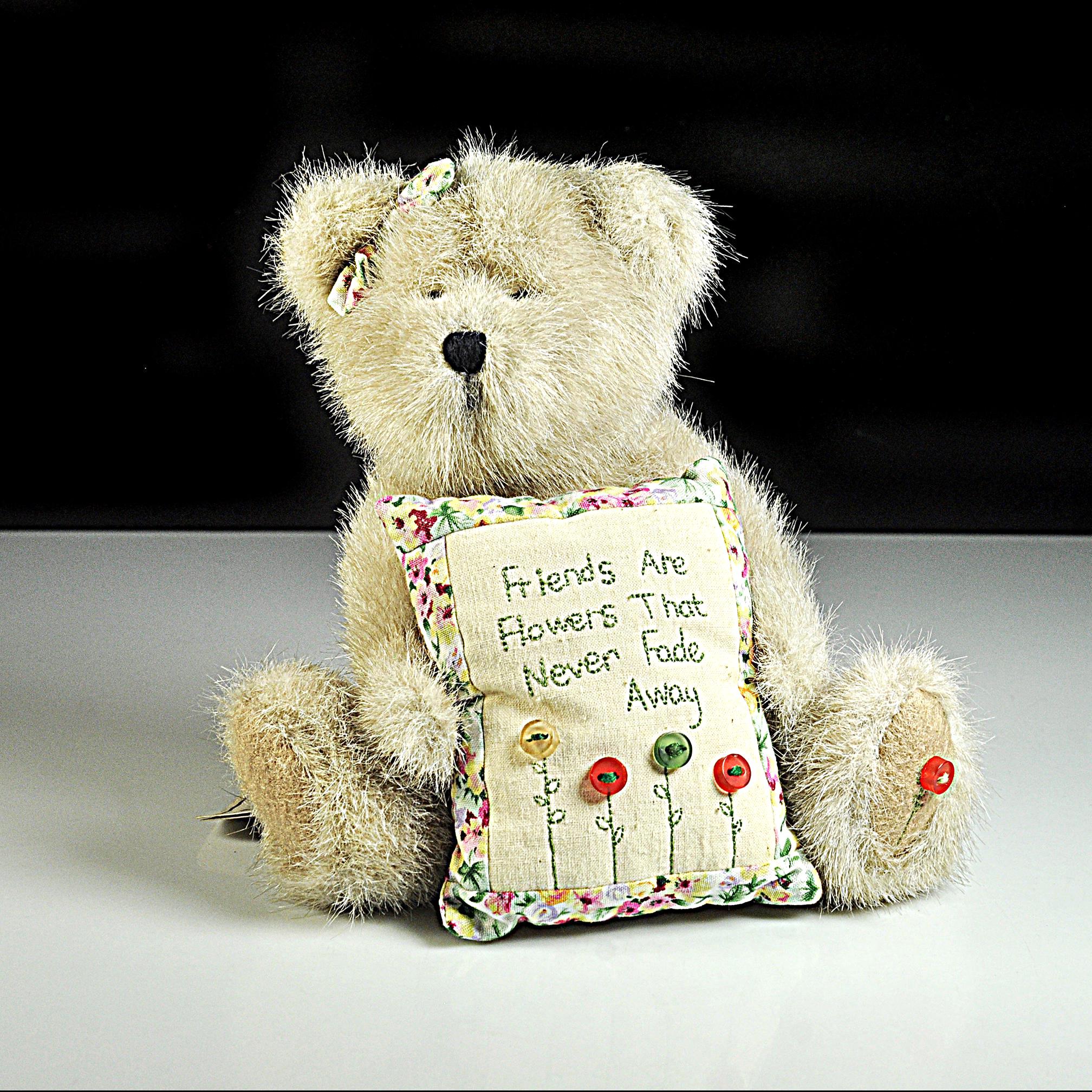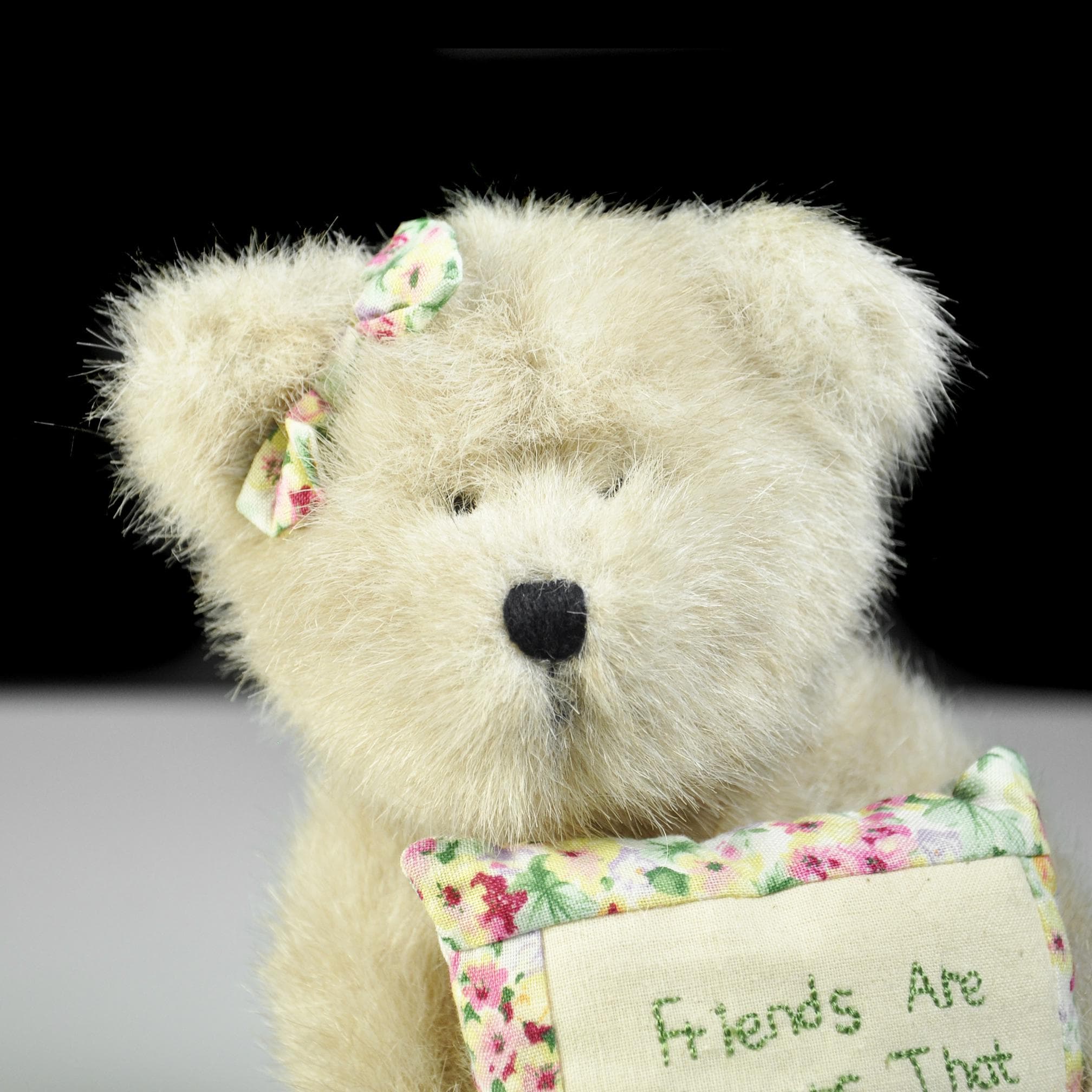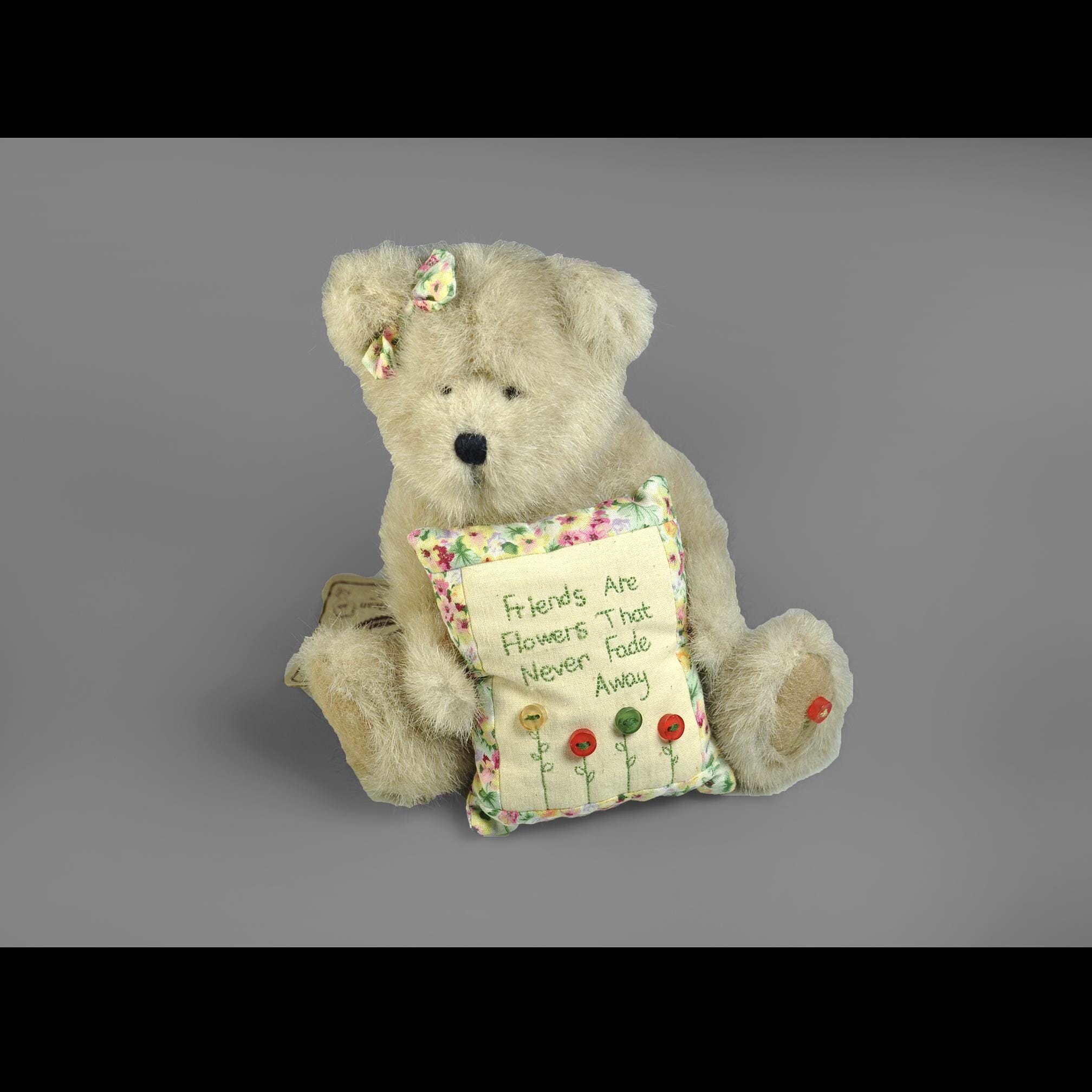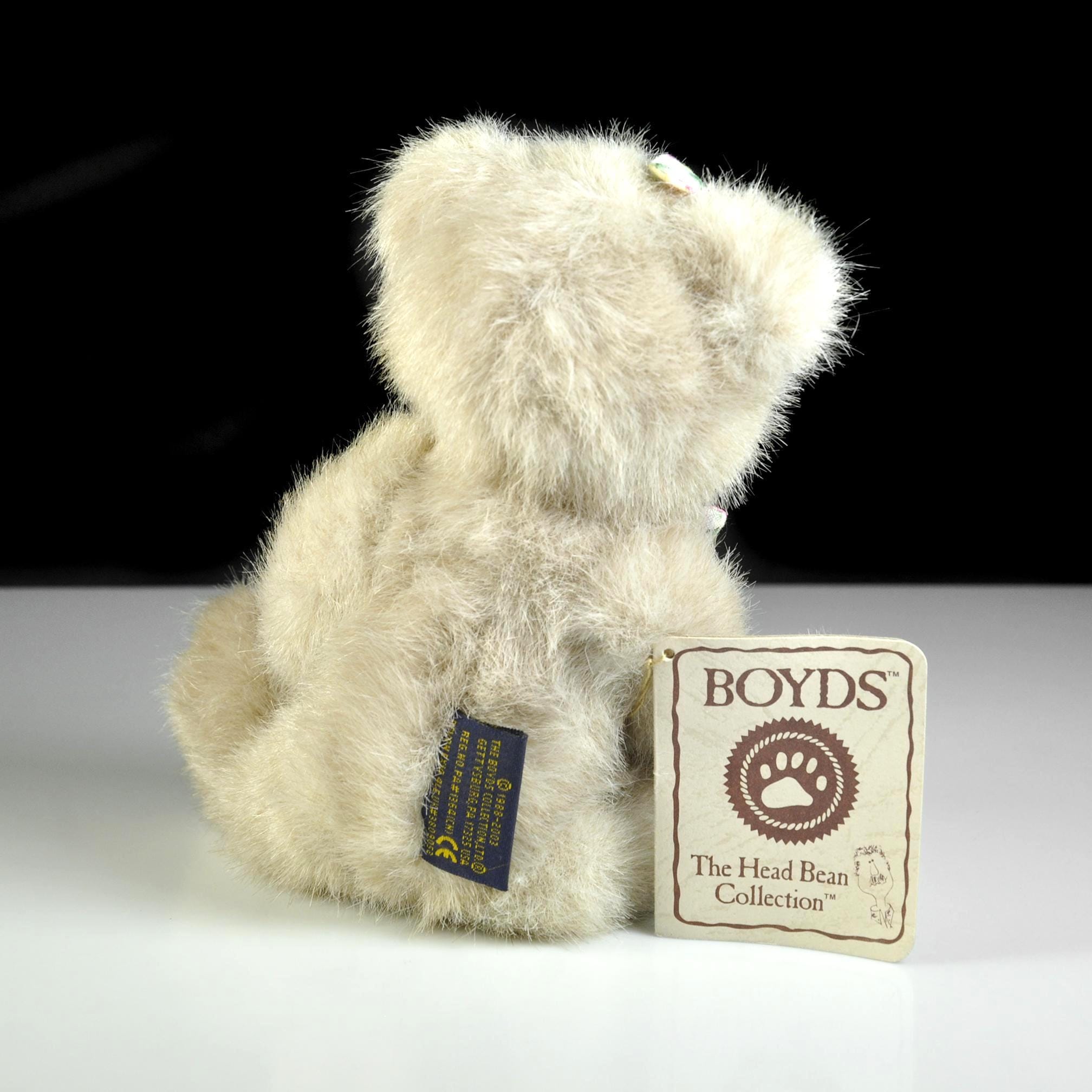 There’s a sweetness to these old Boyds Bears that you just don’t find anymore. This little one — Mia Goodfriends — still holds tight to her tiny pillow stitched with the words “Friends Are Flowers That Never Fade Away.” She’s the sort of bear that was made to sit on a shelf, or on someone’s nightstand, and remind them that they matter. Mia is part of Boyds’ Head Bean Collection, the smaller, softer bears that always seemed to be in the middle of a thoughtful moment. She has soft, pale fur, a floral bow tucked by her ear, and that button-flower pillow that gives her so much charm. No rips, no stains, no repairs — she’s been well-cared-for and it shows. Even her hang tag is still attached, which doesn’t happen often with bears this age. If you like pieces with a bit of heart and a bit of history, she’s ready for her next home.