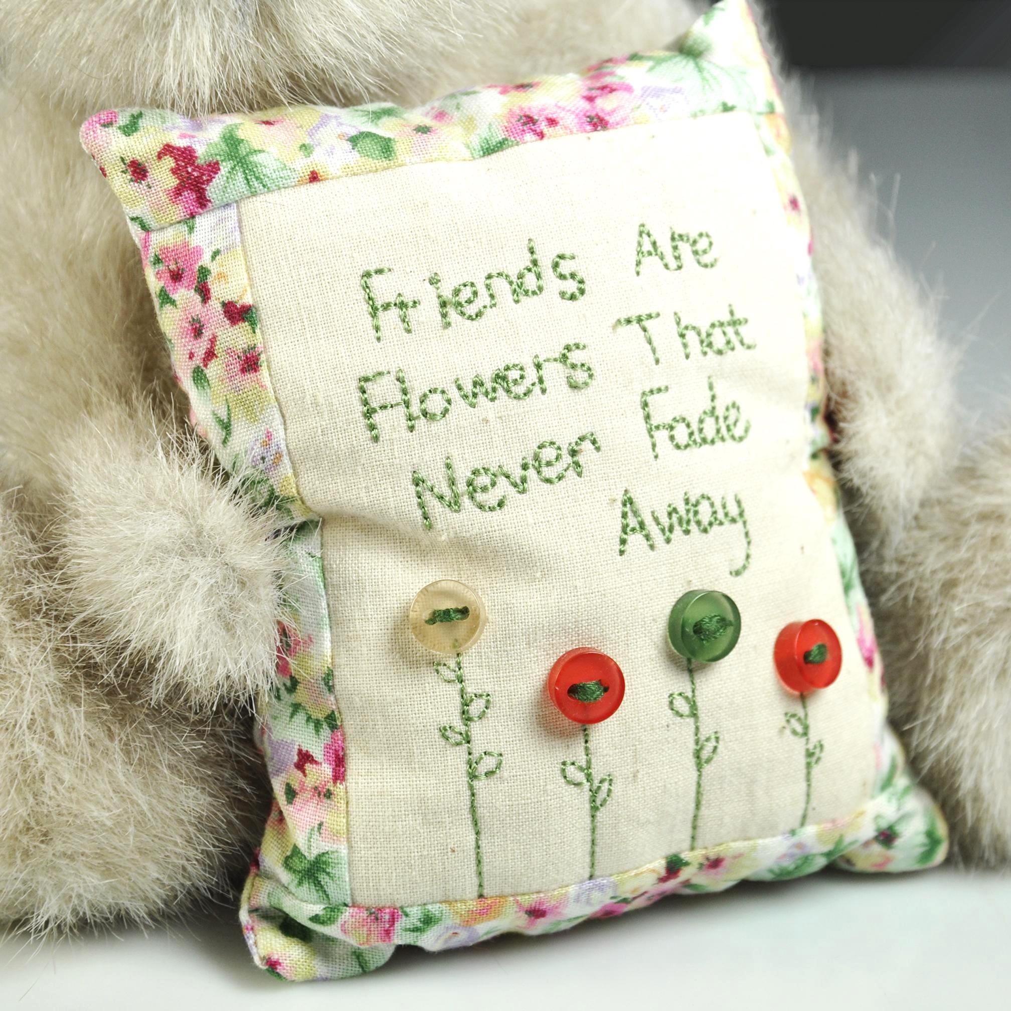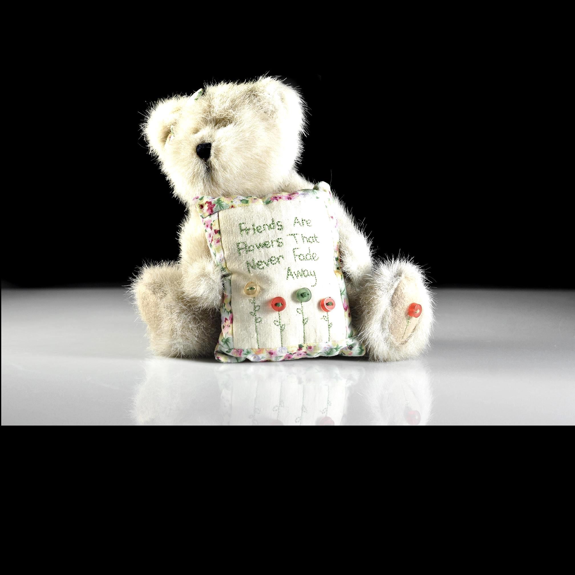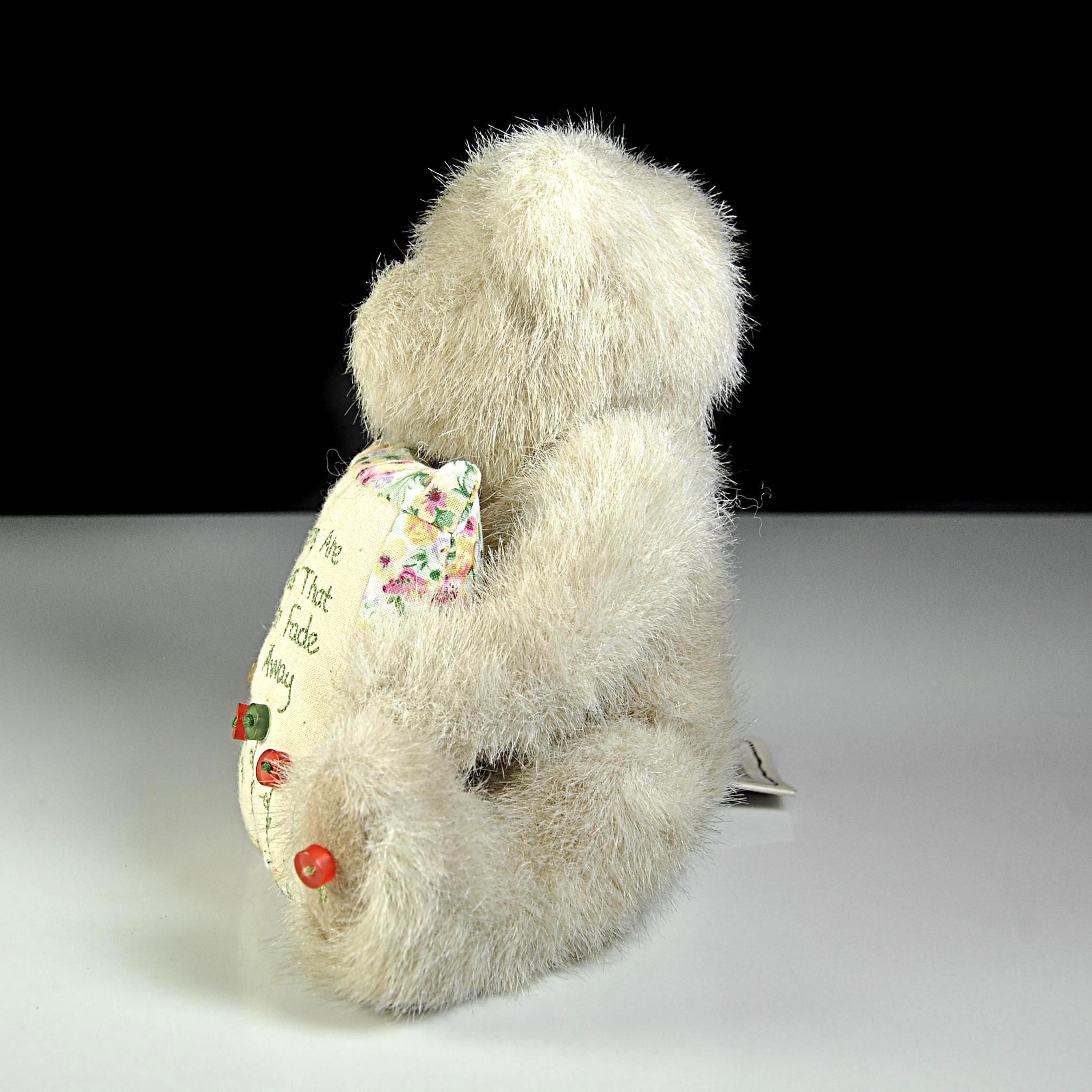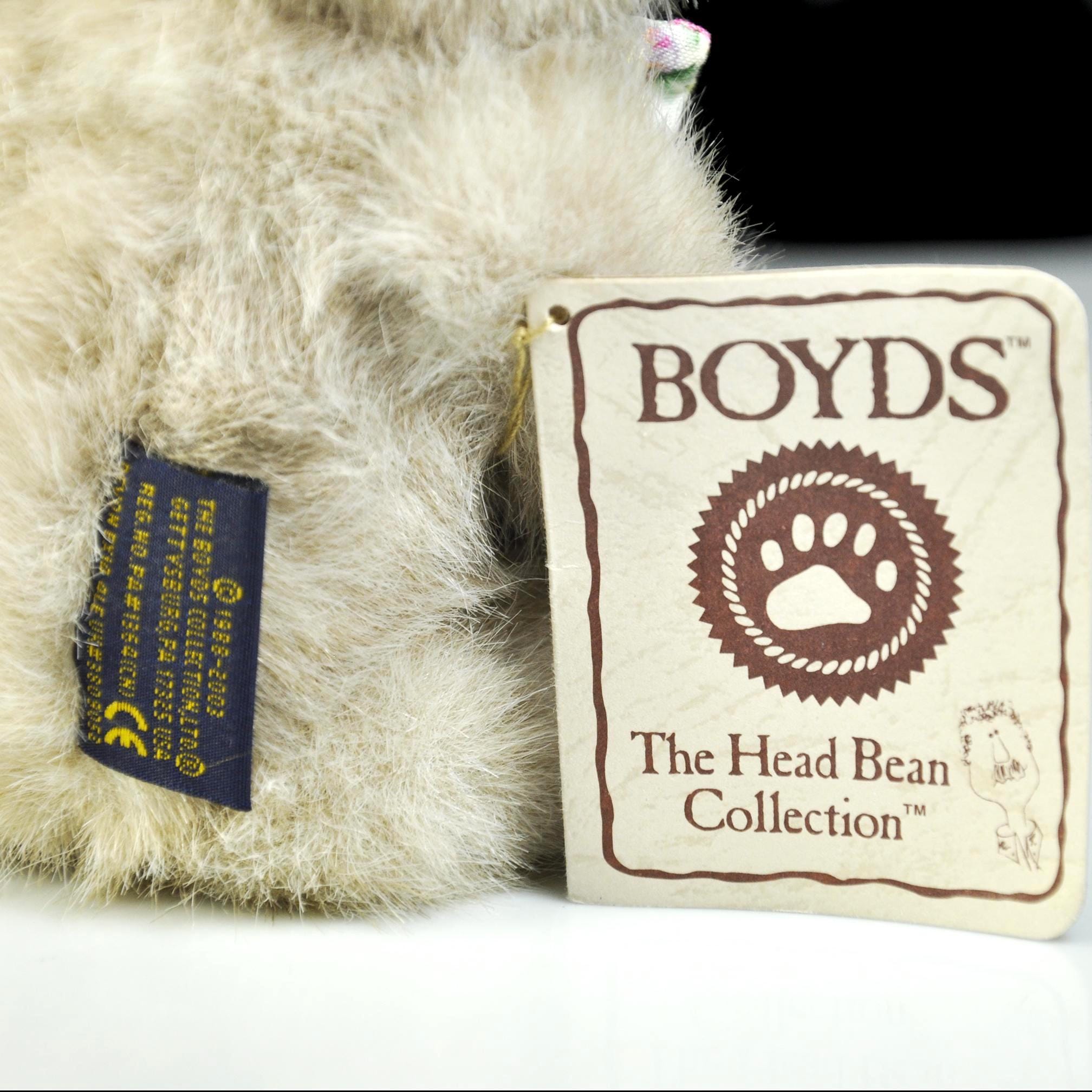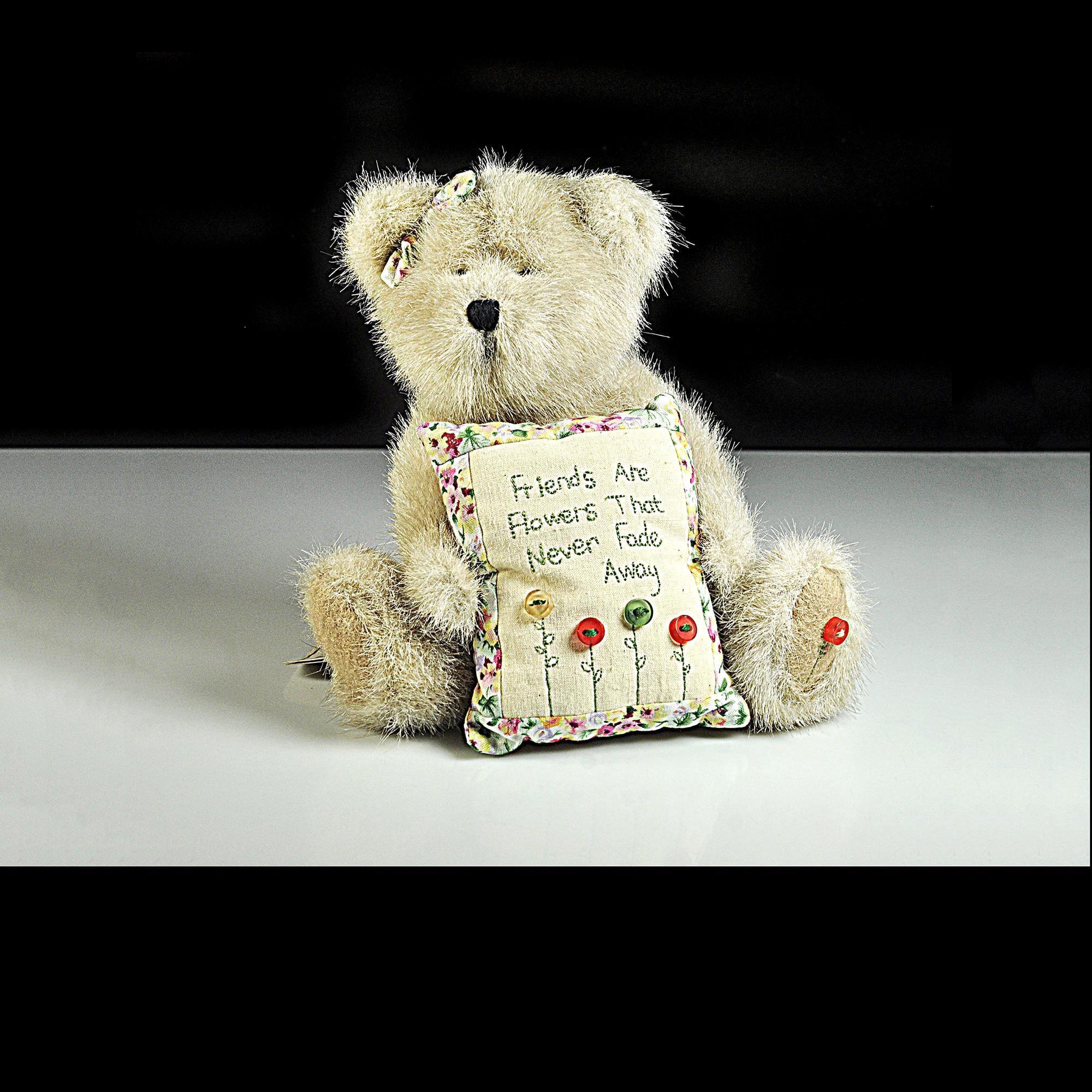 There’s a sweetness to these old Boyds Bears that you just don’t find anymore. This little one — Mia Goodfriends — still holds tight to her tiny pillow stitched with the words “Friends Are Flowers That Never Fade Away.” She’s the sort of bear that was made to sit on a shelf, or on someone’s nightstand, and remind them that they matter. Mia is part of Boyds’ Head Bean Collection, the smaller, softer bears that always seemed to be in the middle of a thoughtful moment. She has soft, pale fur, a floral bow tucked by her ear, and that button-flower pillow that gives her so much charm. No rips, no stains, no repairs — she’s been well-cared-for and it shows. Even her hang tag is still attached, which doesn’t happen often with bears this age. If you like pieces with a bit of heart and a bit of history, she’s ready for her next home.