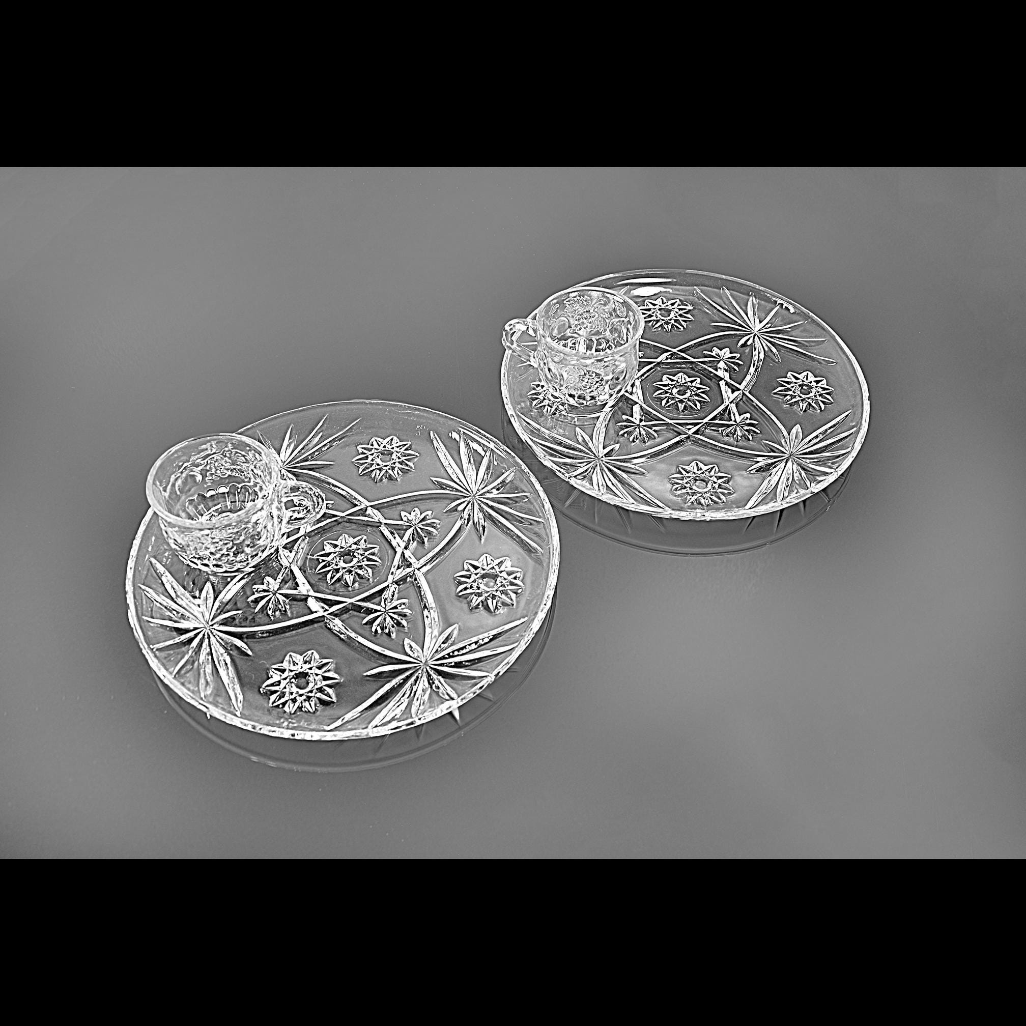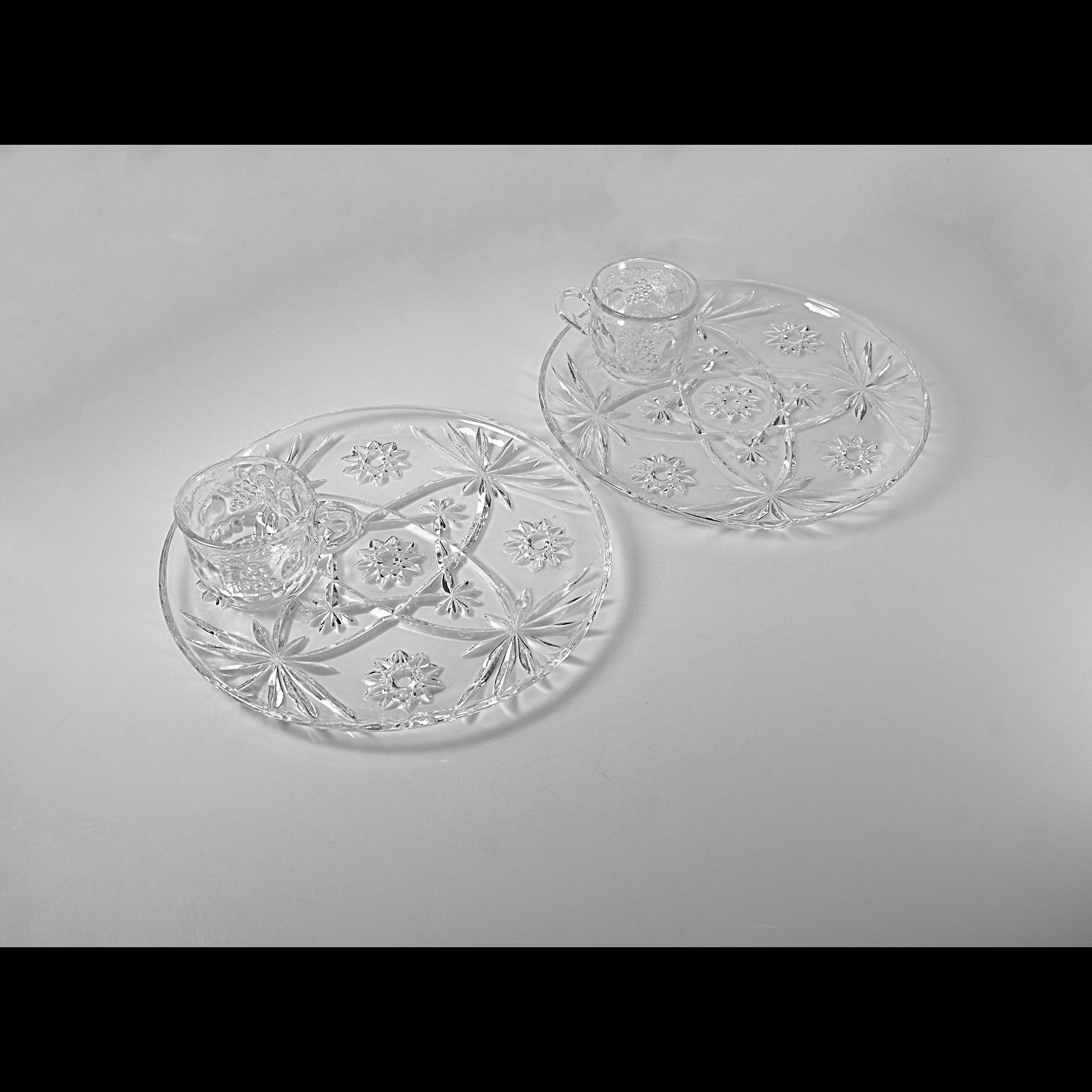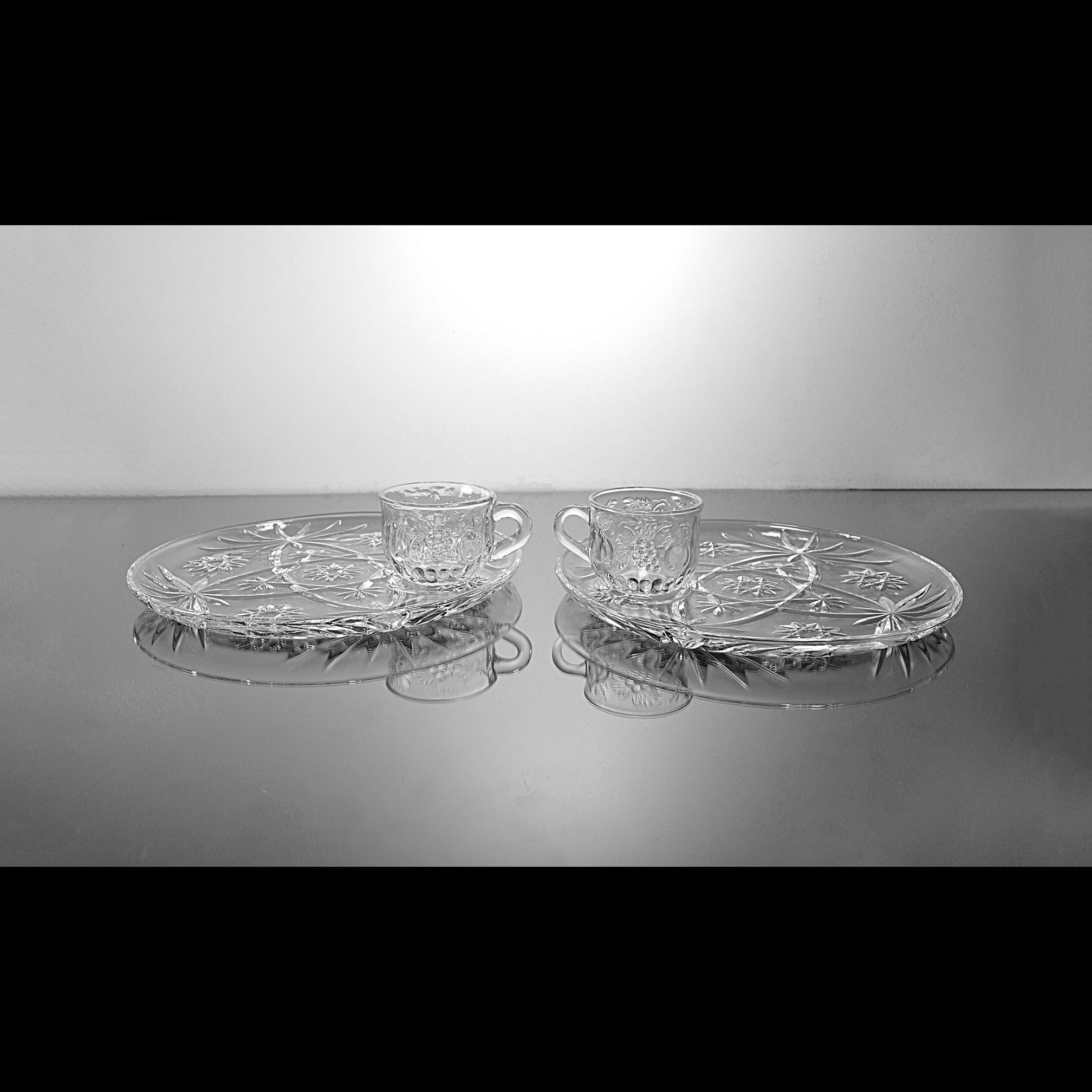 These snack sets are mismatched but still full of charm. The round trays are Anchor Hocking’s Prescut clear pattern, the one with the bold starbursts that catch every bit of light. The cups, on the other hand, are Jeannette Glass in their Fruit Clear pattern, made with raised pears and grapes worked right into the glass. They weren’t born together, but they sit together just fine. Both patterns date to the 1960s, back when snack sets were the thing to bring out for card nights, showers, or just a visit from the neighbor. This pair still has that same friendly feel to it. If you enjoy old glass that’s bright, sturdy, and ready for use, these will fit right in.