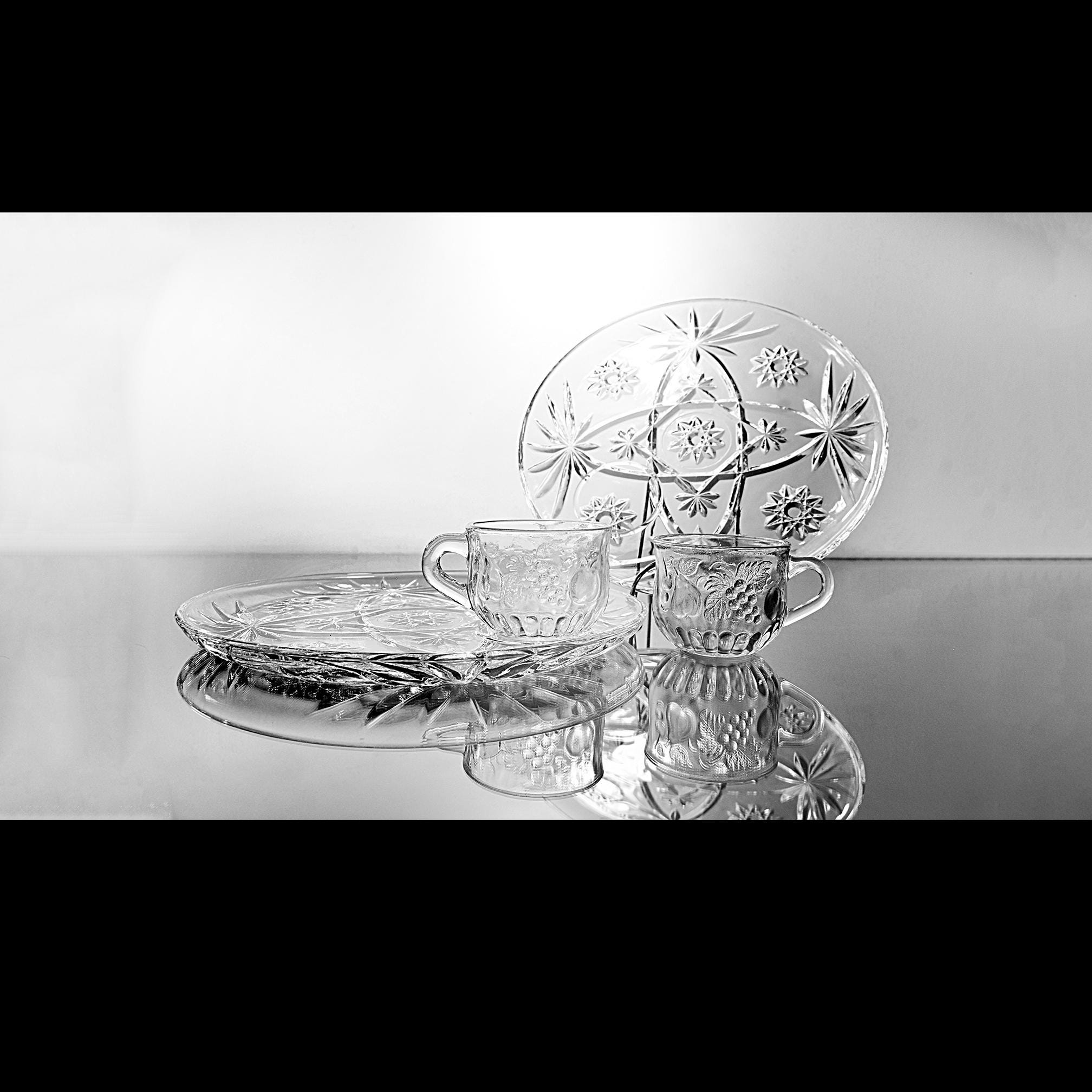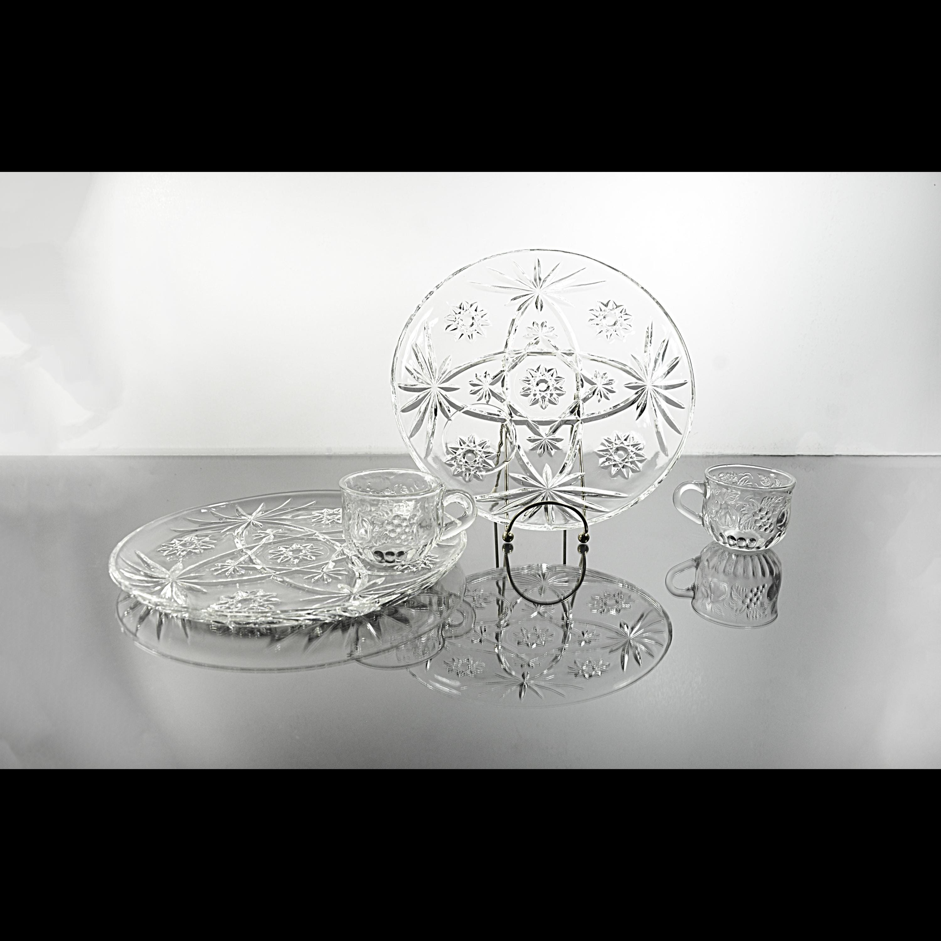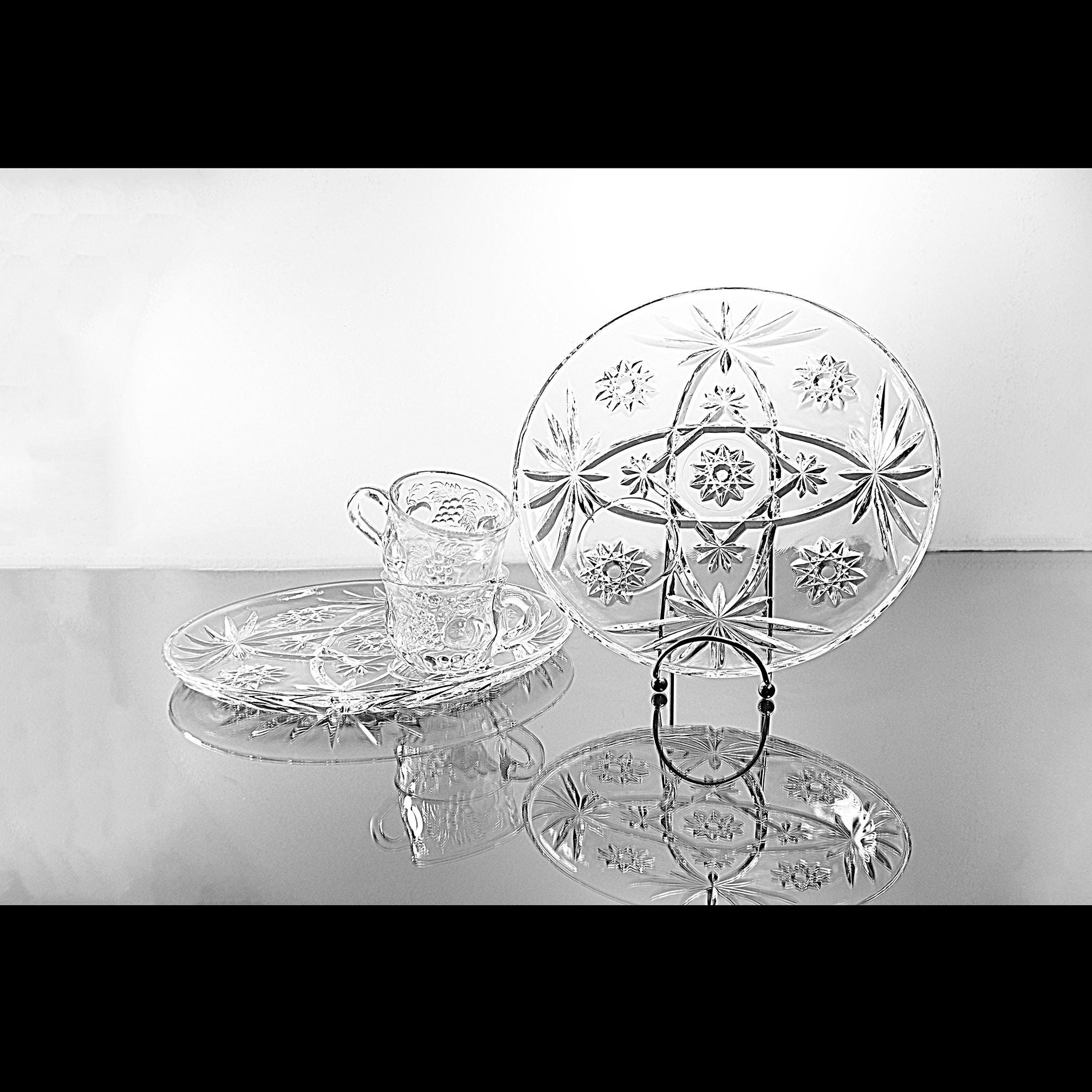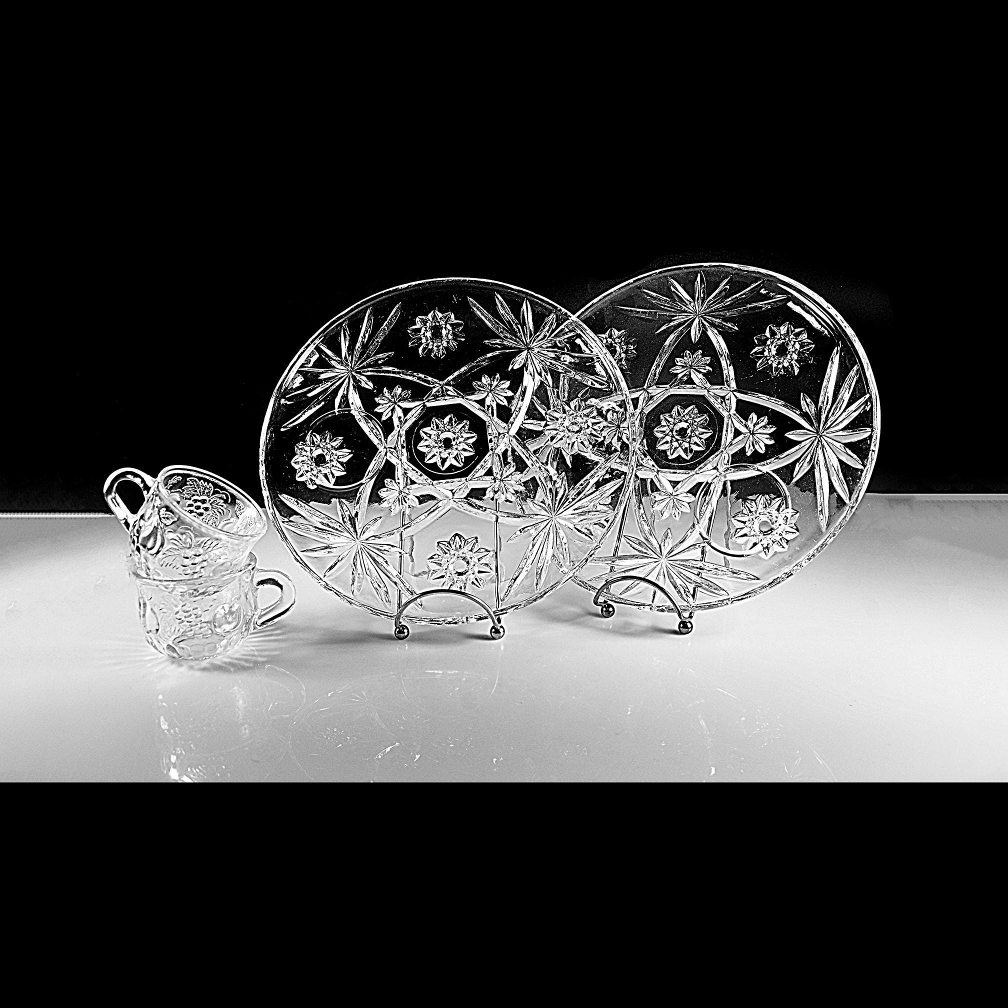 These snack sets are mismatched but still full of charm. The round trays are Anchor Hocking’s Prescut clear pattern, the one with the bold starbursts that catch every bit of light. The cups, on the other hand, are Jeannette Glass in their Fruit Clear pattern, made with raised pears and grapes worked right into the glass. They weren’t born together, but they sit together just fine. Both patterns date to the 1960s, back when snack sets were the thing to bring out for card nights, showers, or just a visit from the neighbor. This pair still has that same friendly feel to it. If you enjoy old glass that’s bright, sturdy, and ready for use, these will fit right in.