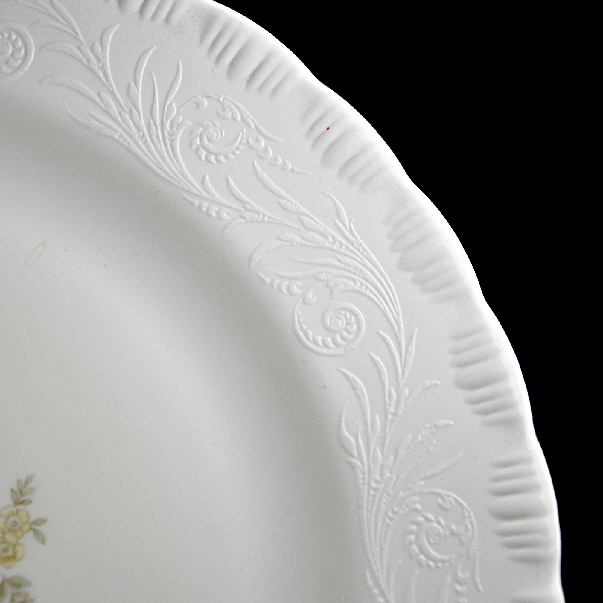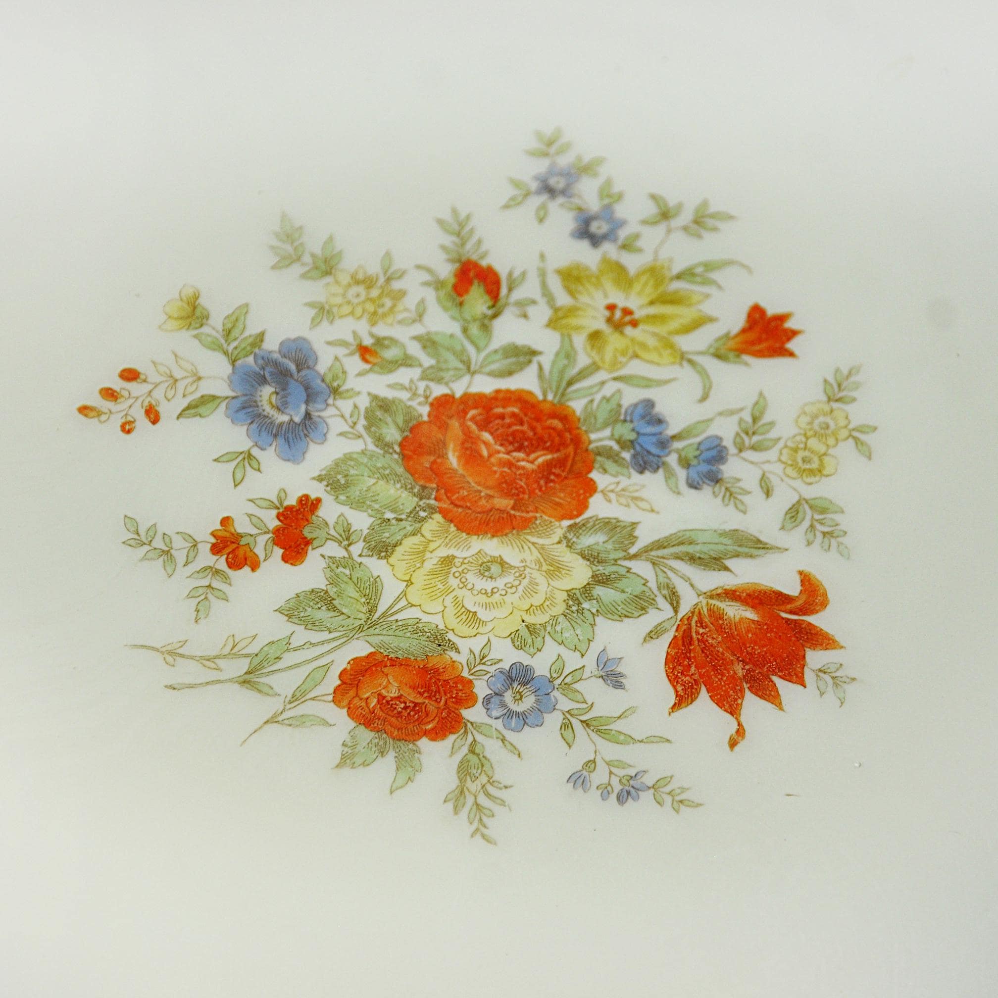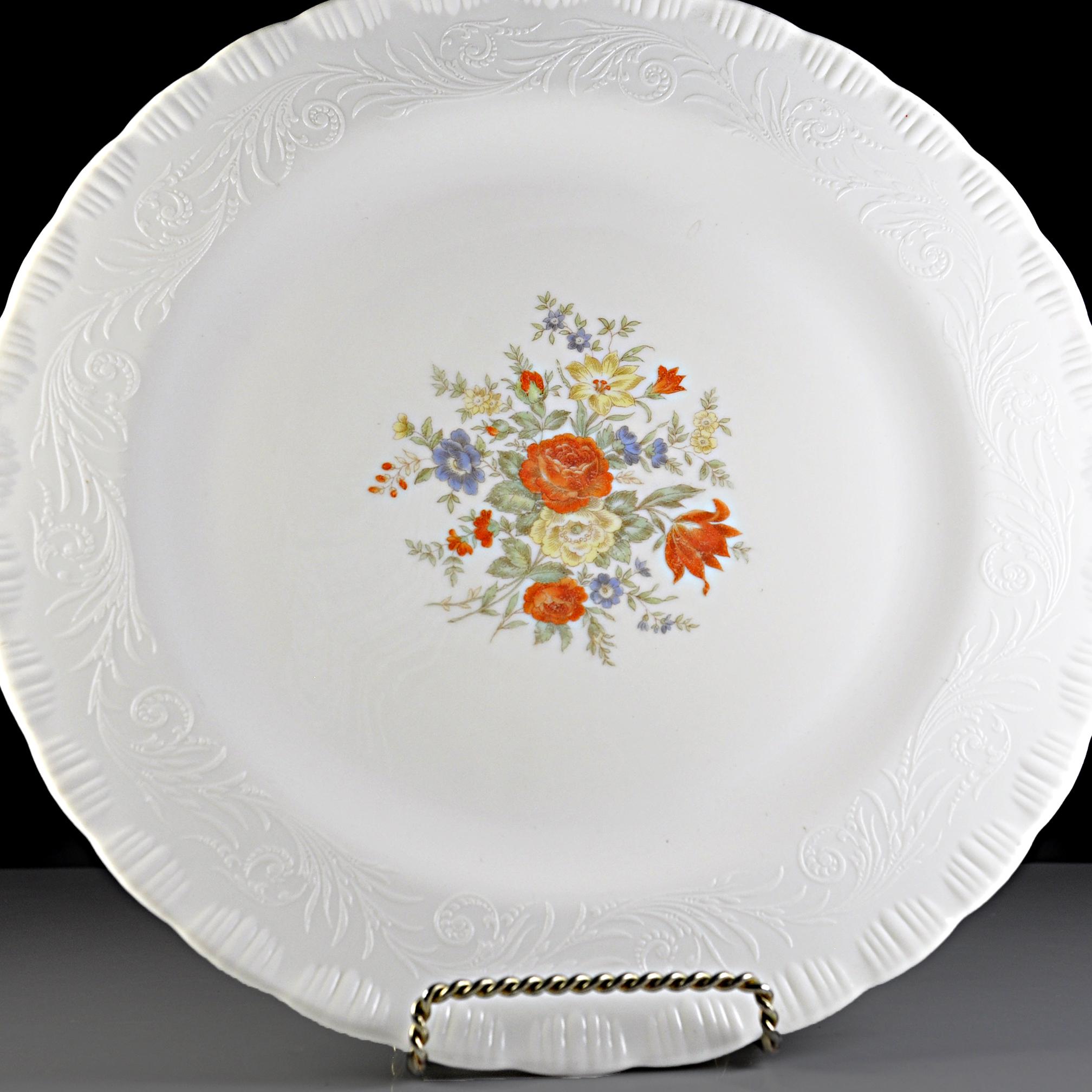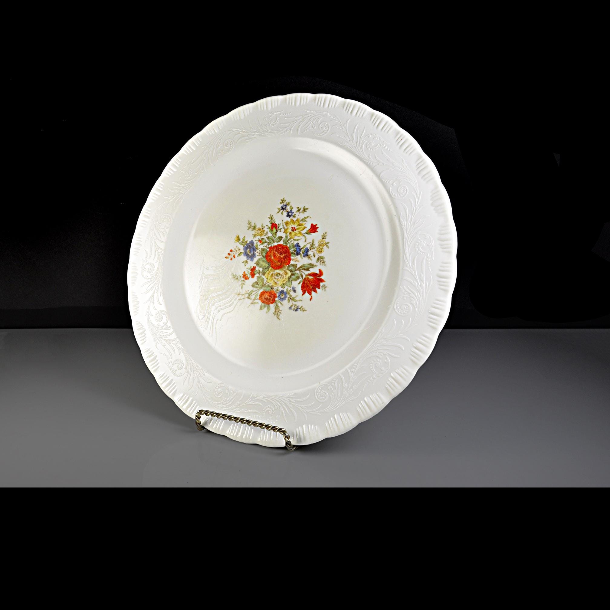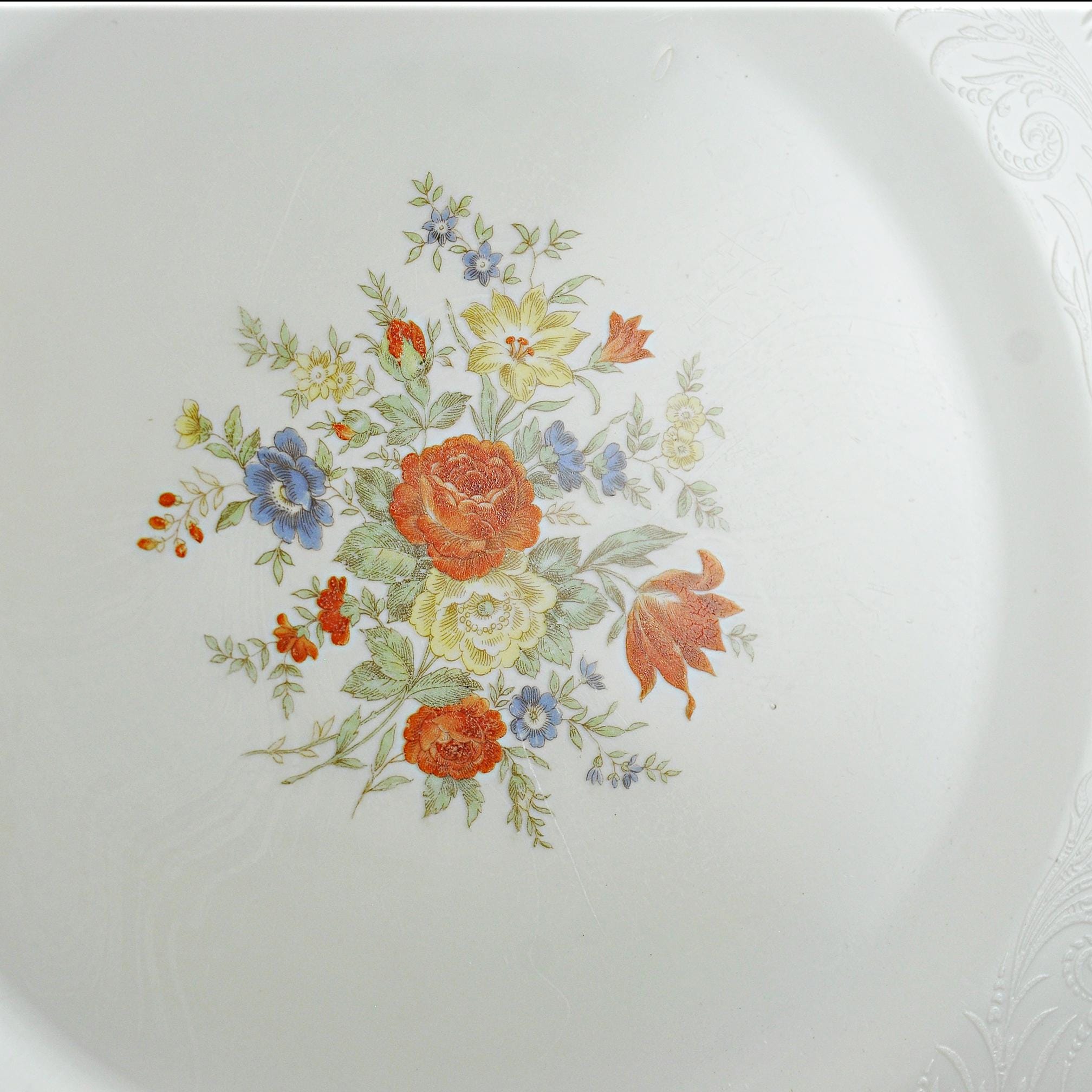 If you grew up in a home where the good serving plate only came out for holidays or Sunday dinners, this one will feel familiar the moment you hold it. This 12-inch chop plate was made by MacBeth-Evans sometime between 1938 and 1944, back when dishes were built to serve generations, not seasons. The pattern is called Classic Bouquet, a bright mix of red-orange roses, soft blue forget-me-nots, and pale yellow blossoms gathered together in the center. The rim is beautifully molded with a raised scroll design — the kind of detail that doesn’t ask for attention but still manages to get it. If you like vintage pieces that still carry the feeling of a well-kept kitchen, this one’s ready to come home.