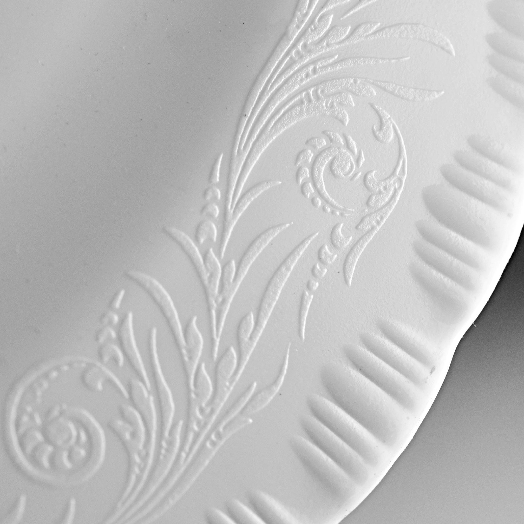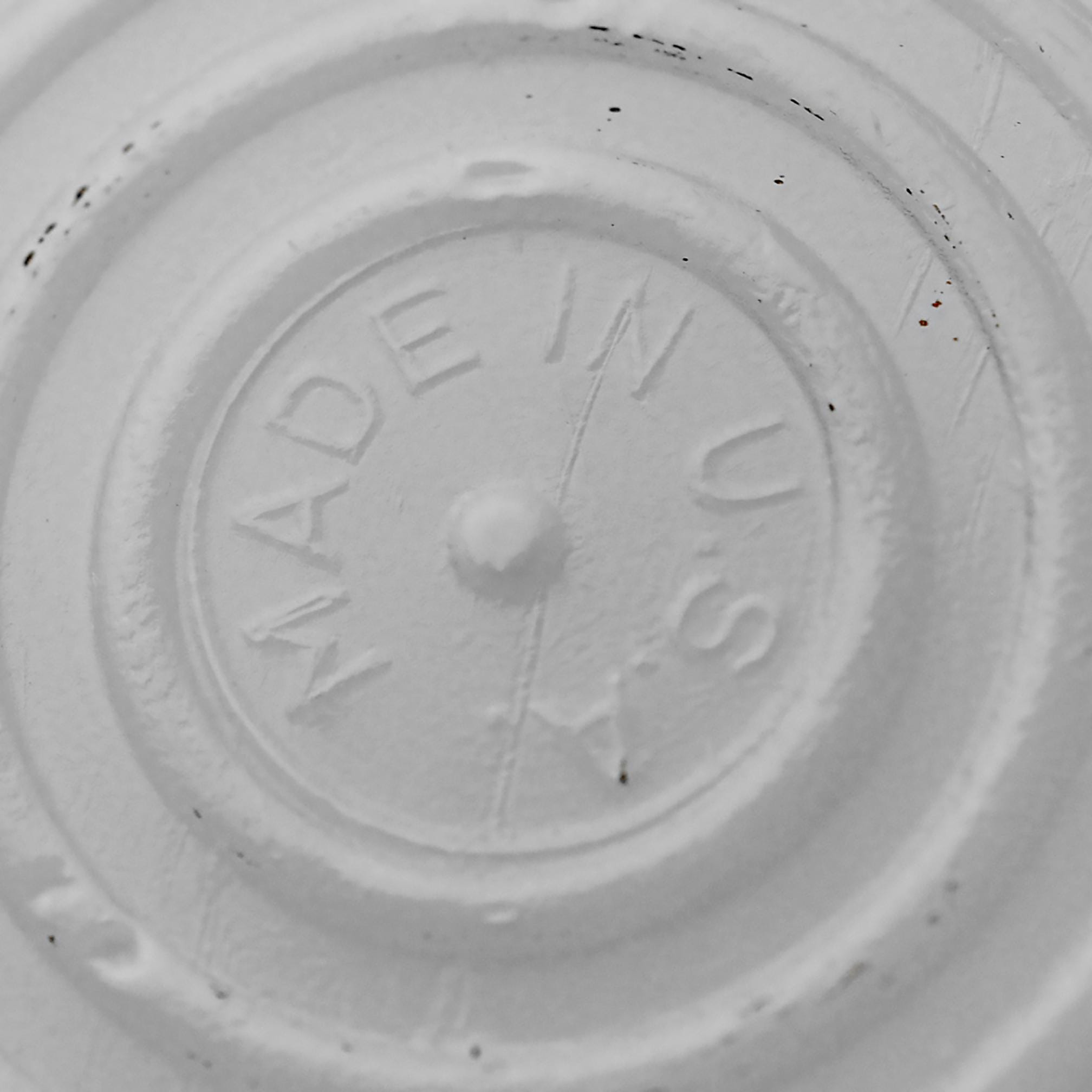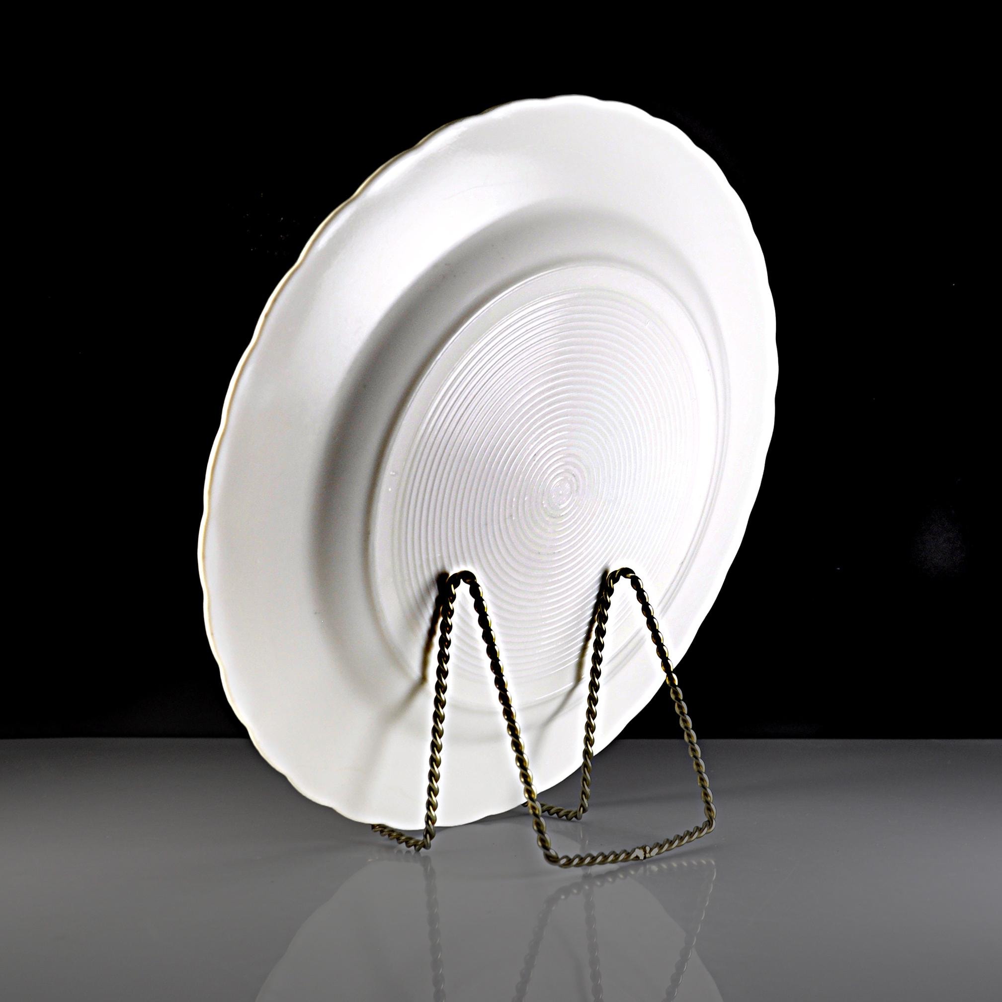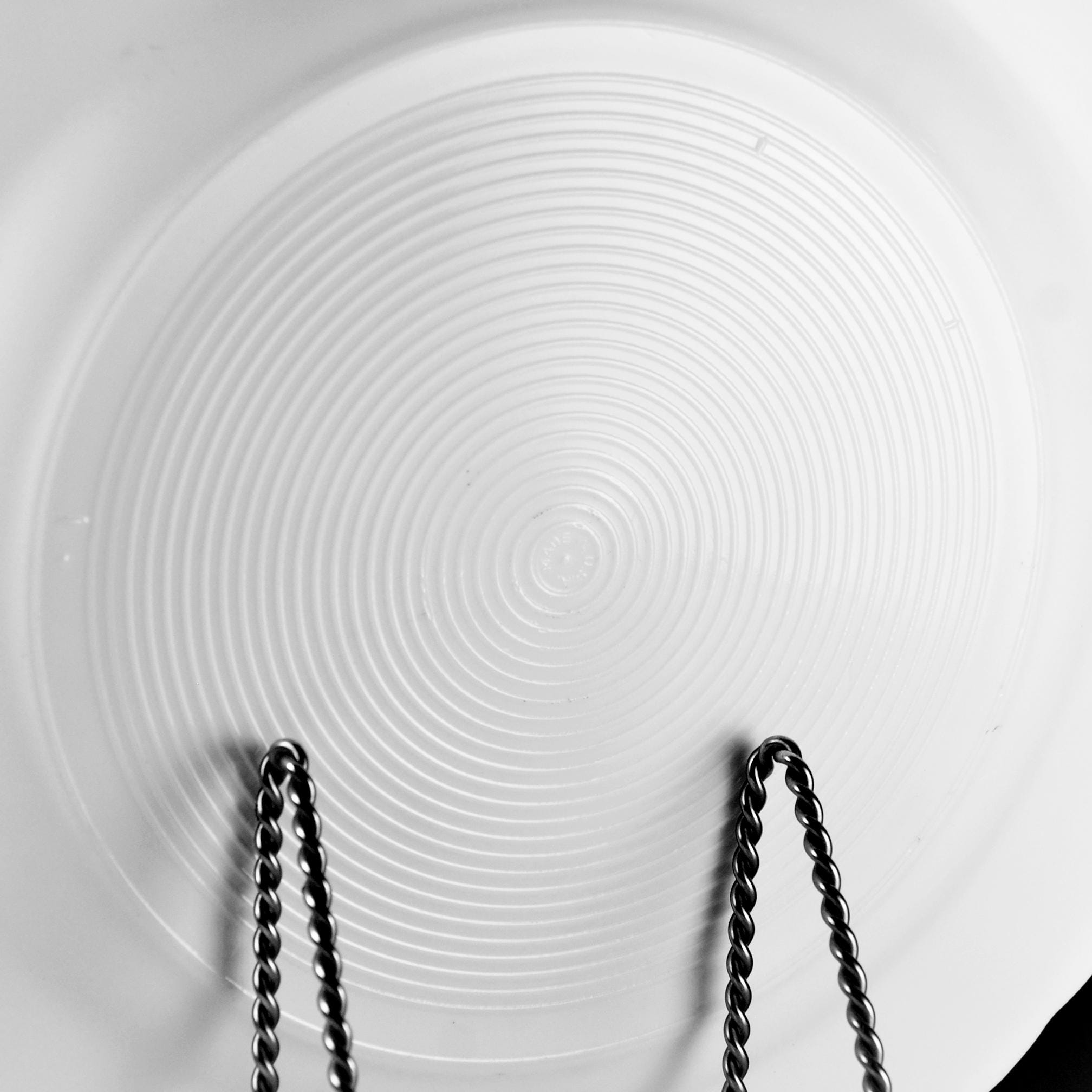 This piece is made of Chinex, a specialty glass made in the USA during the late ’30s and early ’40s. Chinex is a type of milk glass, but heavier, stronger, and more durable than the milk glass most people are used to. It was created to be everyday-tough — the sort of plate that could handle a Sunday roast one week and a birthday cake the next without showing much wear.