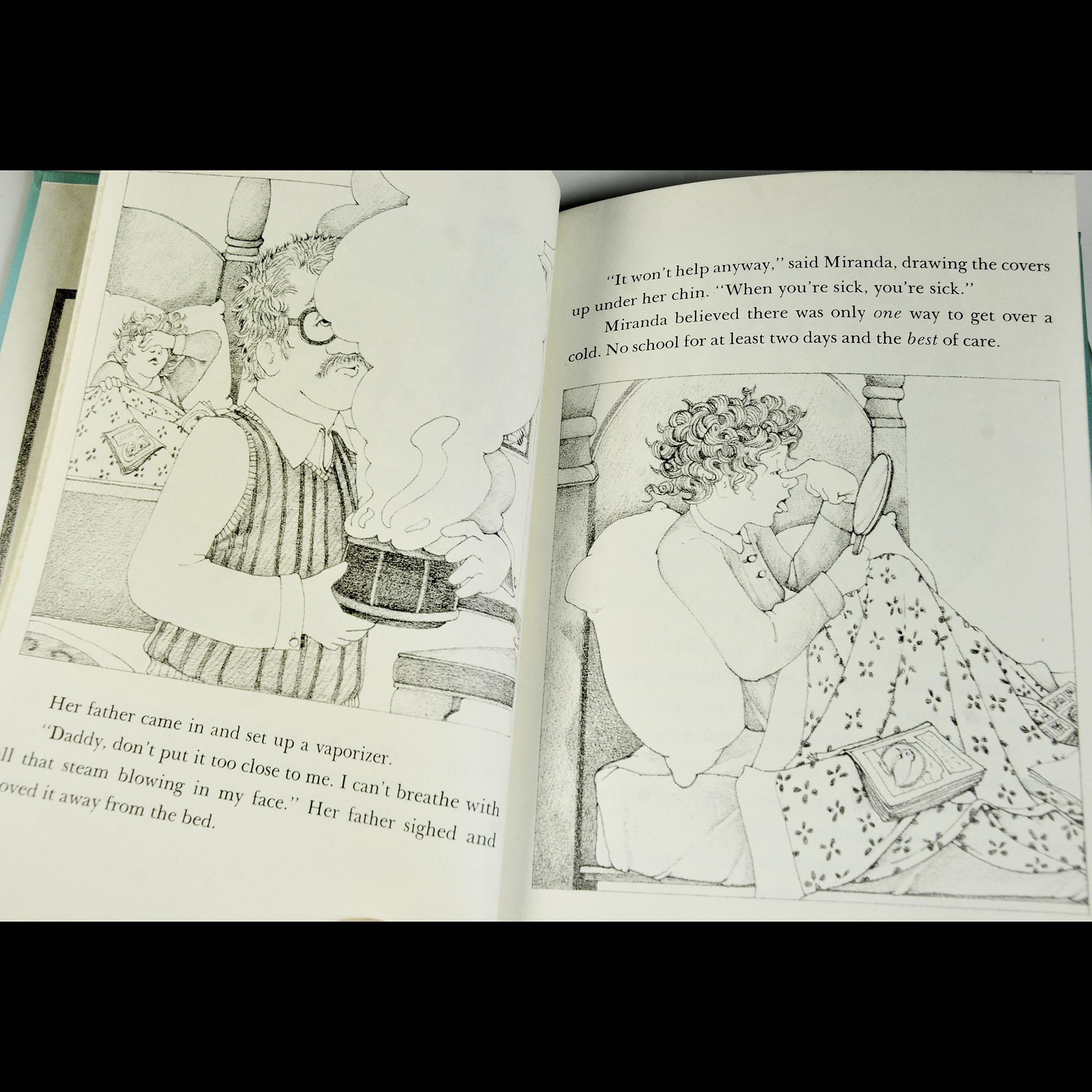 The story follows a girl named Miranda, who wakes up with that familiar tickle in her nose. Before long she’s battling the sniffles, trying to get through the day with half a clogged nose and all the misery that comes with a cold. The whole thing is told with gentle humor, and John Wallner’s black-and-white drawings catch every little expression — the kind of illustrations children’s books used to have before everything went glossy and loud.