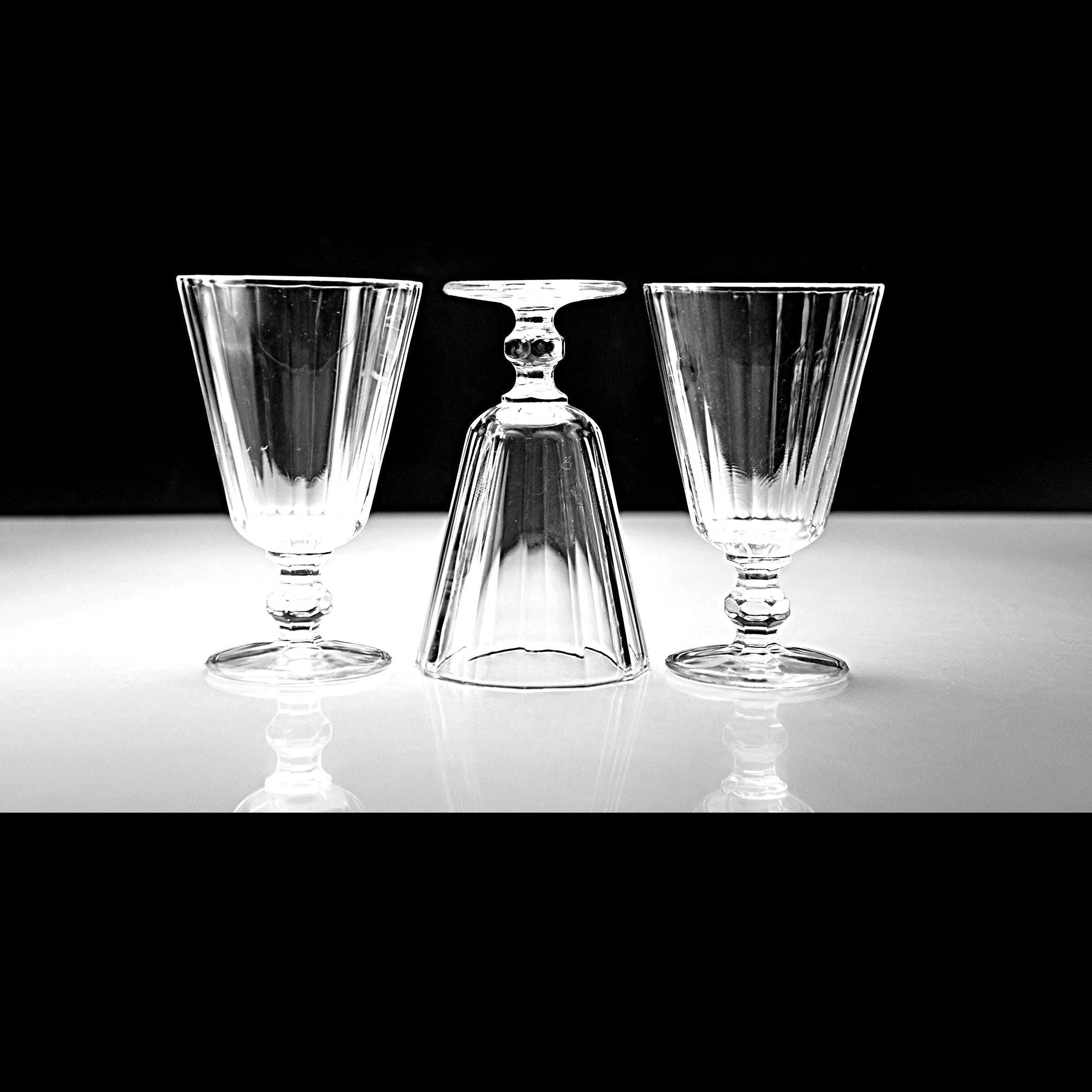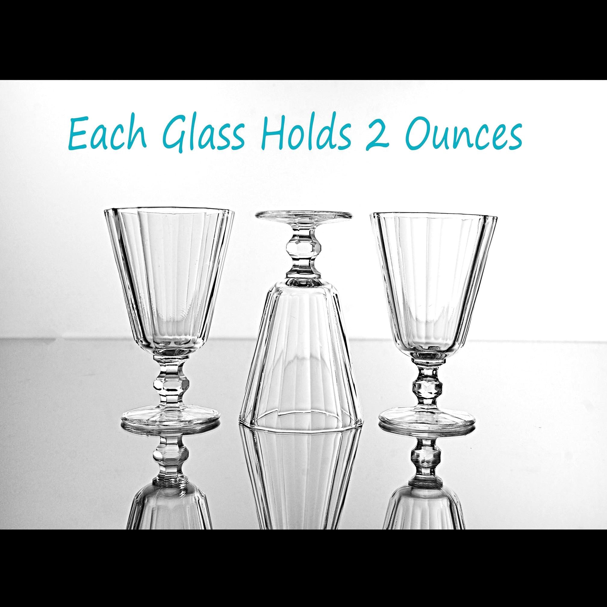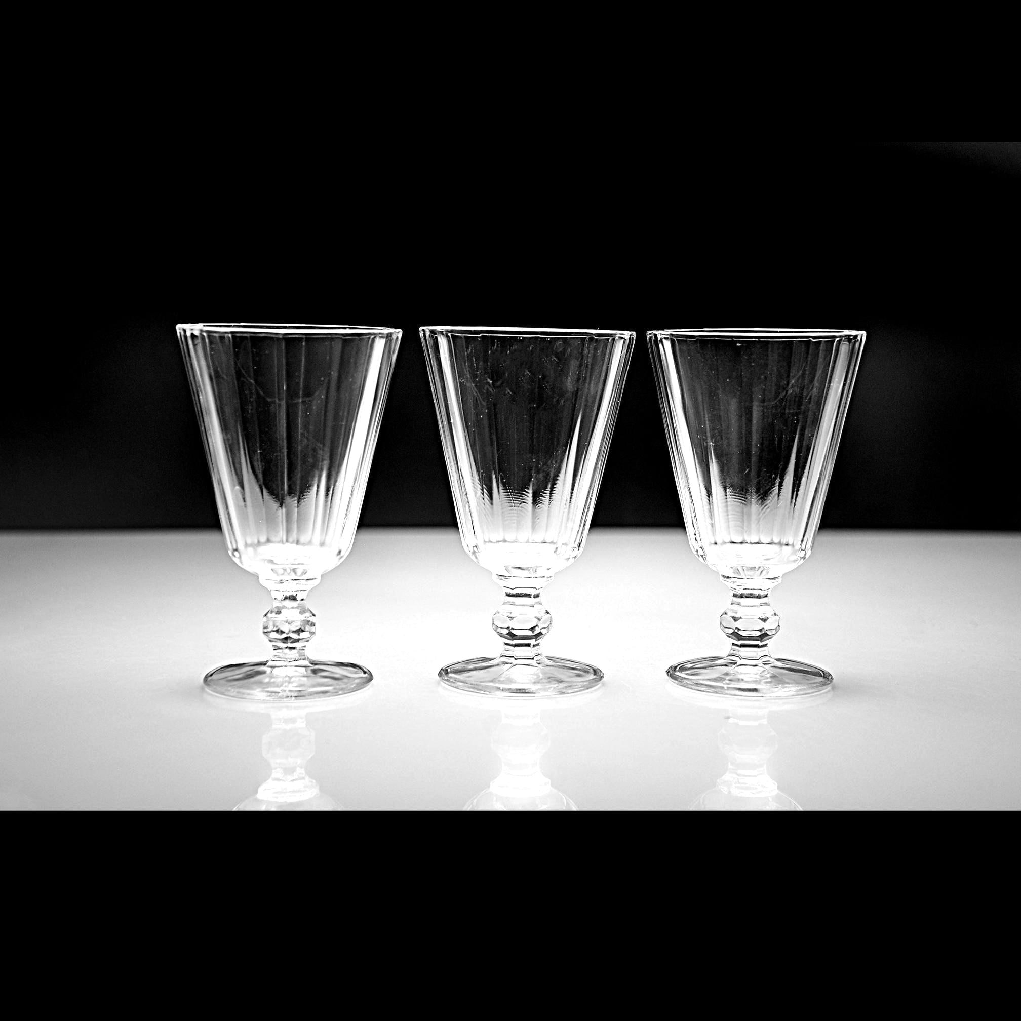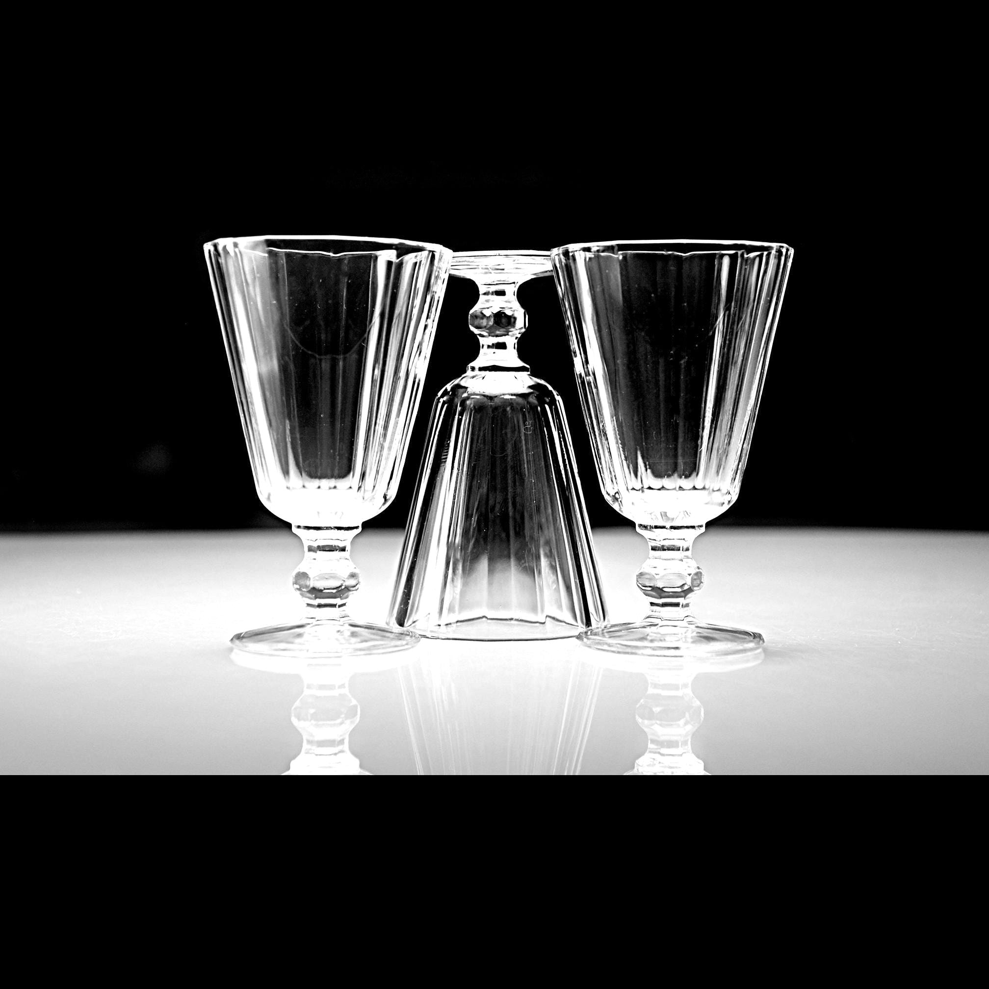 These little cordials have that classic paneled look that never really went out of style. They’re small and sturdy, meant for an after-dinner sip of something good. Each one is made of clear pressed glass with vertical panels and a short, faceted stem that feels nice in the hand. Sets like this were made by several American glass companies between the 1930s and 1950s, and they were used for cordials, dessert wines, or that little splash of something at the end of a meal. They display beautifully and make a handy addition to a home bar, especially if you enjoy serving liqueurs or aperitifs the old-fashioned way.