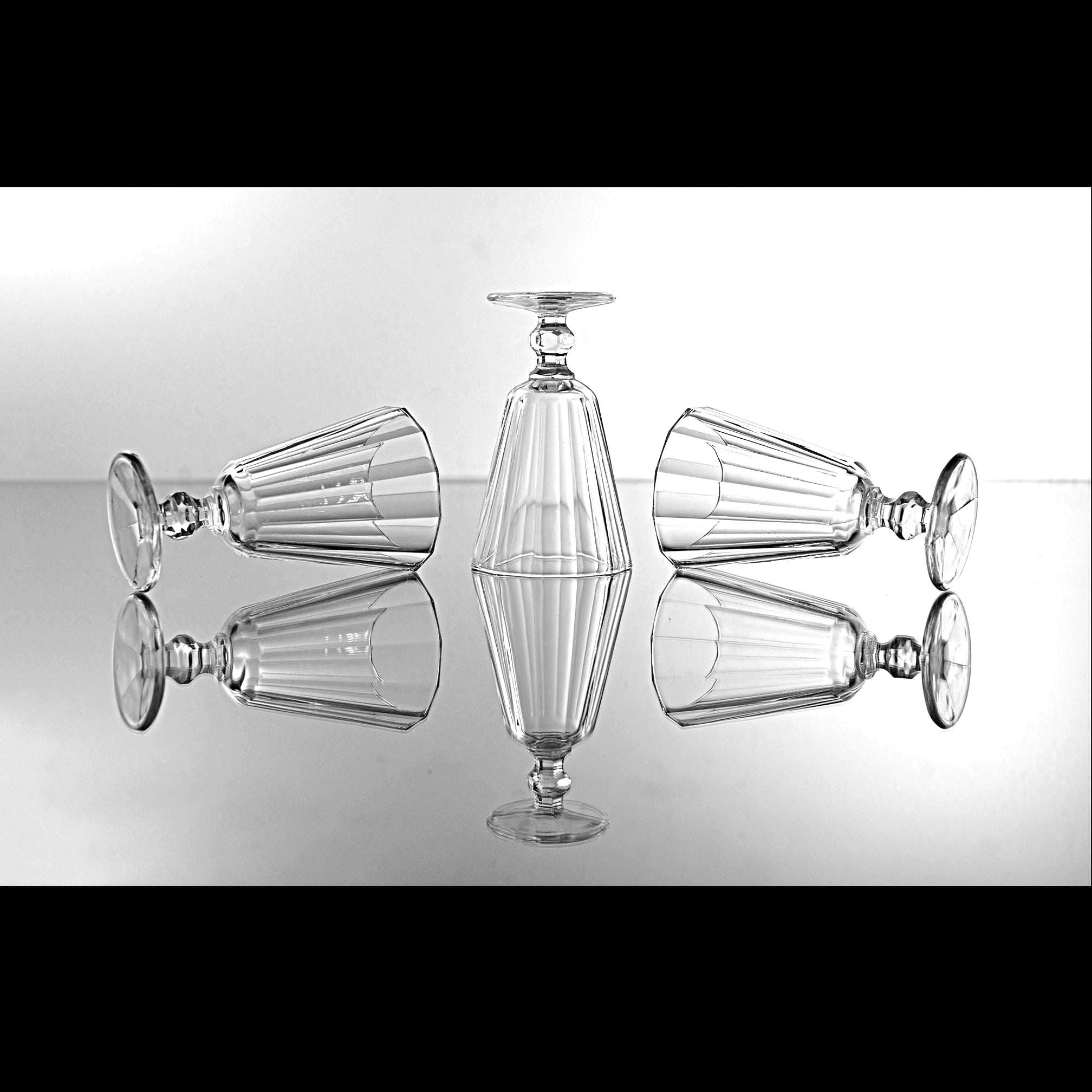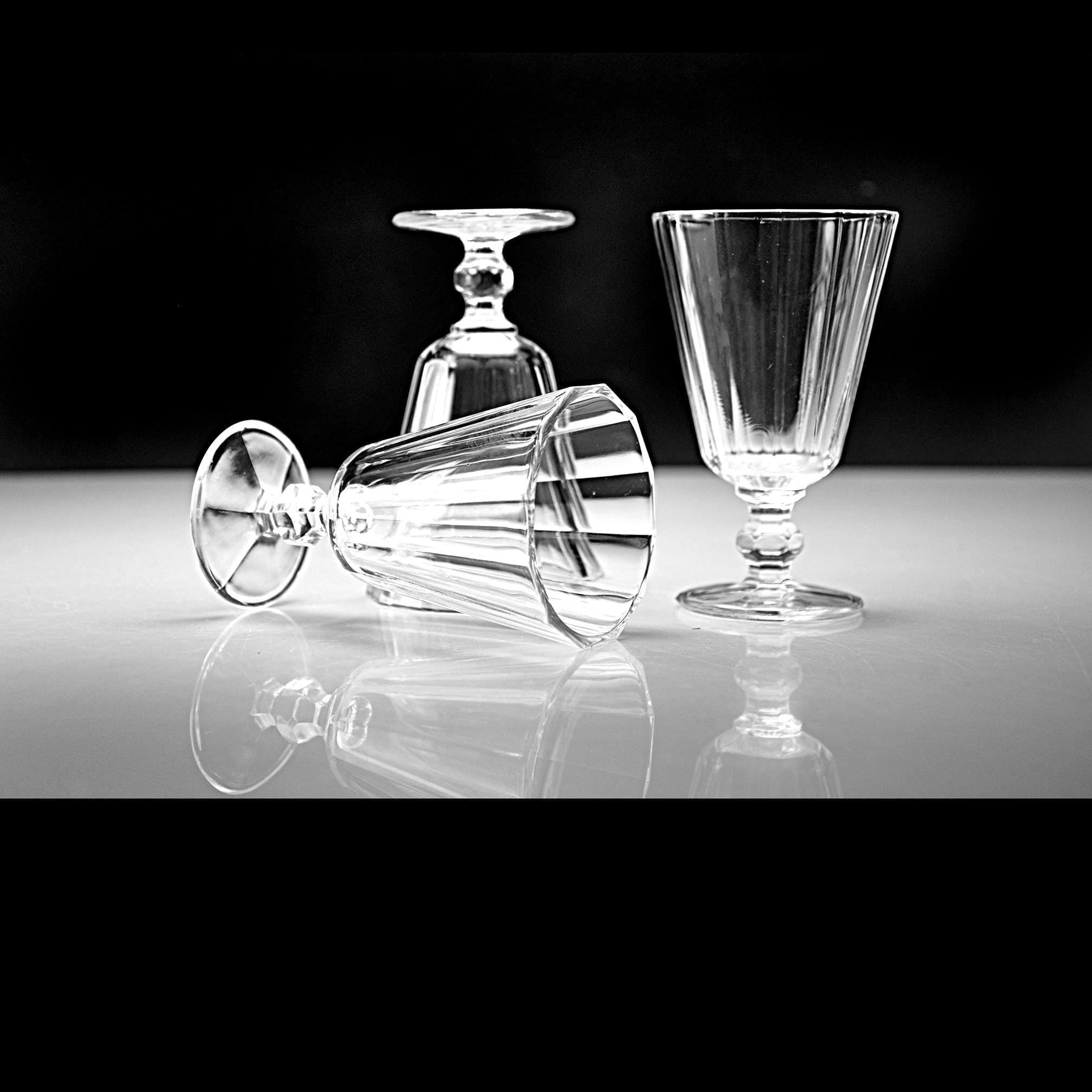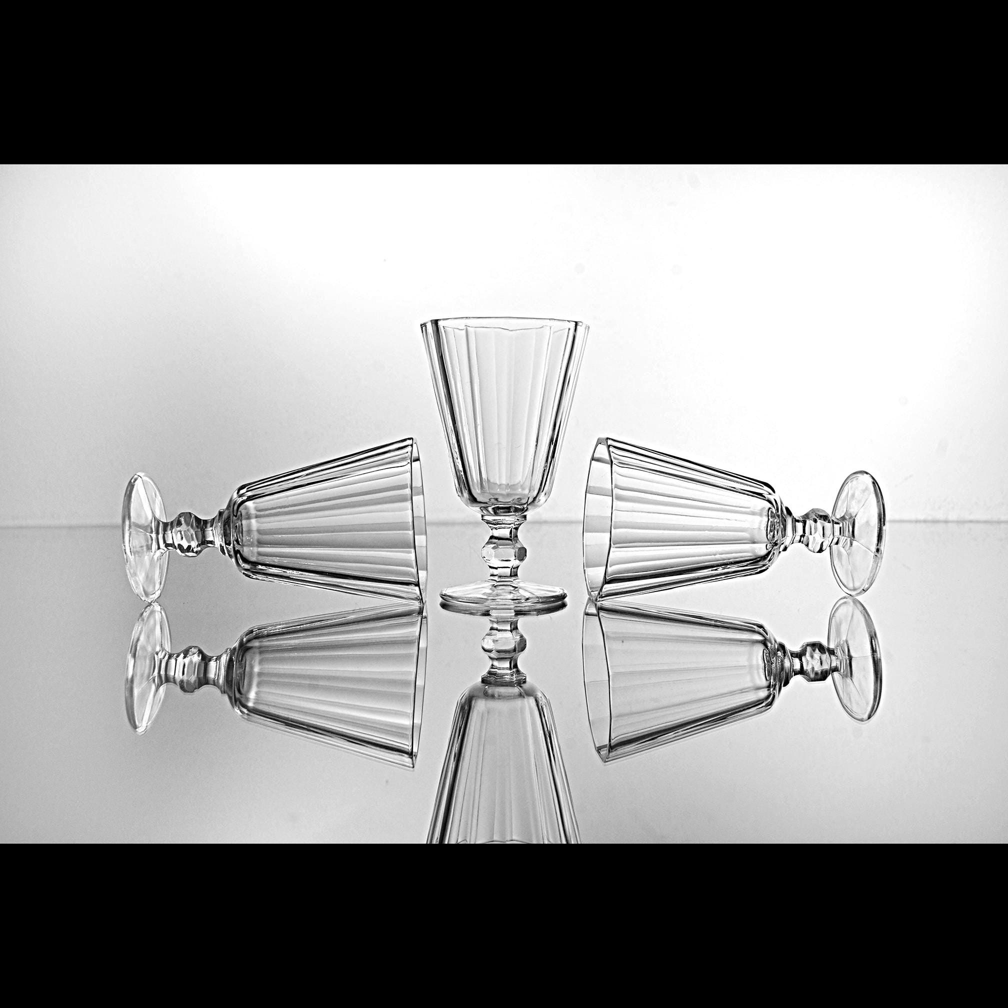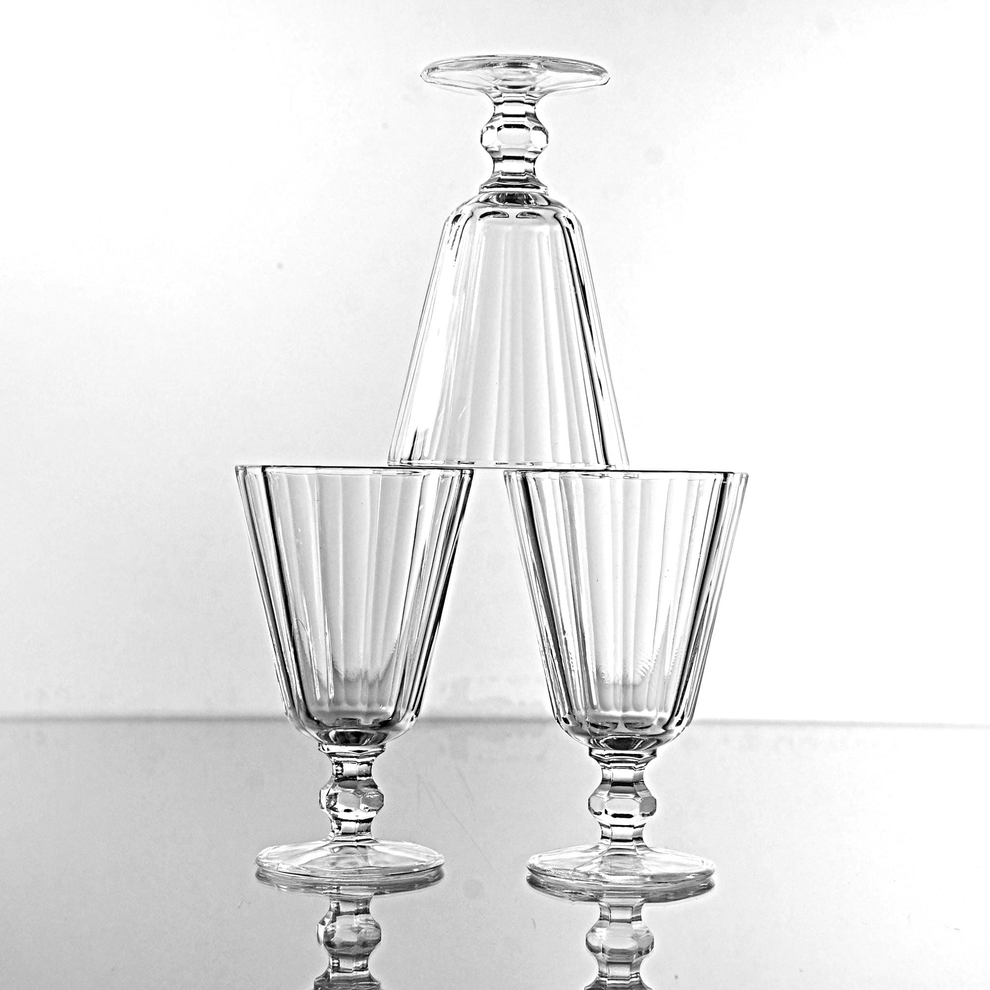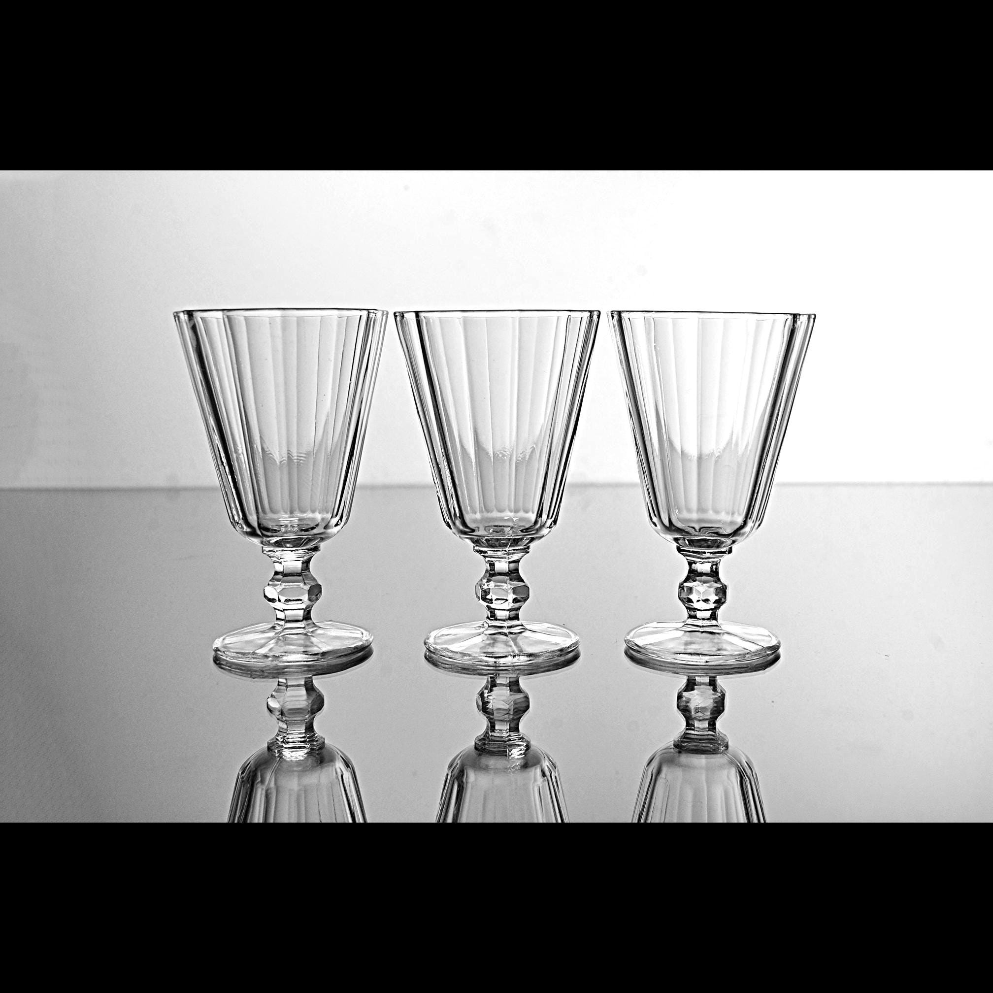 These little cordials have that classic paneled look that never really went out of style. They’re small and sturdy, meant for an after-dinner sip of something good. Each one is made of clear pressed glass with vertical panels and a short, faceted stem that feels nice in the hand. Sets like this were made by several American glass companies between the 1930s and 1950s, and they were used for cordials, dessert wines, or that little splash of something at the end of a meal. They display beautifully and make a handy addition to a home bar, especially if you enjoy serving liqueurs or aperitifs the old-fashioned way.