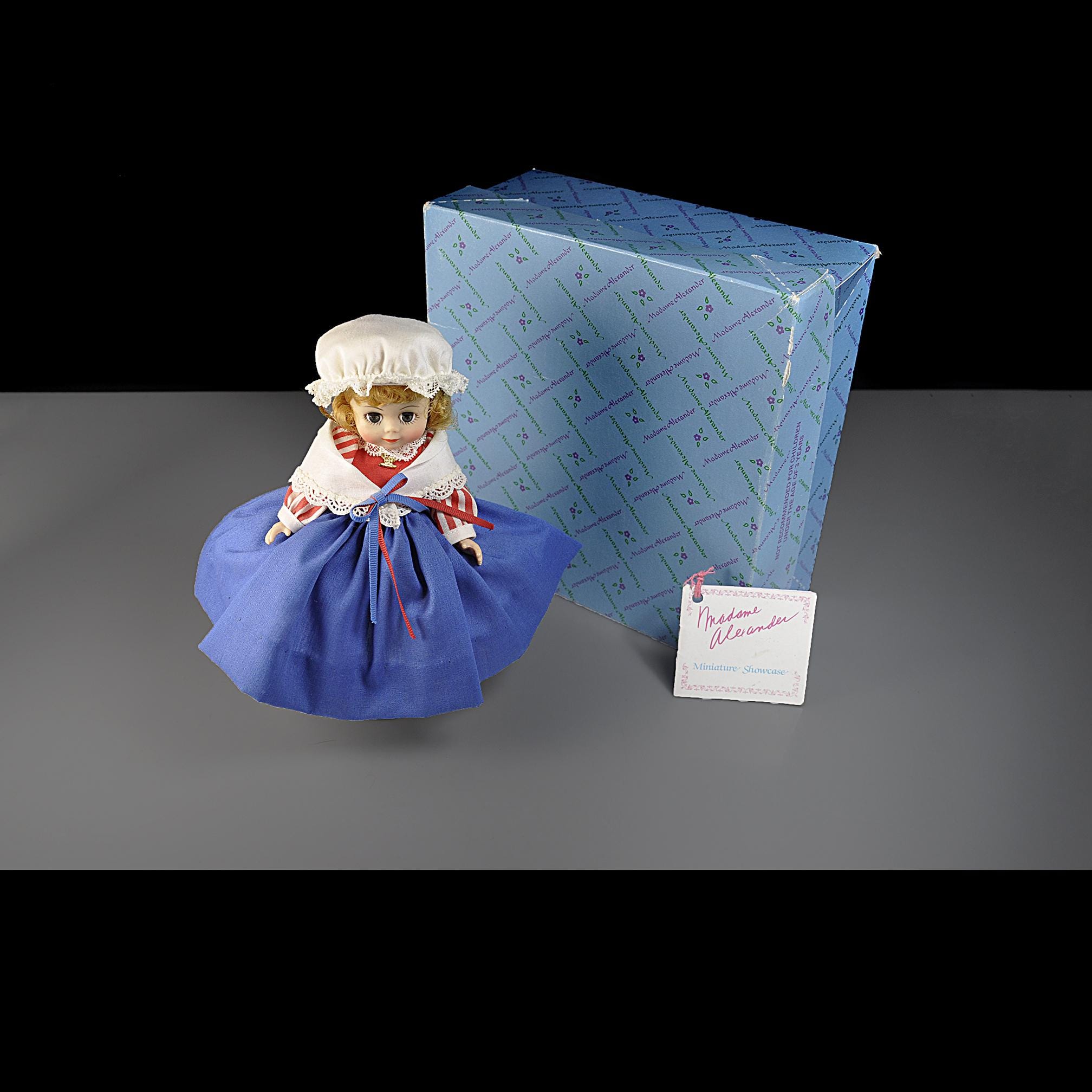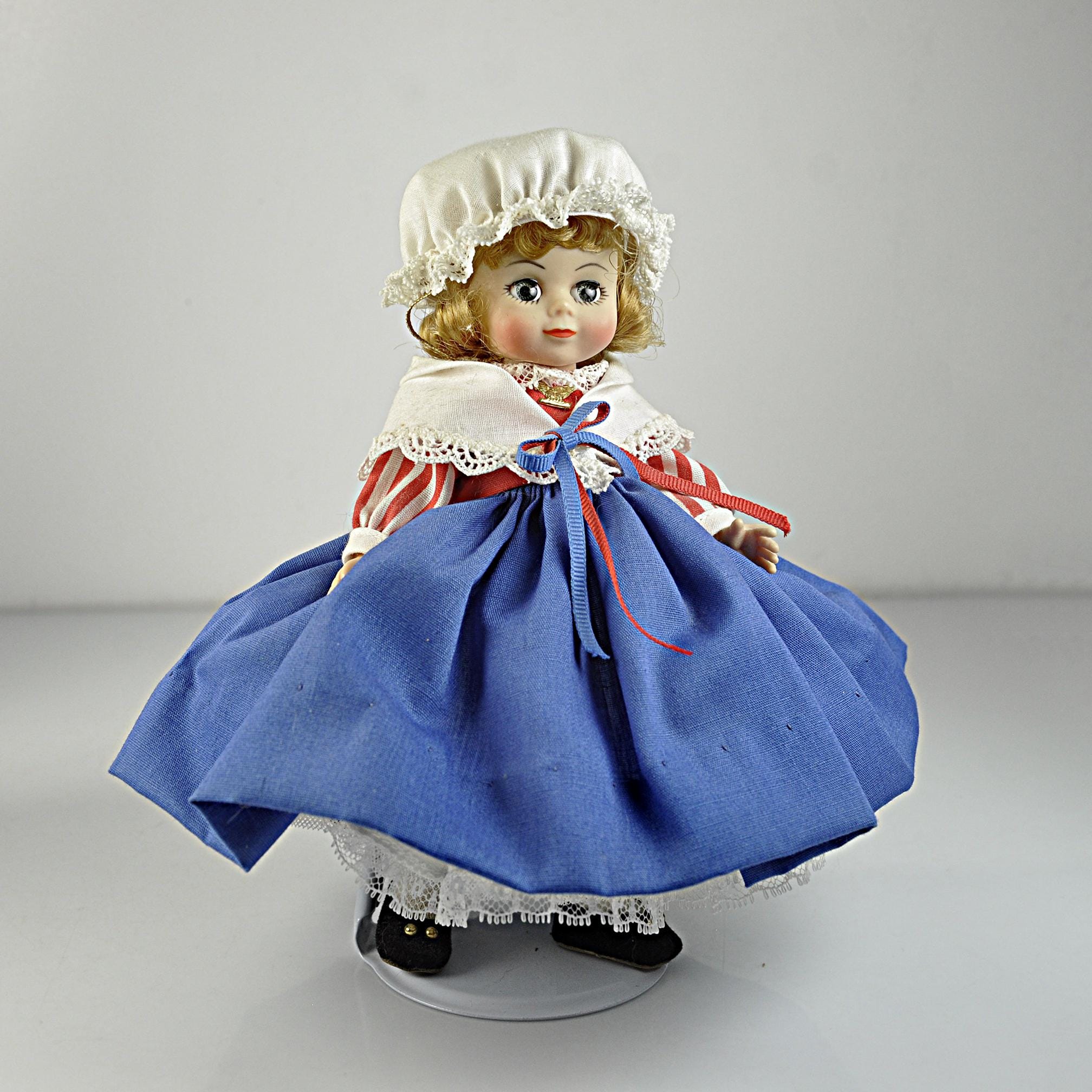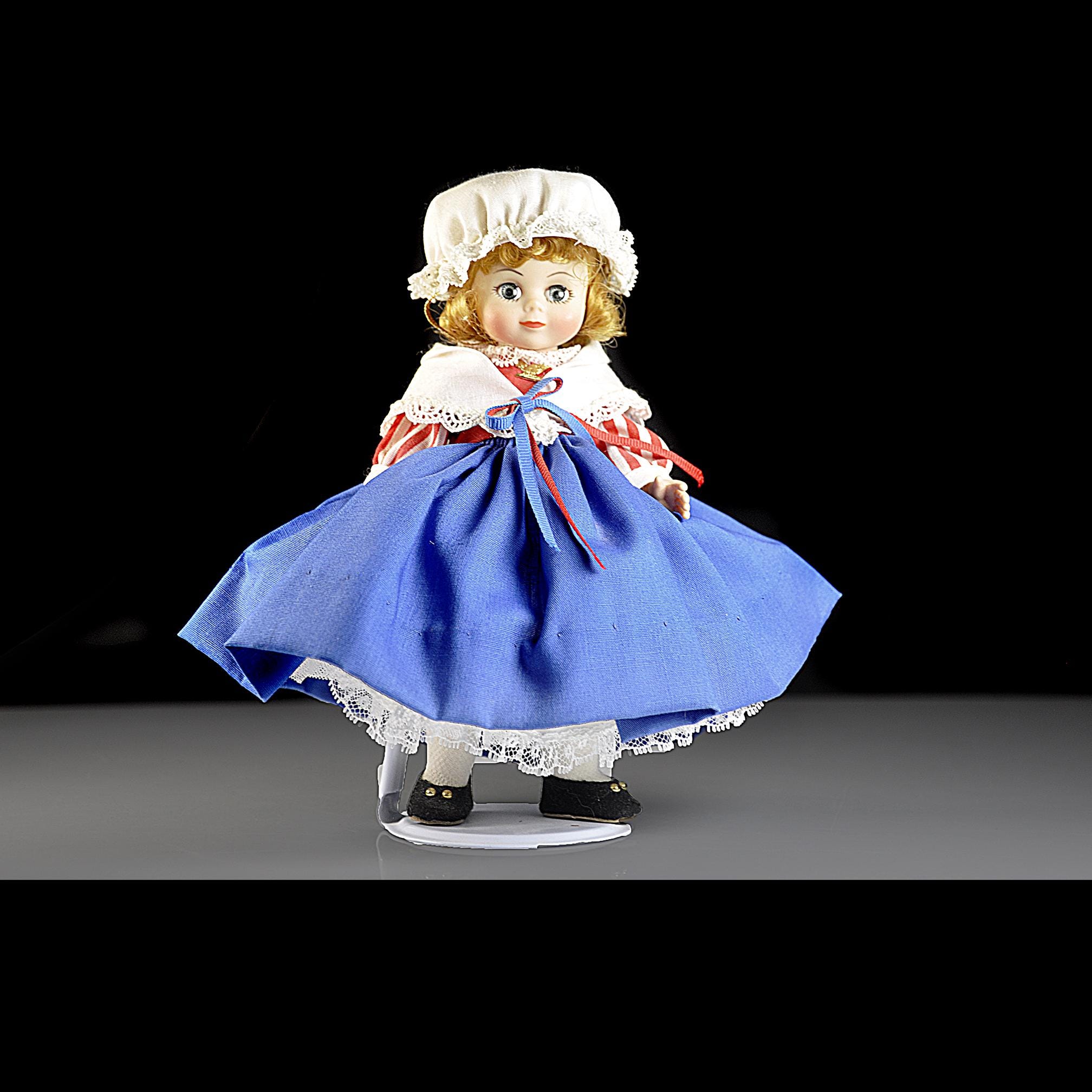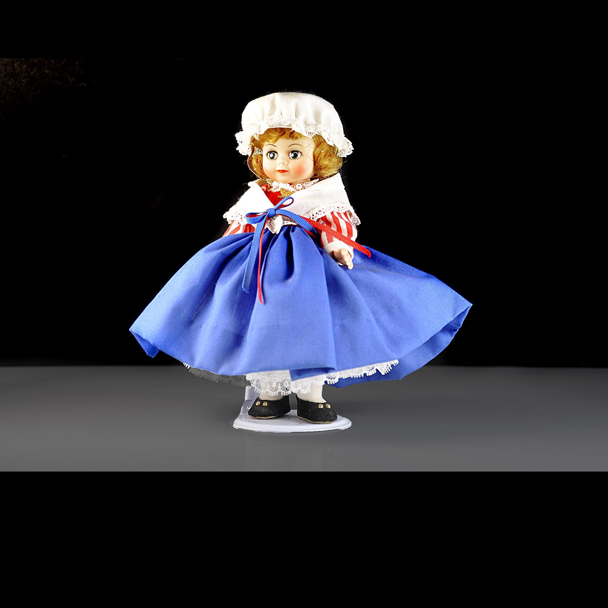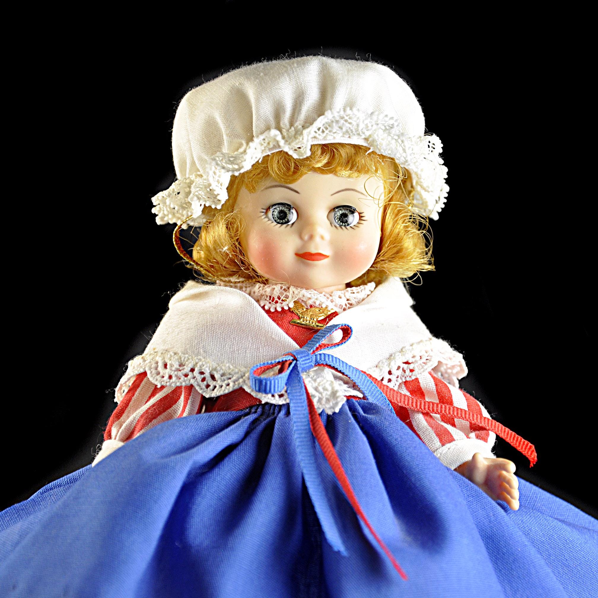 This little Madame Alexander “United States” doll has been sitting in her box for most of her life, and it shows. She’s an 8-inch doll from the International Series, dressed in a Colonial-style outfit that’s clean, crisp, and still bright. Her eyes open and close the way they should, and her curls look just as they did when she left the factory. She’s wearing her original clothes—bonnet, striped blouse, white lace collar, full blue skirt, petticoat, stockings, and black shoes. Everything is clean with no stains, fading, or damage. The doll herself is in excellent condition. She comes with her original Madame Alexander box and her hang tag. She’s a good, solid example for anyone who collects the International dolls, displays Americana pieces, or remembers these from years ago. She’s ready for a new home where she’ll be appreciated instead of tucked away.