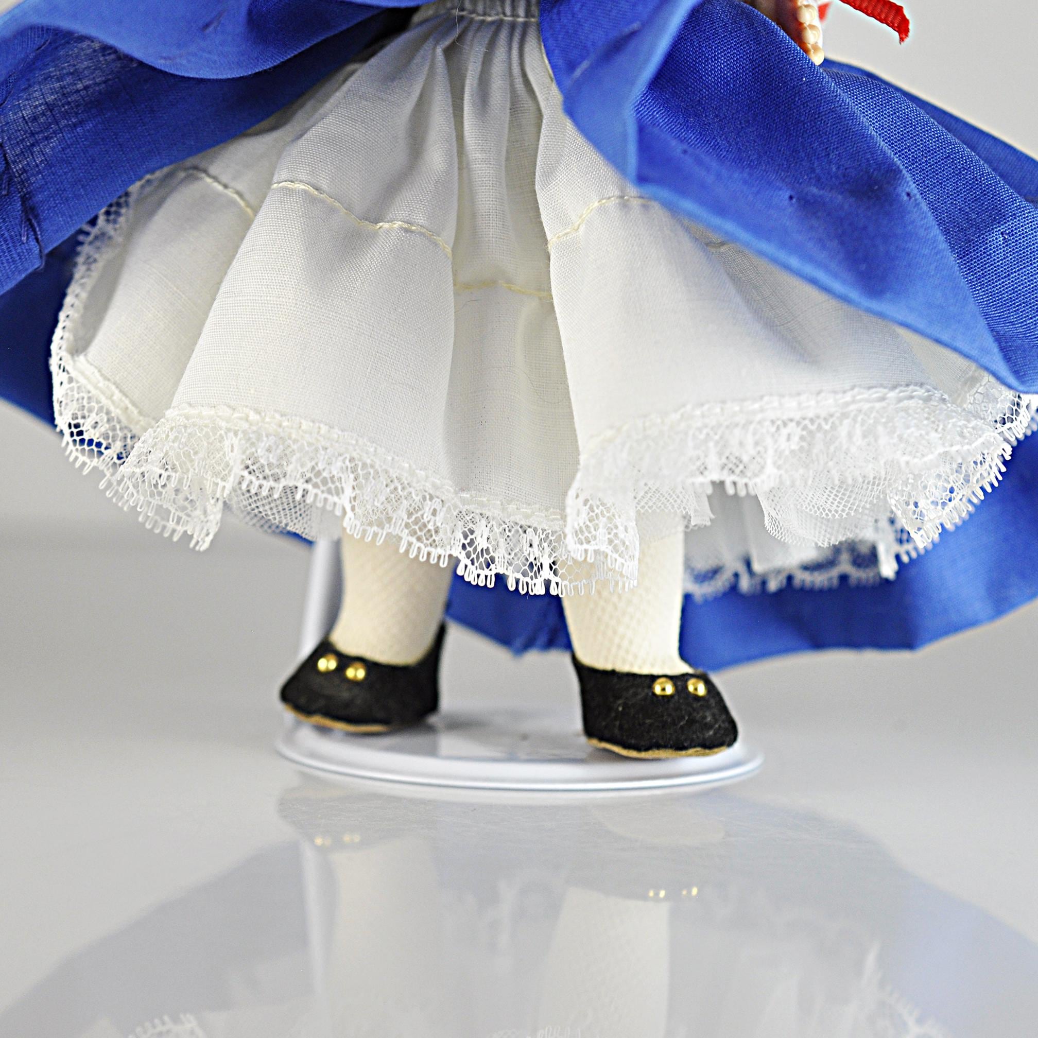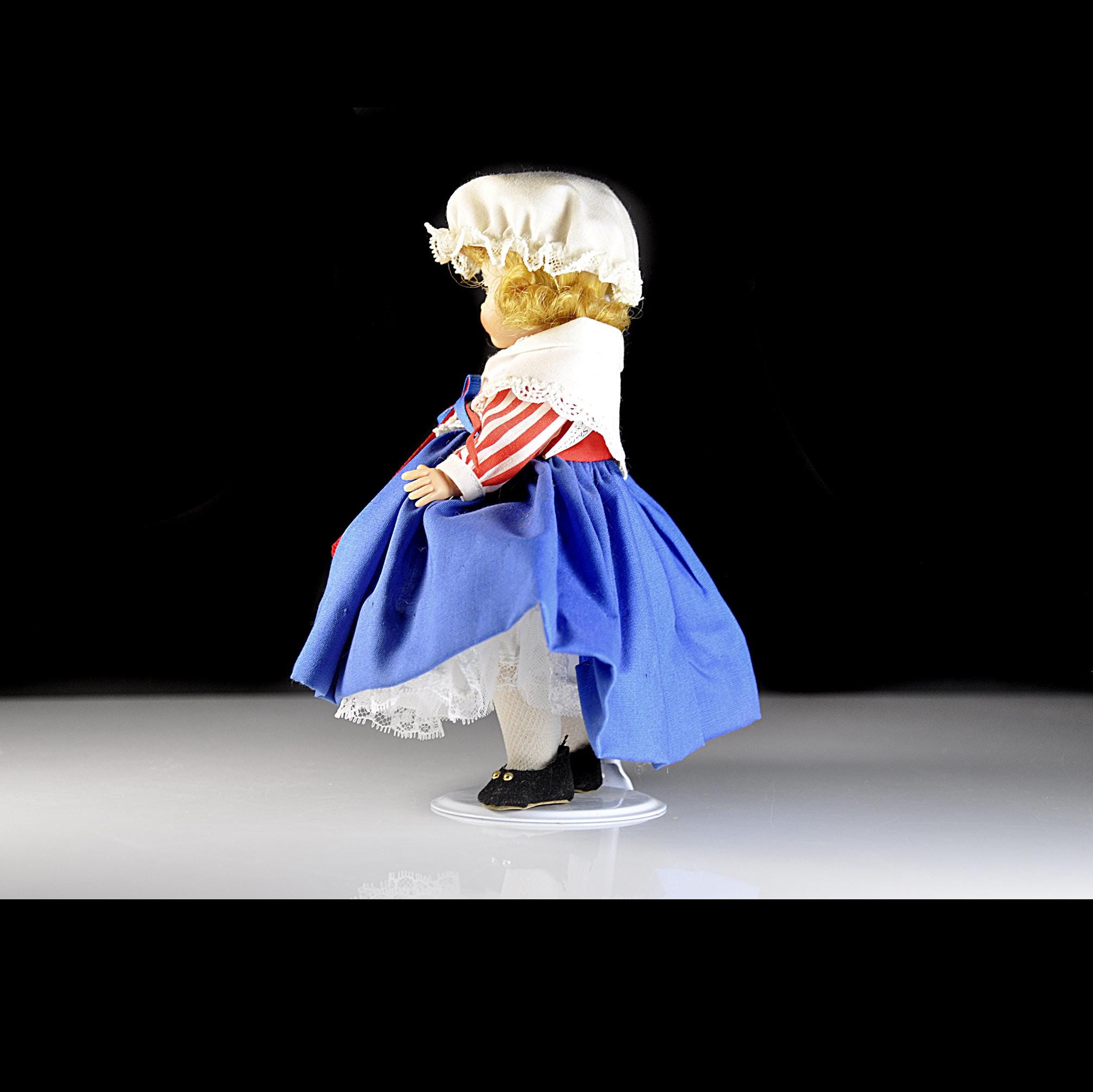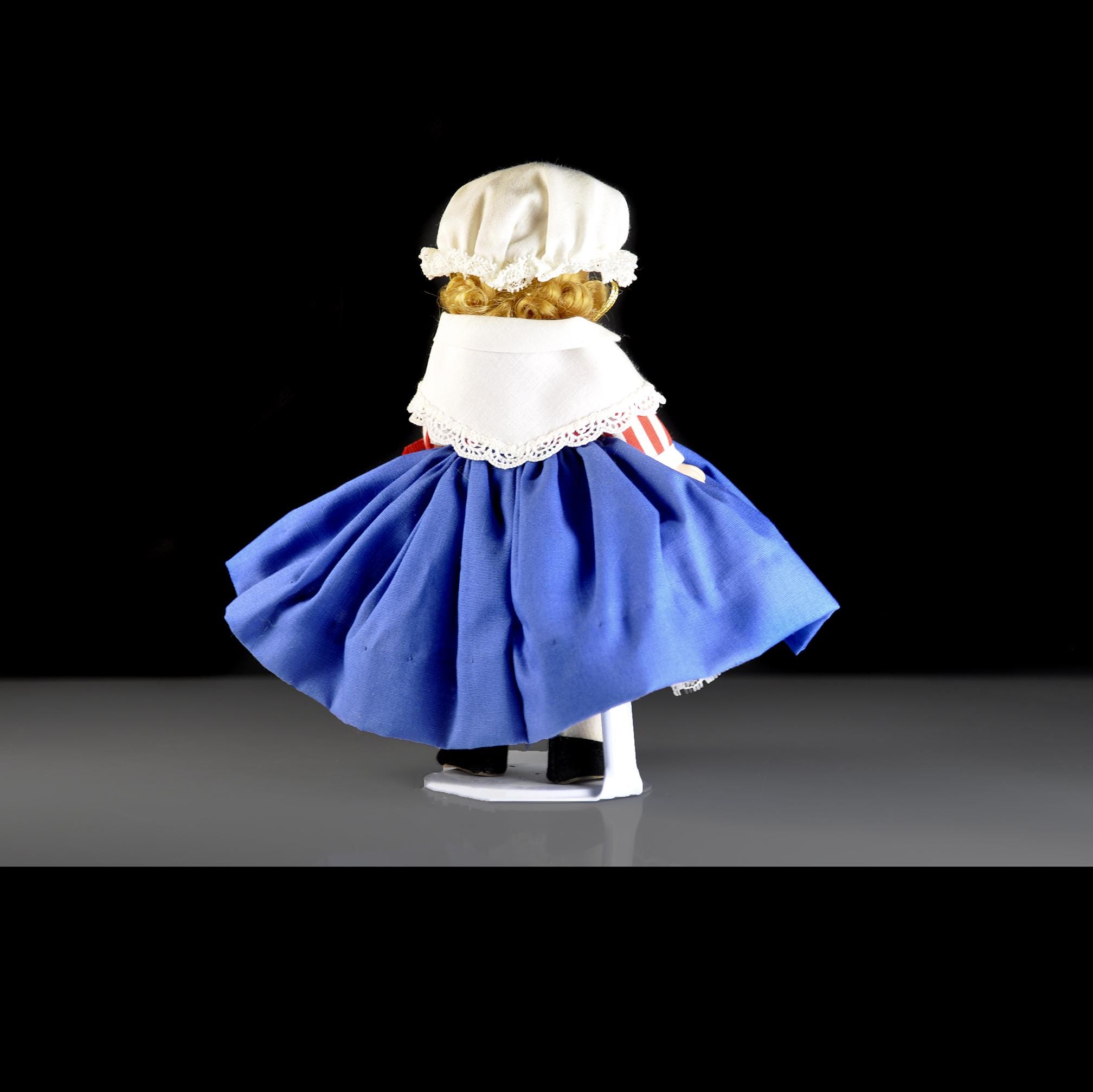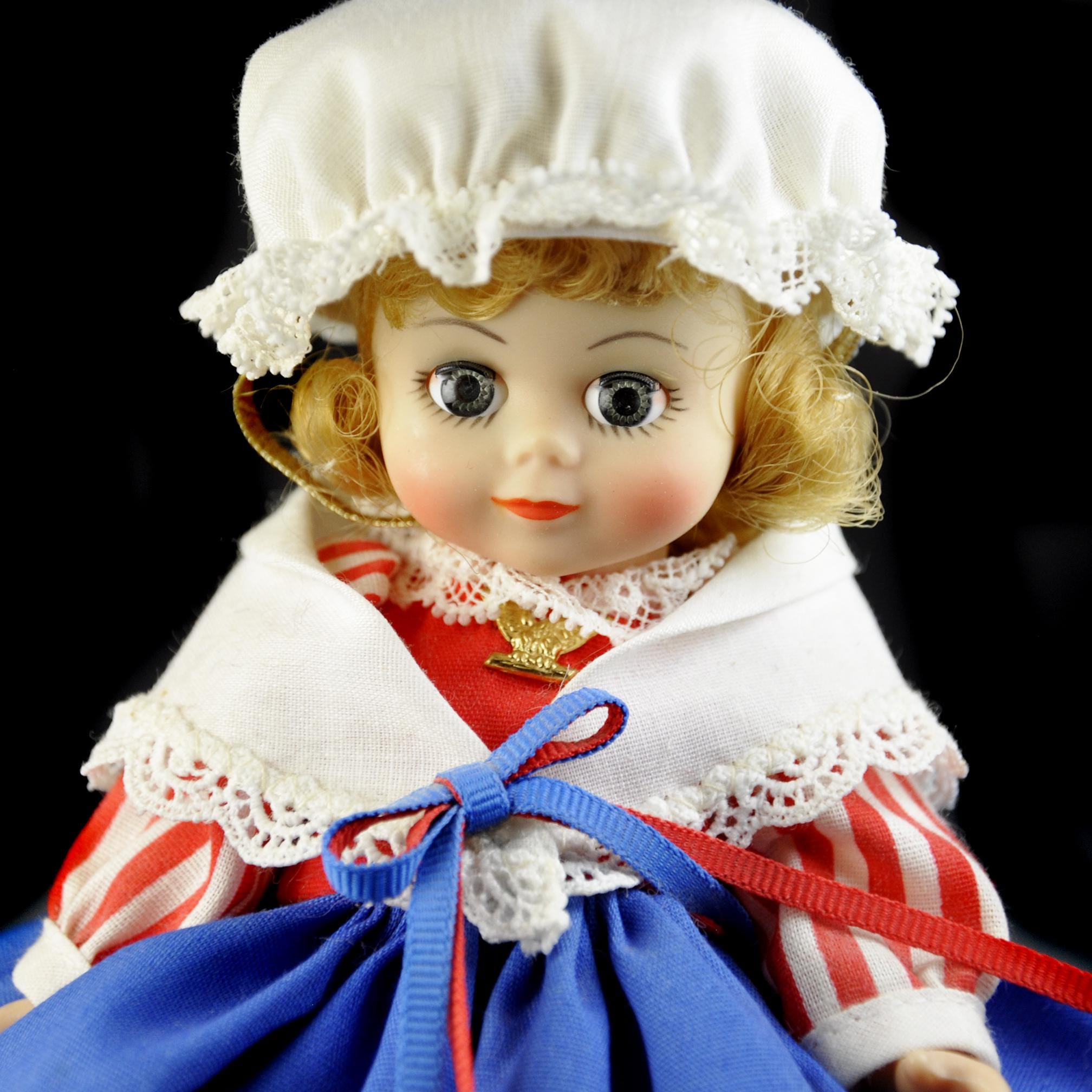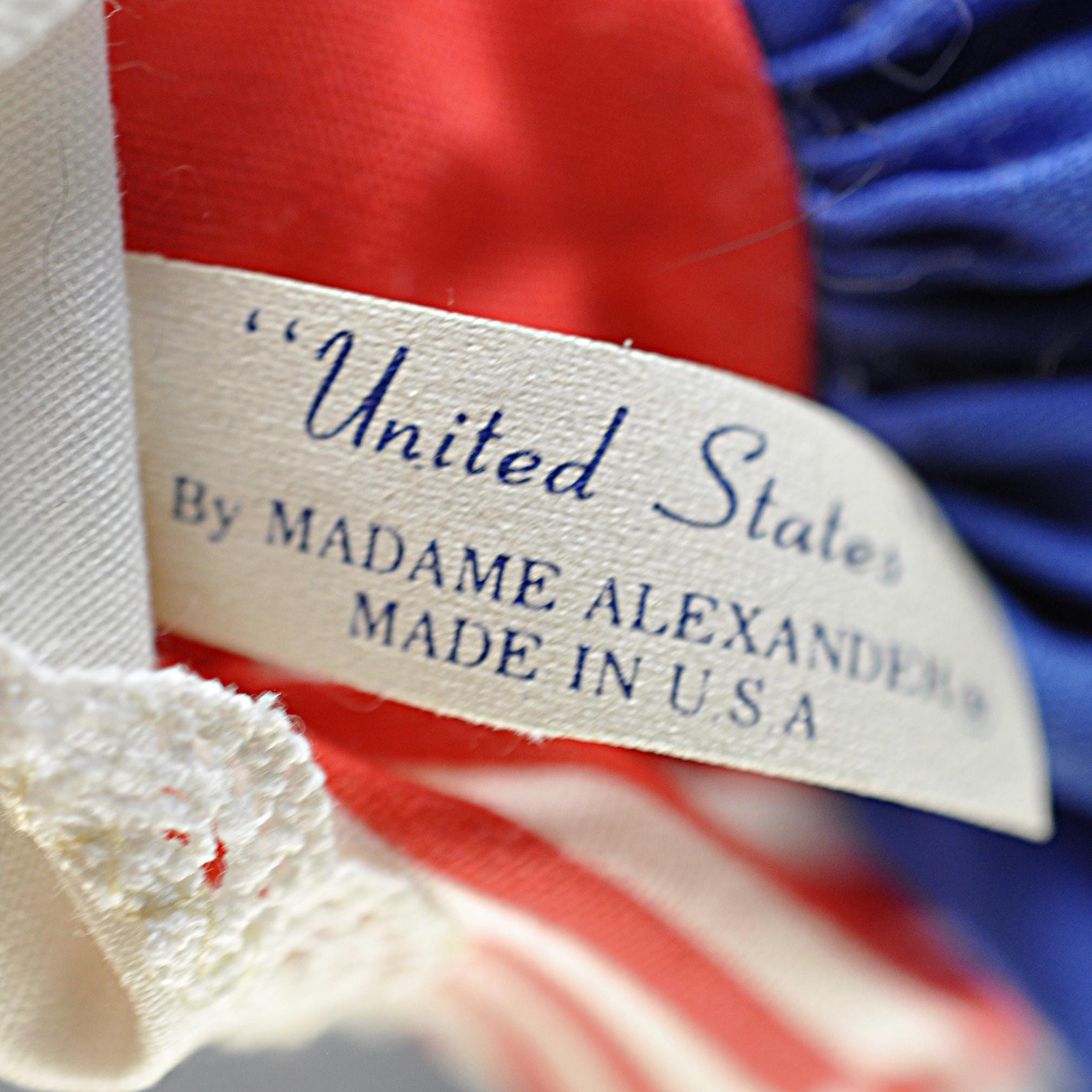 This little Madame Alexander “United States” doll has been sitting in her box for most of her life, and it shows. She’s an 8-inch doll from the International Series, dressed in a Colonial-style outfit that’s clean, crisp, and still bright. Her eyes open and close the way they should, and her curls look just as they did when she left the factory. She’s wearing her original clothes—bonnet, striped blouse, white lace collar, full blue skirt, petticoat, stockings, and black shoes. Everything is clean with no stains, fading, or damage. The doll herself is in excellent condition. She comes with her original Madame Alexander box and her hang tag. She’s a good, solid example for anyone who collects the International dolls, displays Americana pieces, or remembers these from years ago. She’s ready for a new home where she’ll be appreciated instead of tucked away.