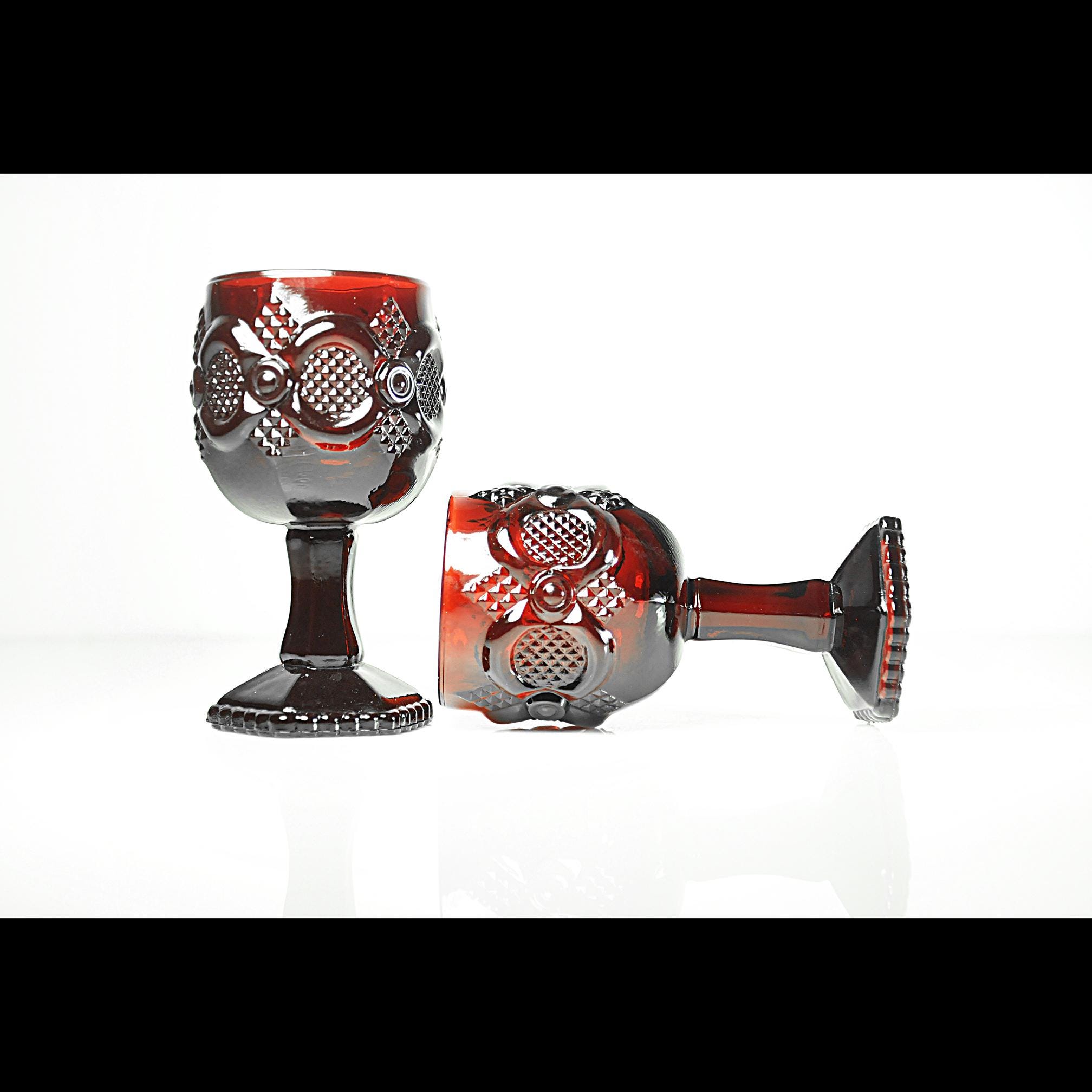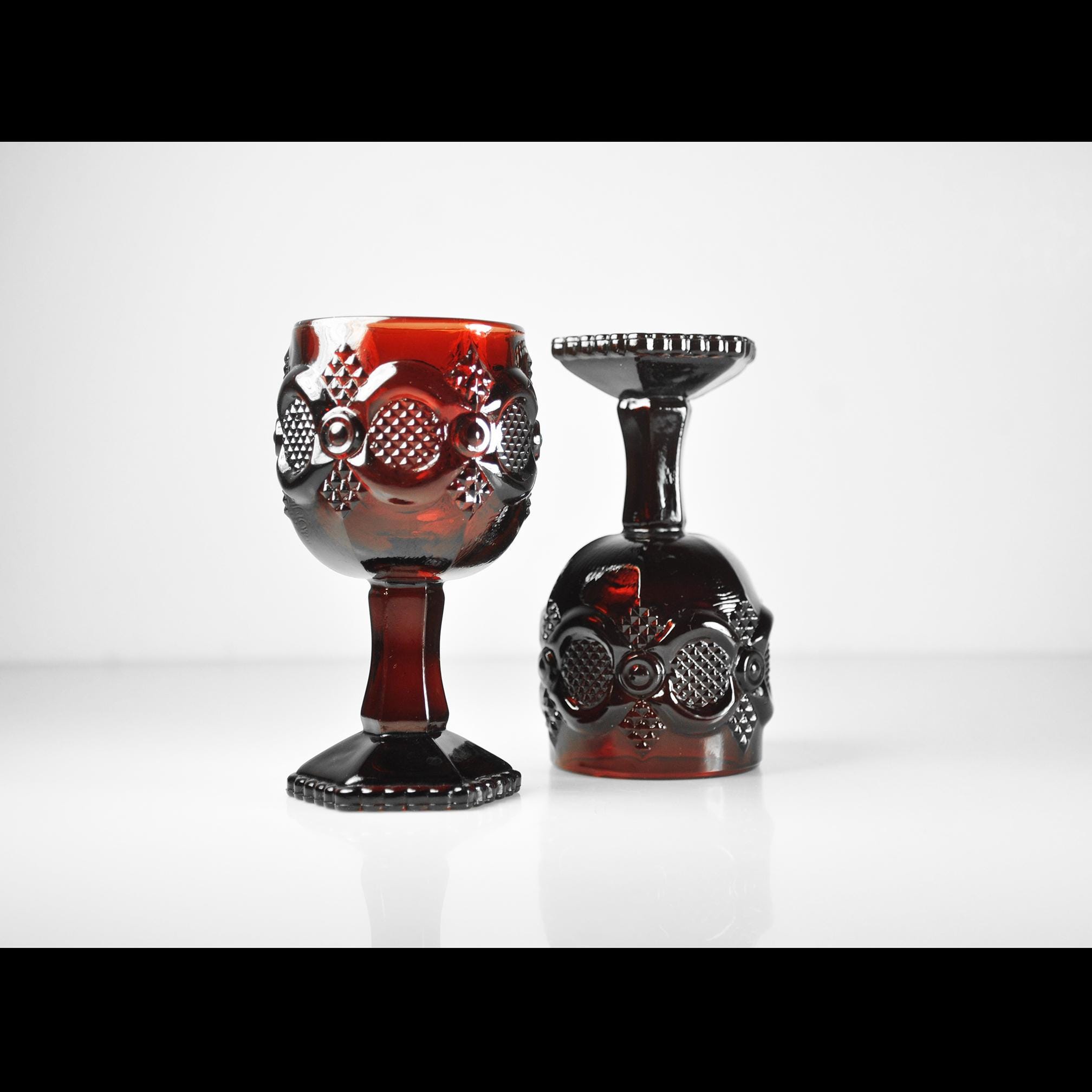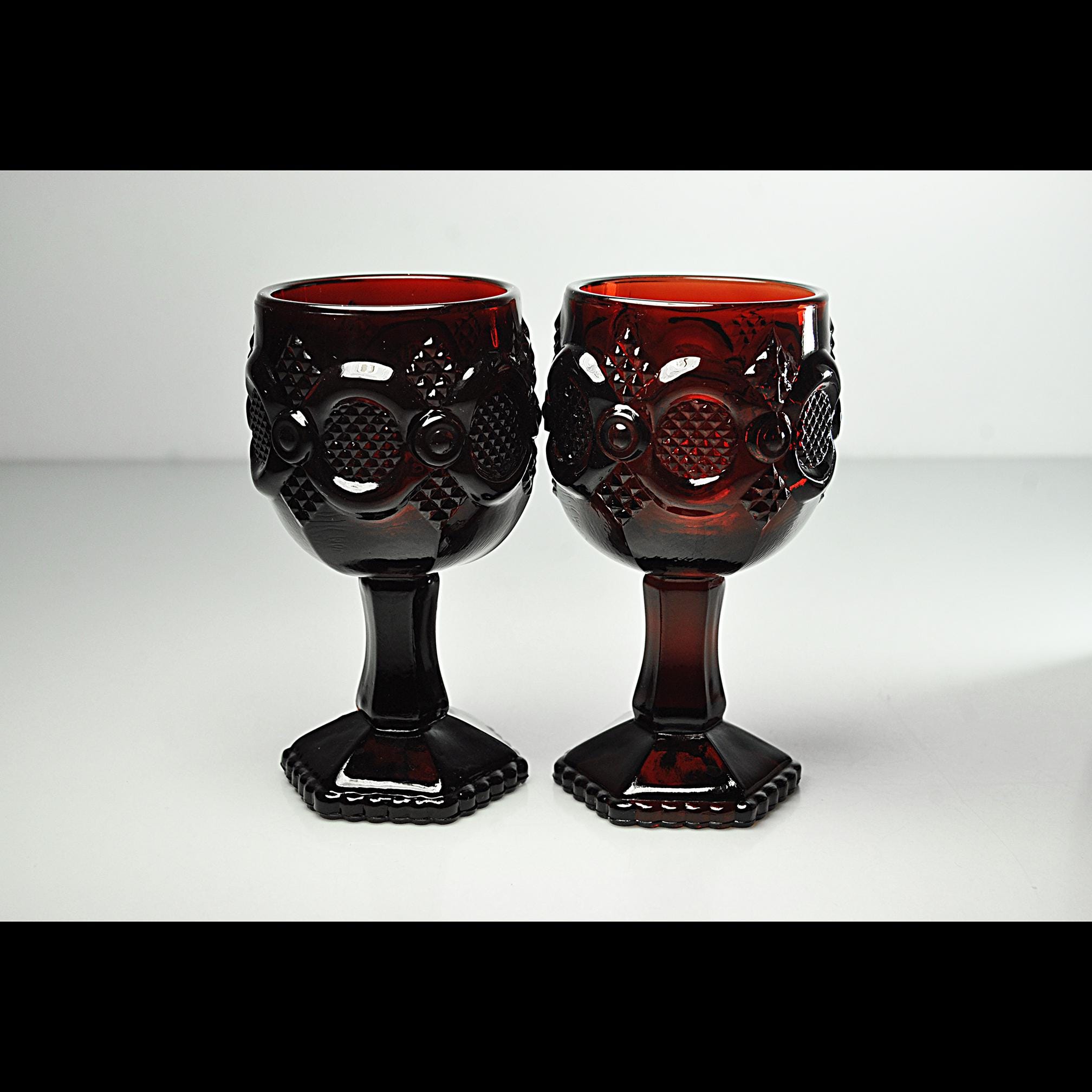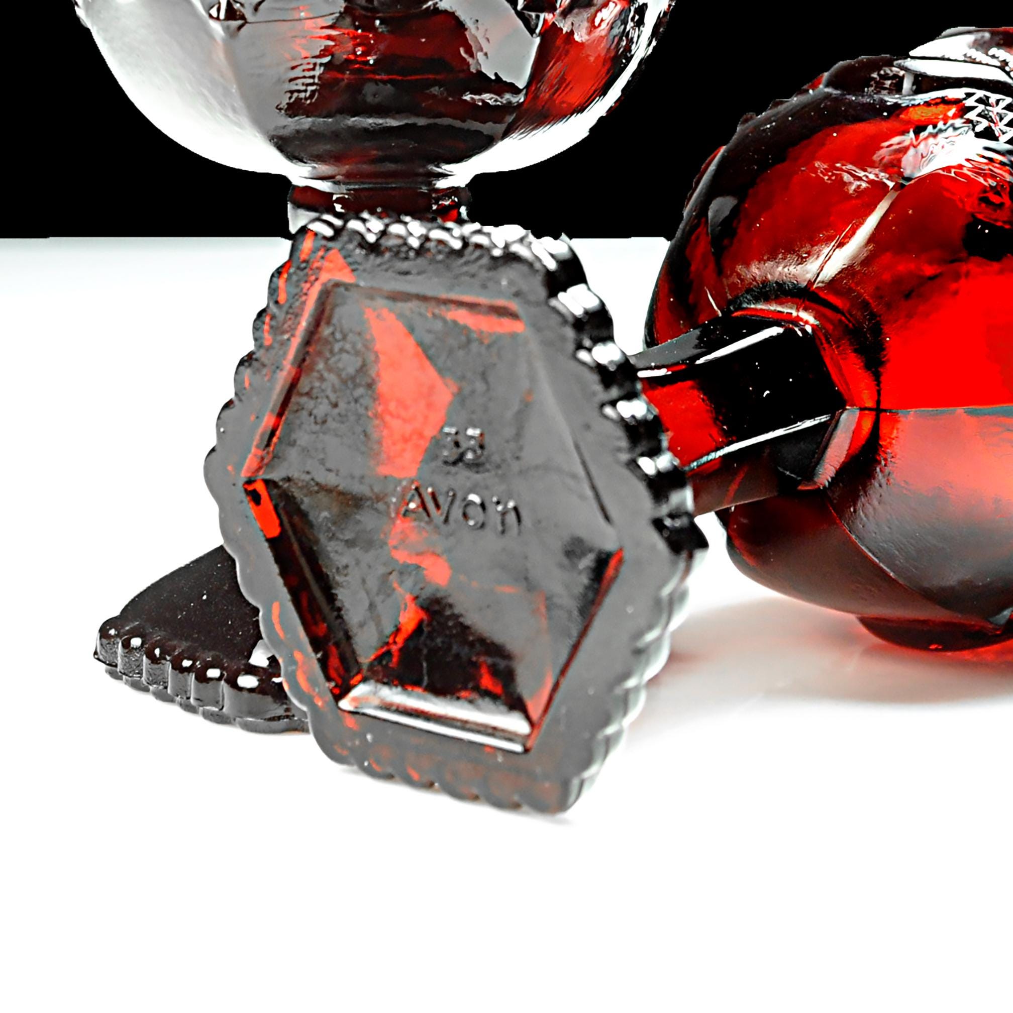 These are the kind of wine glasses that showed up for holidays, anniversaries, and Sunday dinners when company was coming over. This is a set of two Avon Cape Cod wine glasses, done in that deep ruby red glass that Avon made famous in the 1970s. They’ve got good weight in the hand, a sturdy stem, and that unmistakable raised geometric pattern that catches the light when the table is set just right. Avon’s Cape Cod line was made for everyday people who wanted something nicer than plain glass, but still sturdy enough to actually use. These pieces have held up for decades, and they’re still ready for many more dinners, holidays, or quiet evenings.