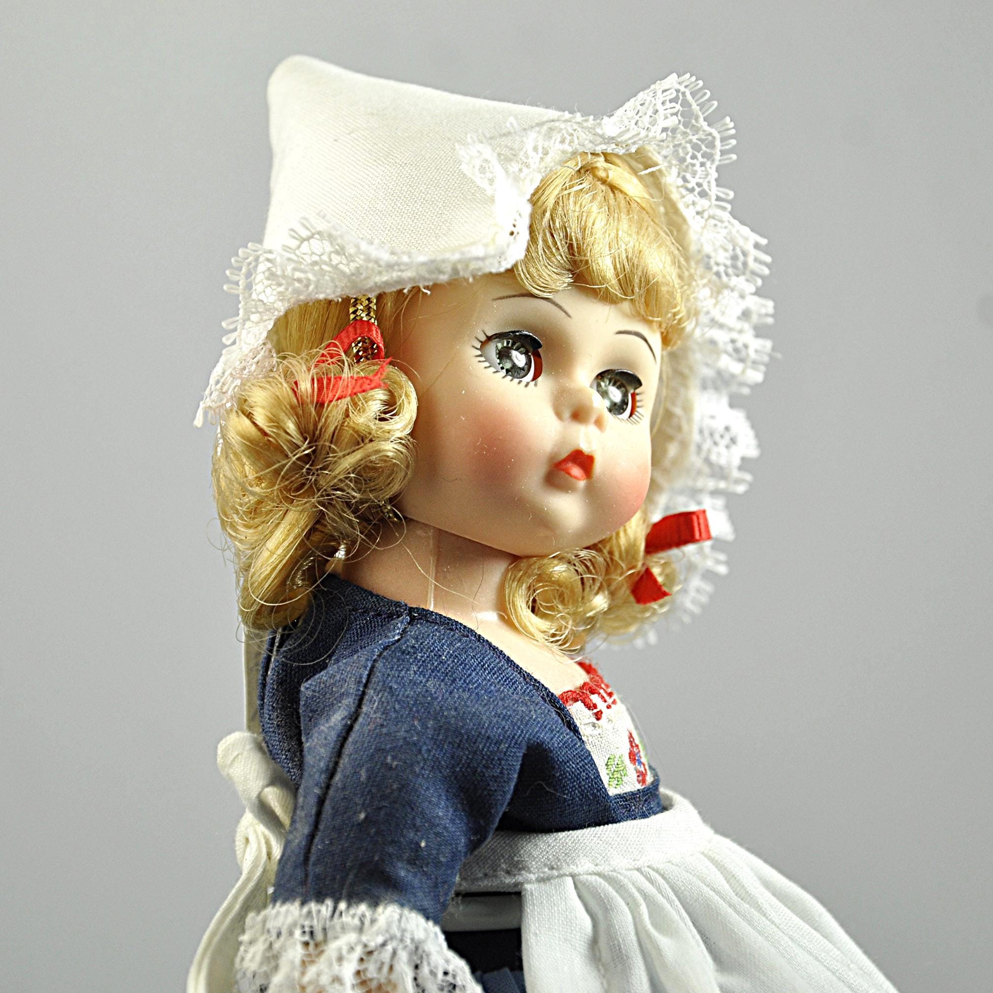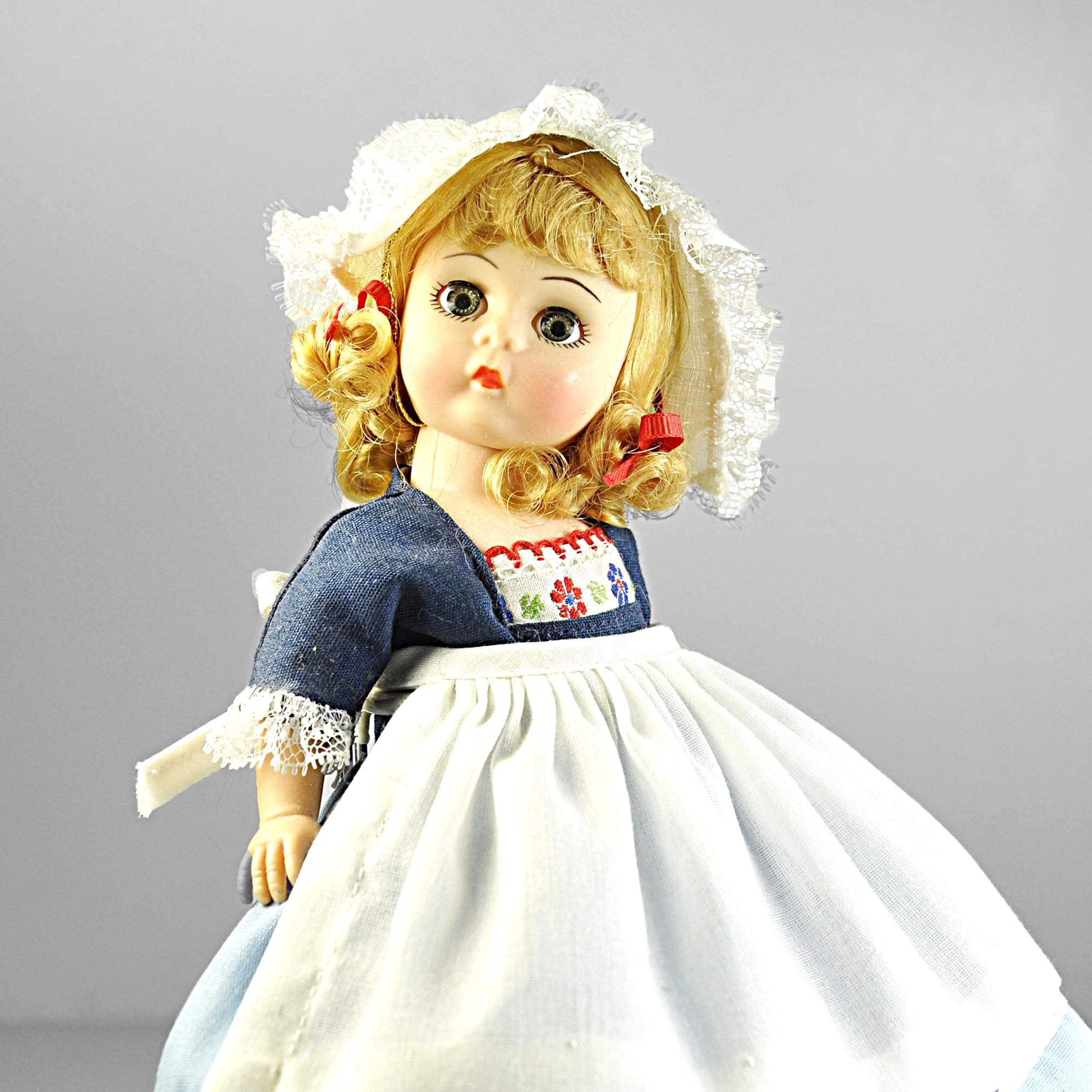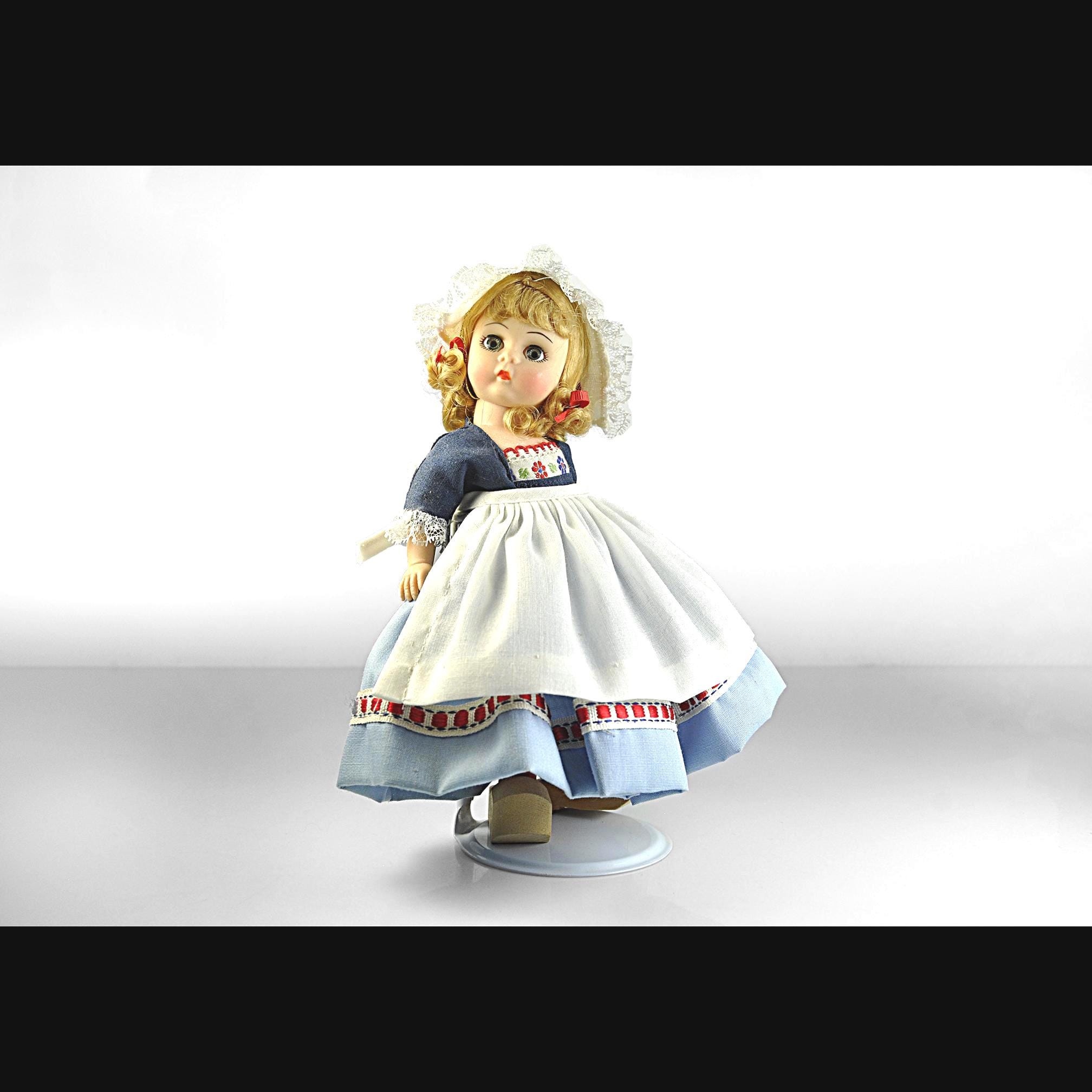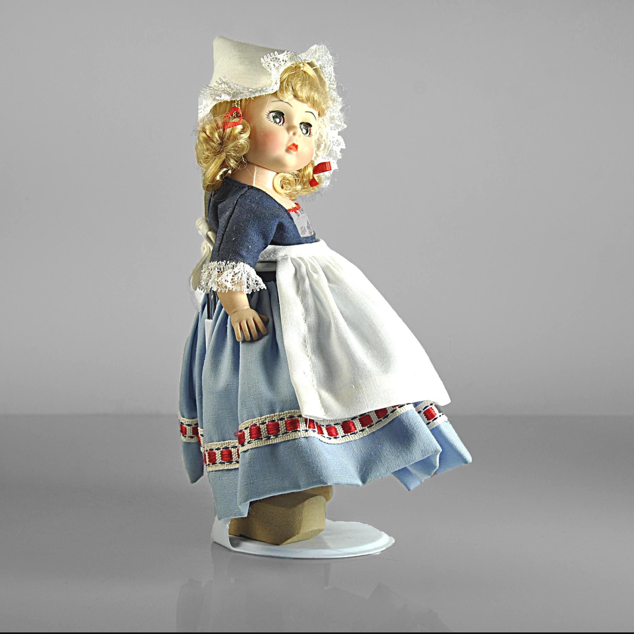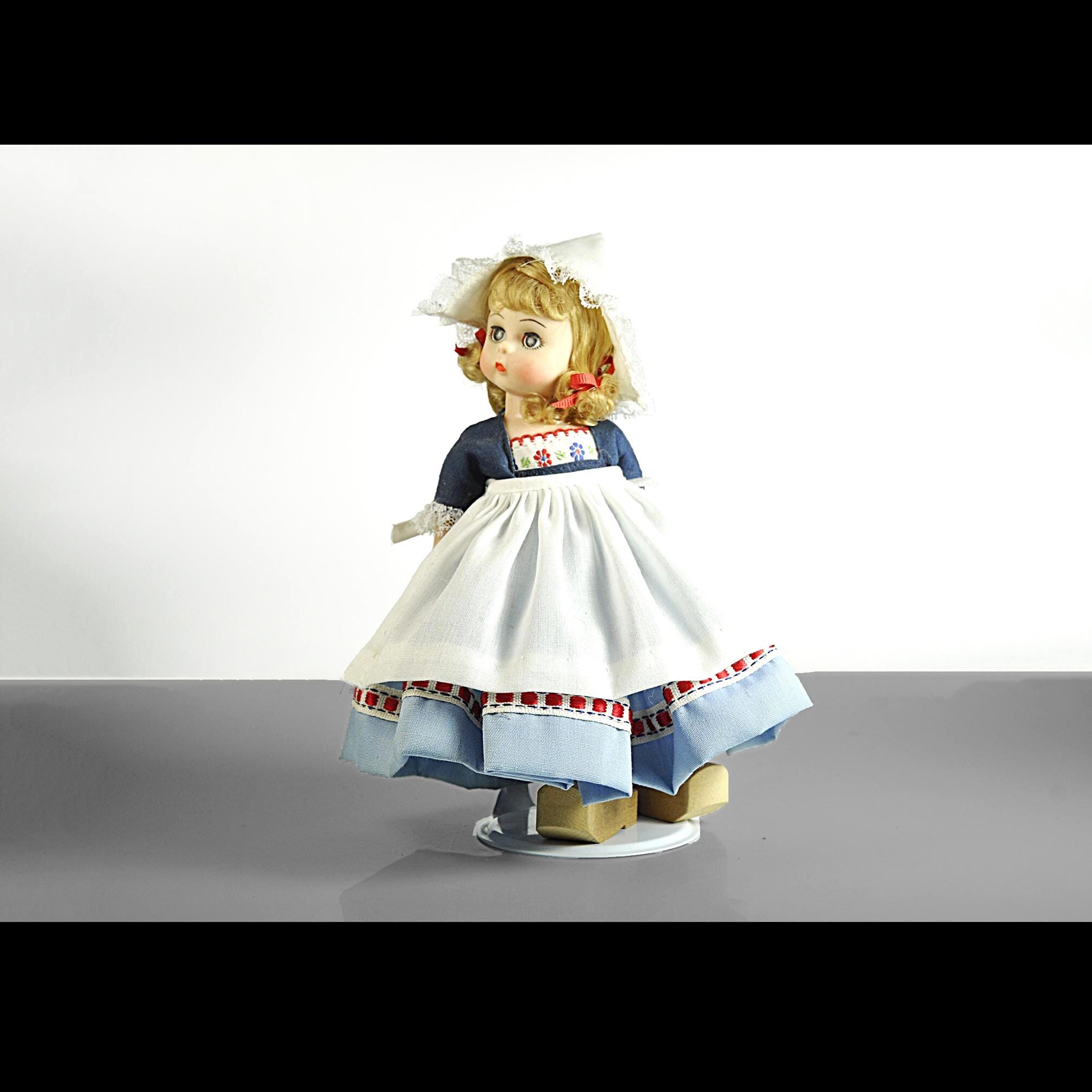 There’s something about these little Madame Alexander International dolls that feels honest and thoughtful. They weren’t made to be flashy toys — they were made to teach, to introduce children (and adults) to places beyond their own kitchen window. This sweet girl represents The Netherlands, dressed in traditional Dutch clothing that Madame Alexander was so careful to get right. The blue dress, crisp white apron, embroidered bodice, lace-trimmed cap, red stockings, and those classic wooden clogs — it’s all there, just as it should be. She stands 8 inches tall and is in excellent condition. Her face paint is clean and bright, her hair is neatly styled, and her clothing is fresh with no stains, fading, or odors. She looks like a doll that spent most of her life safely tucked away rather than handled or displayed. The doll comes with her original doll stand and her original International Series box, which is in very good condition. A lovely piece for a Madame Alexander collector, an International Series display, or anyone who appreciates well-made vintage dolls with a story behind them.