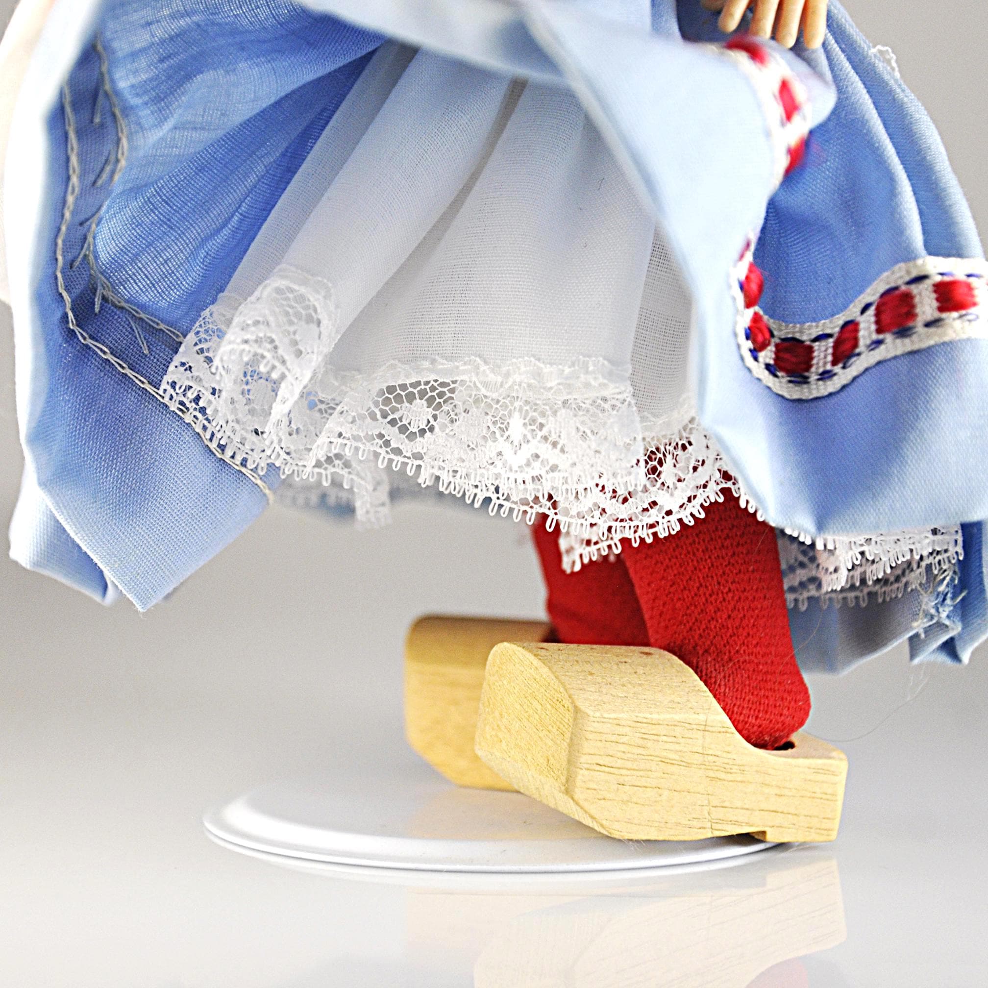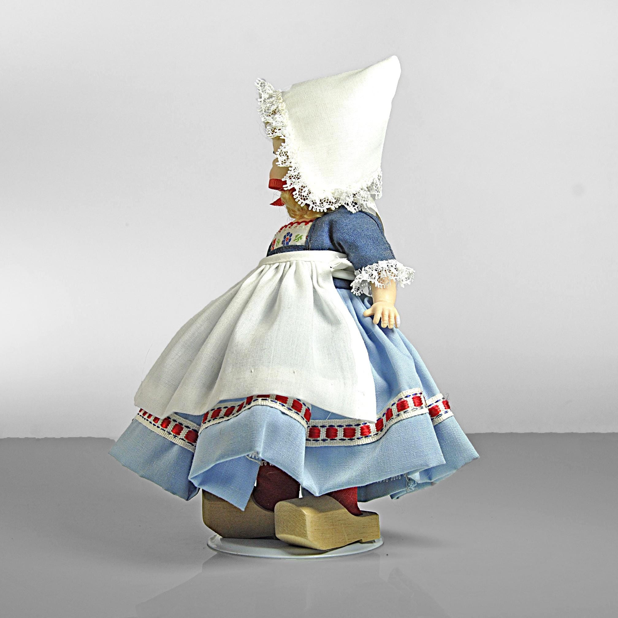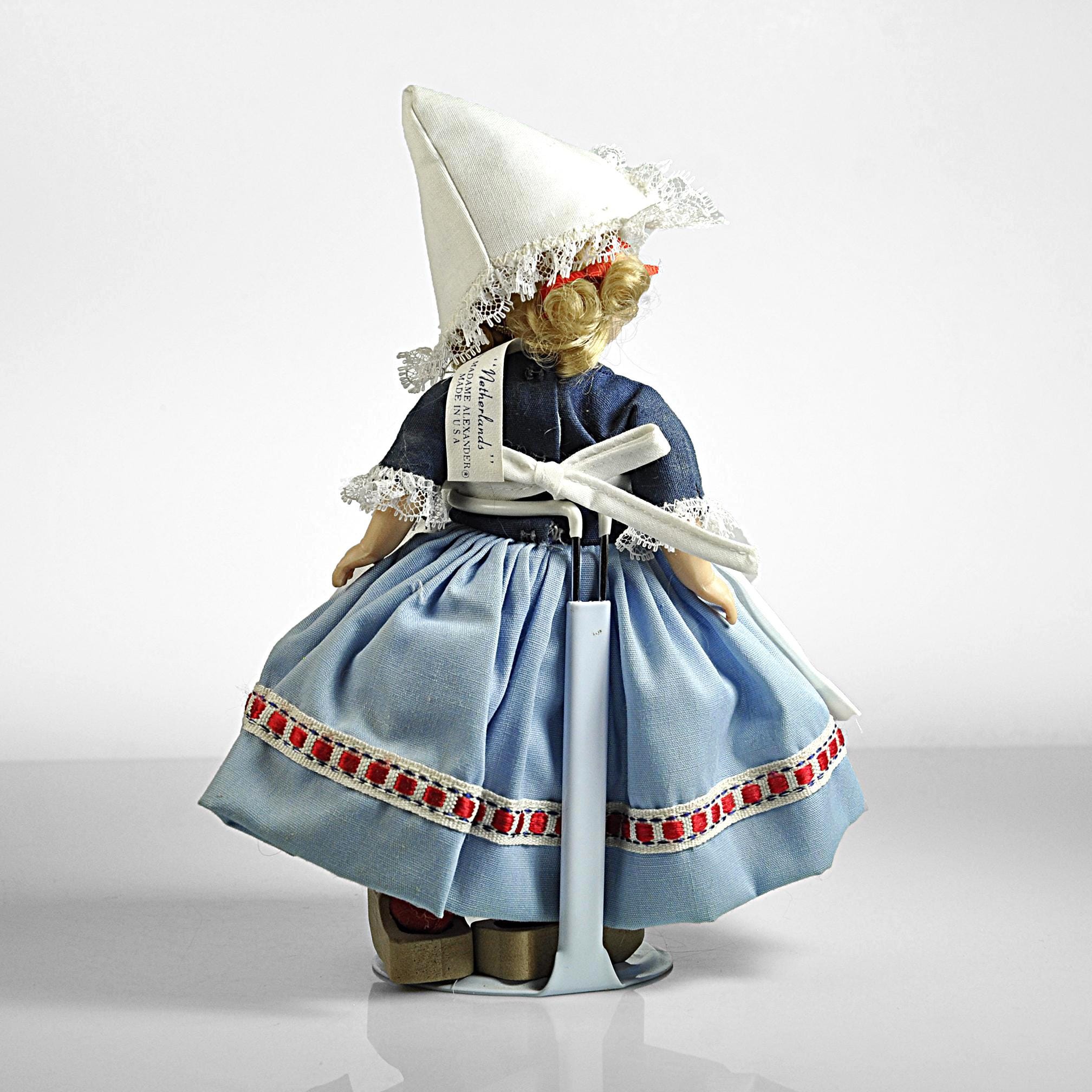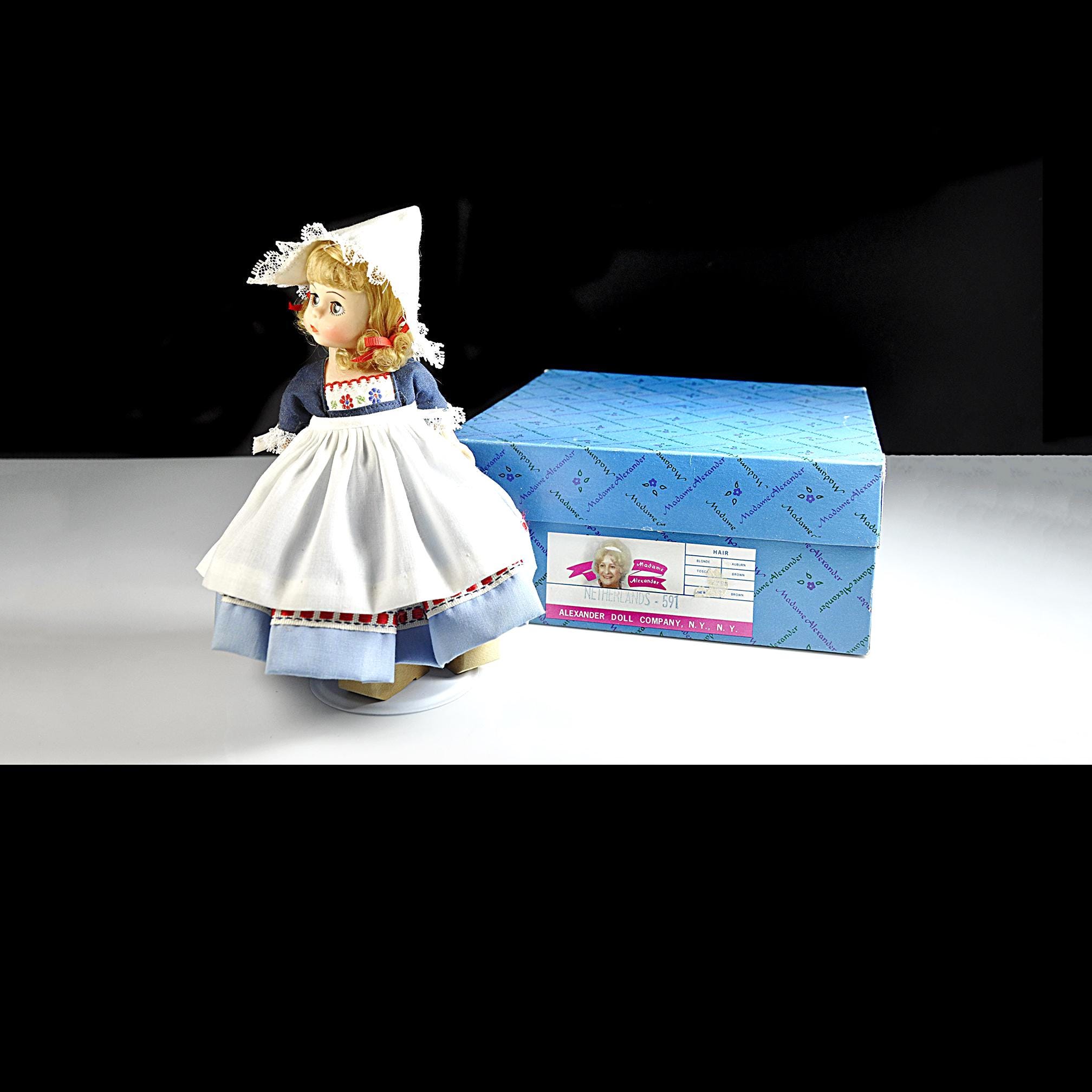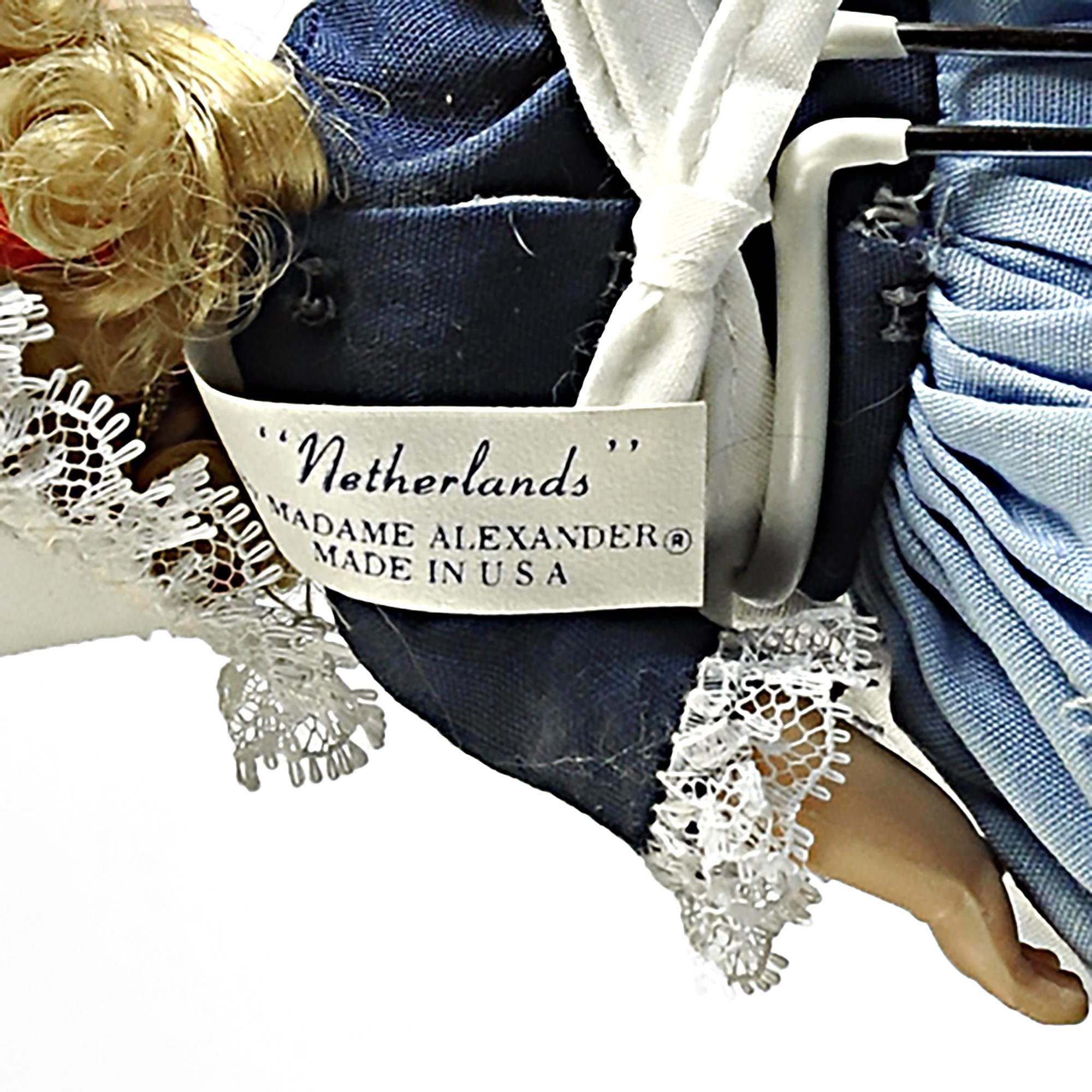 There’s something about these little Madame Alexander International dolls that feels honest and thoughtful. They weren’t made to be flashy toys — they were made to teach, to introduce children (and adults) to places beyond their own kitchen window. This sweet girl represents The Netherlands, dressed in traditional Dutch clothing that Madame Alexander was so careful to get right. The blue dress, crisp white apron, embroidered bodice, lace-trimmed cap, red stockings, and those classic wooden clogs — it’s all there, just as it should be. She stands 8 inches tall and is in excellent condition. Her face paint is clean and bright, her hair is neatly styled, and her clothing is fresh with no stains, fading, or odors. She looks like a doll that spent most of her life safely tucked away rather than handled or displayed. The doll comes with her original doll stand and her original International Series box, which is in very good condition. A lovely piece for a Madame Alexander collector, an International Series display, or anyone who appreciates well-made vintage dolls with a story behind them.