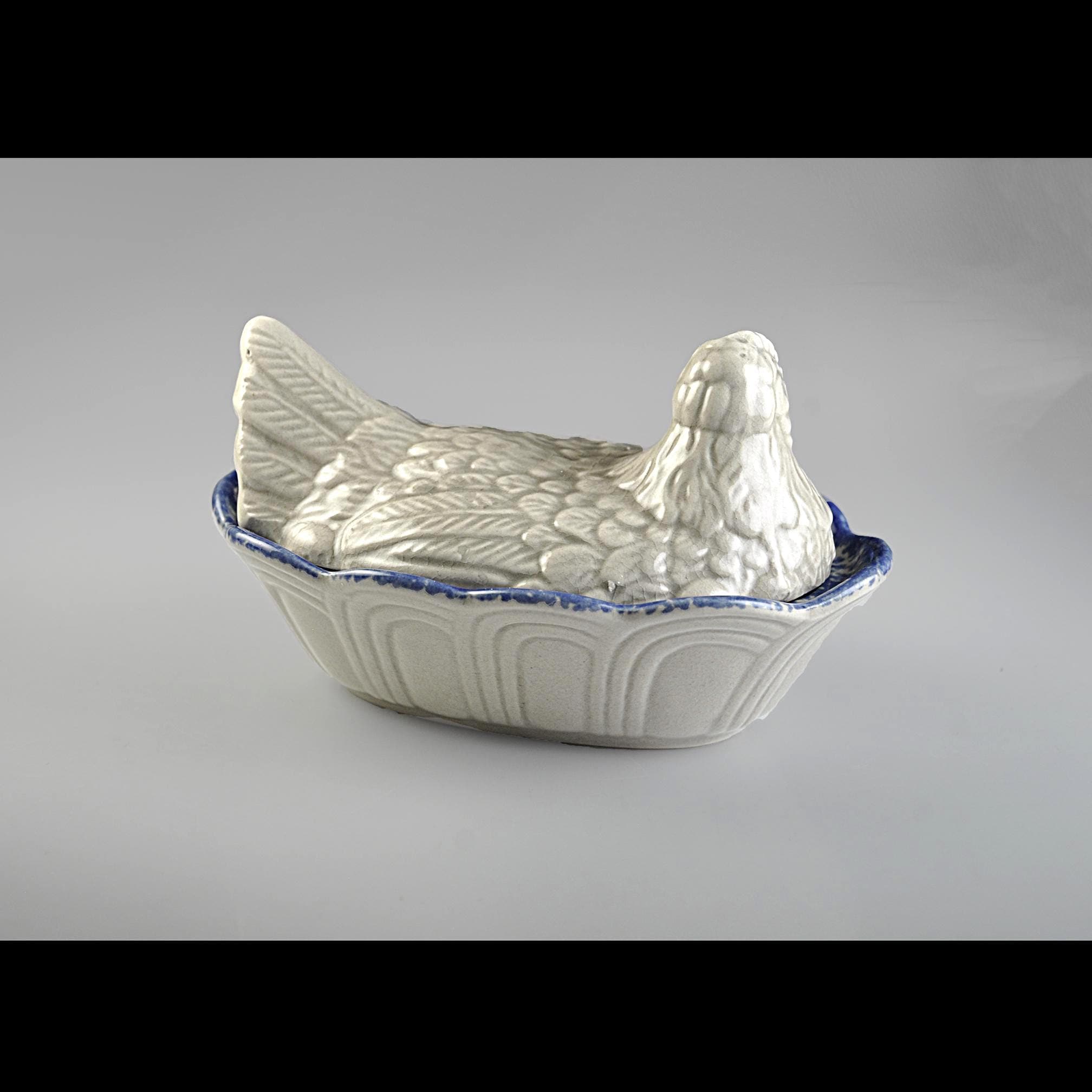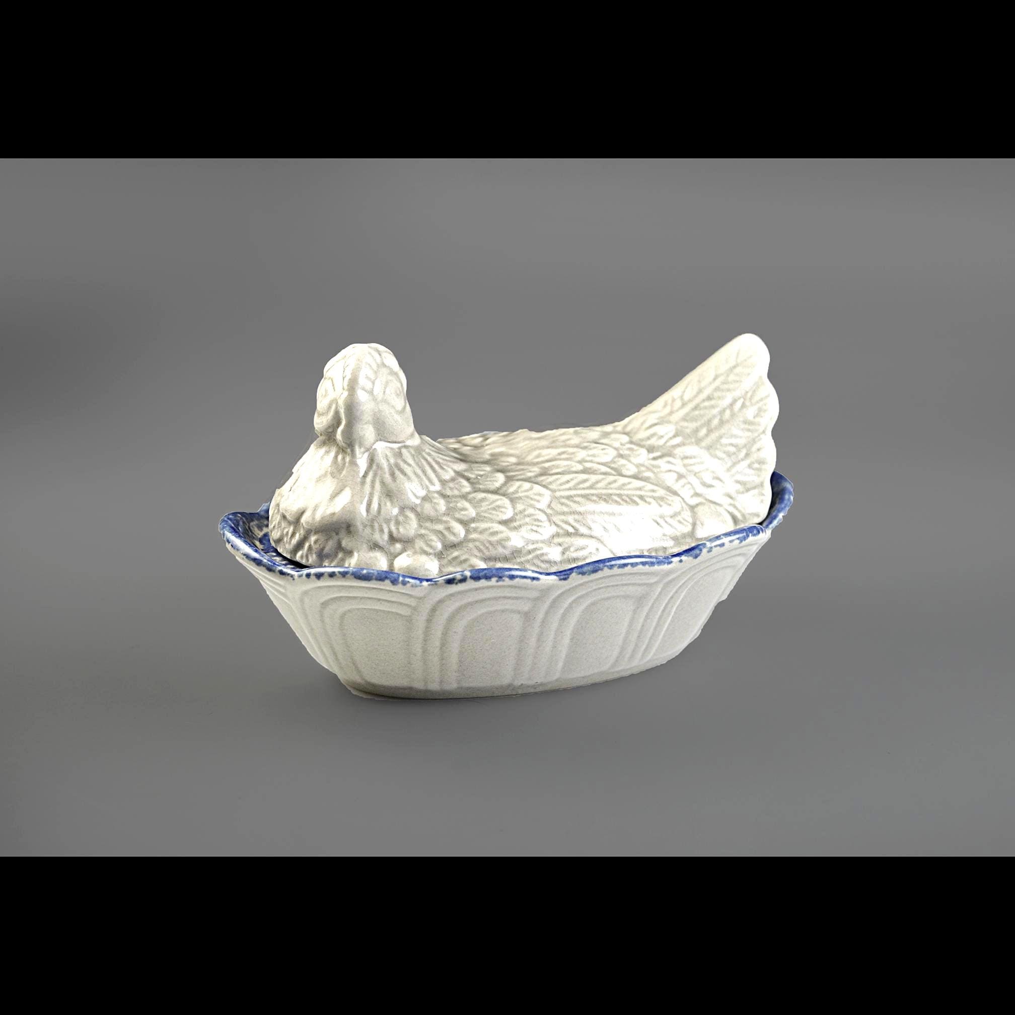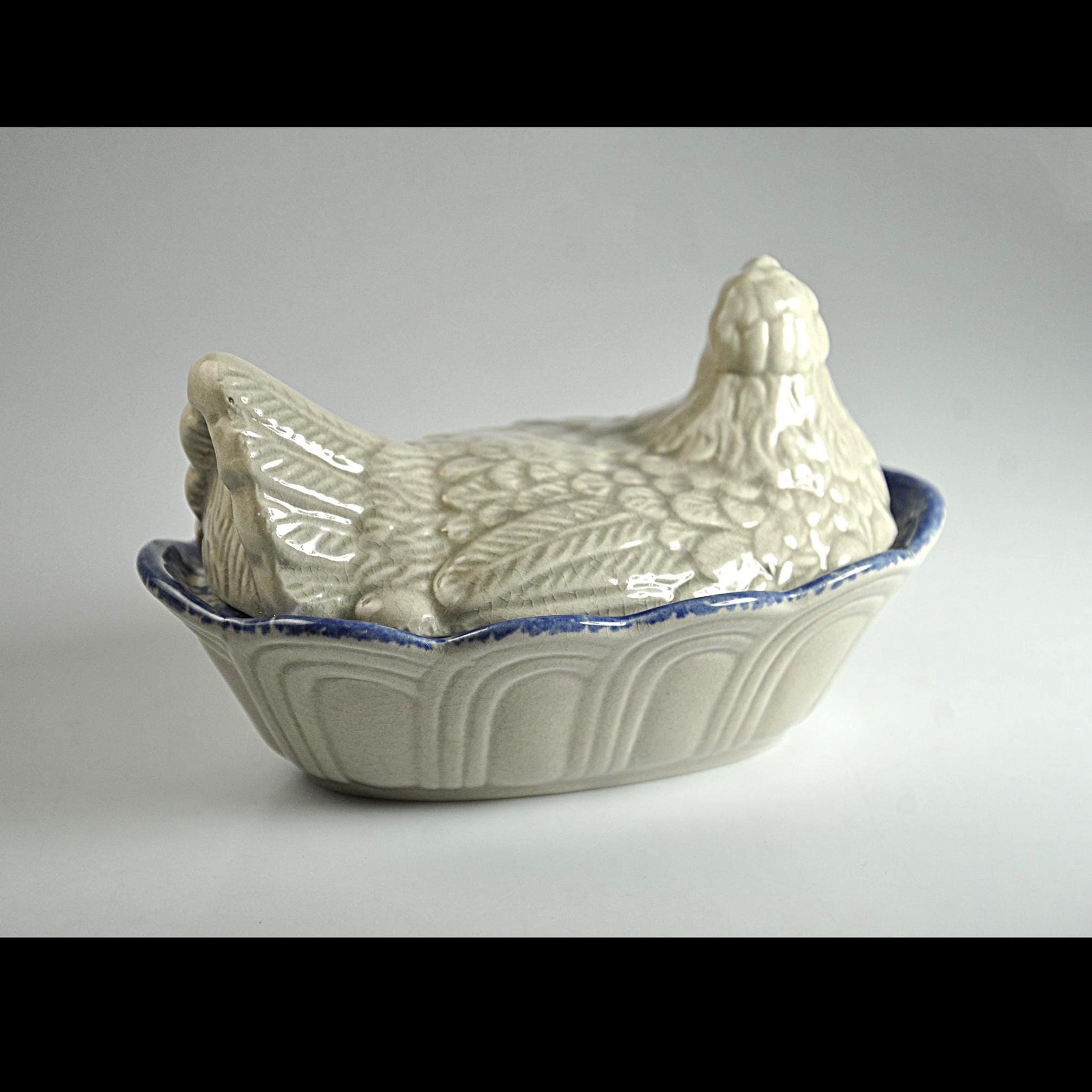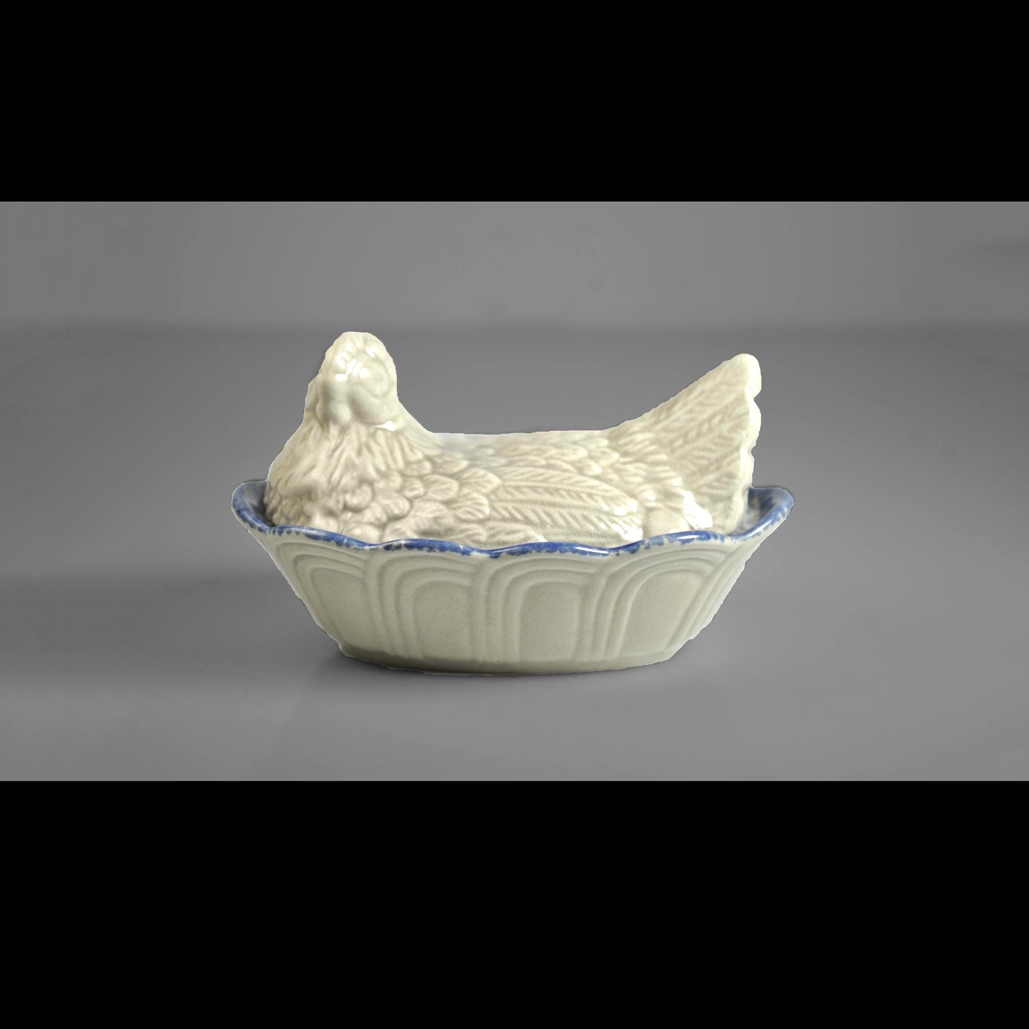 This little hen came out of the bottom of a box at an estate sale — the kind of box that’s been packed and unpacked more times than anyone remembers. Nothing fancy, nothing rare, just the kind of everyday kitchen piece that quietly did its job for years. She’s a small ceramic hen on nest covered dish, made in the mid-20th century and marked simply “China” on the bottom, which was common for practical household pieces of the time. The glaze is a warm cream color, with a soft blue sponge-decorated rim around the bowl. The hen itself is nicely molded, with good feather detail, and she sits neatly inside the base. This size was typically used as a butter dish or for jam or jelly on the table. Today, it works just as well as farmhouse kitchen décor or a small trinket dish on a shelf. This is one of those wonderful vintage pieces — simple, useful, and still charming all these years later.