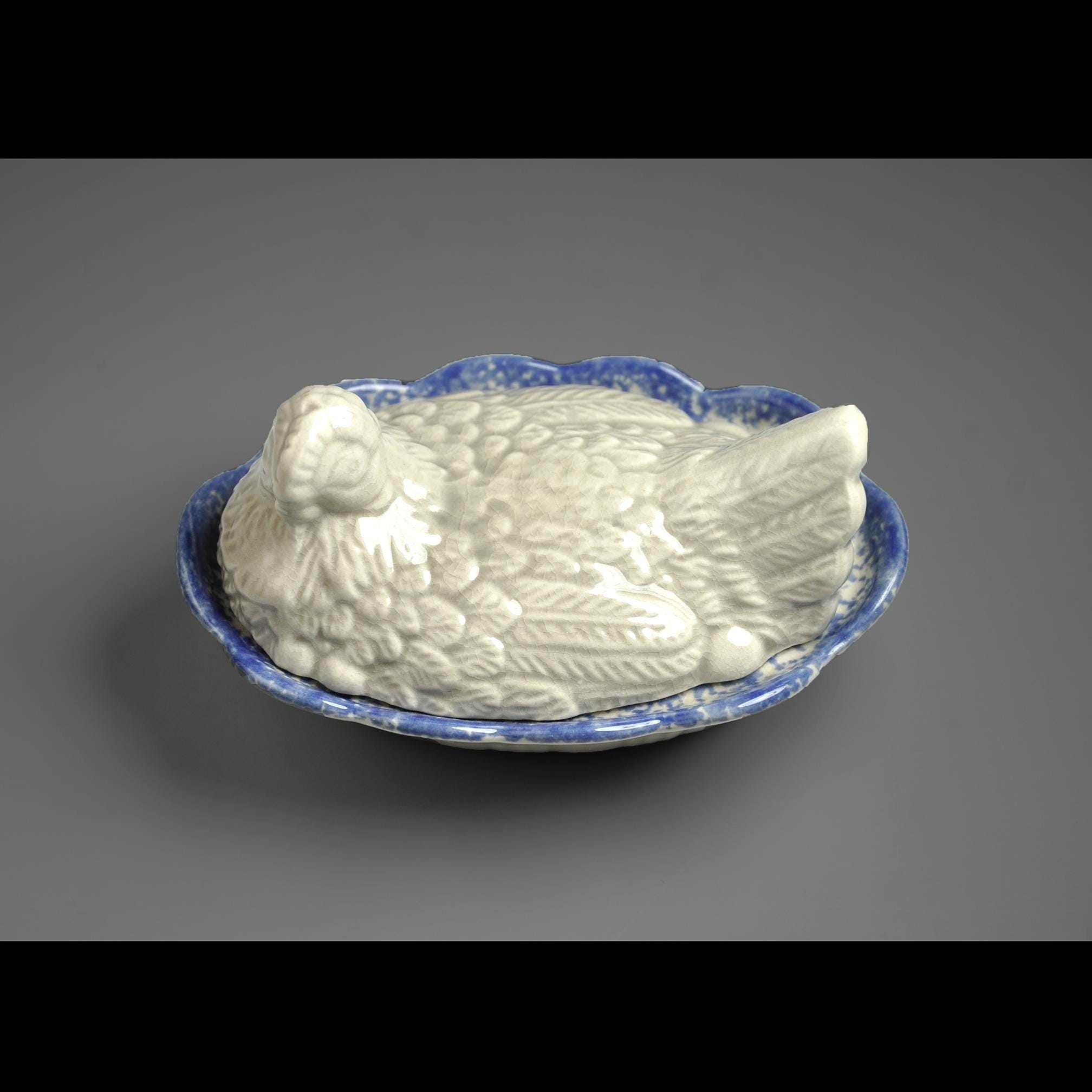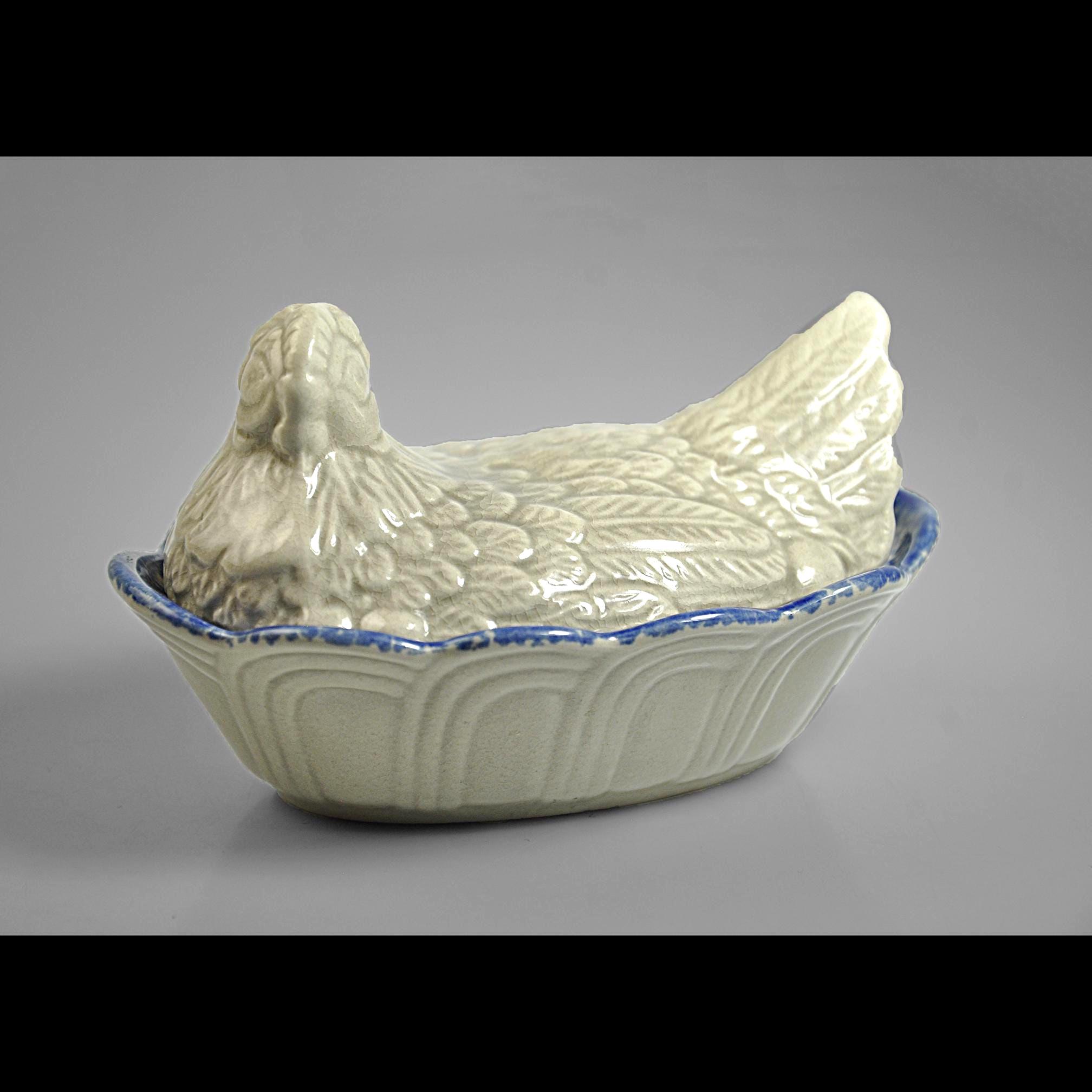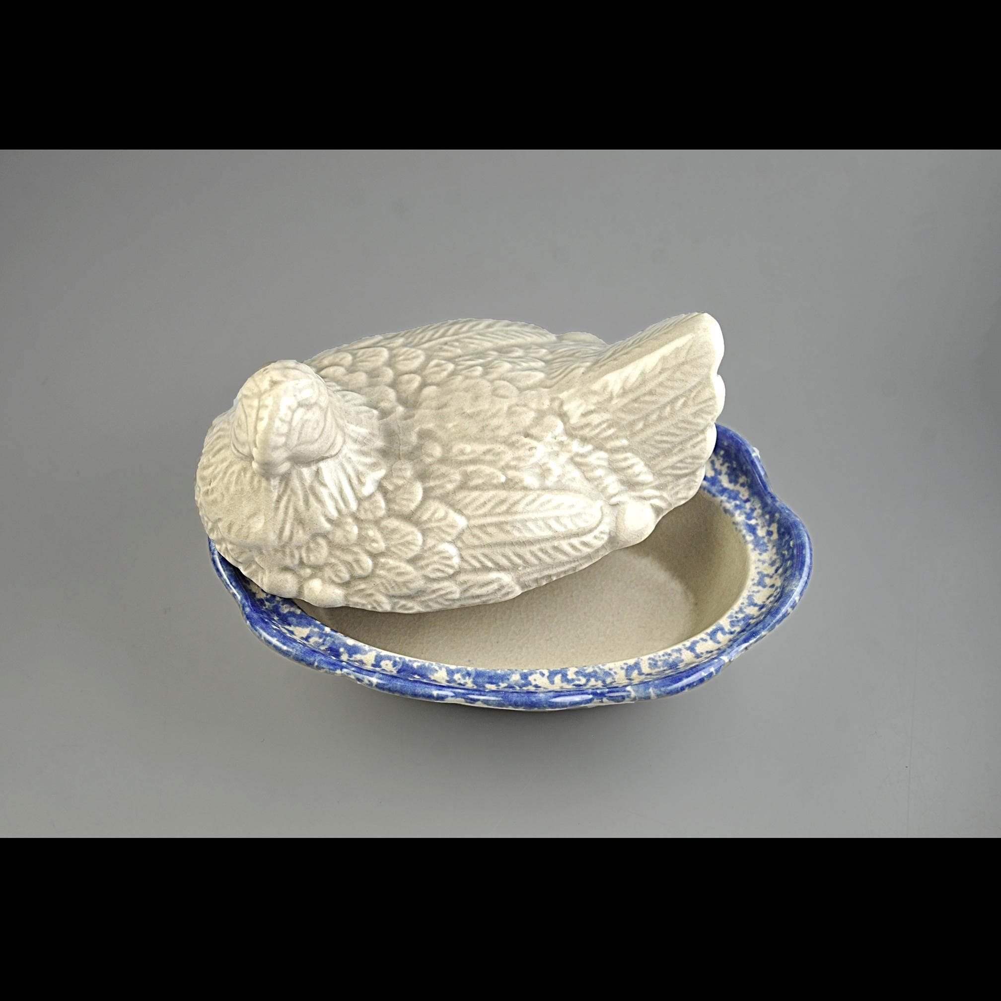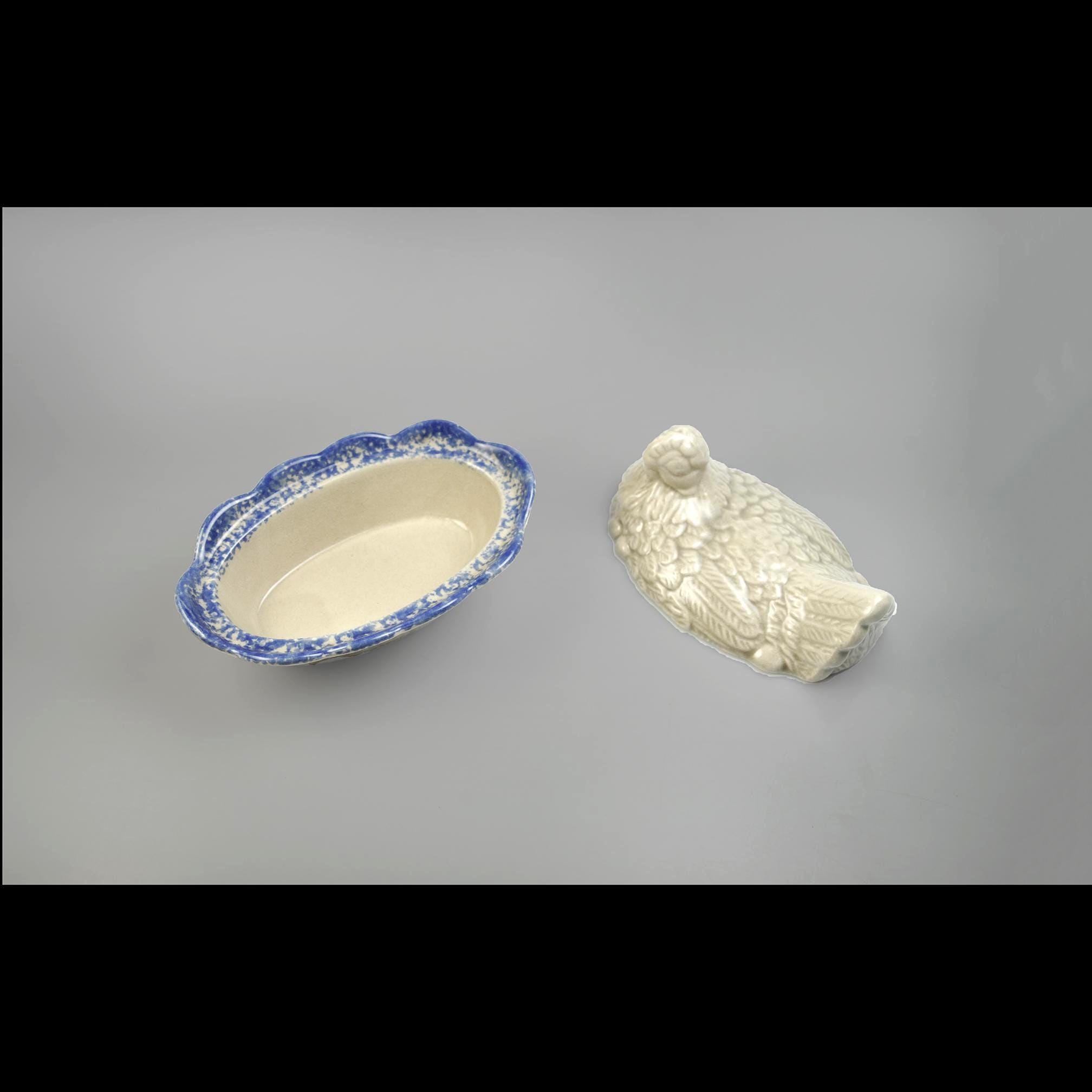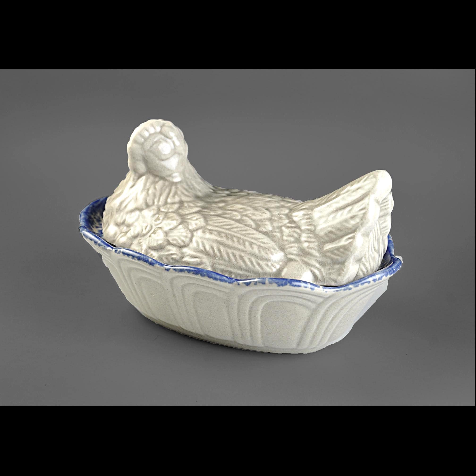 This little hen came out of the bottom of a box at an estate sale — the kind of box that’s been packed and unpacked more times than anyone remembers. Nothing fancy, nothing rare, just the kind of everyday kitchen piece that quietly did its job for years. She’s a small ceramic hen on nest covered dish, made in the mid-20th century and marked simply “China” on the bottom, which was common for practical household pieces of the time. The glaze is a warm cream color, with a soft blue sponge-decorated rim around the bowl. The hen itself is nicely molded, with good feather detail, and she sits neatly inside the base. This size was typically used as a butter dish or for jam or jelly on the table. Today, it works just as well as farmhouse kitchen décor or a small trinket dish on a shelf. This is one of those wonderful vintage pieces — simple, useful, and still charming all these years later.