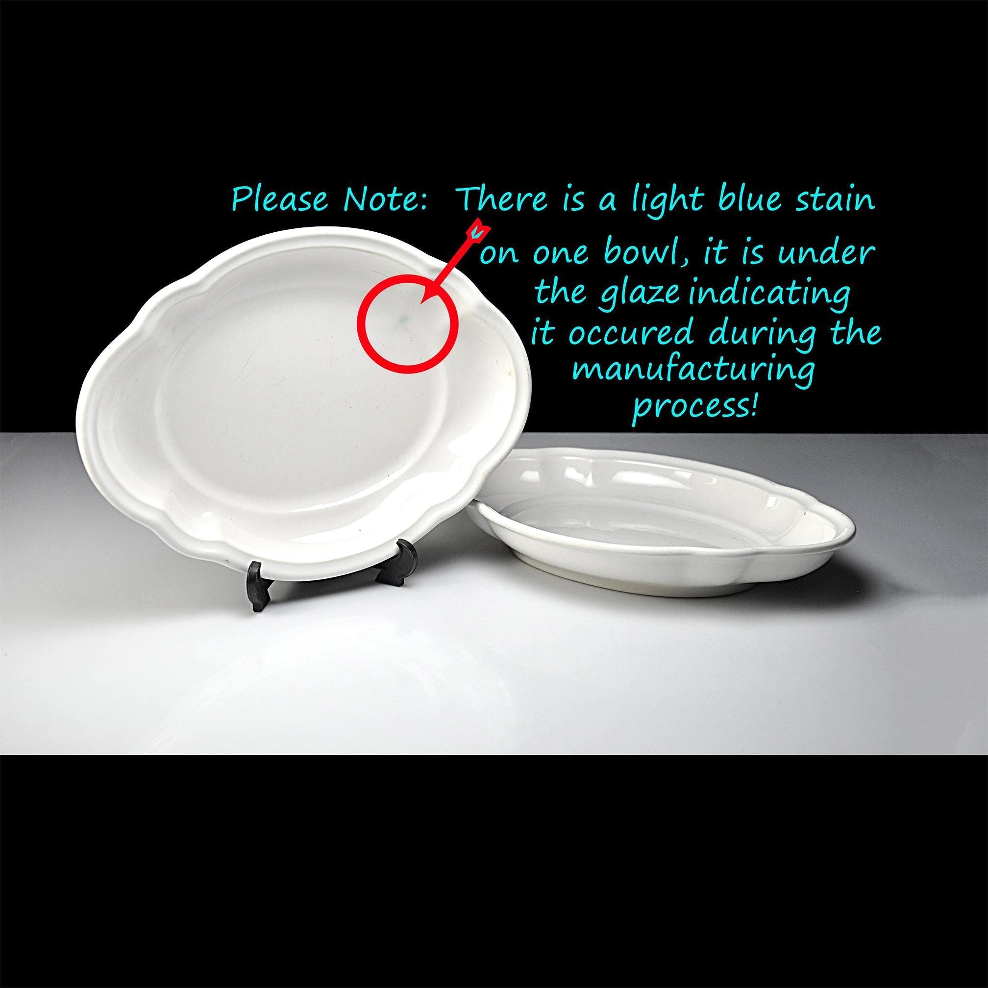 These are a set of bowls that quietly earn their place in the kitchen. This is a pair of vintage Pfaltzgraff white oval bowls, made back when stoneware was meant to be used, not babied. They measure about 8¼ inches long by 6¼ inches wide, a really handy size that works for all sorts of everyday cooking and serving. I use bowls like this myself, and they’re the kind you reach for without thinking — au gratin, baked sides, small casseroles, salads, even prep bowls. They go from oven to table without any fuss. Both bowls are marked “Oven & Microwave” on the back. Sold as a set of two, which makes them a great match for a couple, a small household, or anyone who appreciates well-made vintage kitchen pieces that still do their job.