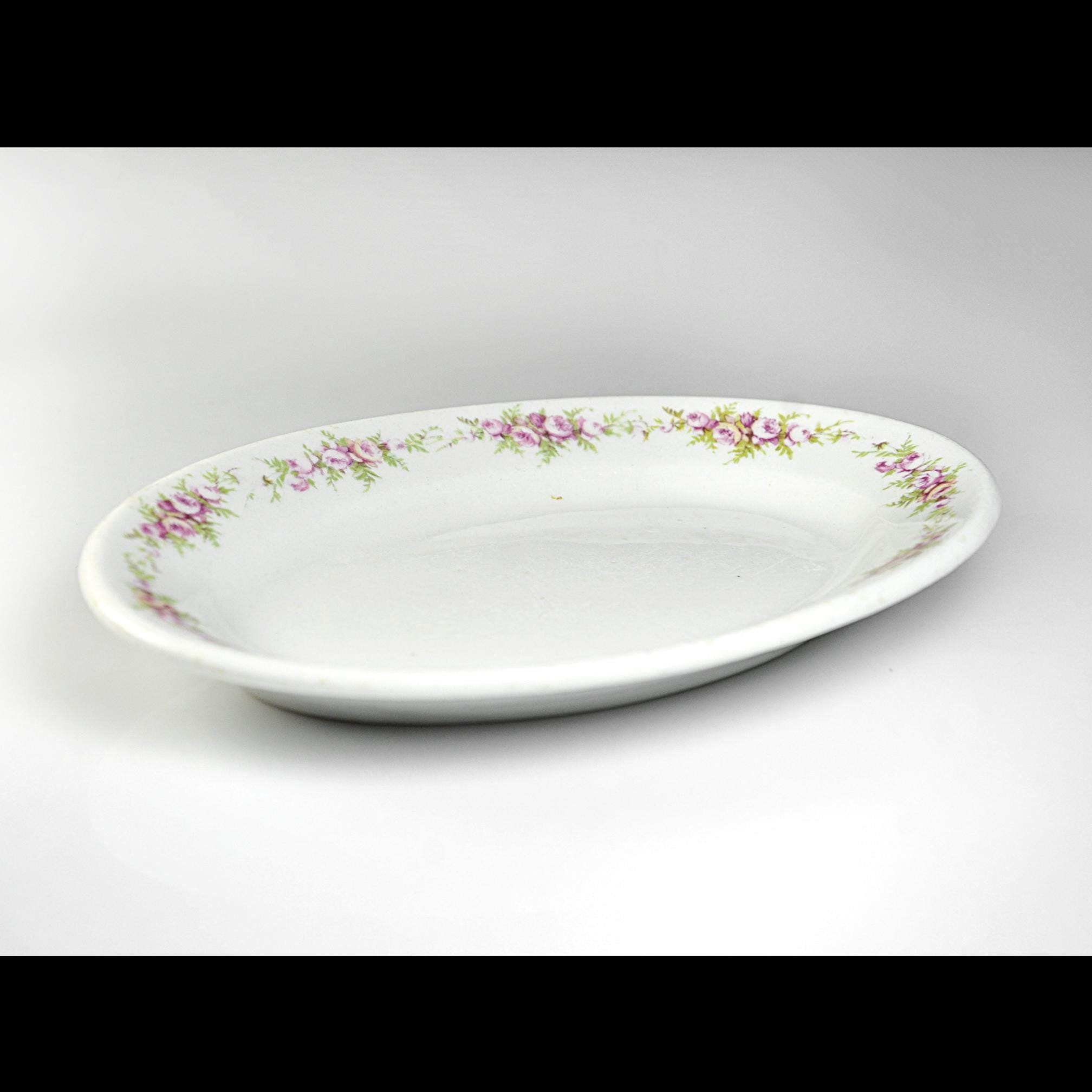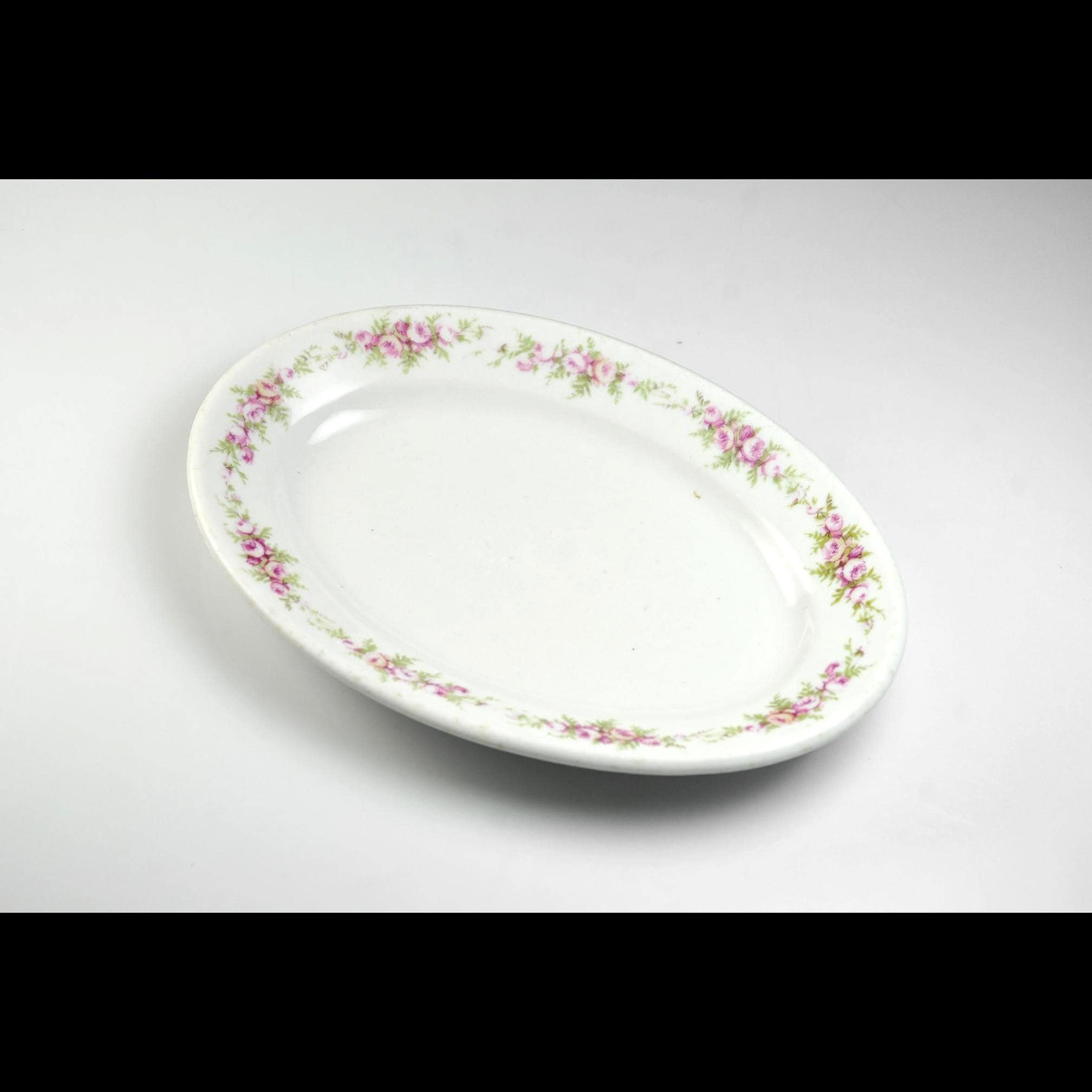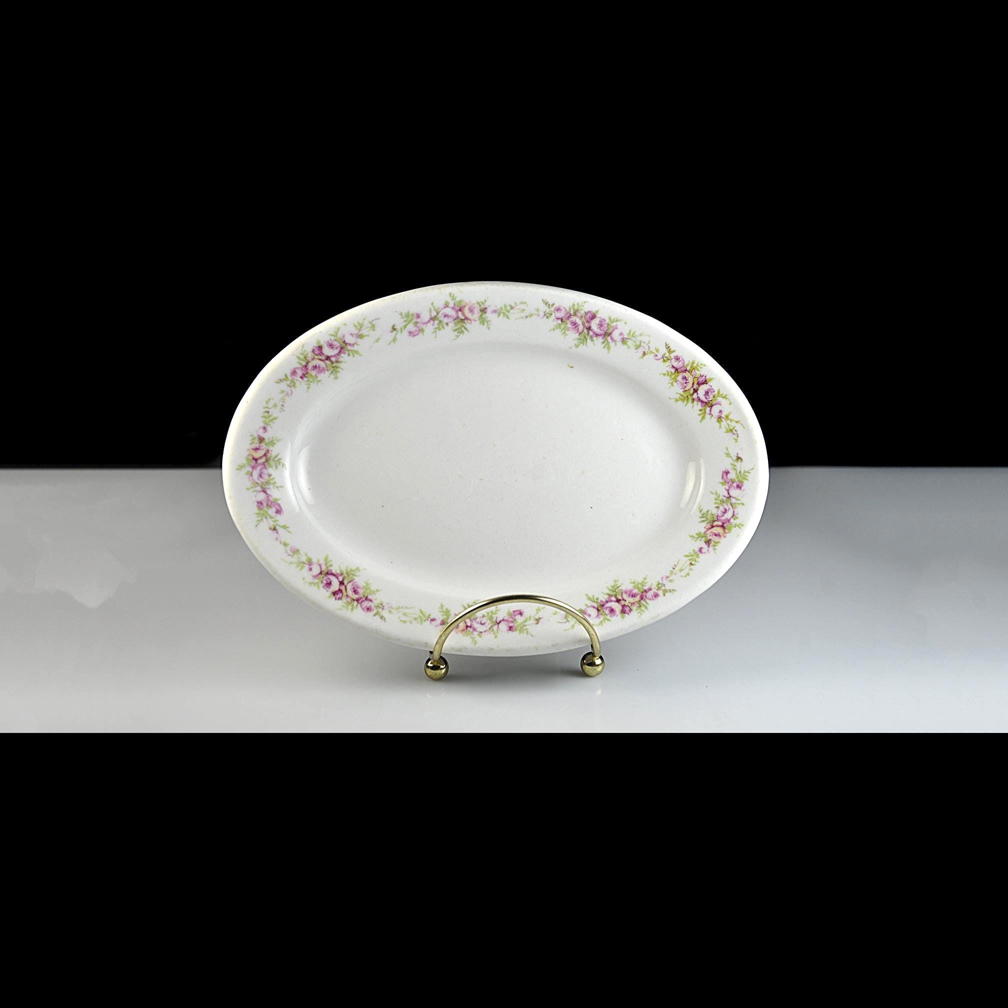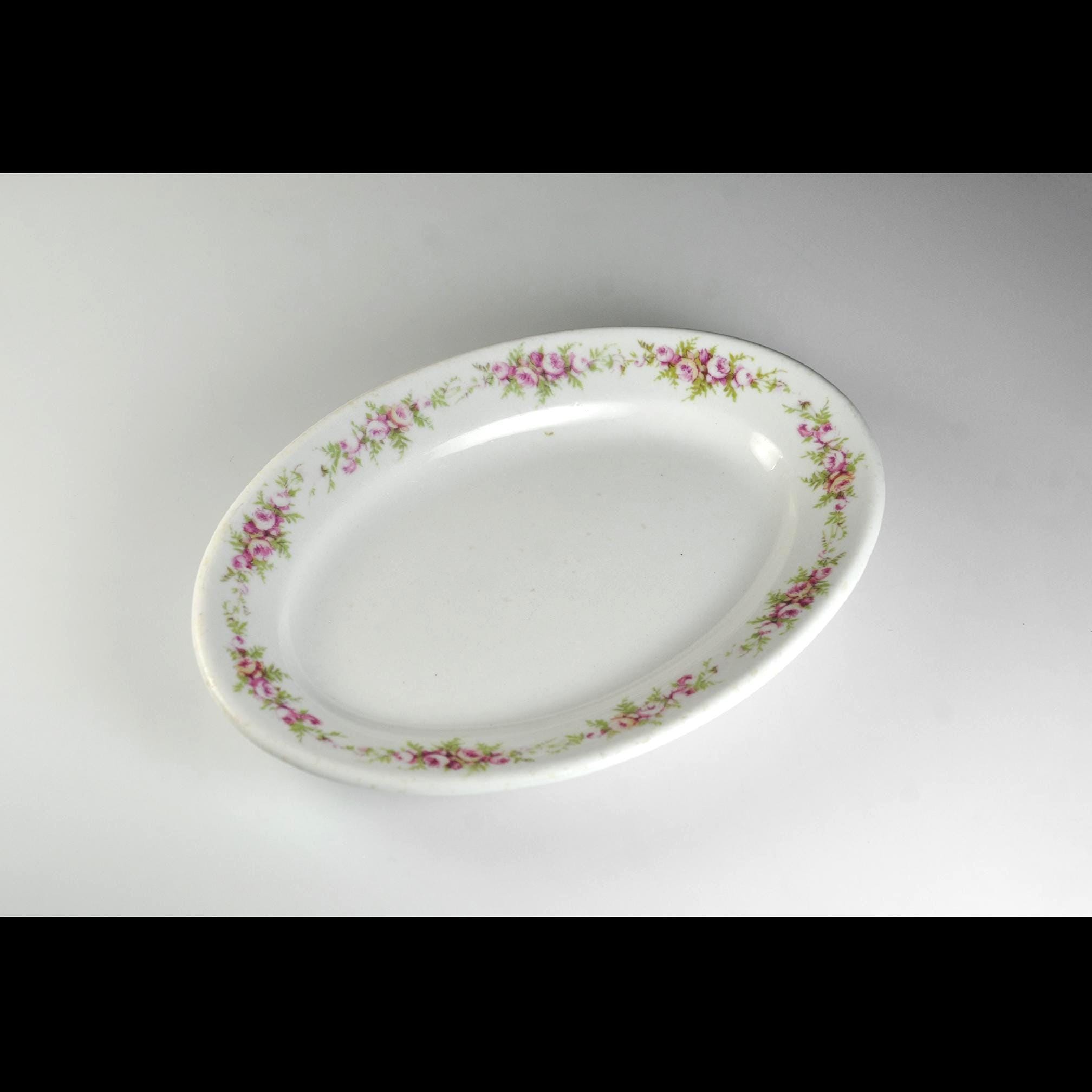 This is a small antique oval platter made by Lamberton China, dating to the 1920s. It's a handy size that was meant to be used, not tucked away in a cabinet. The soft pink rose garland around the rim is delicate without being fussy — just enough decoration to dress up the table. Pieces like this were commonly used for celery, pickles, olives, toast, tea sandwiches, or relishes, especially in the years when every meal had its own proper serving dish. Lamberton was known for making sturdy, well-fired china in Trenton, New Jersey, and many of their pieces were made to stand up to daily use in homes, hotels, and boarding houses. This platter has done exactly that and come through beautifully. A perfect piece for someone who enjoys setting a thoughtful table, mixing old china with everyday meals, or adding a small antique touch to teatime.