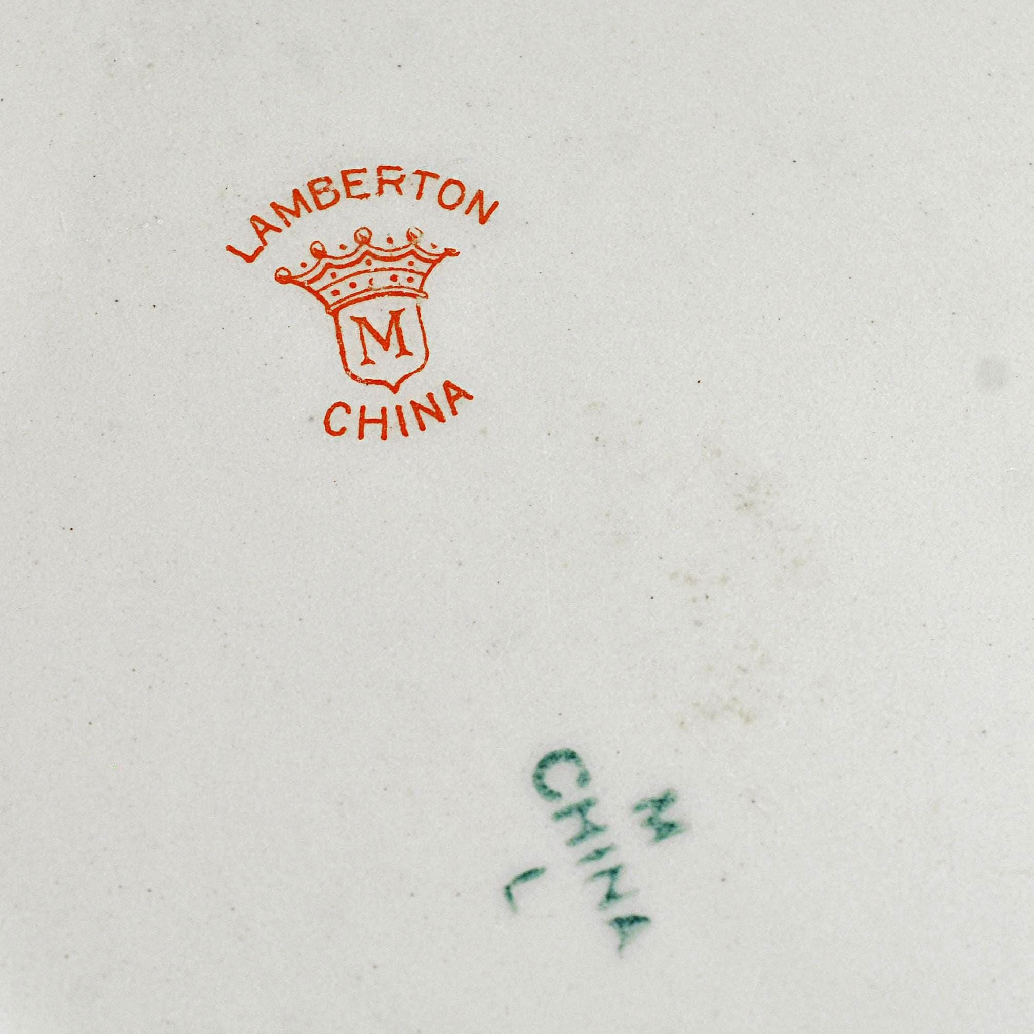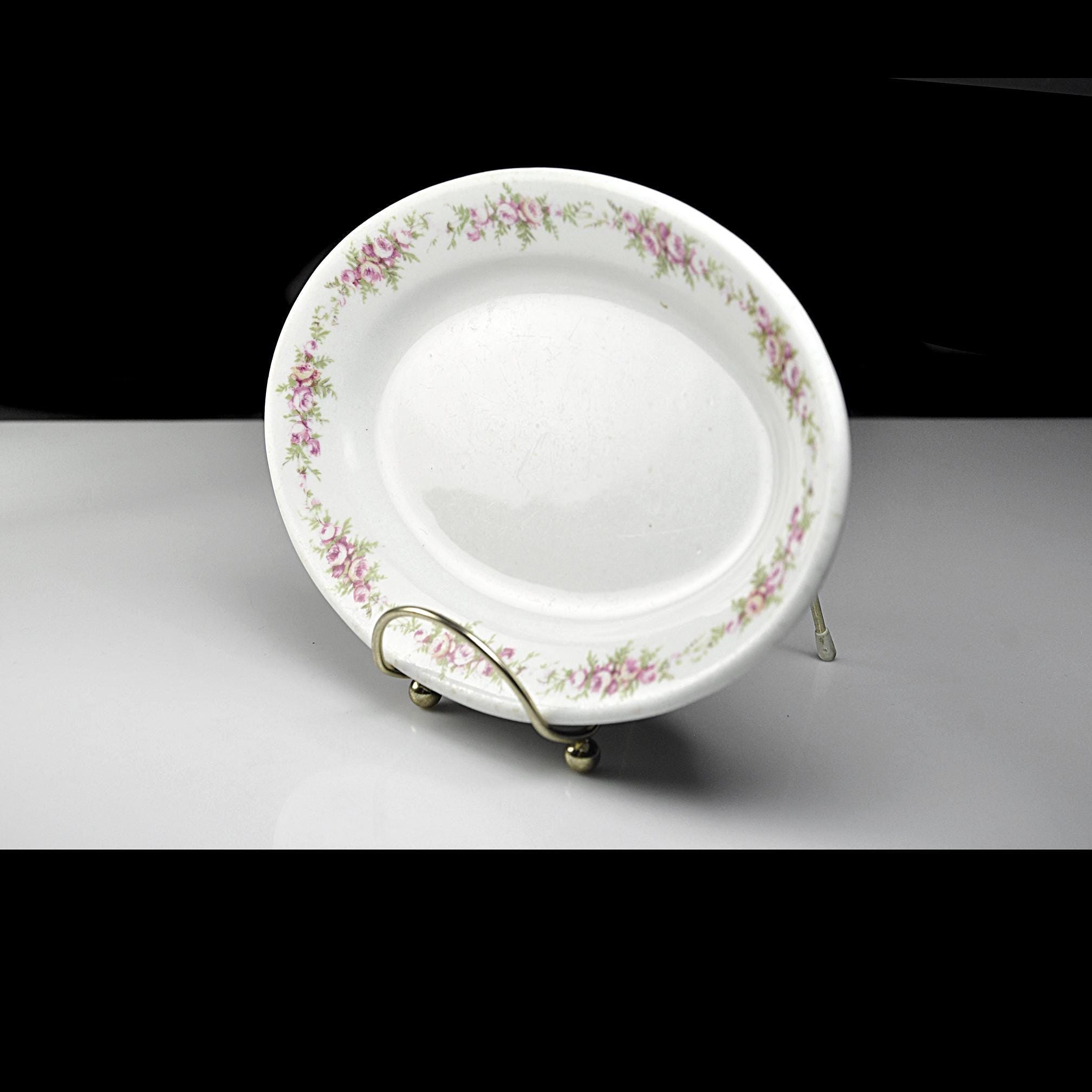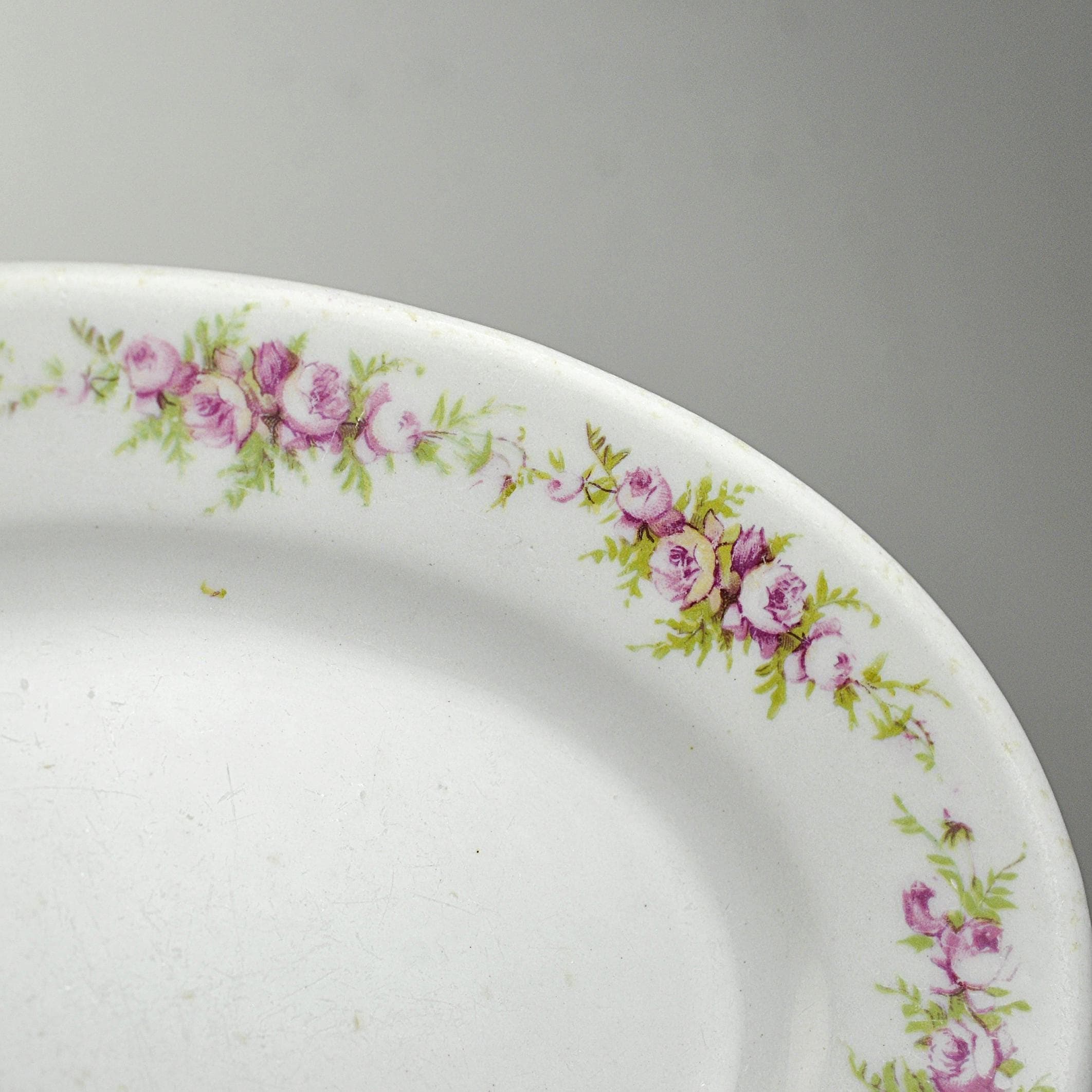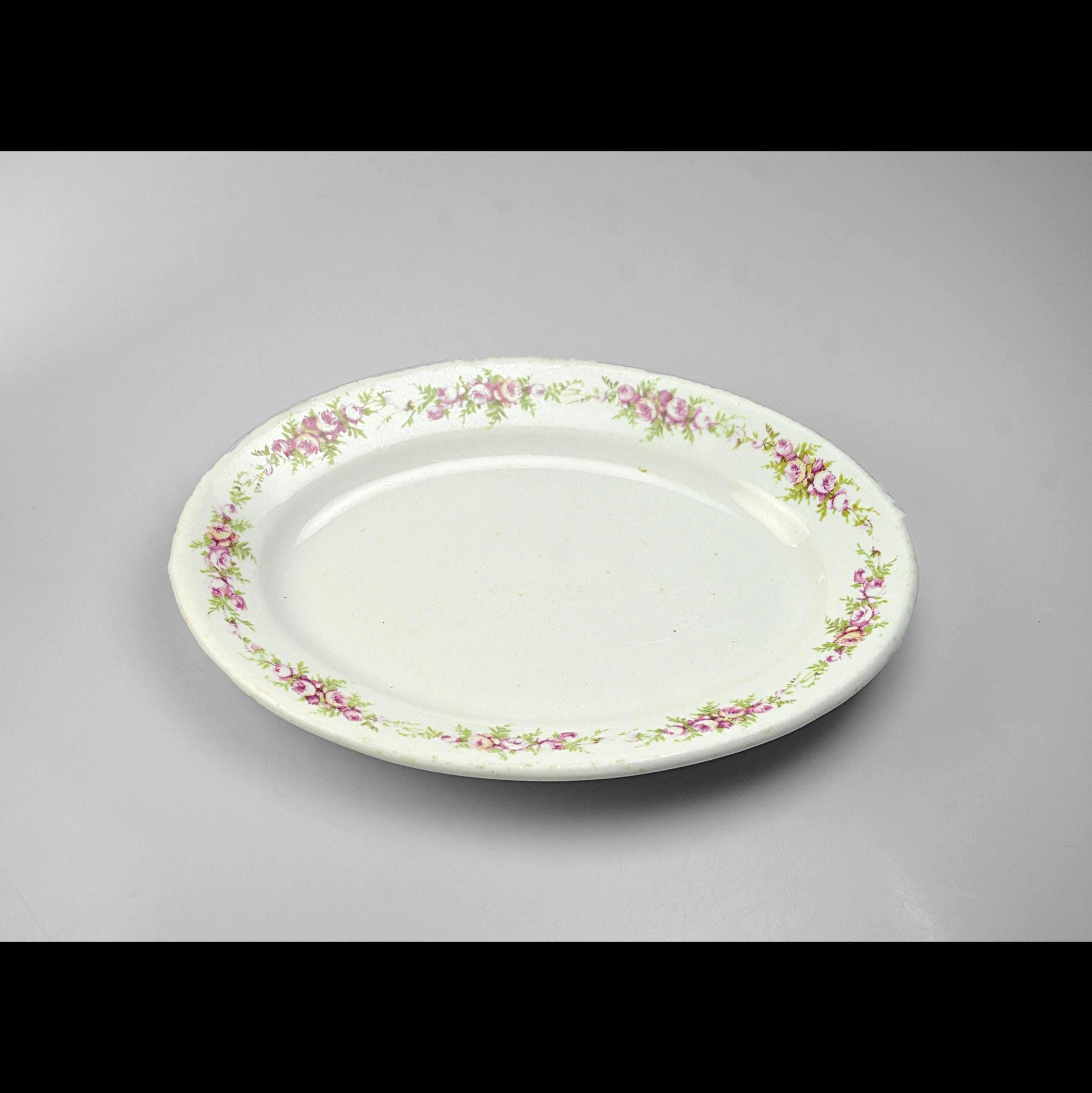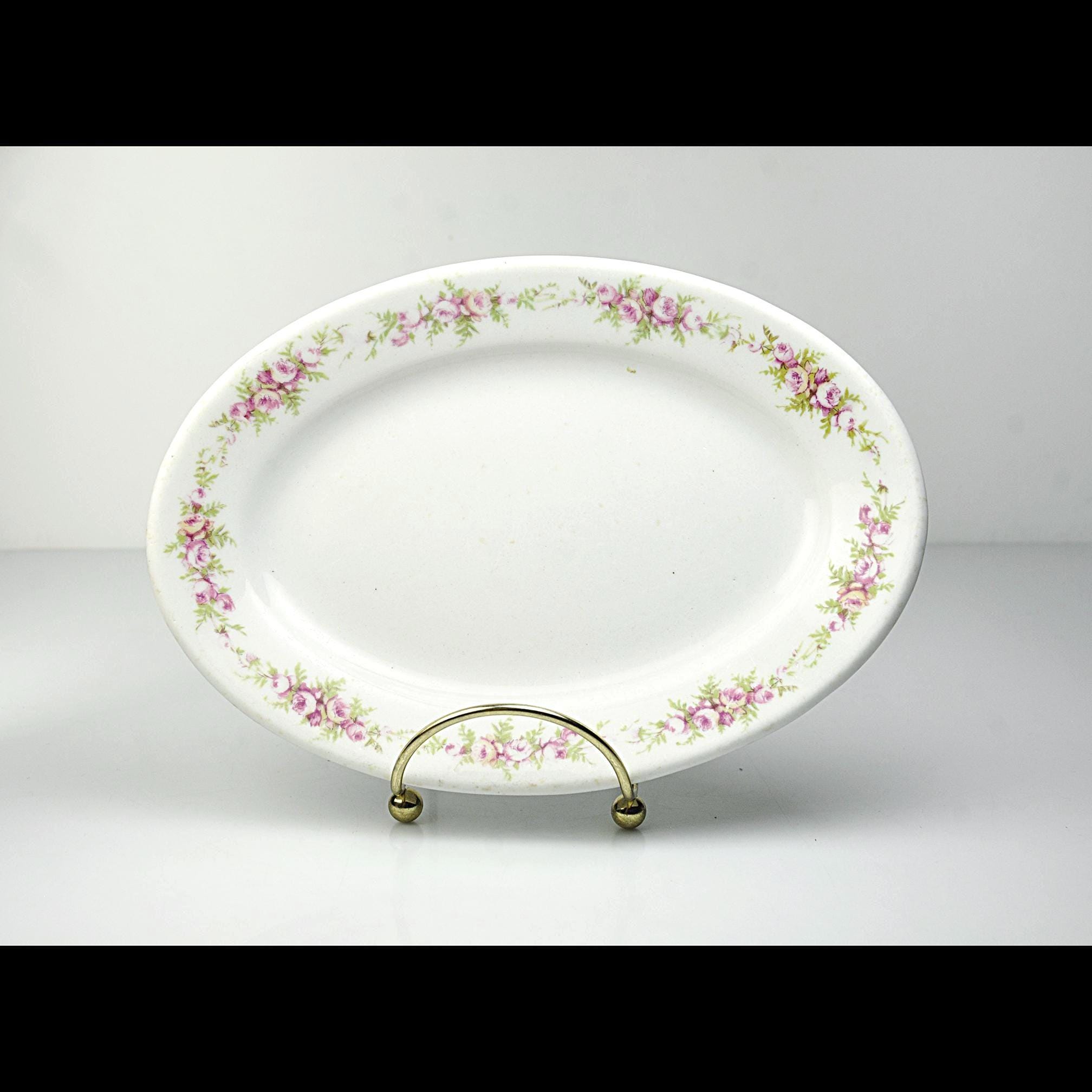 This is a small antique oval platter made by Lamberton China, dating to the 1920s. It's a handy size that was meant to be used, not tucked away in a cabinet. The soft pink rose garland around the rim is delicate without being fussy — just enough decoration to dress up the table. Pieces like this were commonly used for celery, pickles, olives, toast, tea sandwiches, or relishes, especially in the years when every meal had its own proper serving dish. Lamberton was known for making sturdy, well-fired china in Trenton, New Jersey, and many of their pieces were made to stand up to daily use in homes, hotels, and boarding houses. This platter has done exactly that and come through beautifully. A perfect piece for someone who enjoys setting a thoughtful table, mixing old china with everyday meals, or adding a small antique touch to teatime.